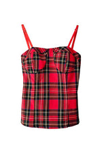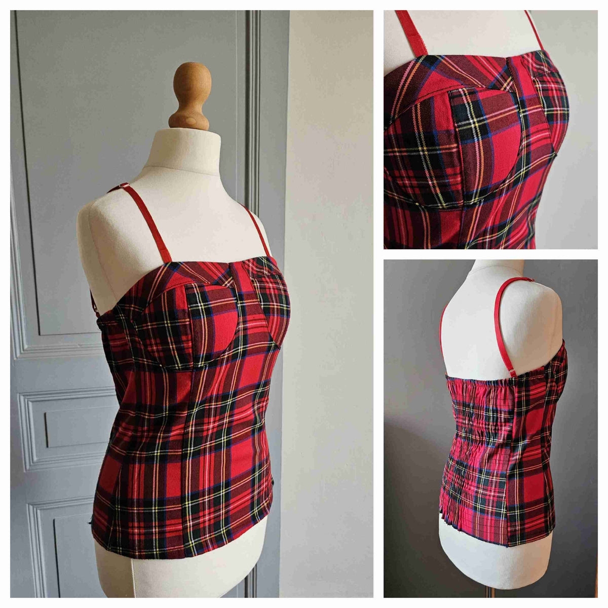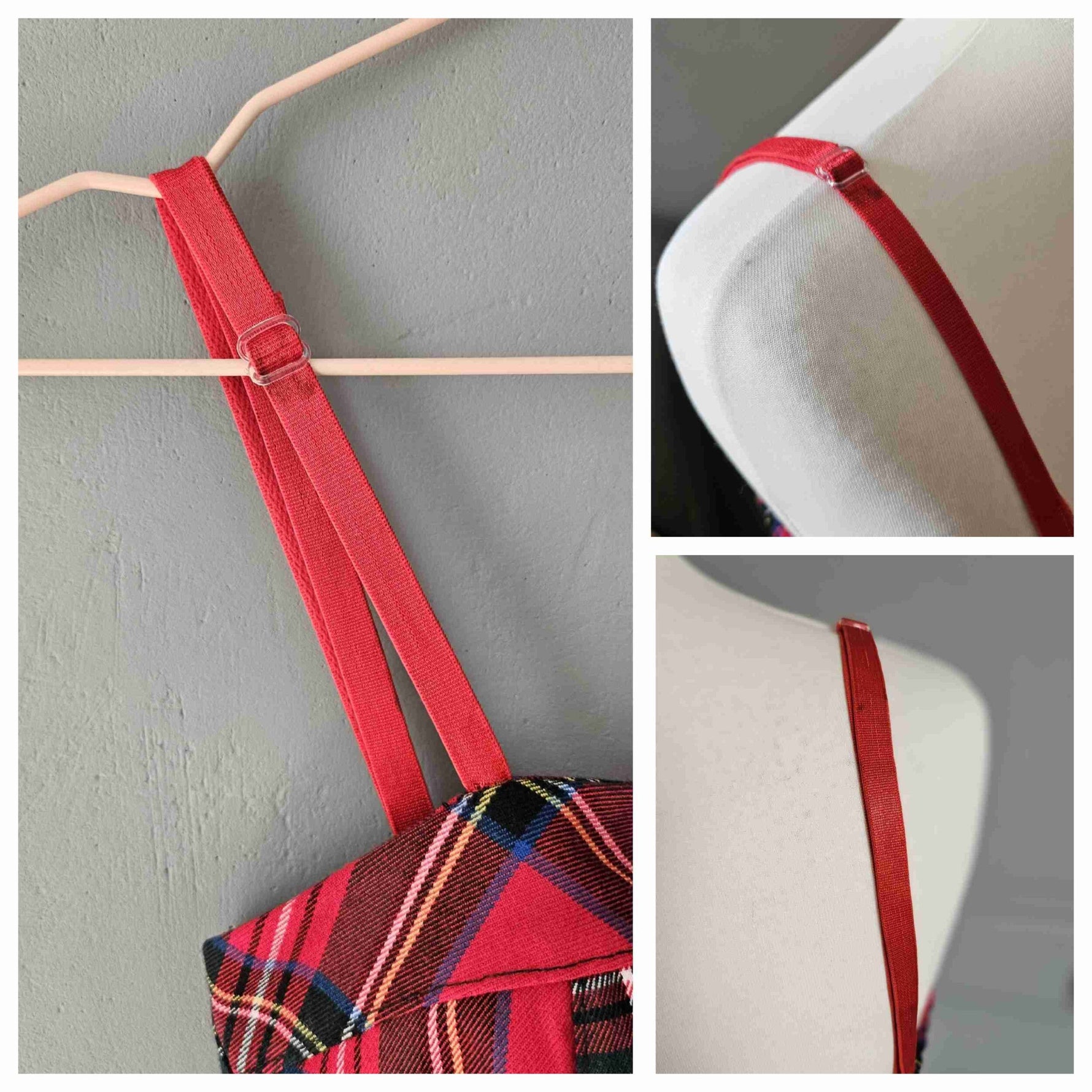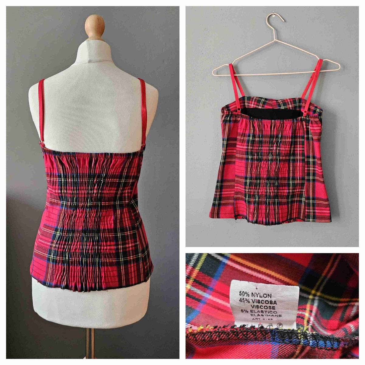 Prix unitaire parCaraco en viscose mélangée, imprimé tartan rouge, découpe poitrine doublée et légèrement rembourrée, bretelles élastiques réglables, dos smocké. À enfiler. Fabriqué en Italie.