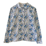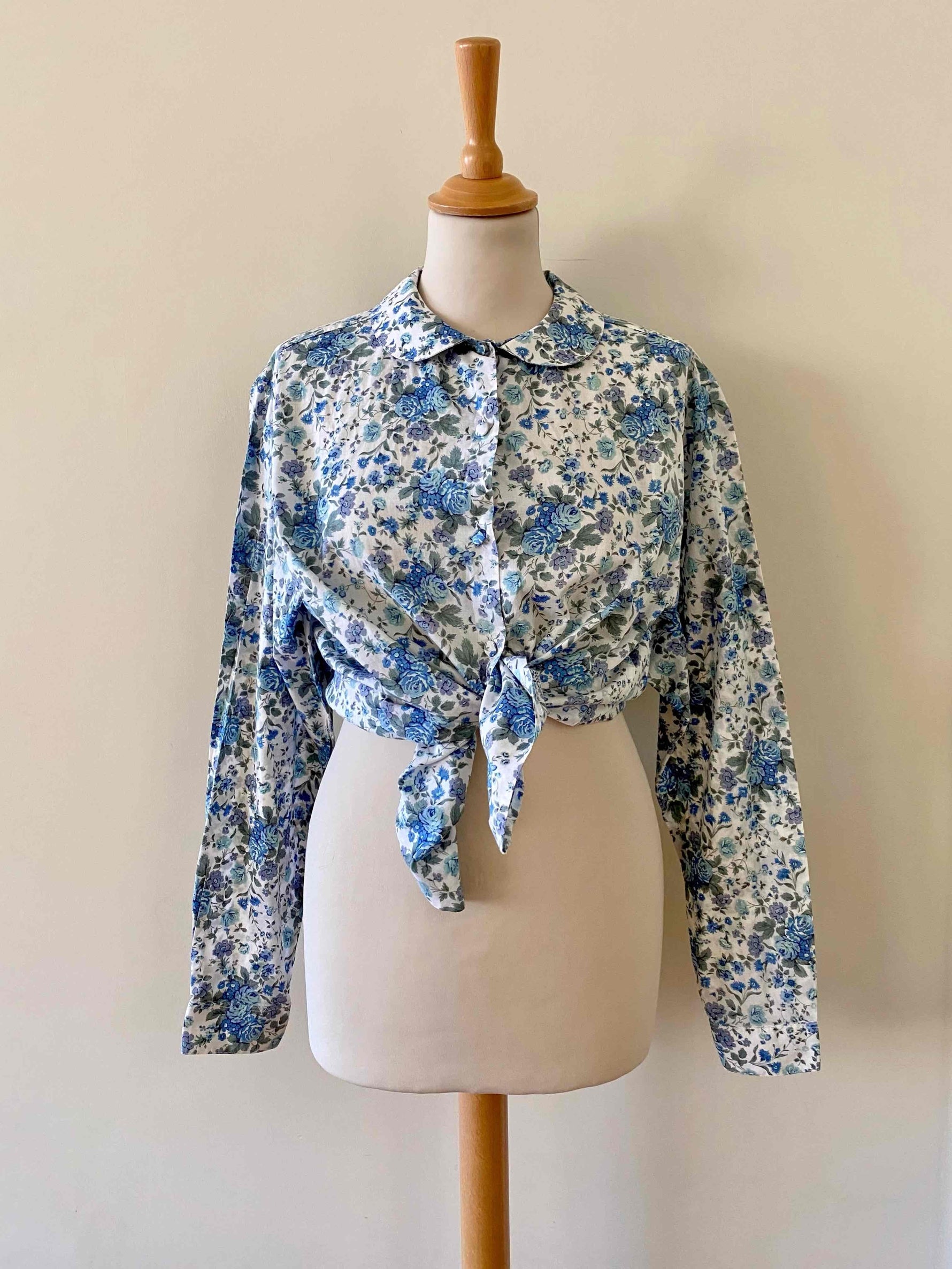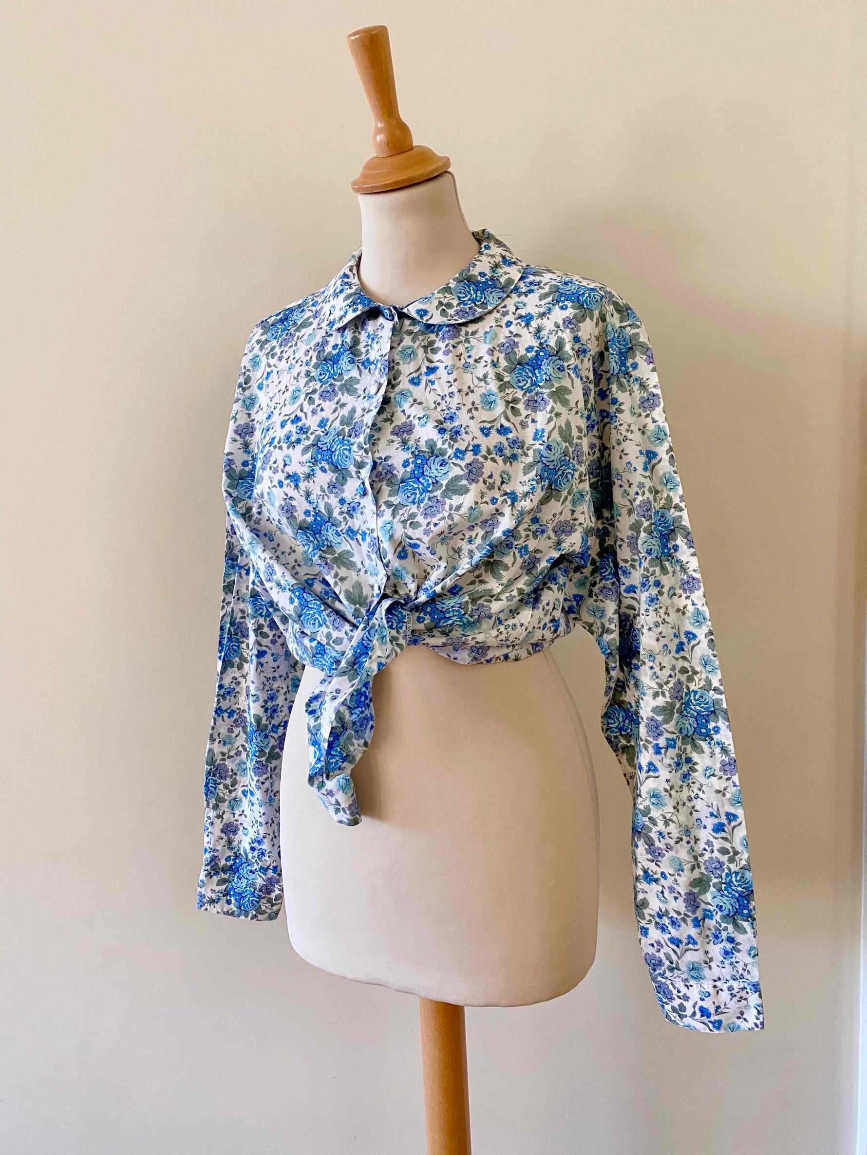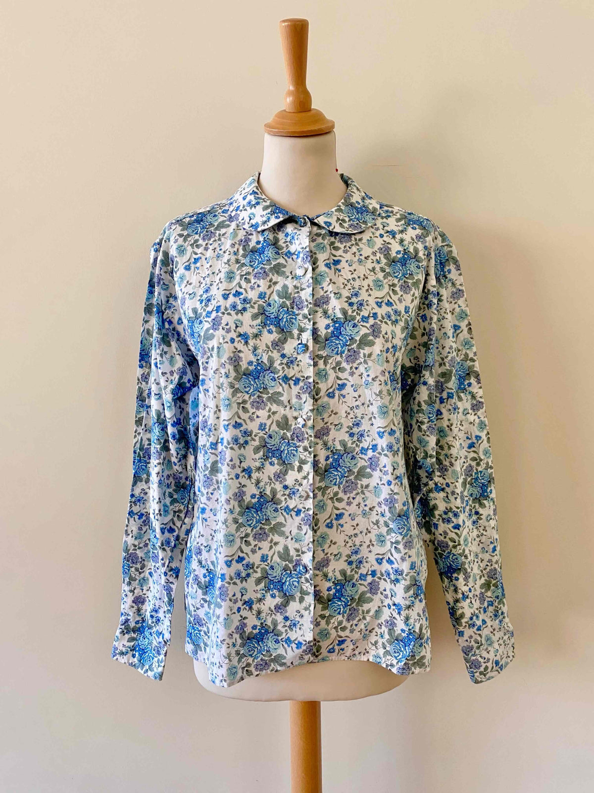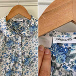 Prix unitaire parChemise en coton, imprimé fleurs bleu ciel et blanches, col Claudine, boutons recouverts, fabriquée en France, taille 38 portée ici sur un mannequin T36.