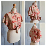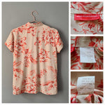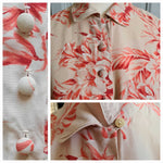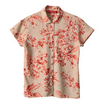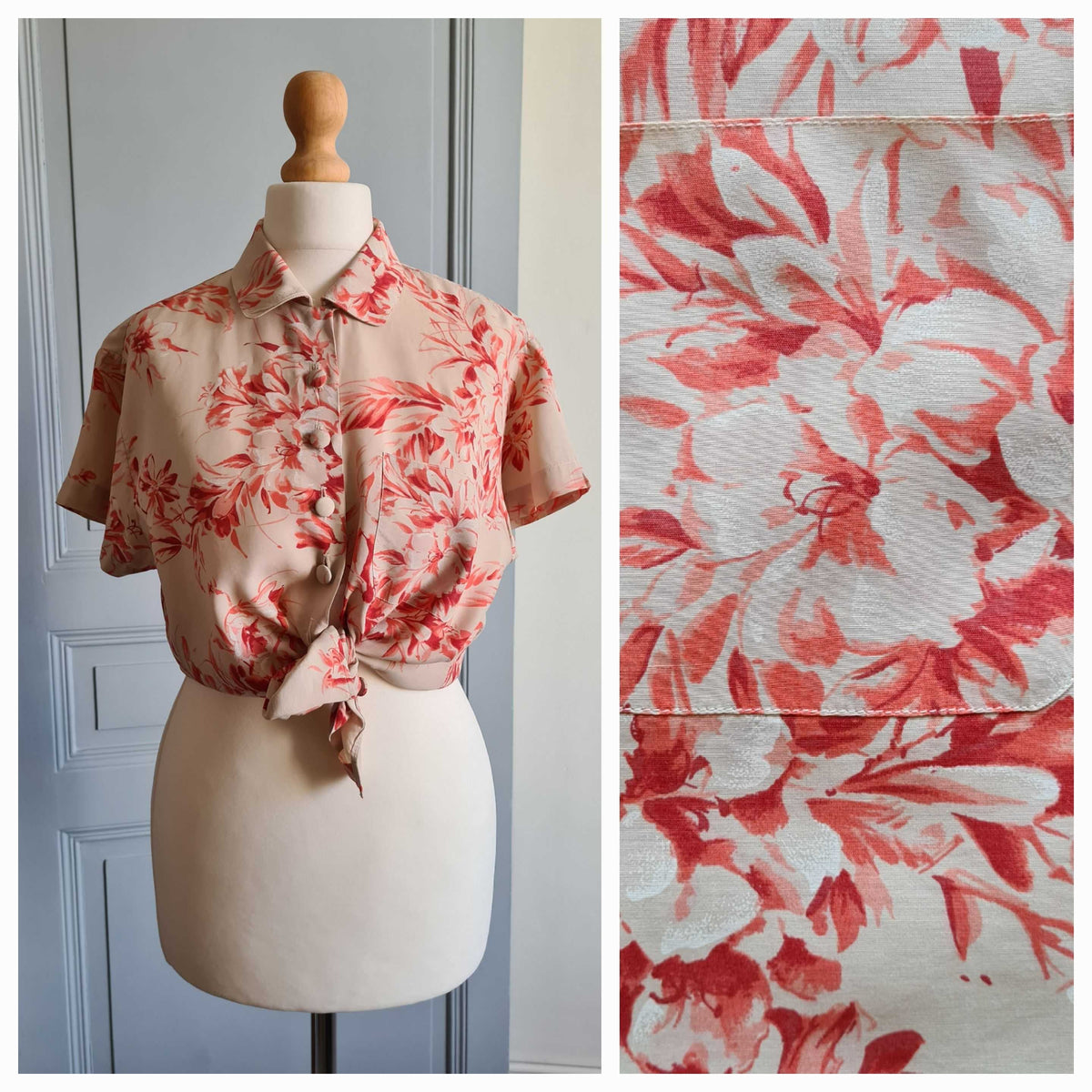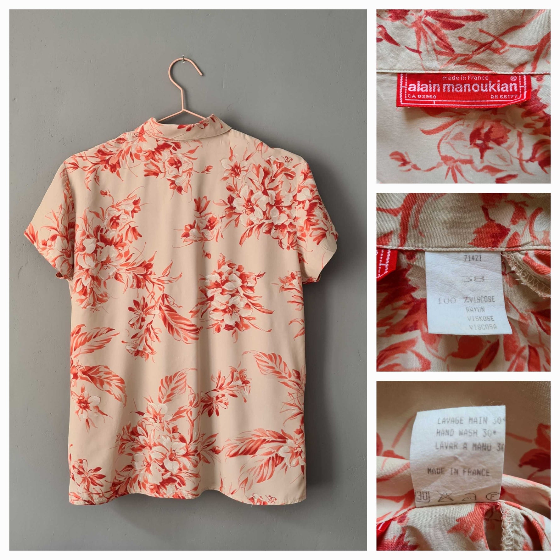 Prix unitaire parChemise à fleurs, en viscose beige à imprimé floral rouge et blanc, manches courtes, boutons recouverts, bouton bride sous le col. Petite poche plate devant. Marque Manoukian. Pièce fabriquée en France.