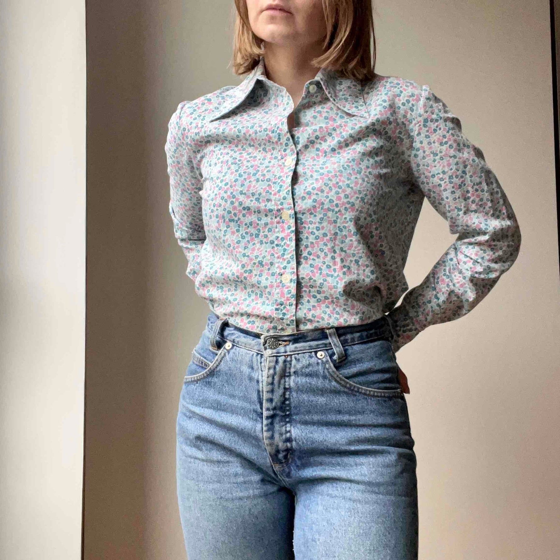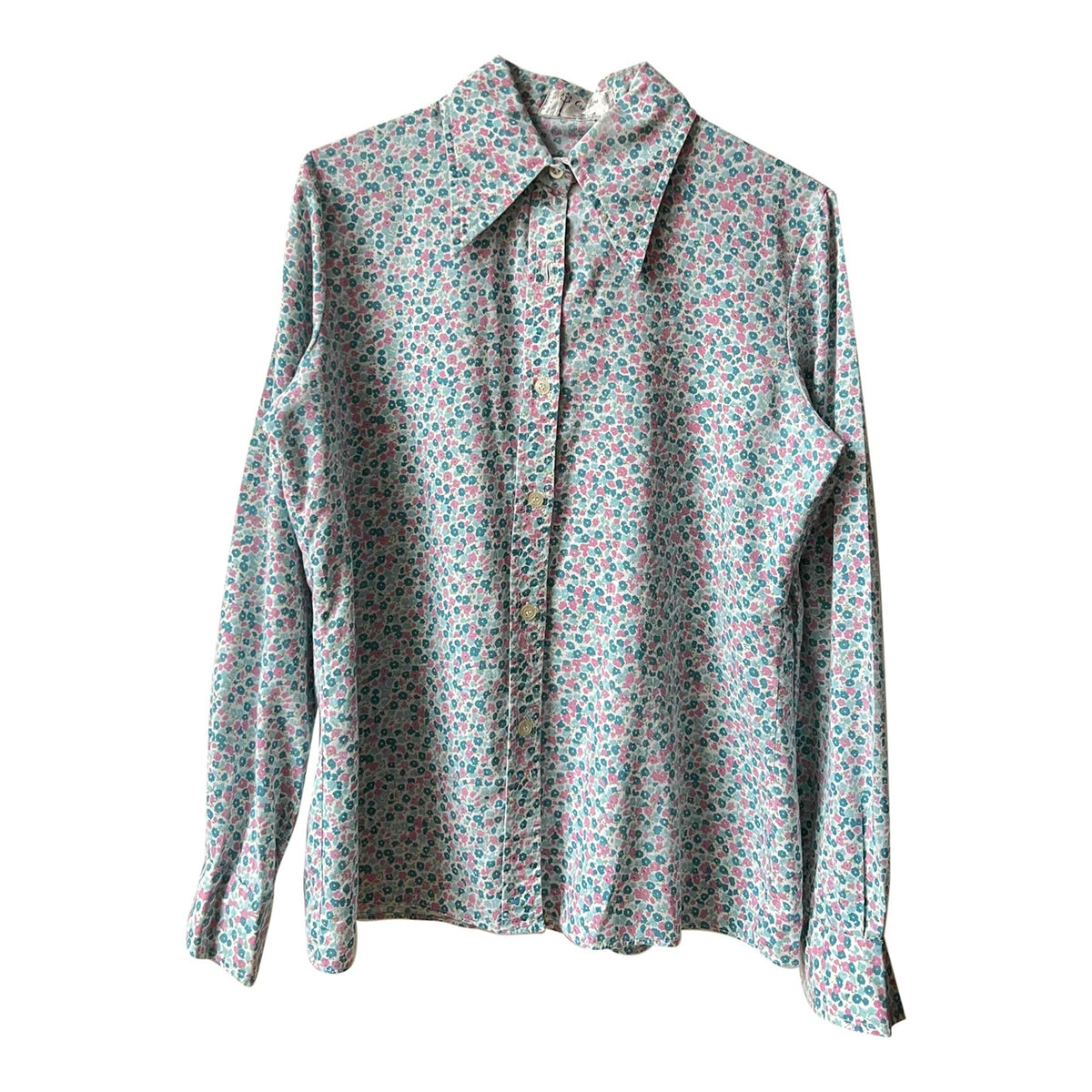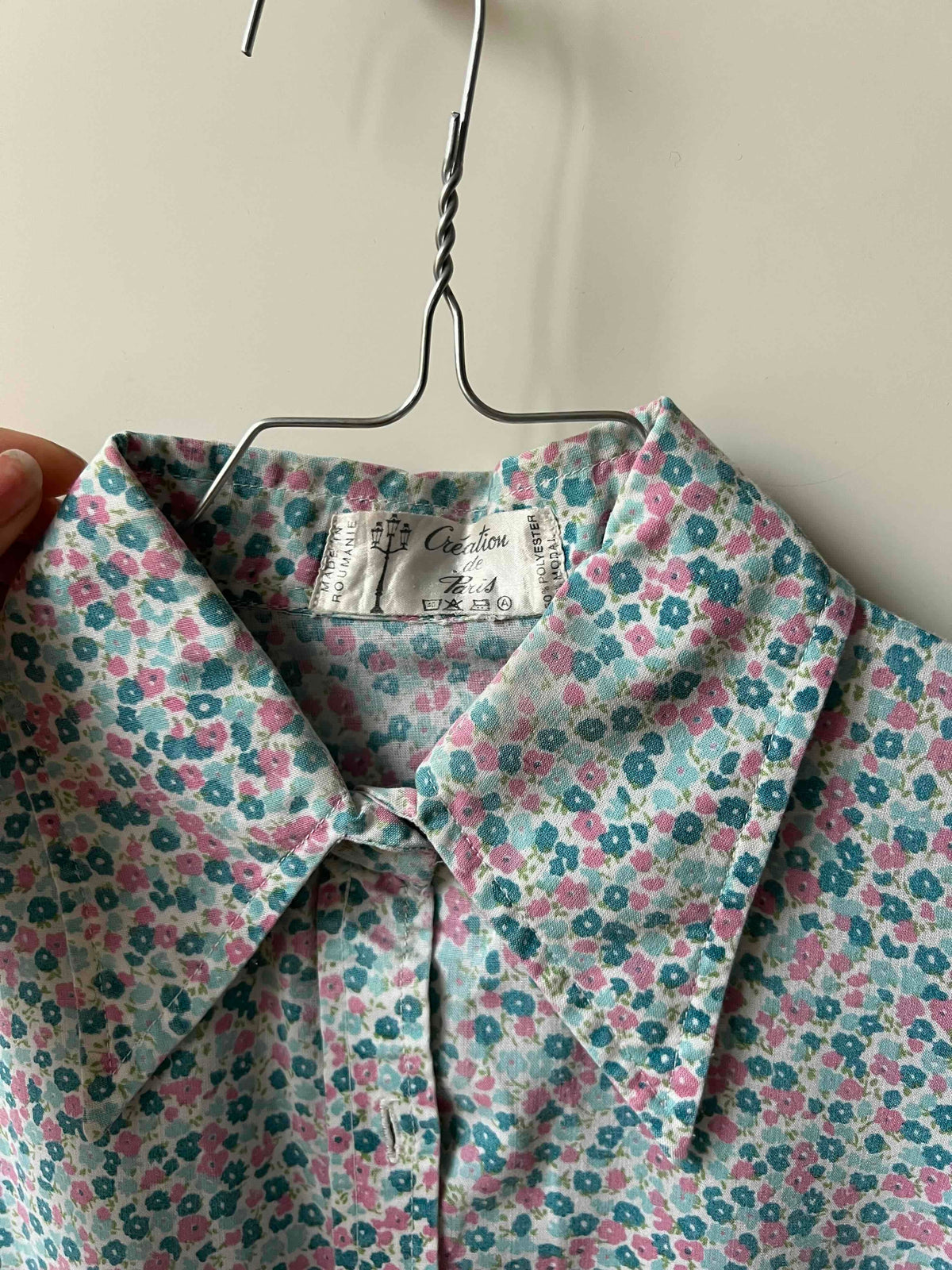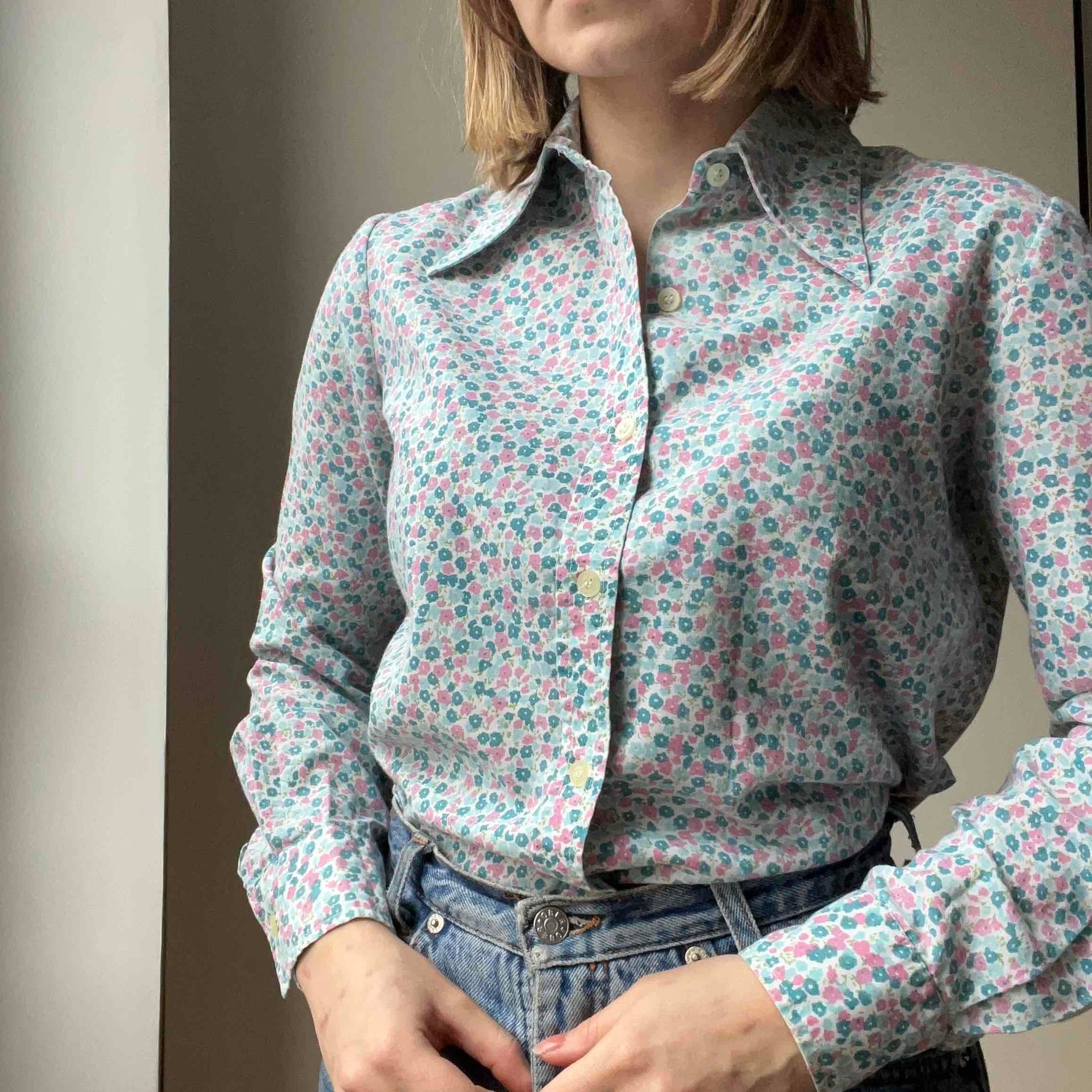 Prix unitaire parChemise à fleurs années 70, bleues et roses sur fond blanc. Excellent état.