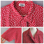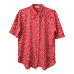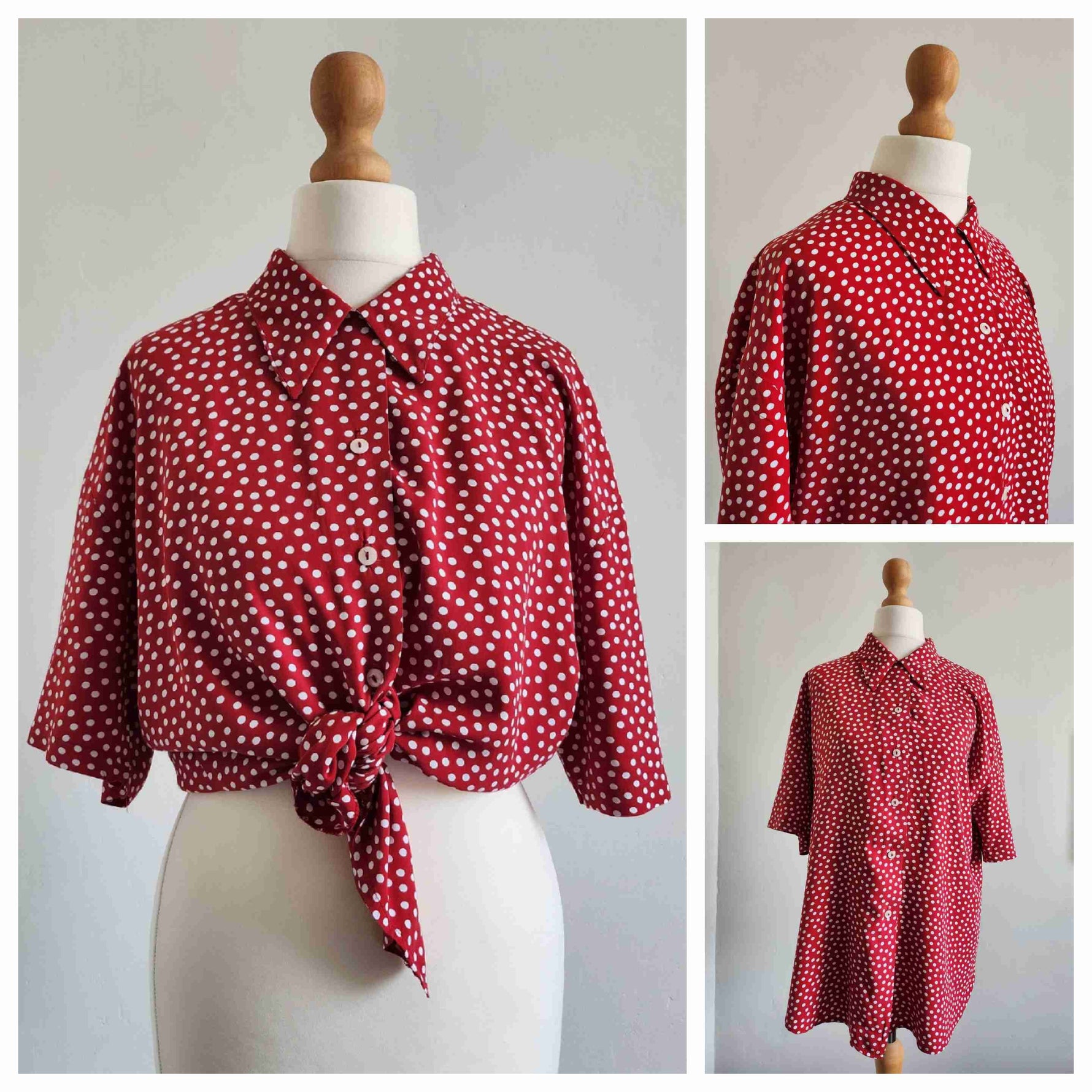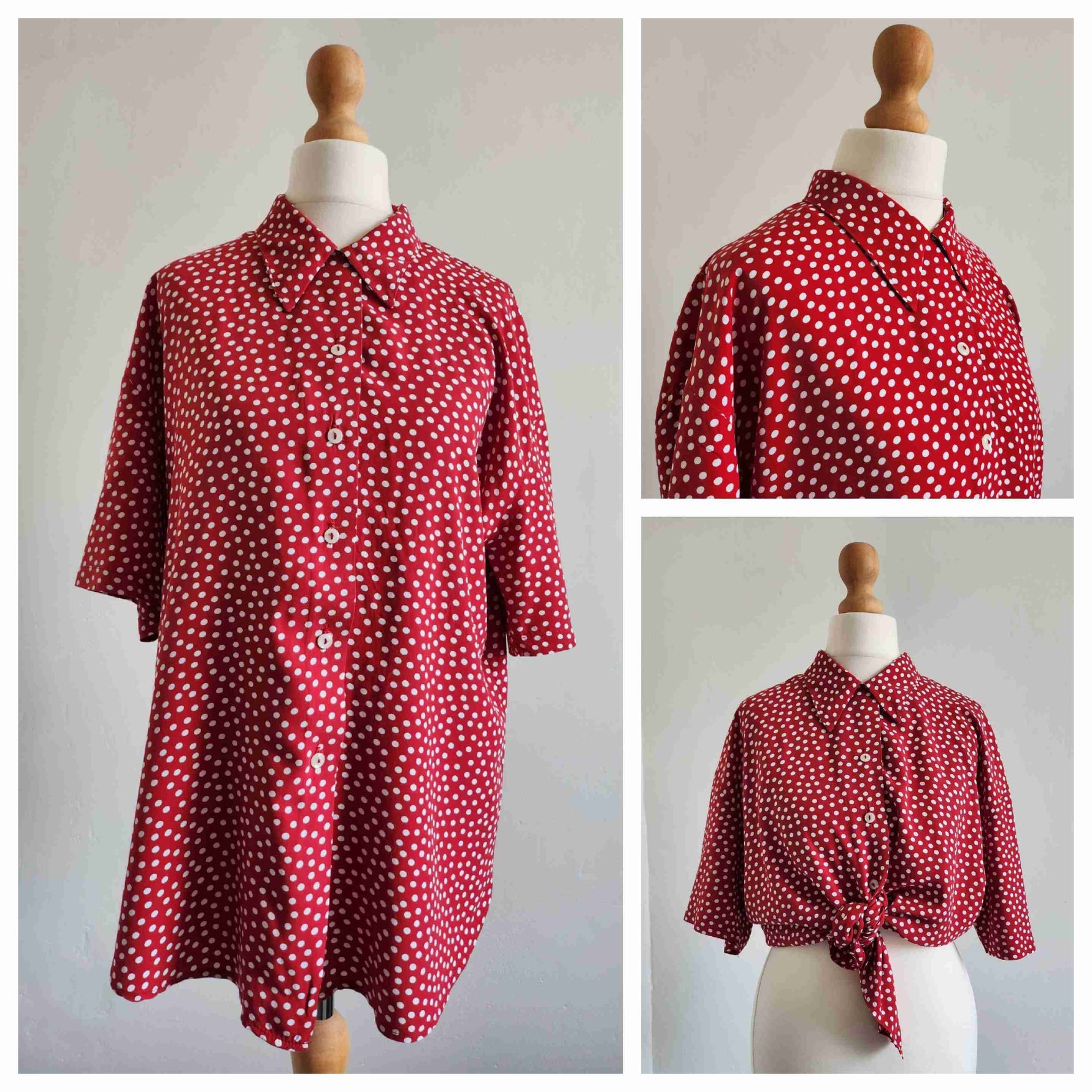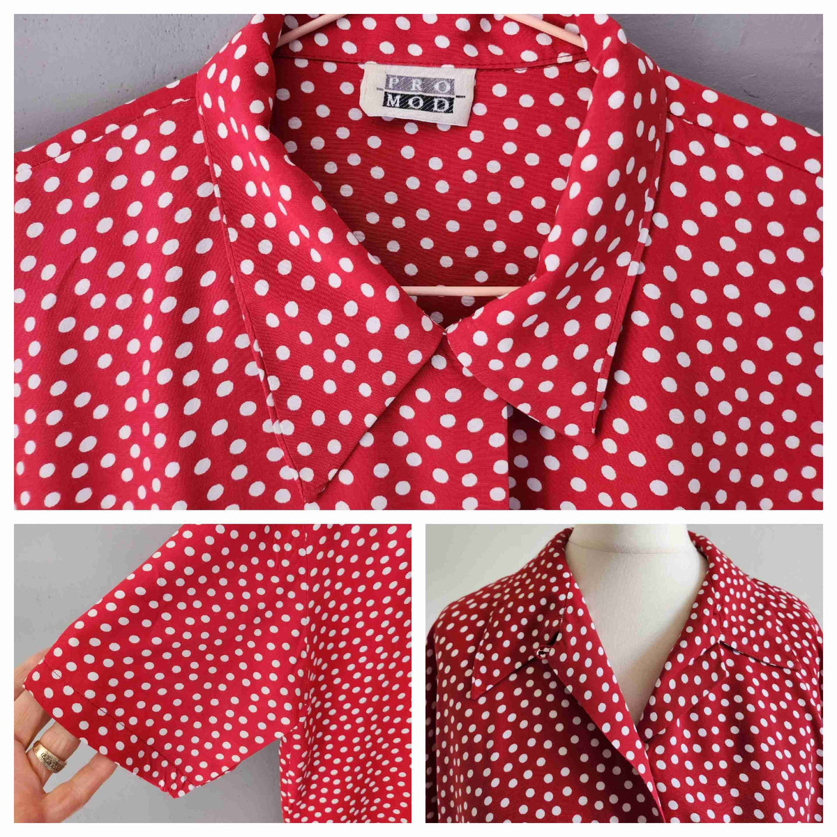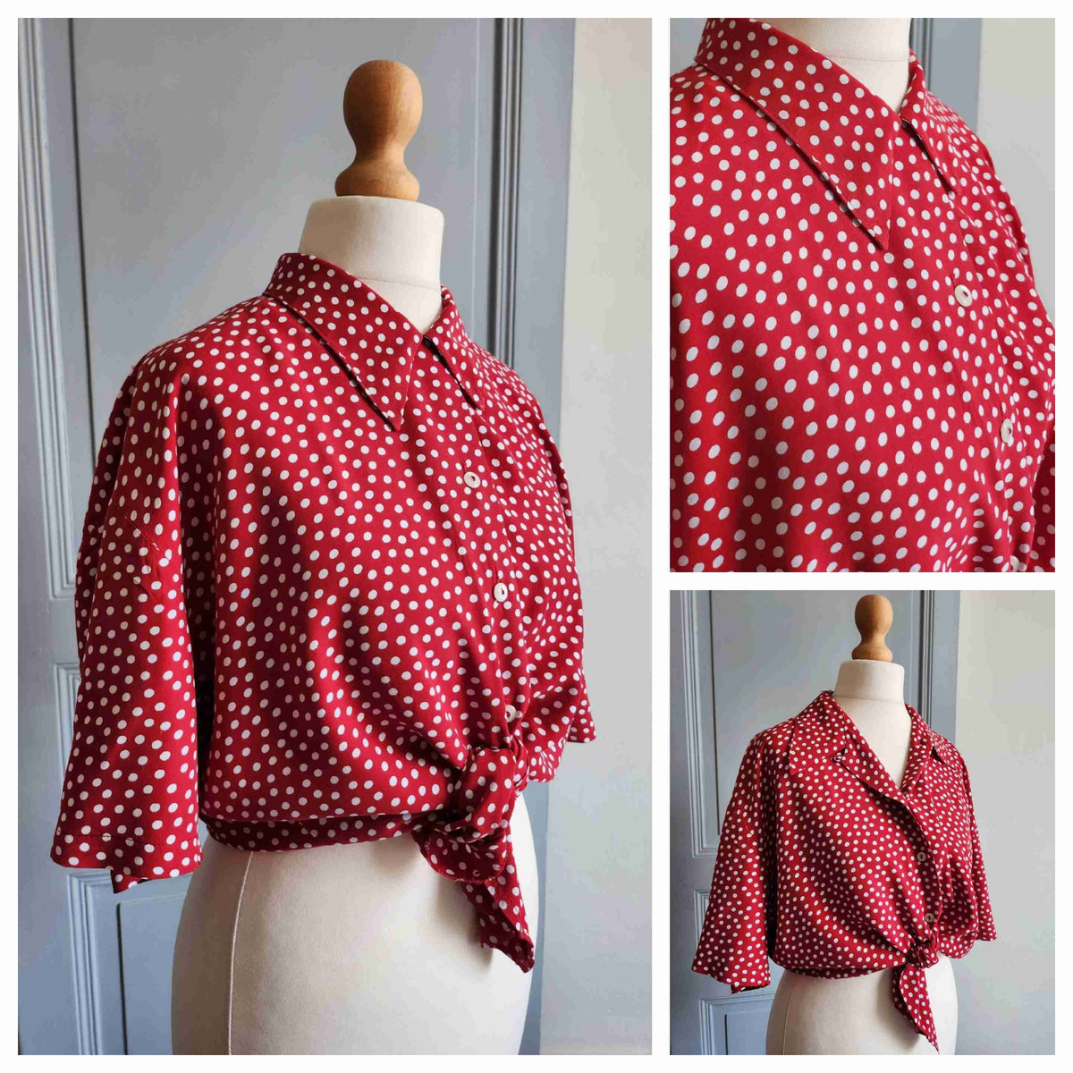 Prix unitaire parChemise en viscose rouge à pois blancs, manches courtes coudes. Bouton bride pour fermer le col. Marque Promod.