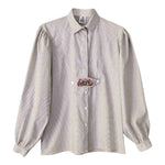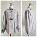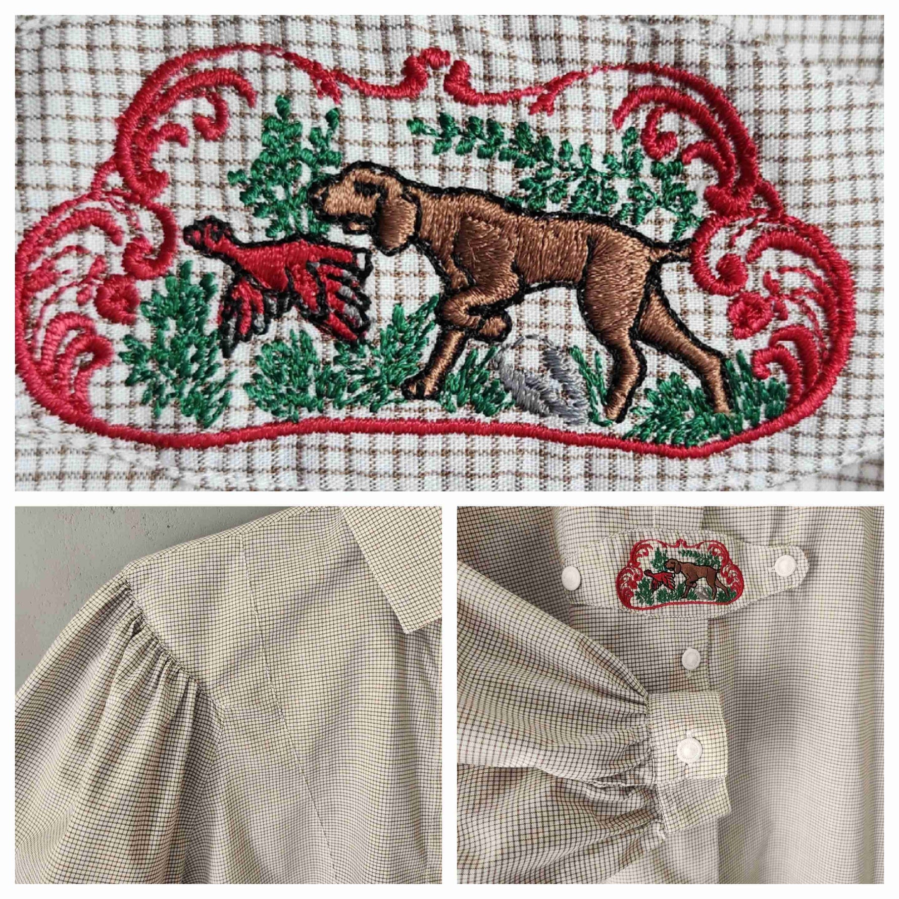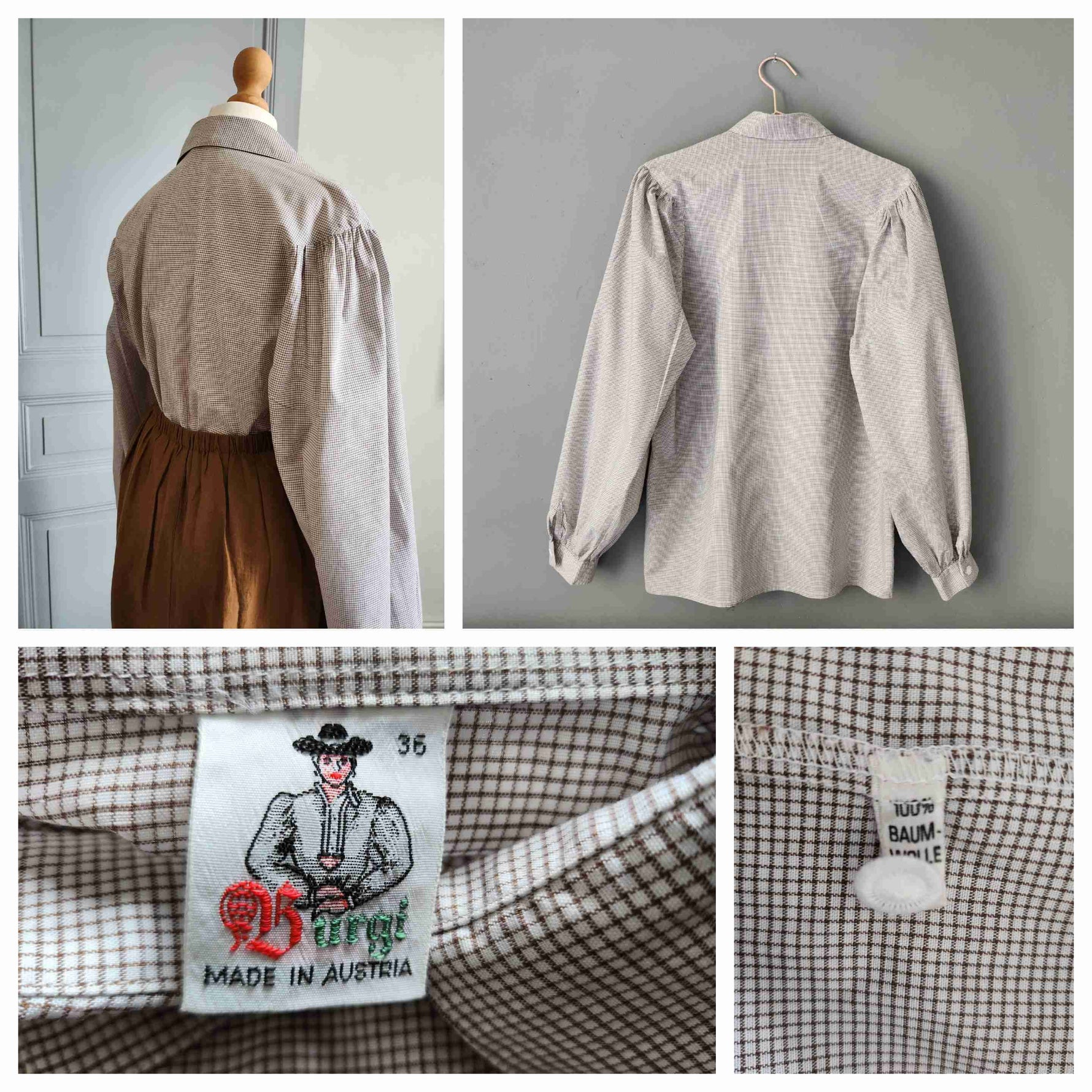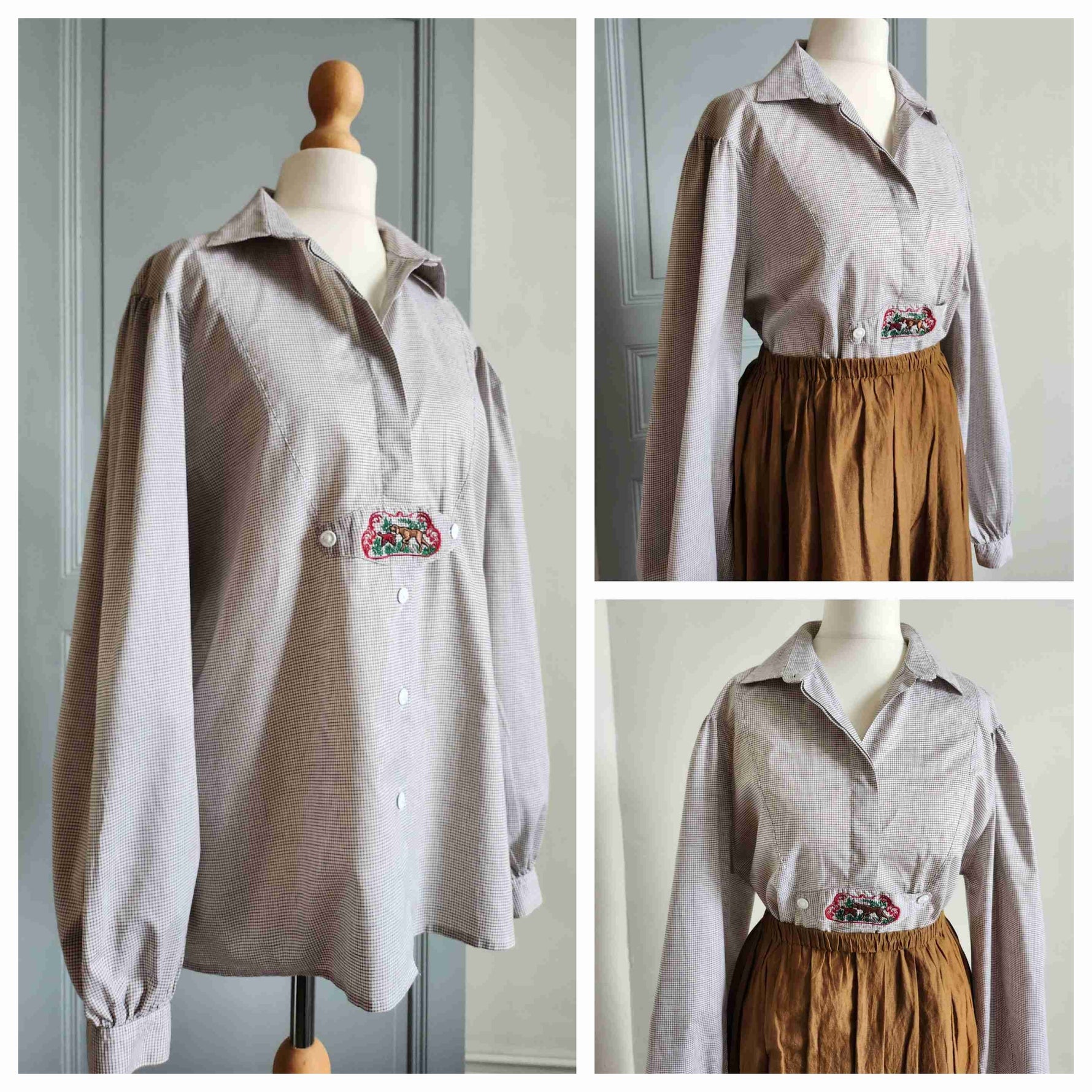 Prix unitaire parChemise autrichienne en coton quadrillé marron sur fond blanc, manches longues extra bouffantes, boutons fils, haut de la boutonnière cachée, broderie chien, poignets boutonnés. Porté sur les photos par une personne T36. Pièce 100% coton fabriquée en Autriche.