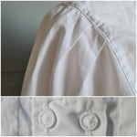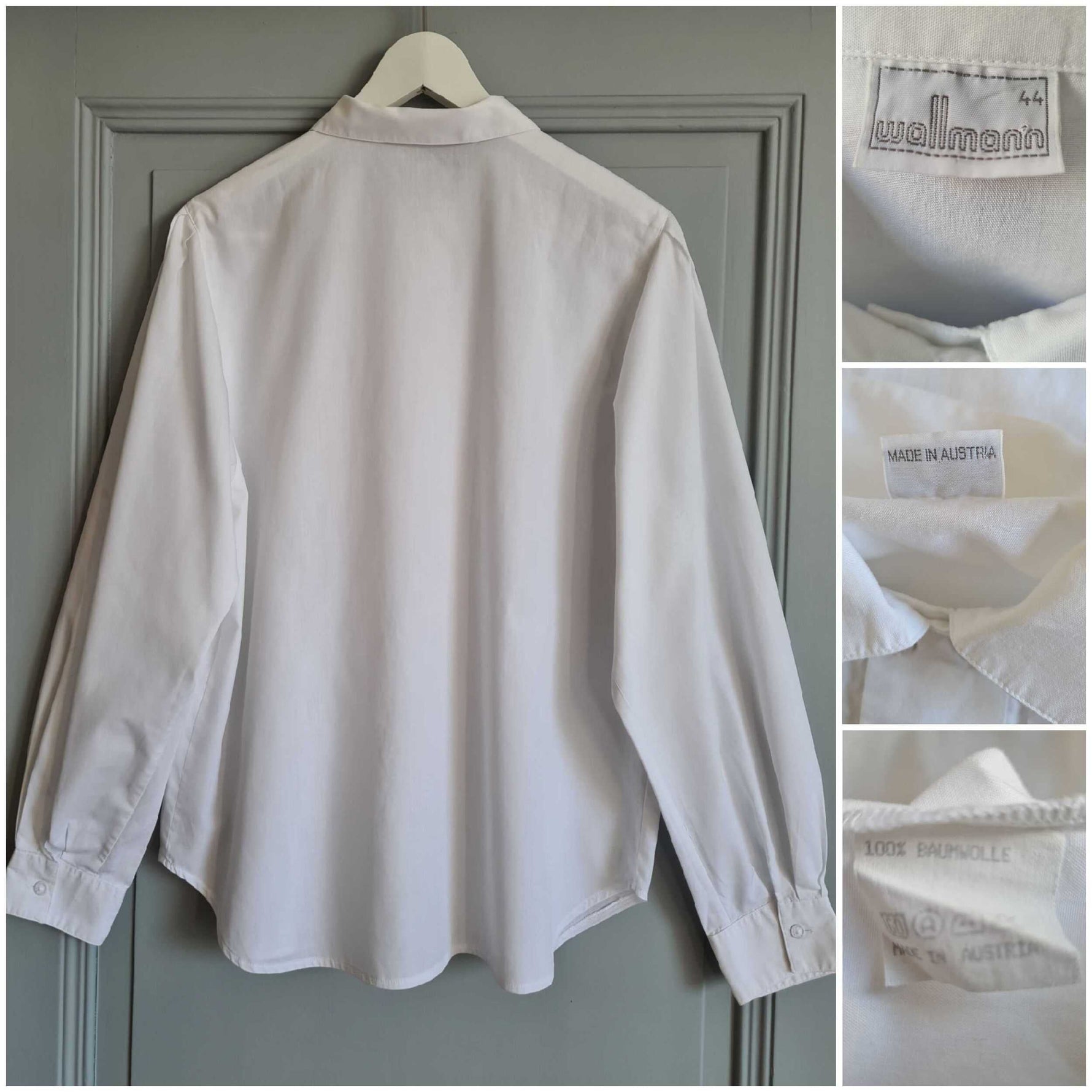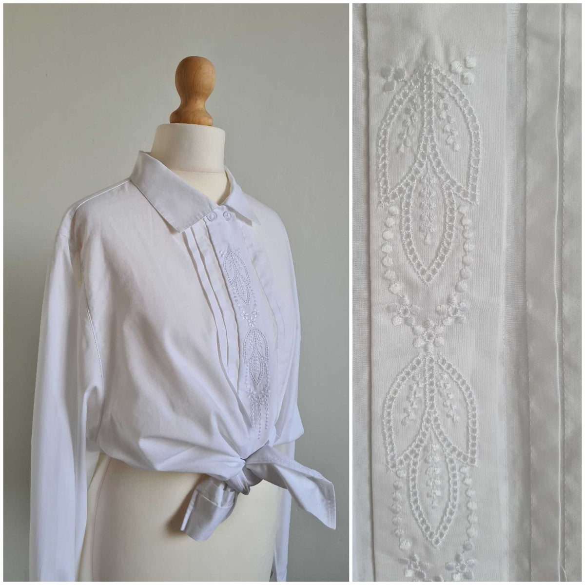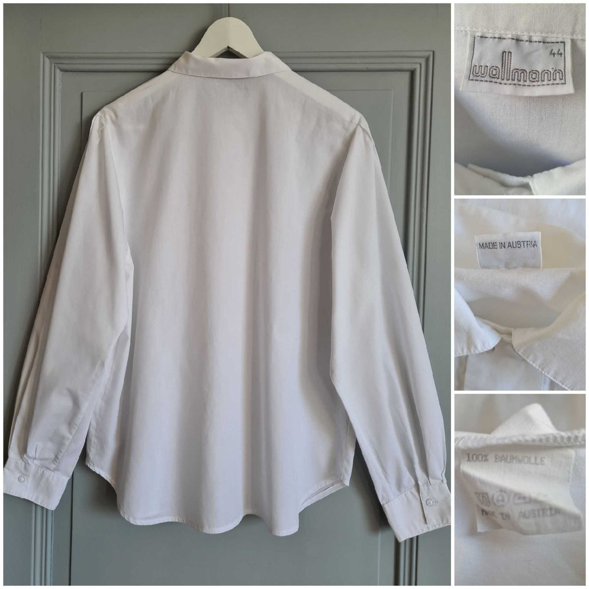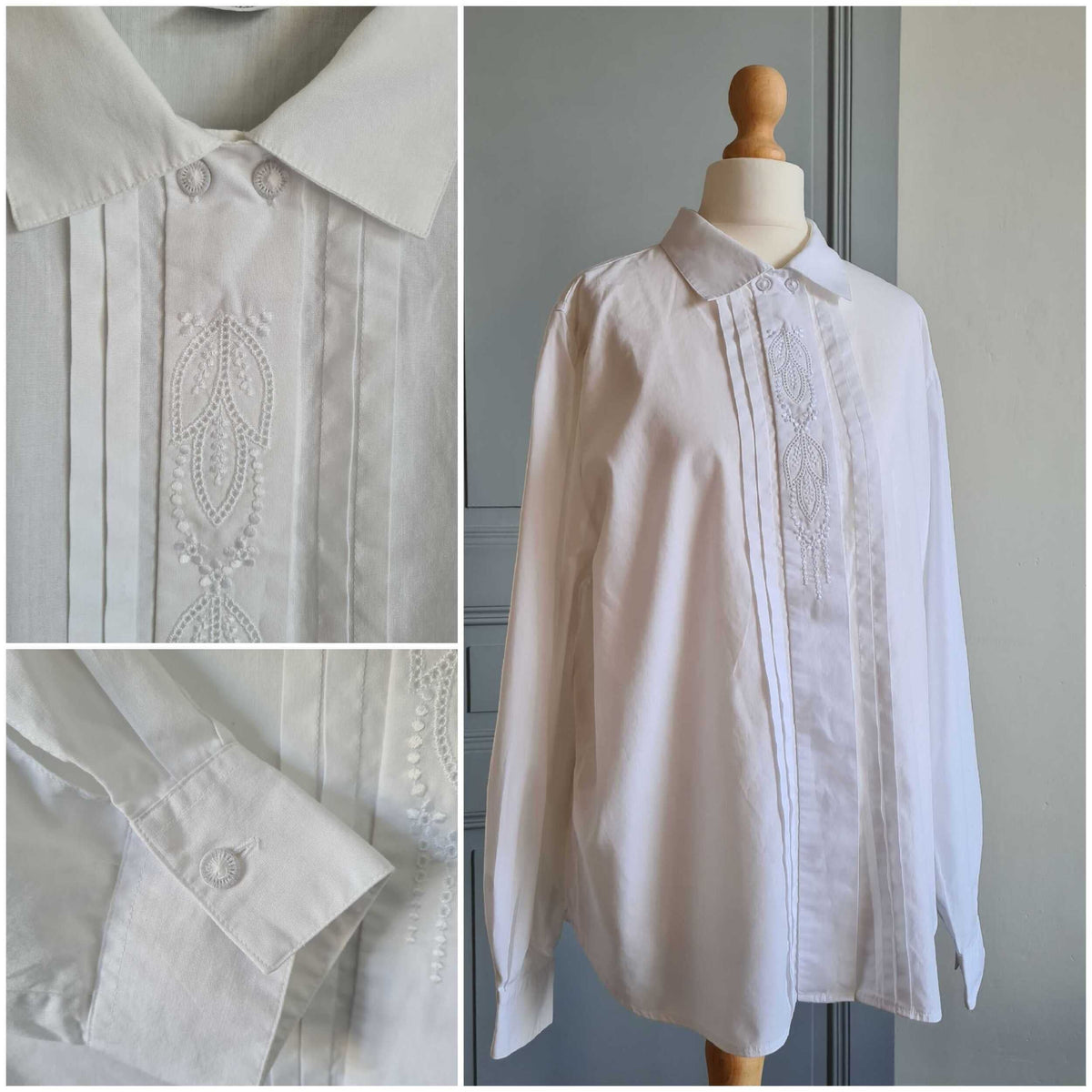 Prix unitaire parChemise autrichienne en coton blanc, coupe droite ample, manches longues bouffantes, fermée par deux boutons recouverts fil, boutonnière cachée, broderie florale à jours et plissé. Porté oversize pour les 36/38. Fabriquée en Autriche.