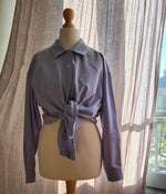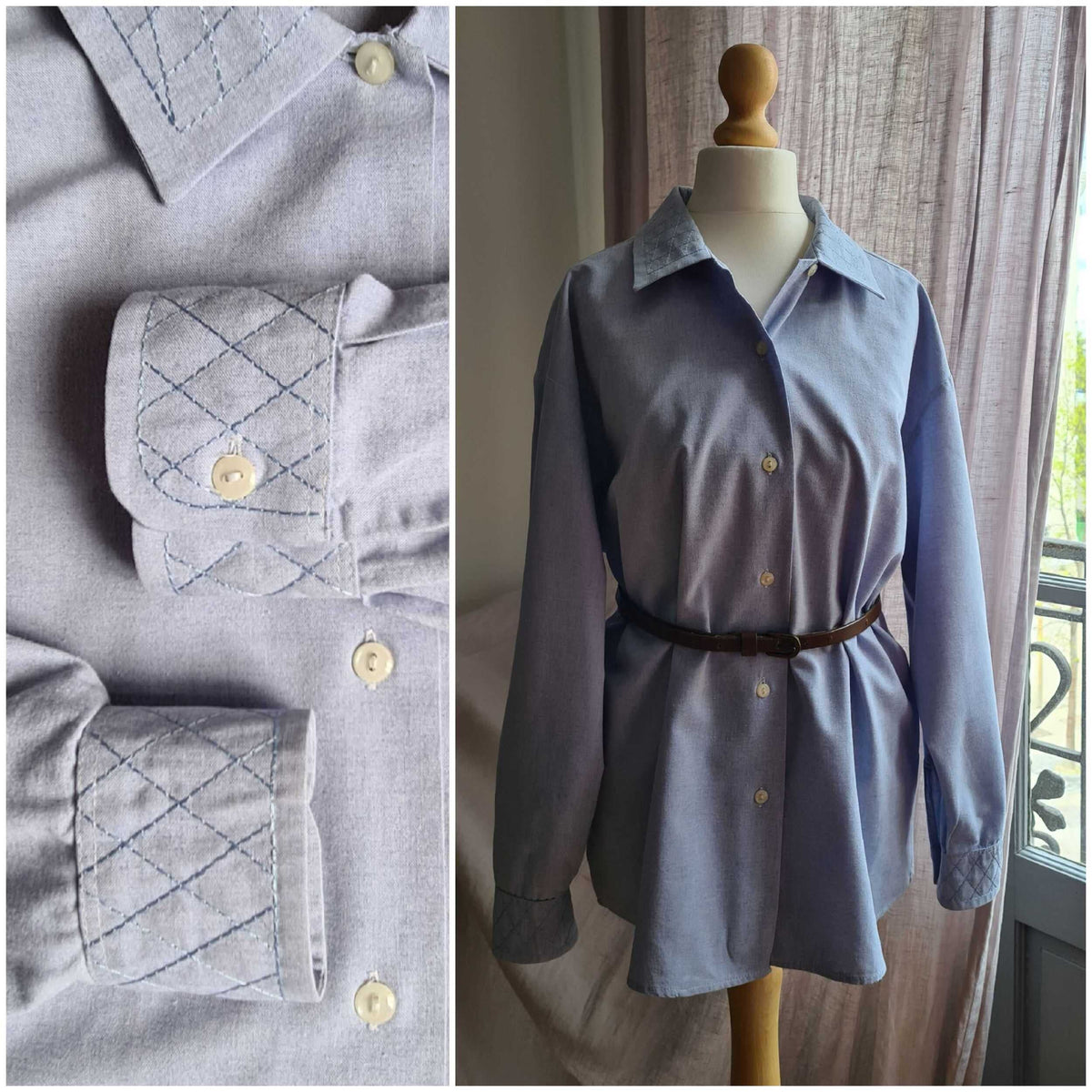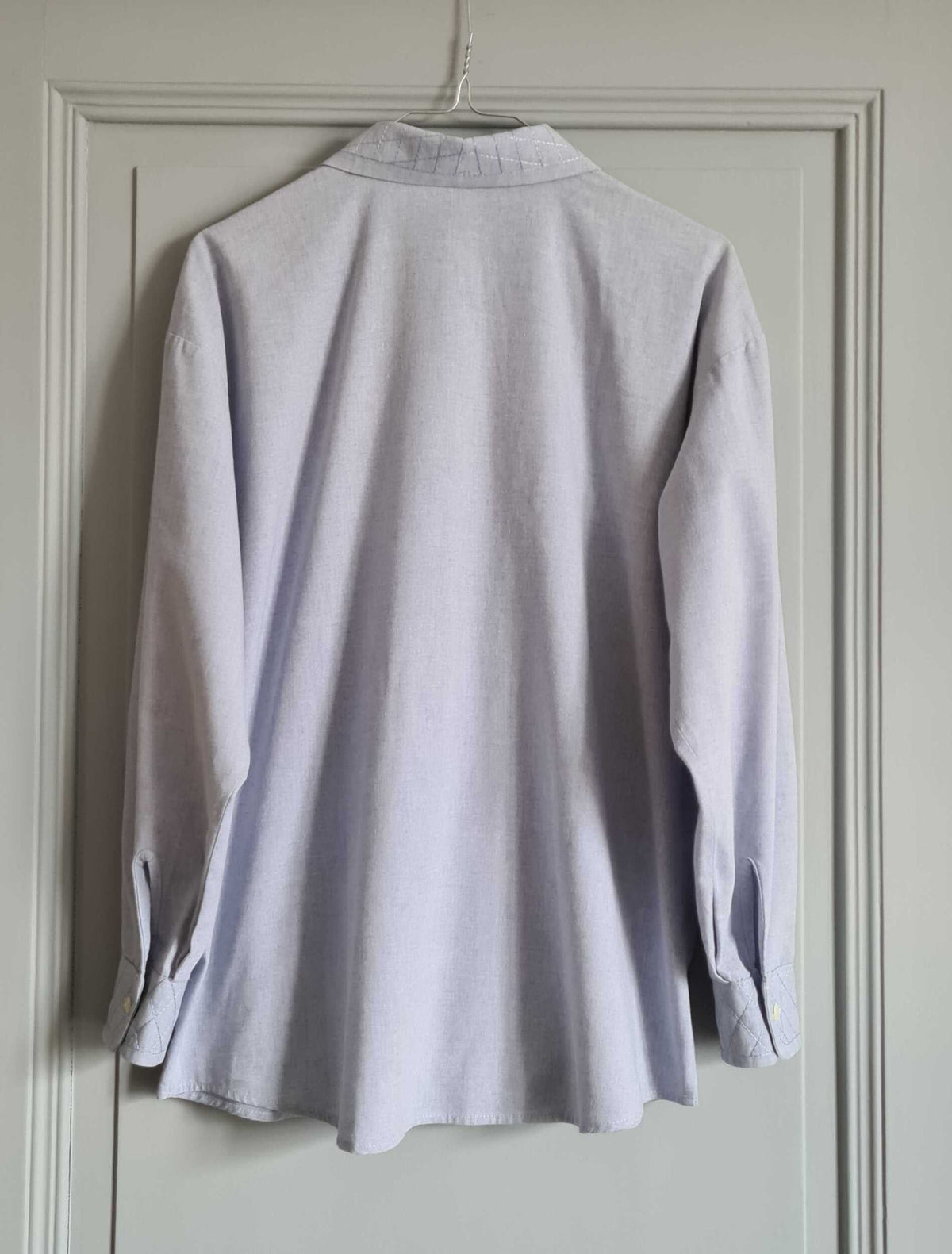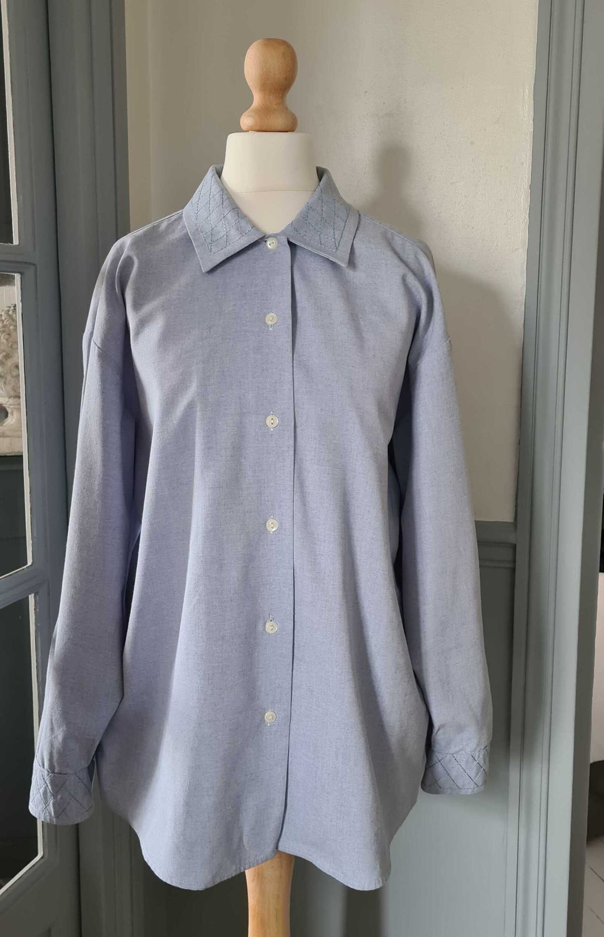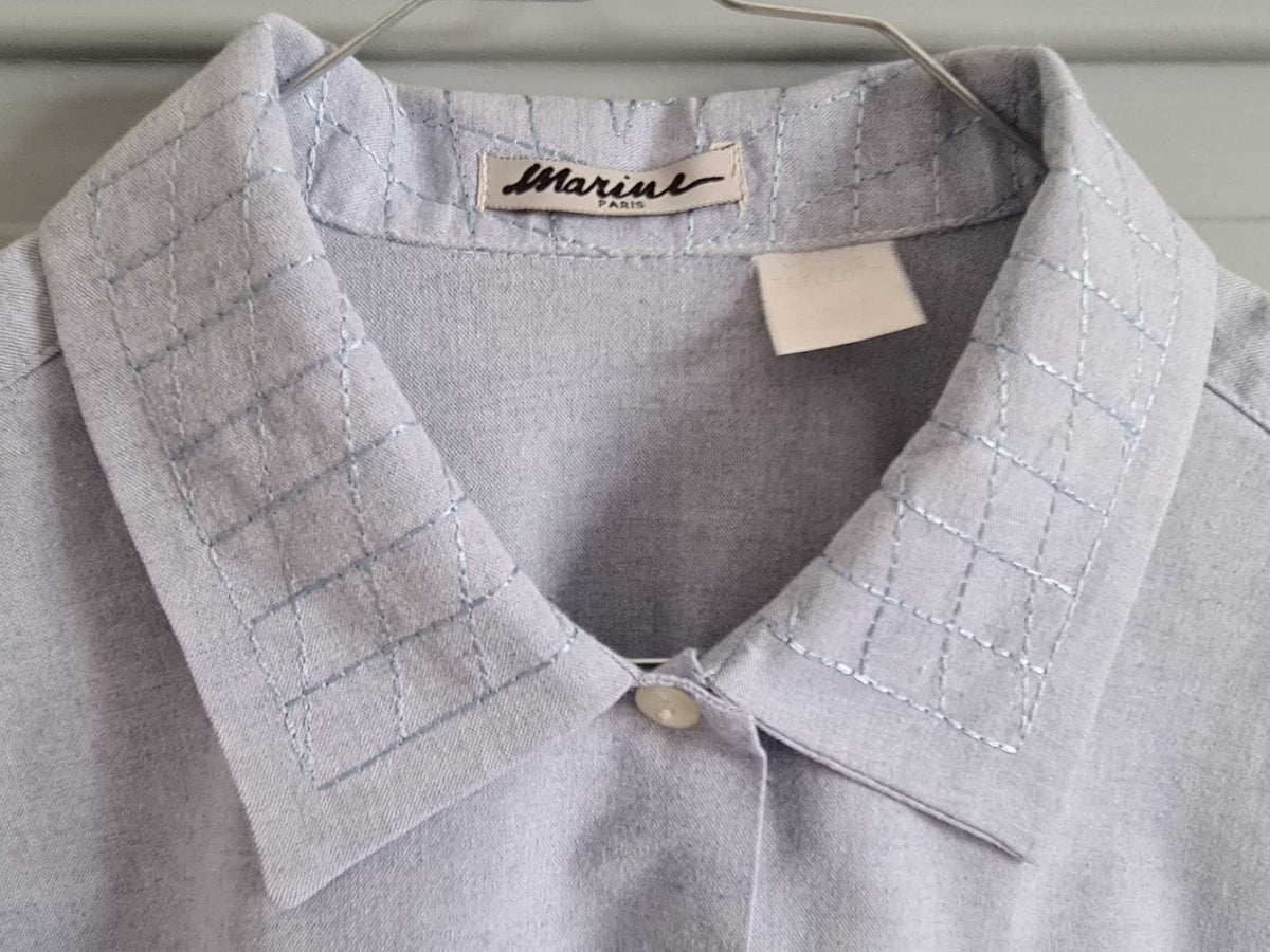 Prix unitaire parChemise manches longues en chambray de coton bleu clair, surpiqûres diagonales ton sur ton au col et manchettes. Poignets fermés par un bouton. Coupe droite. Porter oversized. Fabrication française années 80.
