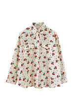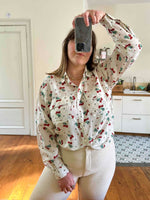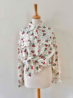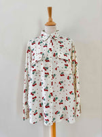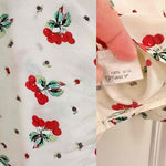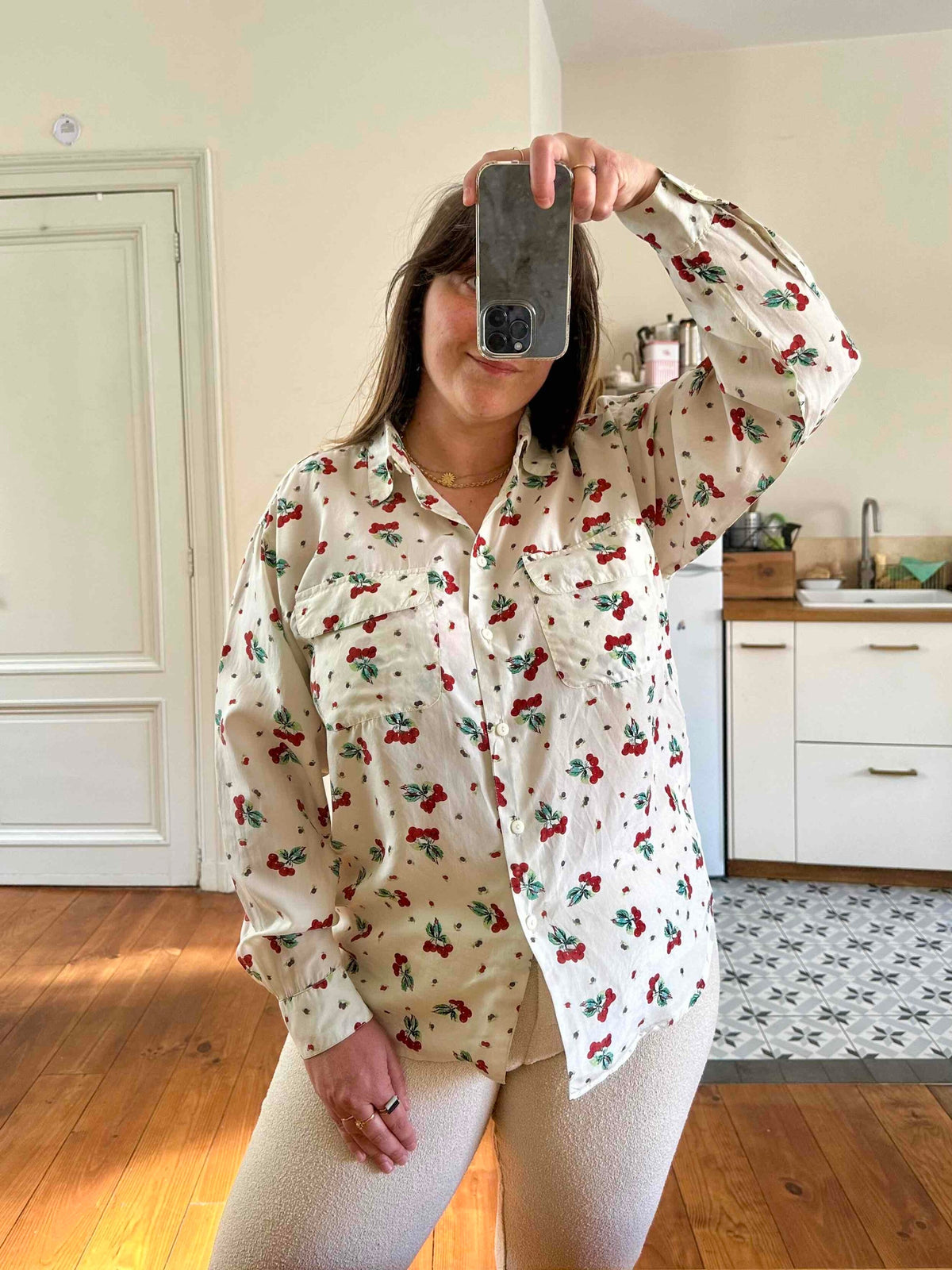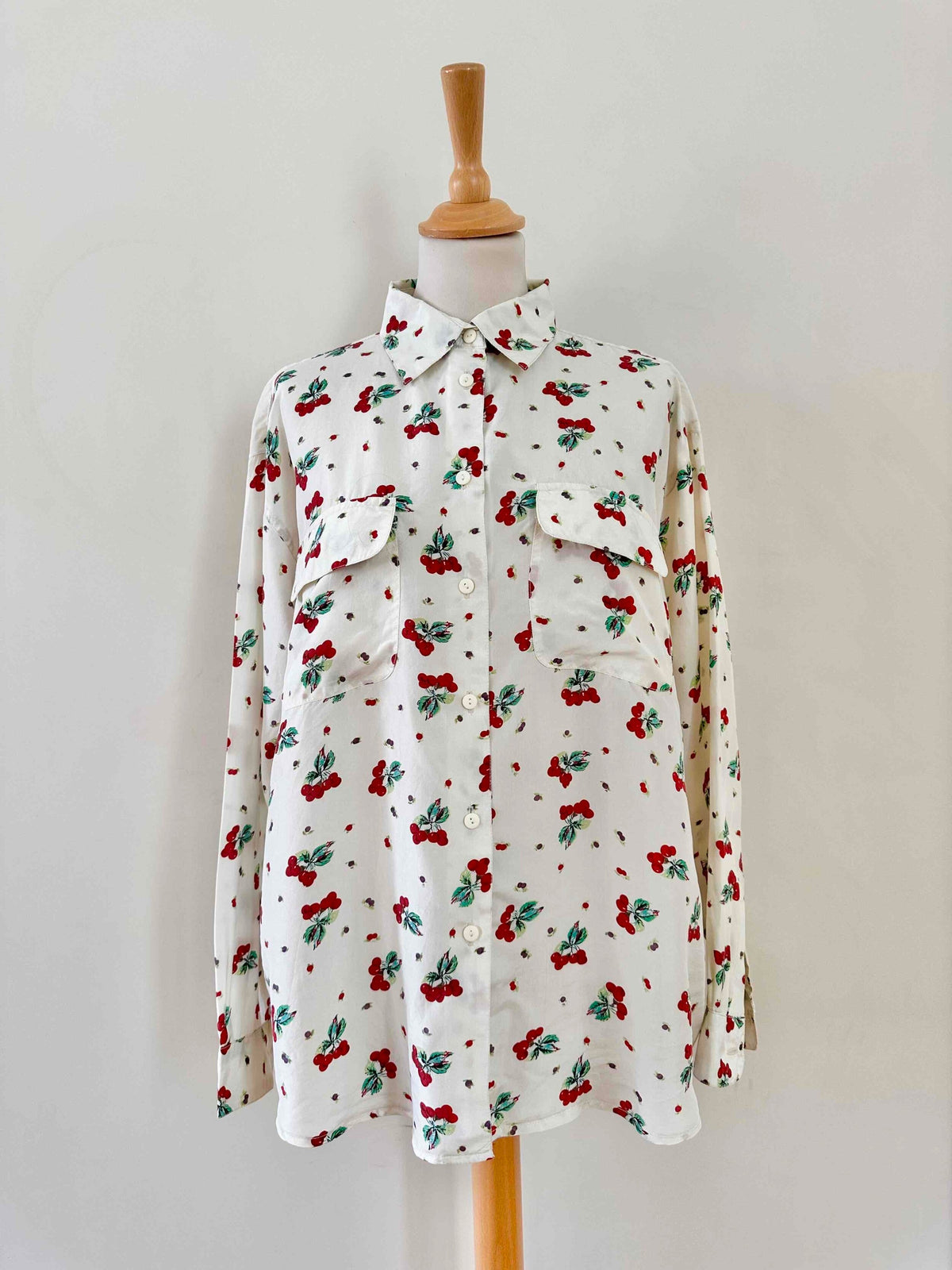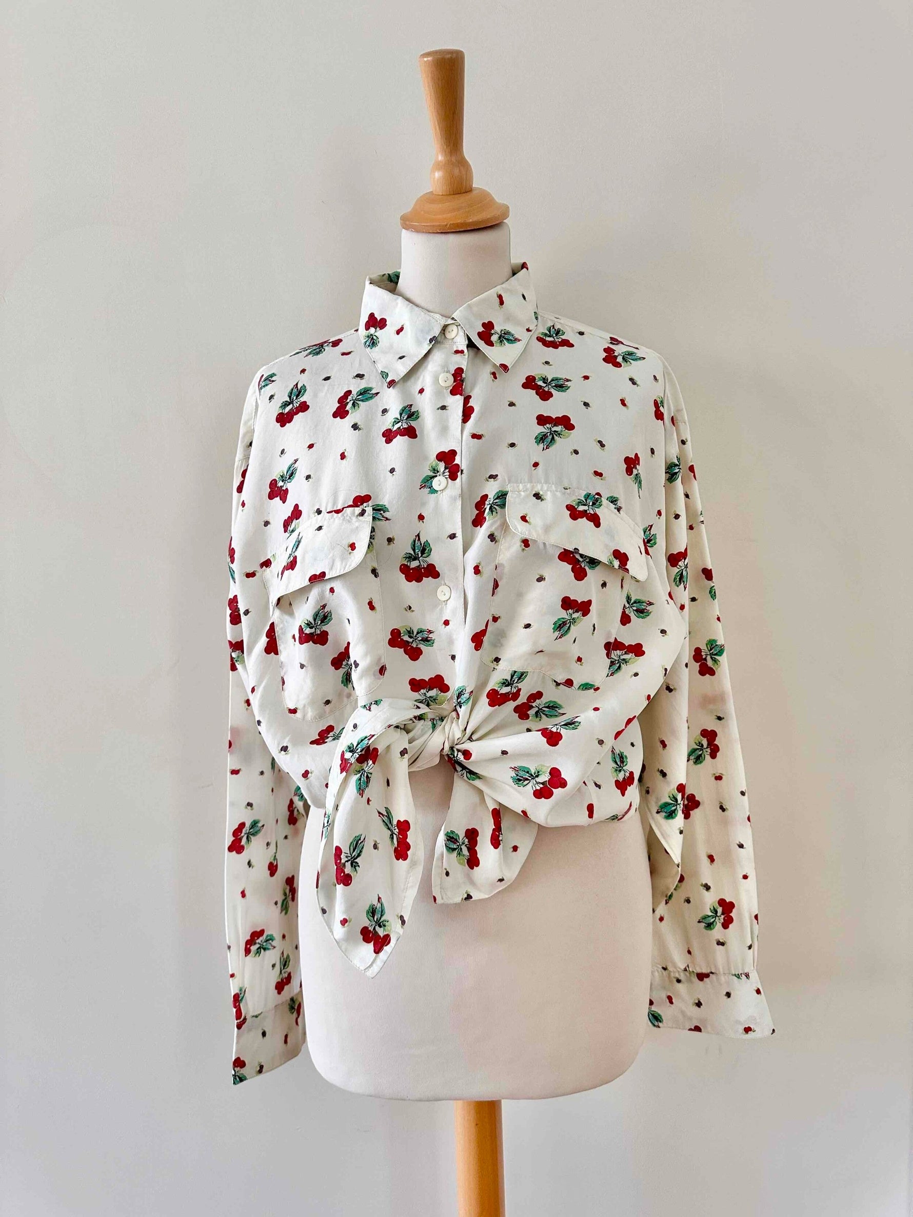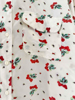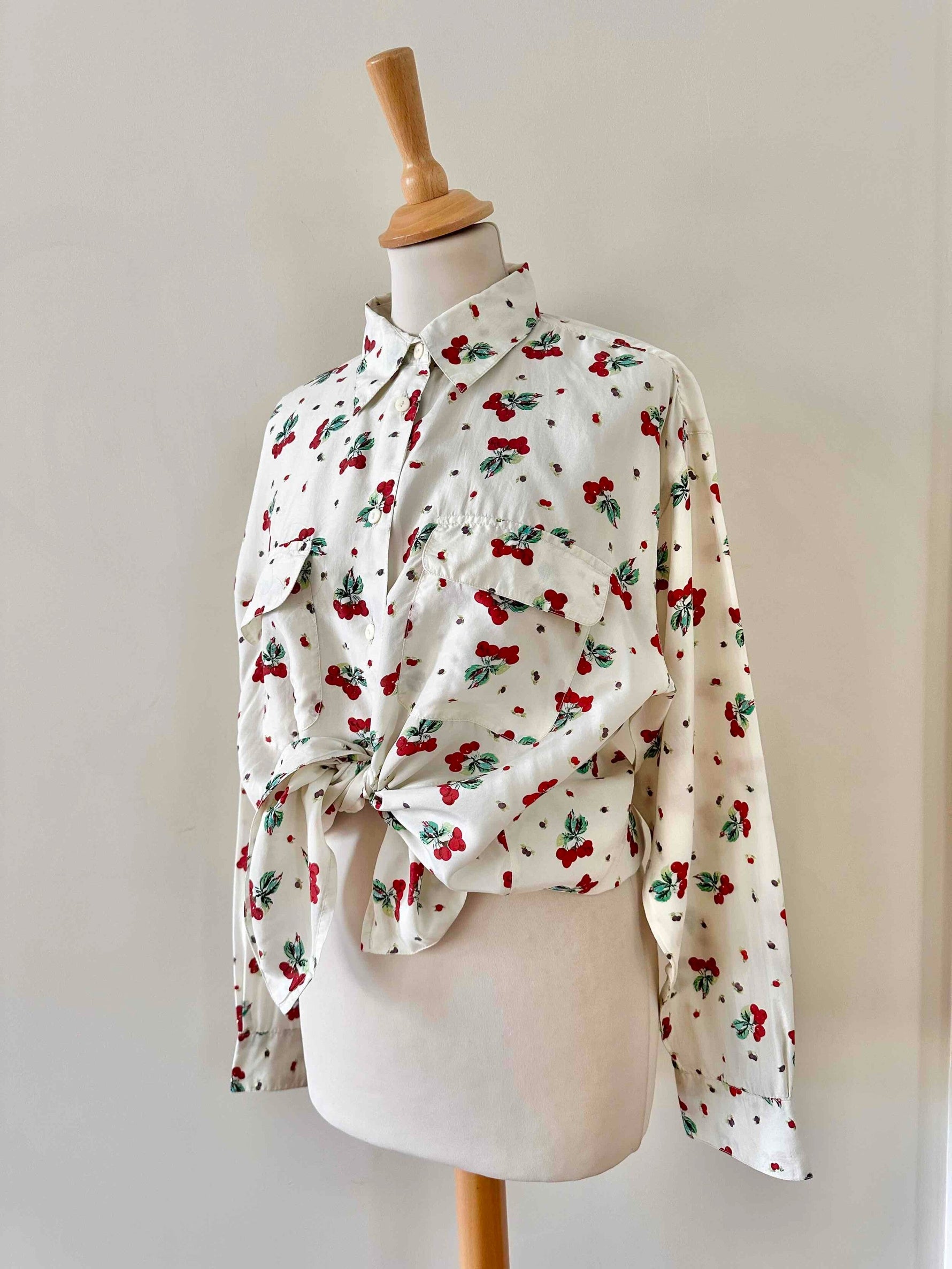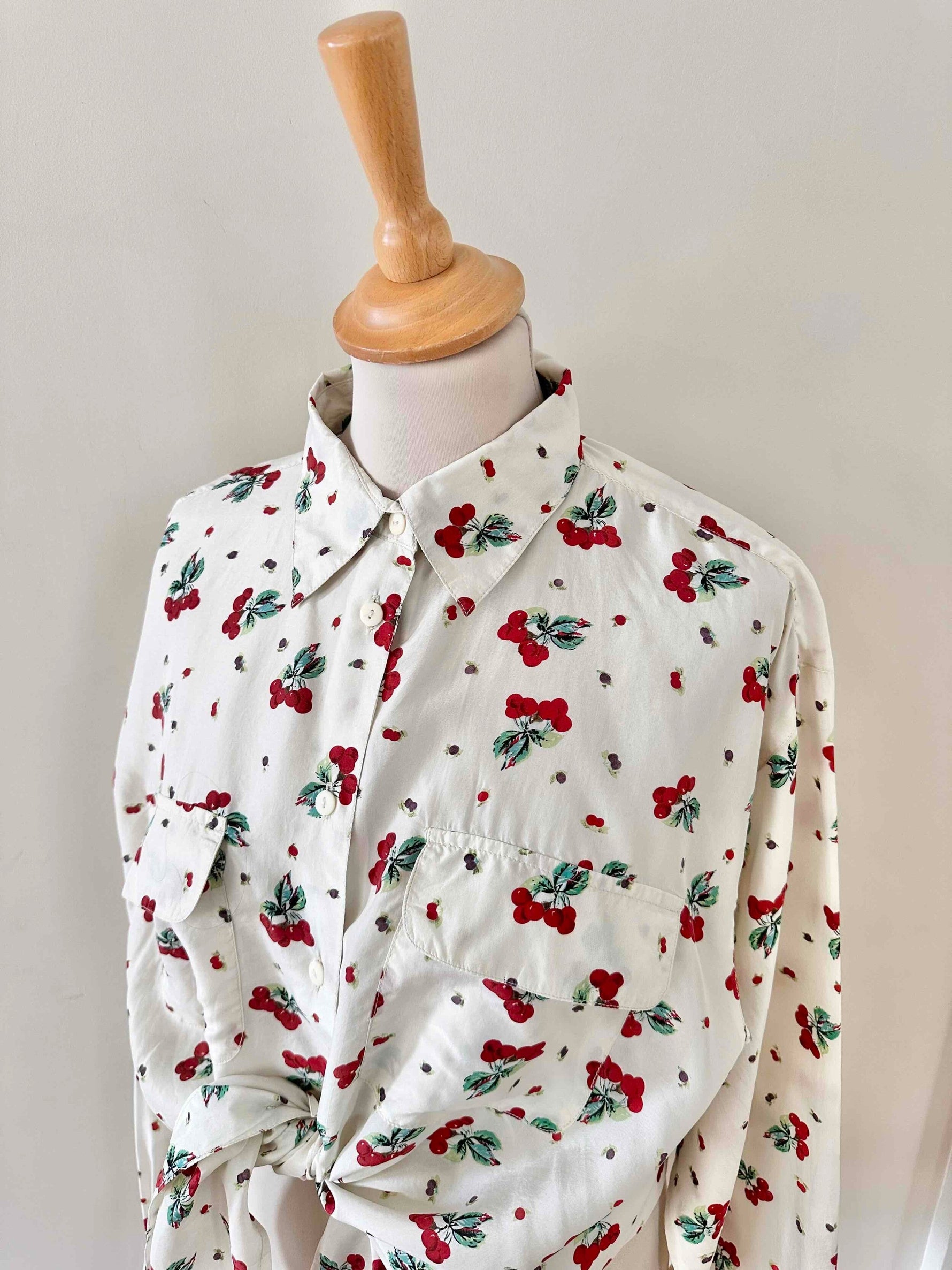 Prix unitaire parChemise cerises en soie, 100% soie blanc écrue imprimée cerises , poches poitrine, années 90s, convient du 36 au 40, portée ici sur un mannequin T36 et une personne T40.