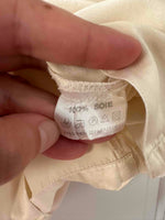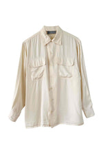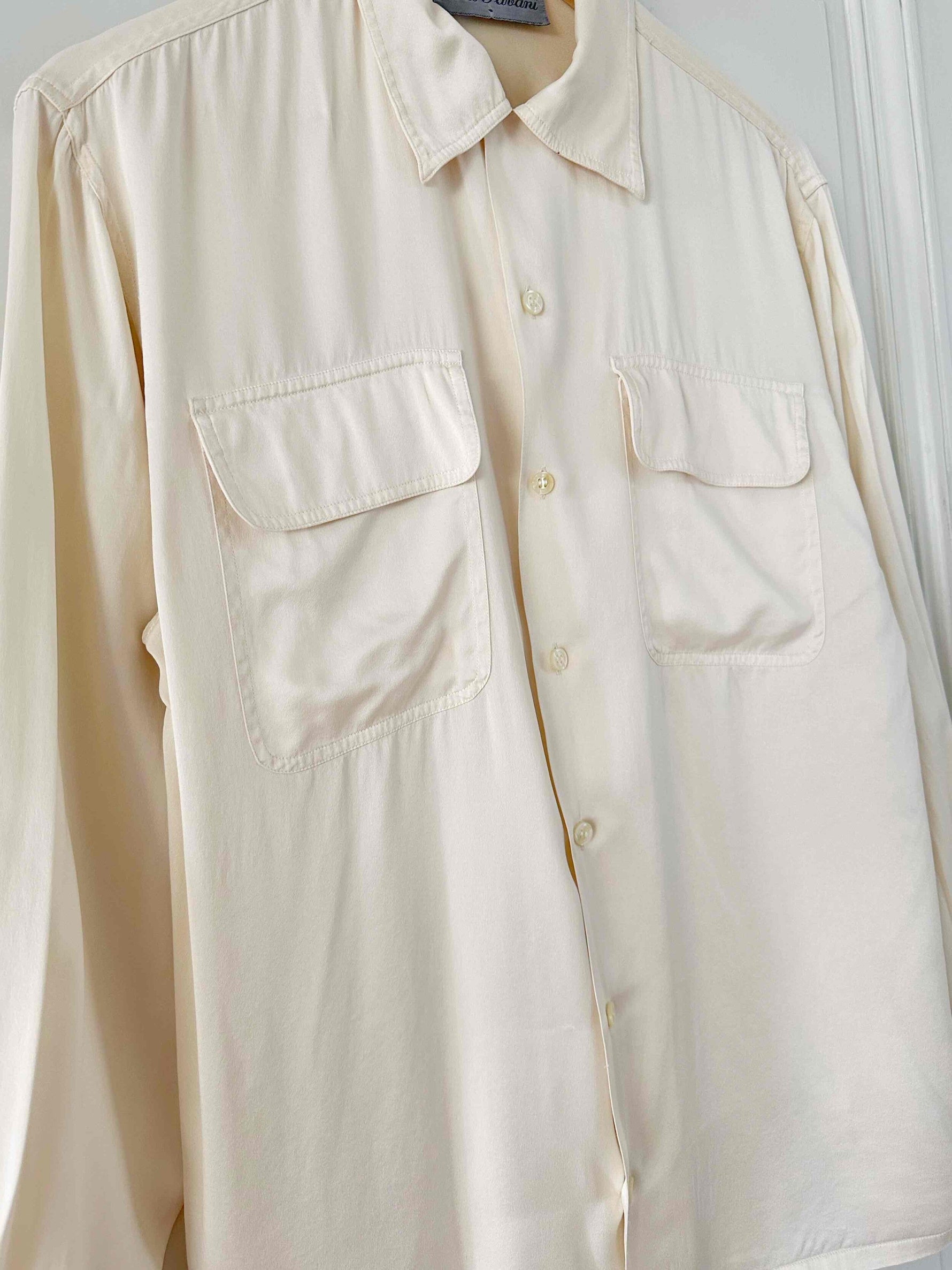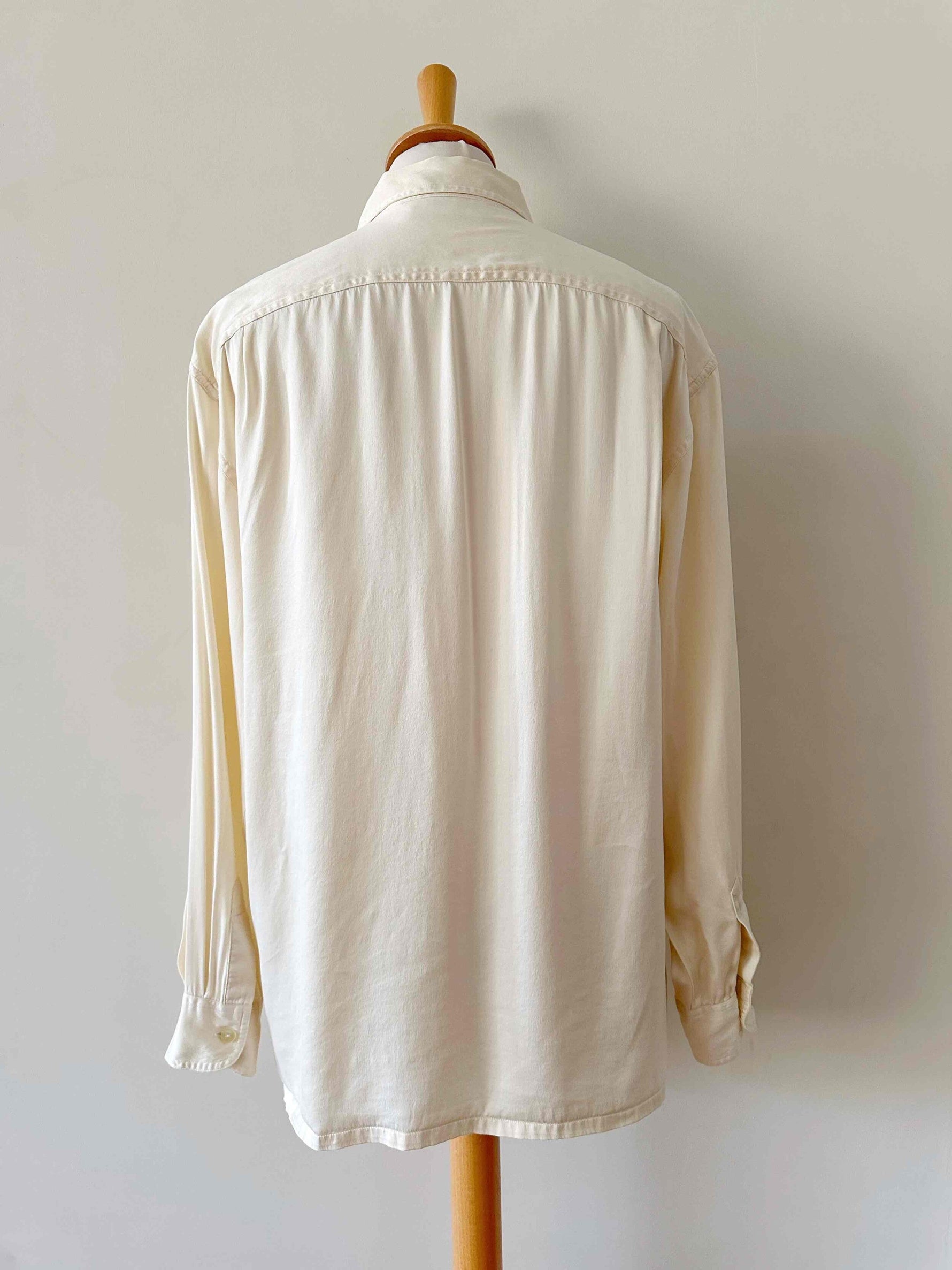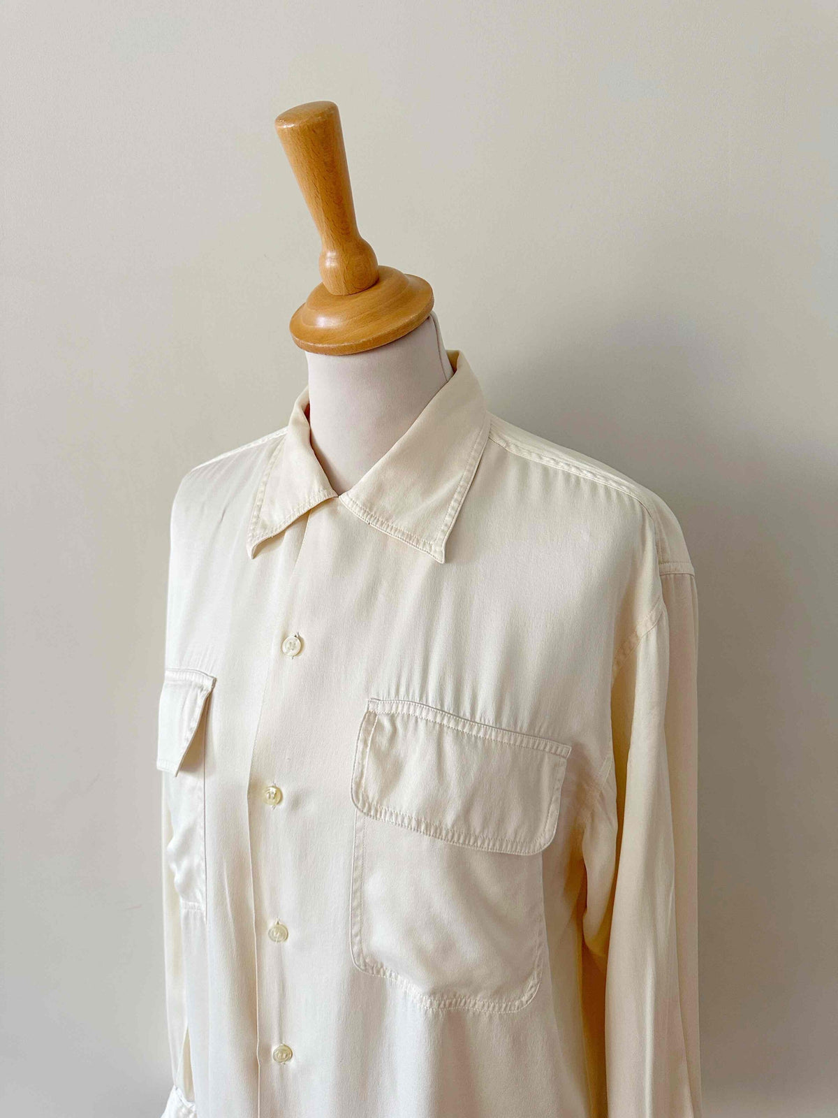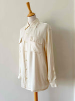 Chemise en satin de soie, blanc cassé ivoire, poches poitrines, taillle 36 portée ici sur un mannequin T36.