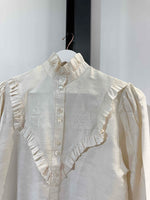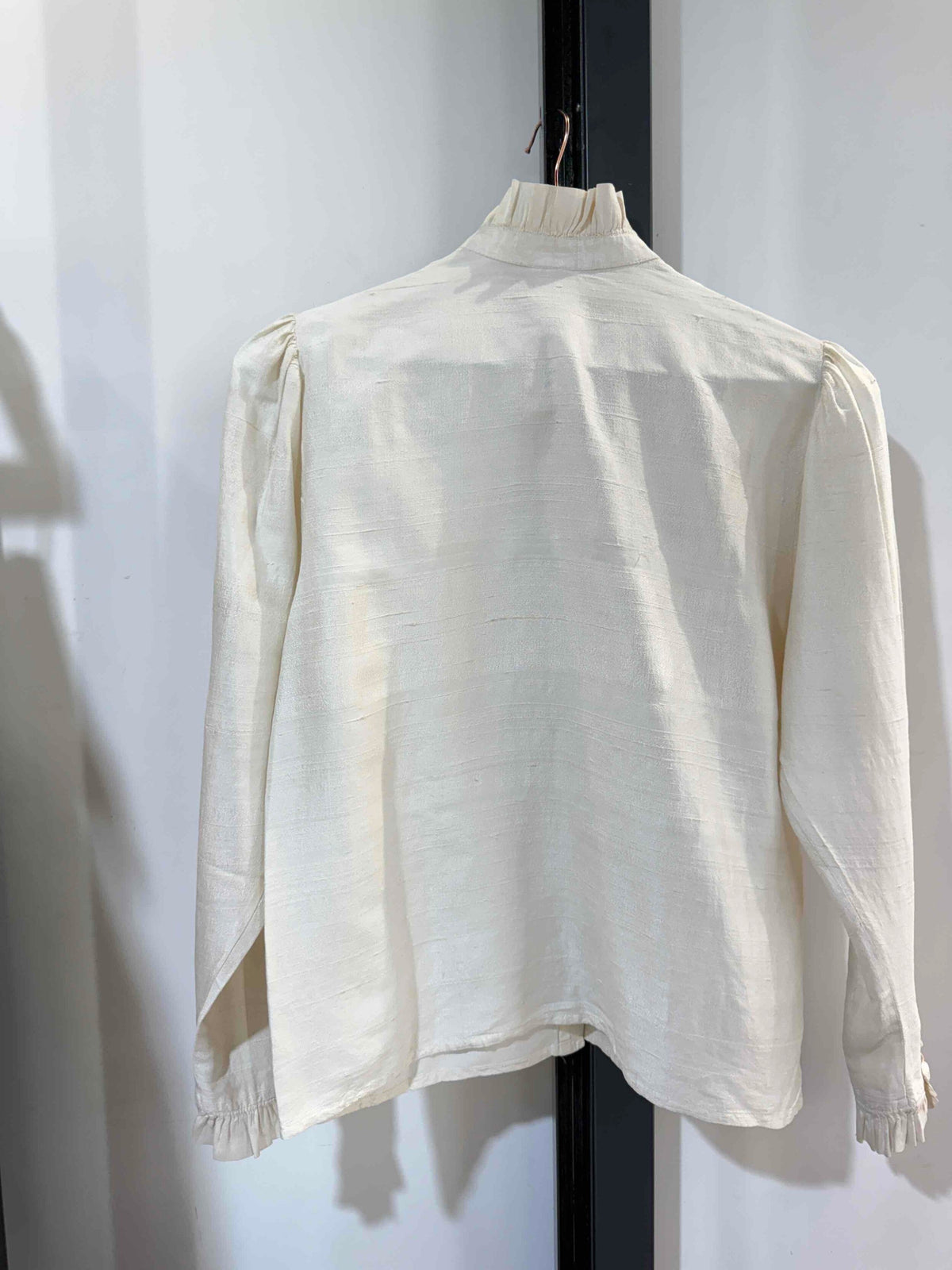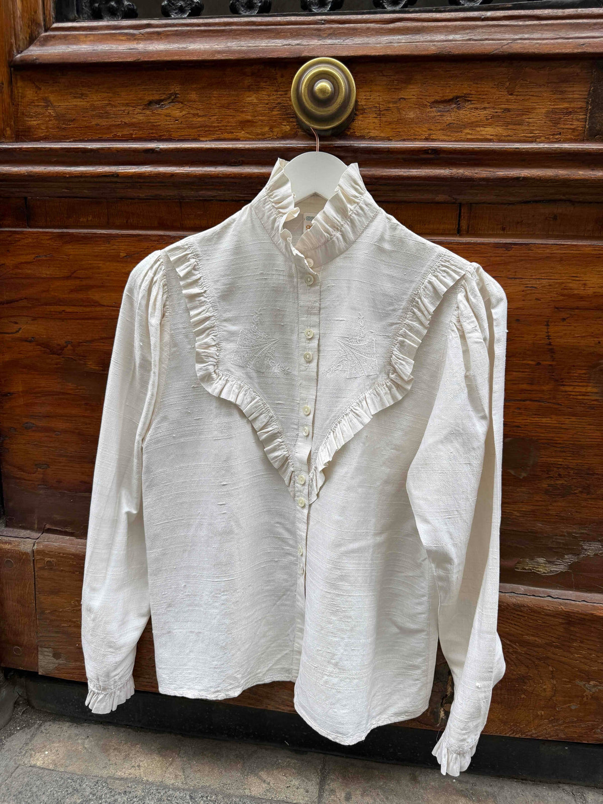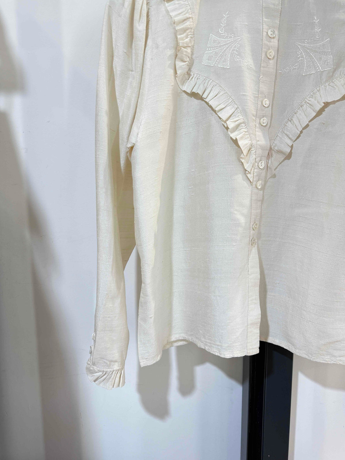 Prix unitaire parChemise autrichien en soie sauvage écru, taille 36. Fabriqué en Autriche. Col montant avec des volants. Broderies à la poitrine. Excellent état. Soie sauvage. Manches longues.