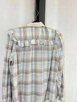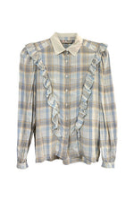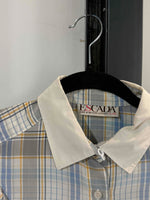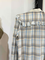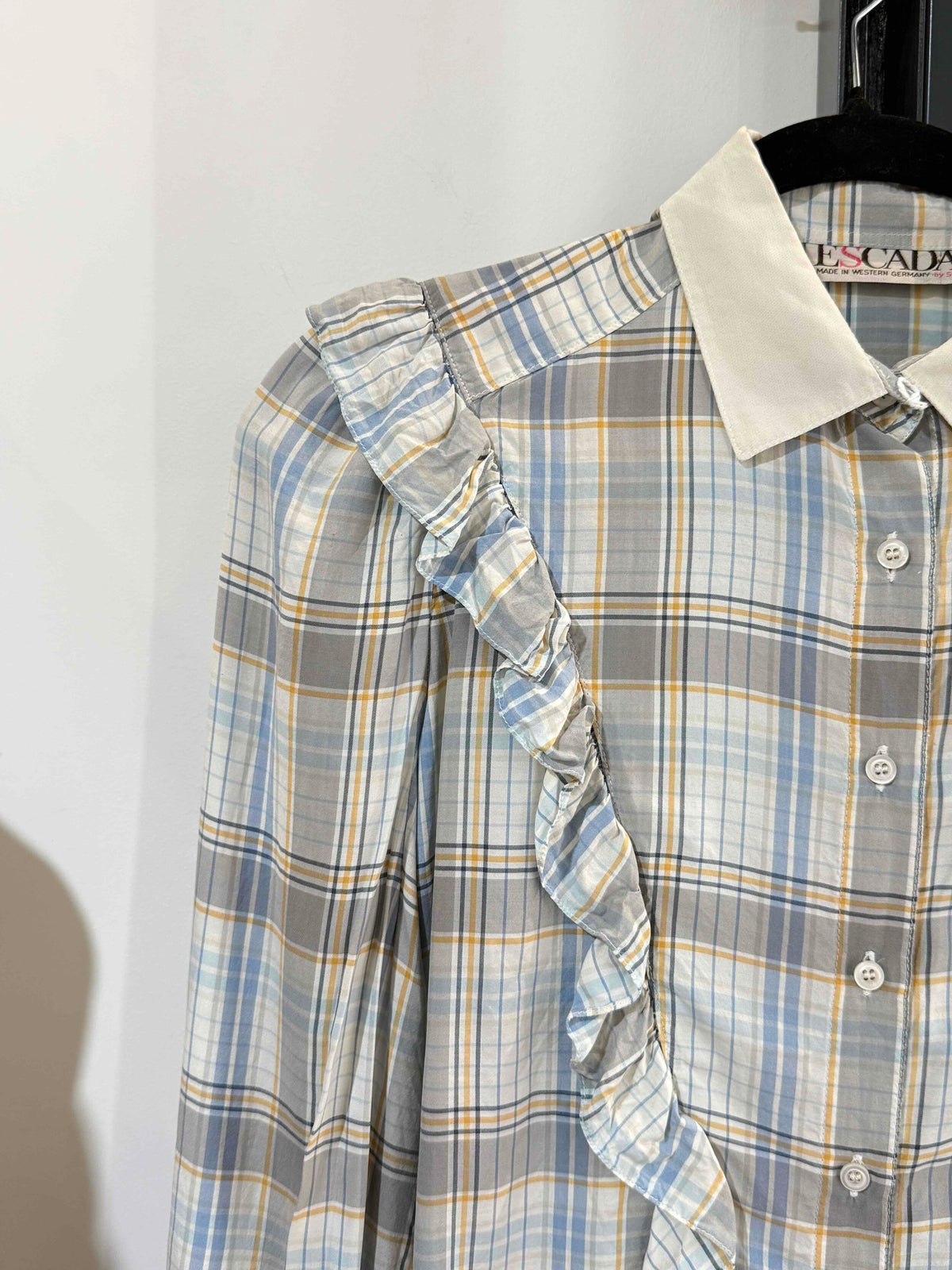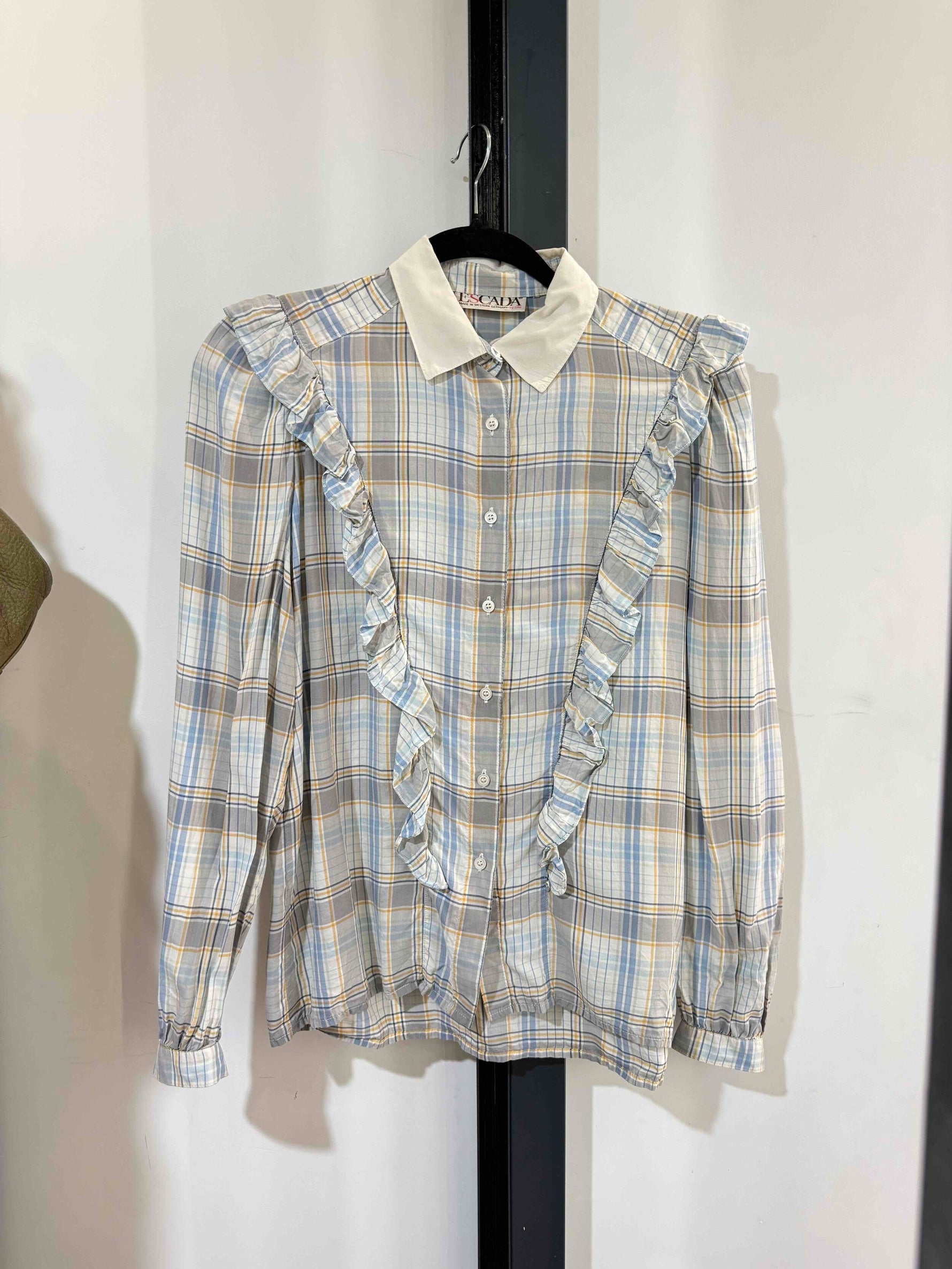 Blouse en soie fine à manches longues de la marque Escada, vintage. Made in Western Germany. Blanche à carreaux bleu gris avec des volants sur le devant et dos le dos. Soie fine et fluide. Années 80s. Taille S / M