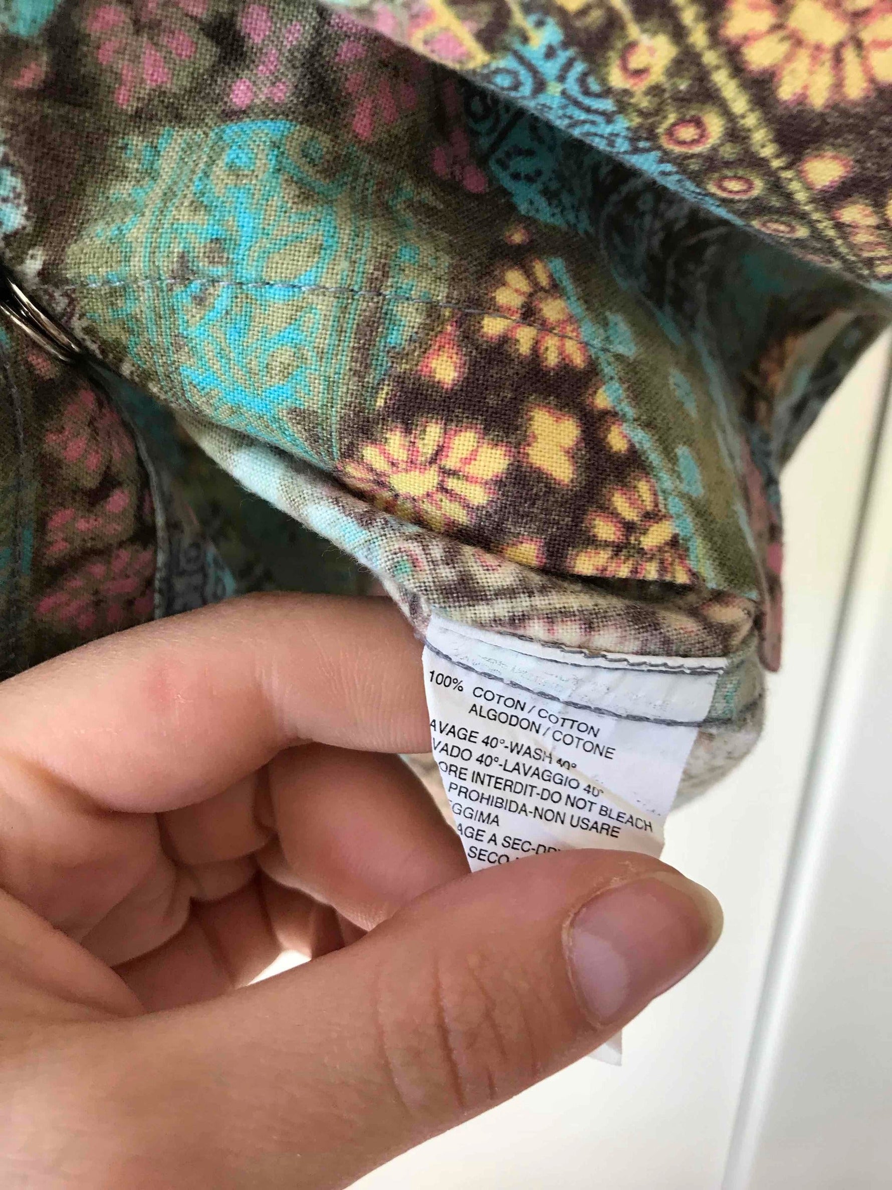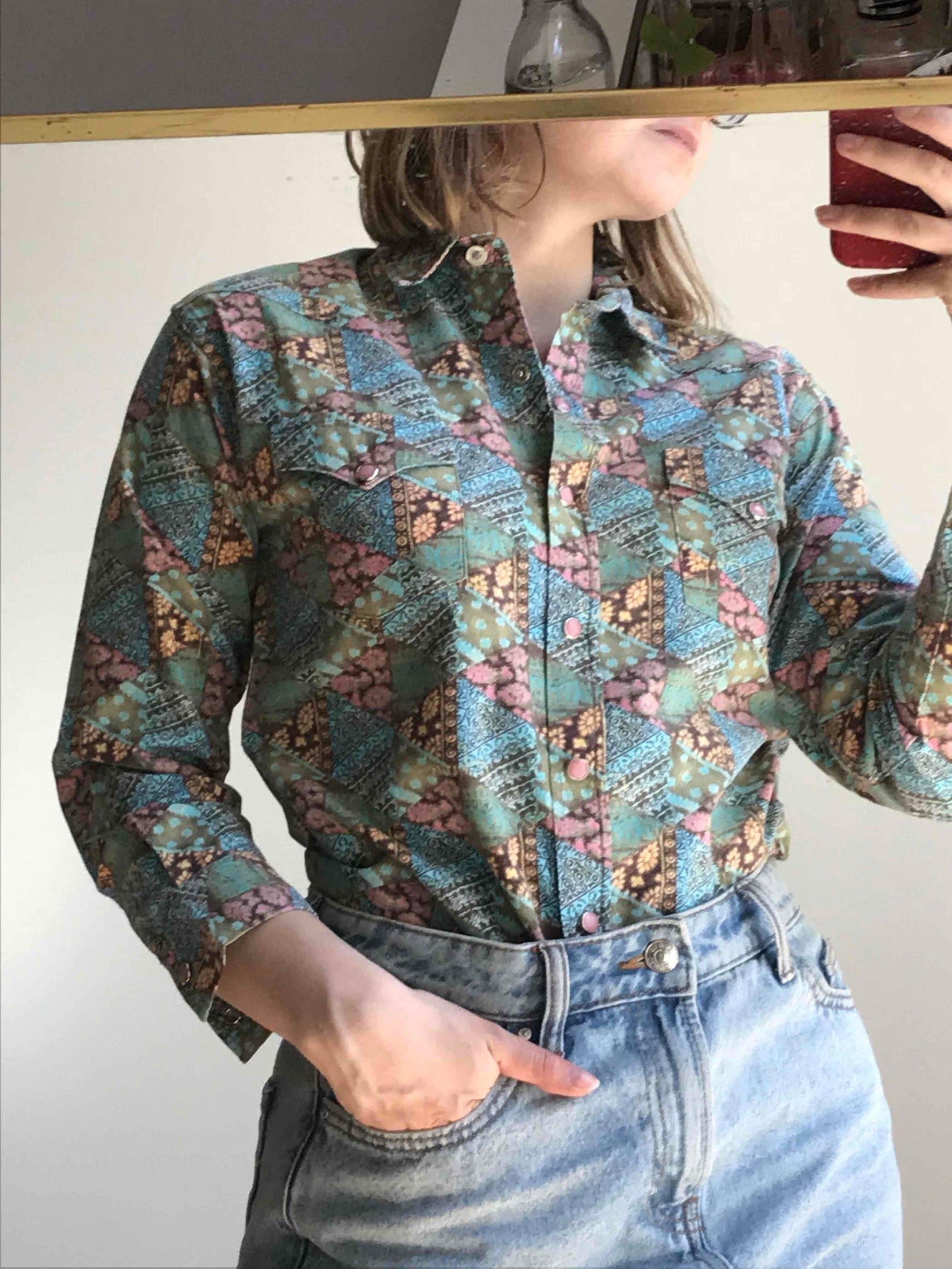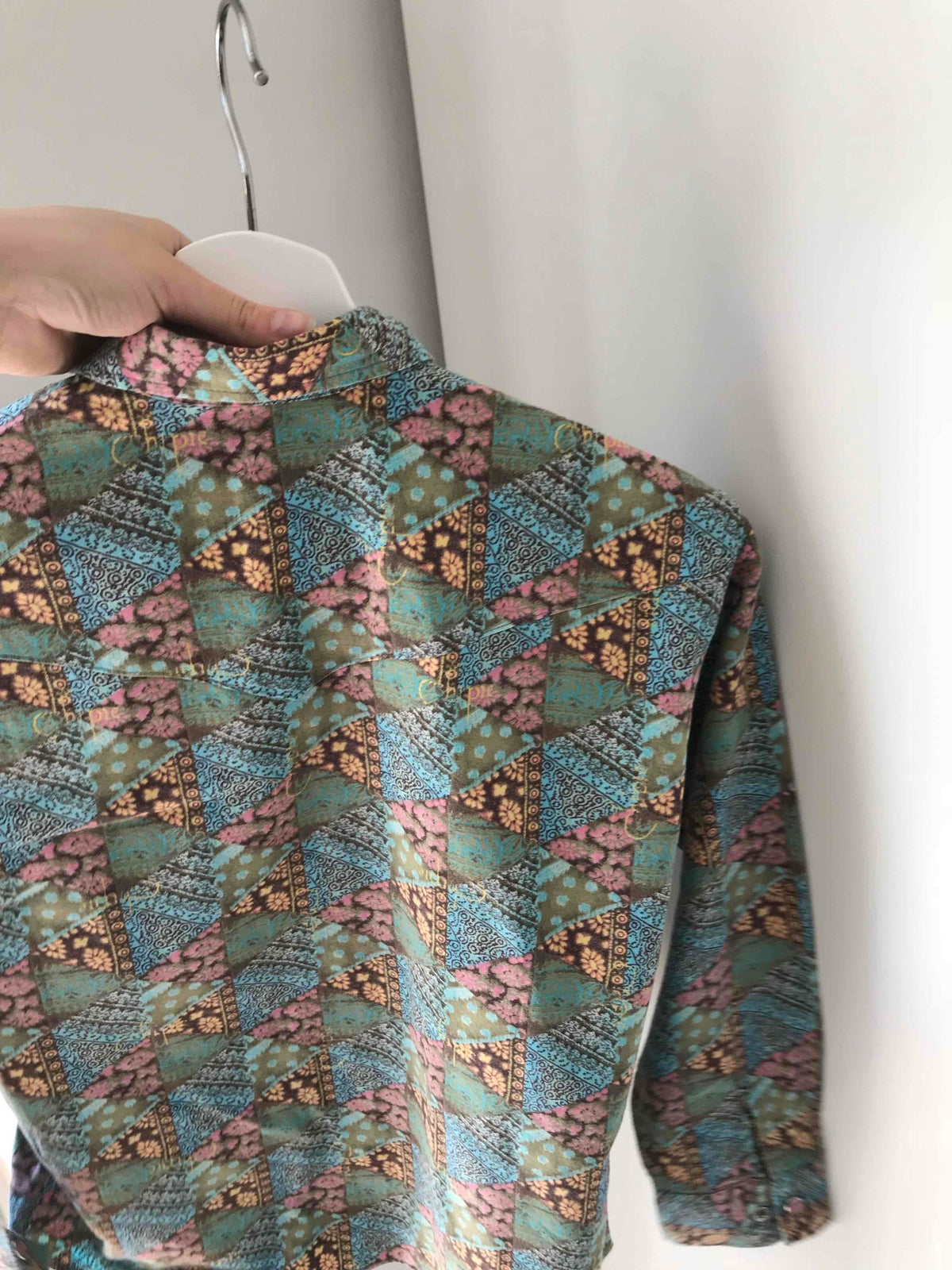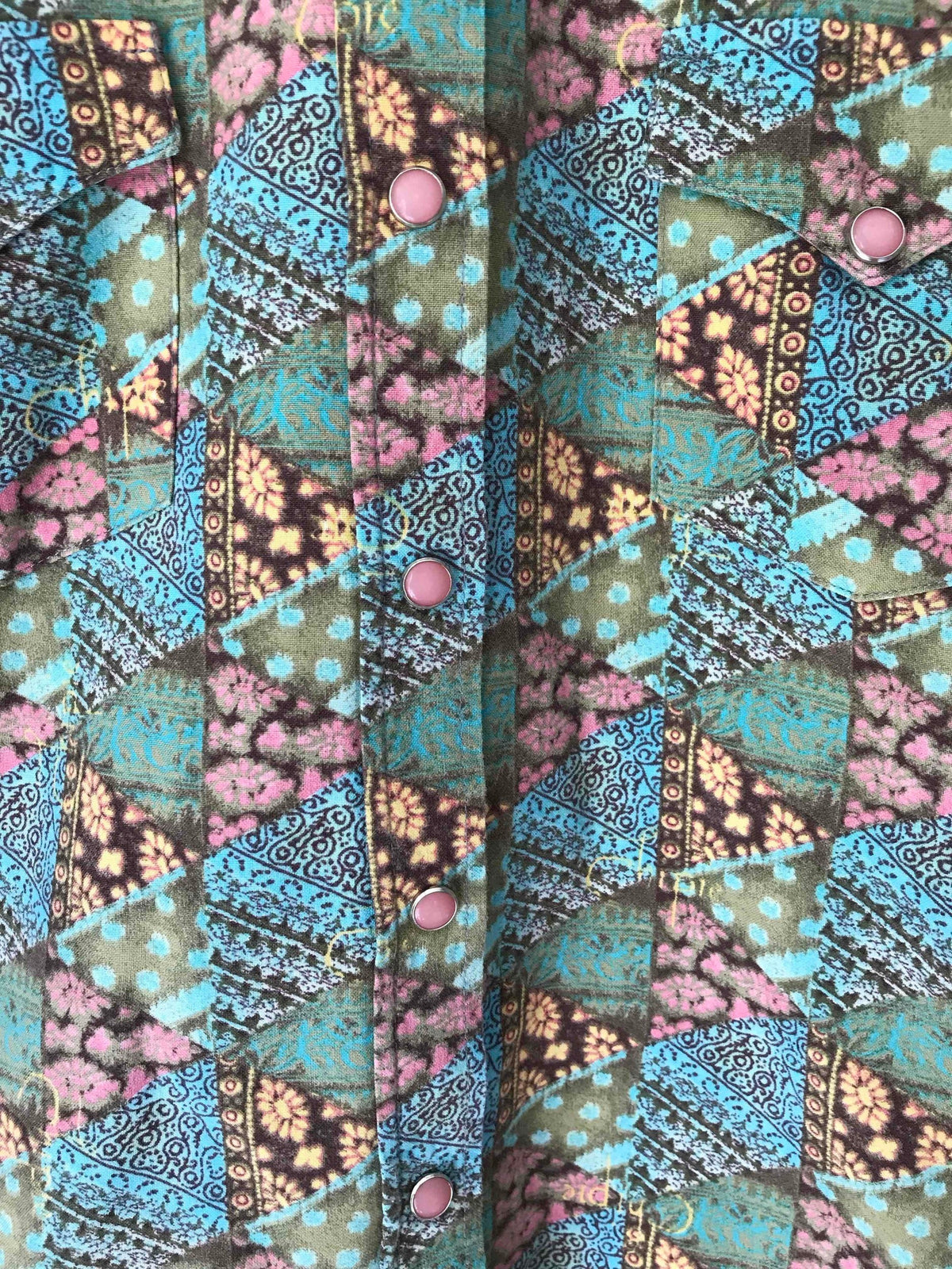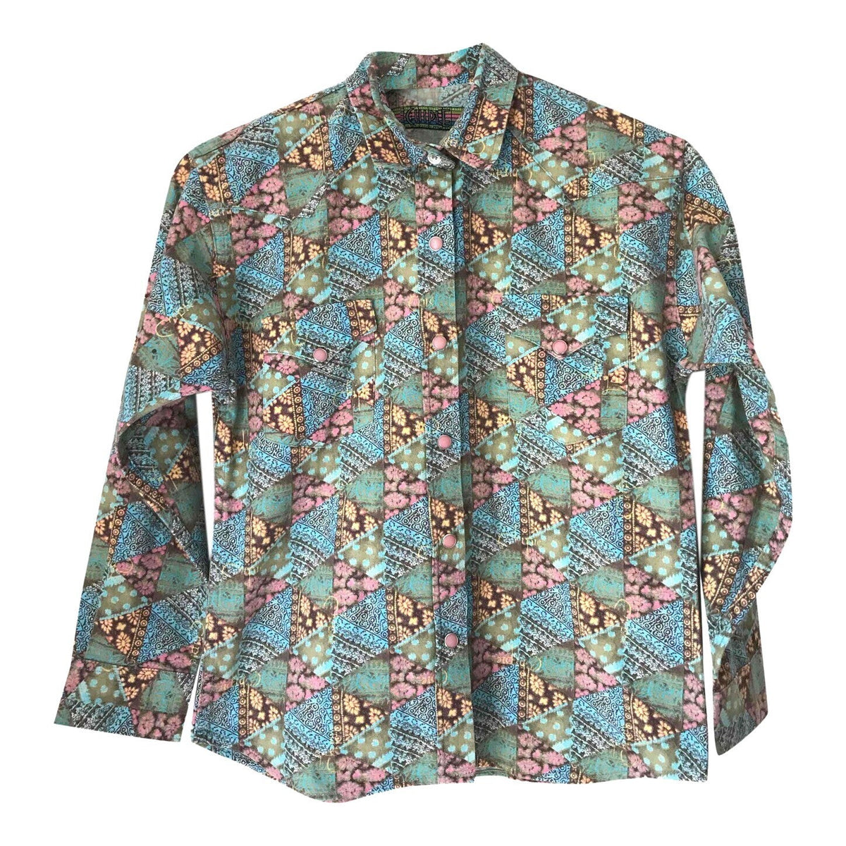 Prix unitaire parChemise en coton épais de la marque "Chipie", boutons pressions rose. Joli motif vert et bleu avec un motif abstrait, pièce des années 80.