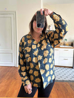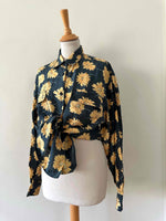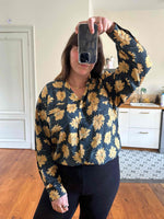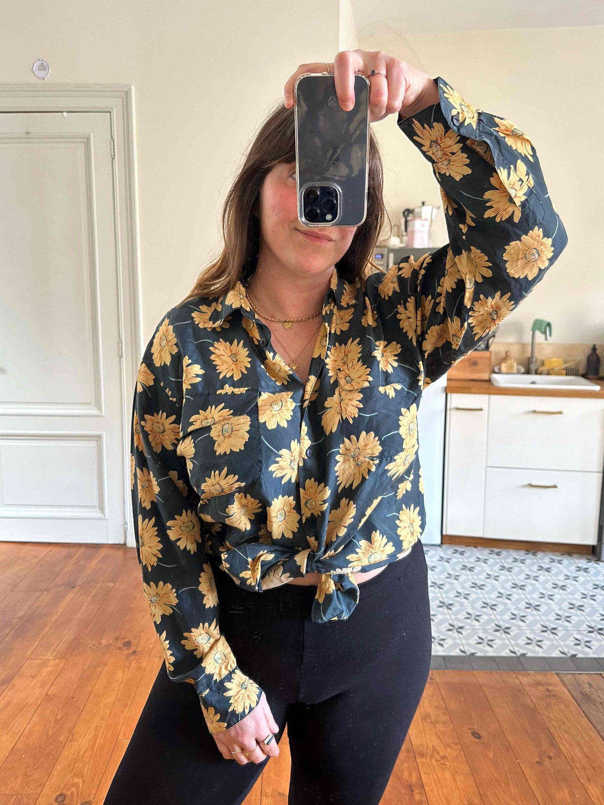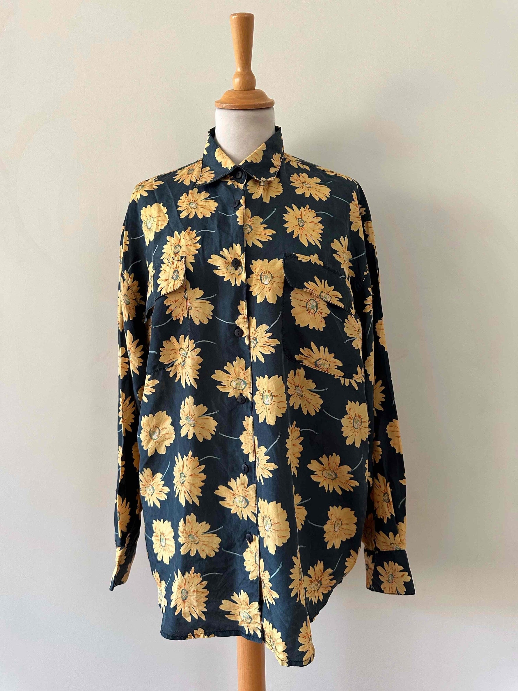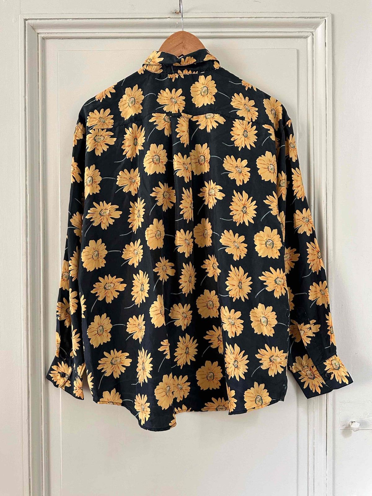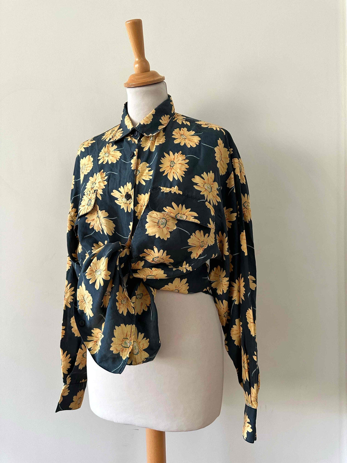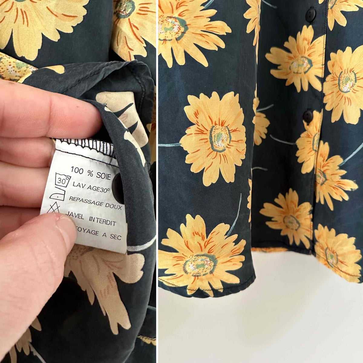Prix unitaire parChemisier fleuri en soie, soie noire imprimé fleurs marguerites jaunes, années 80s, se porte du 36 au 40, portée ici sur un mannequin 136 et une personne T40.