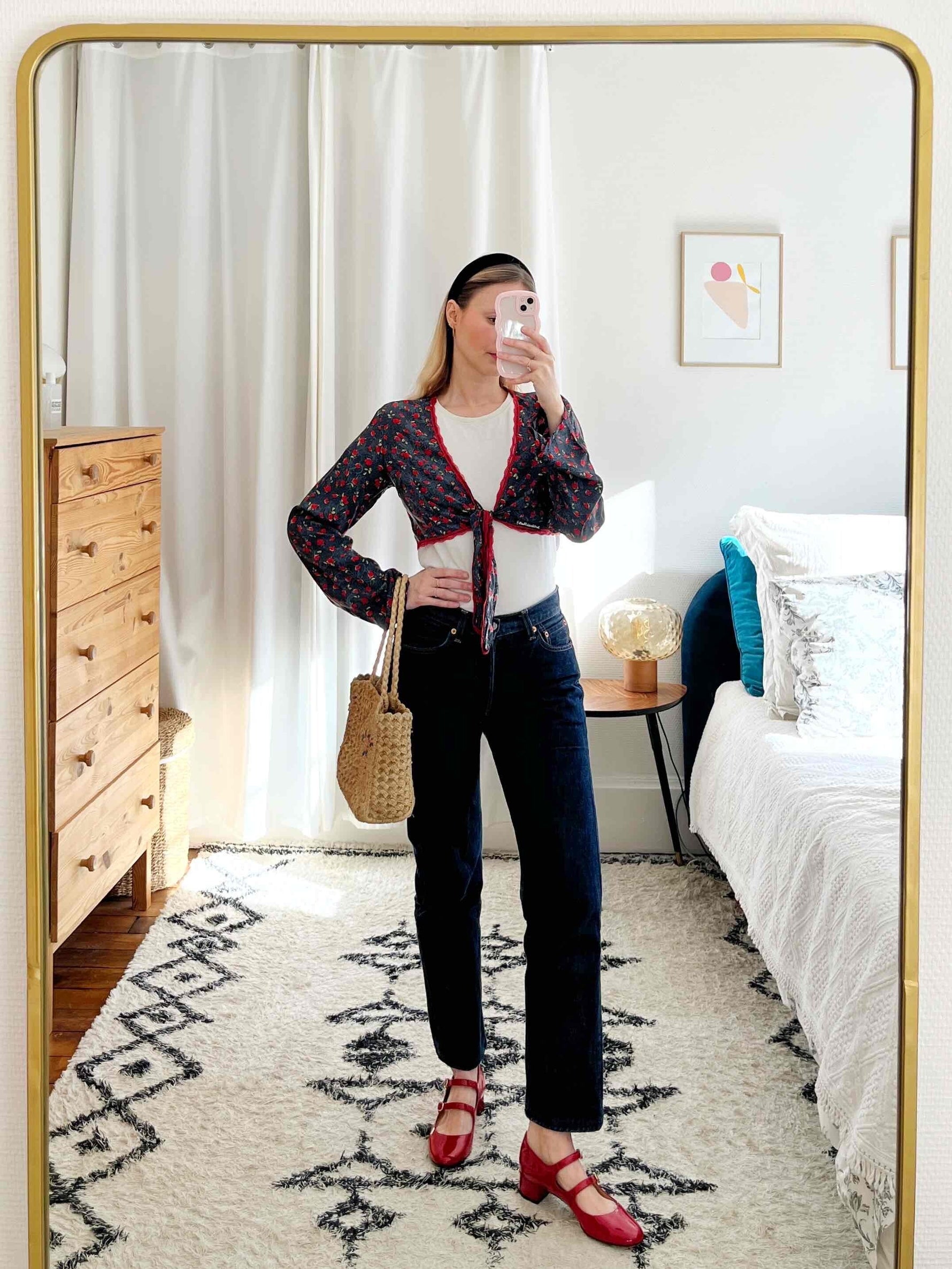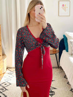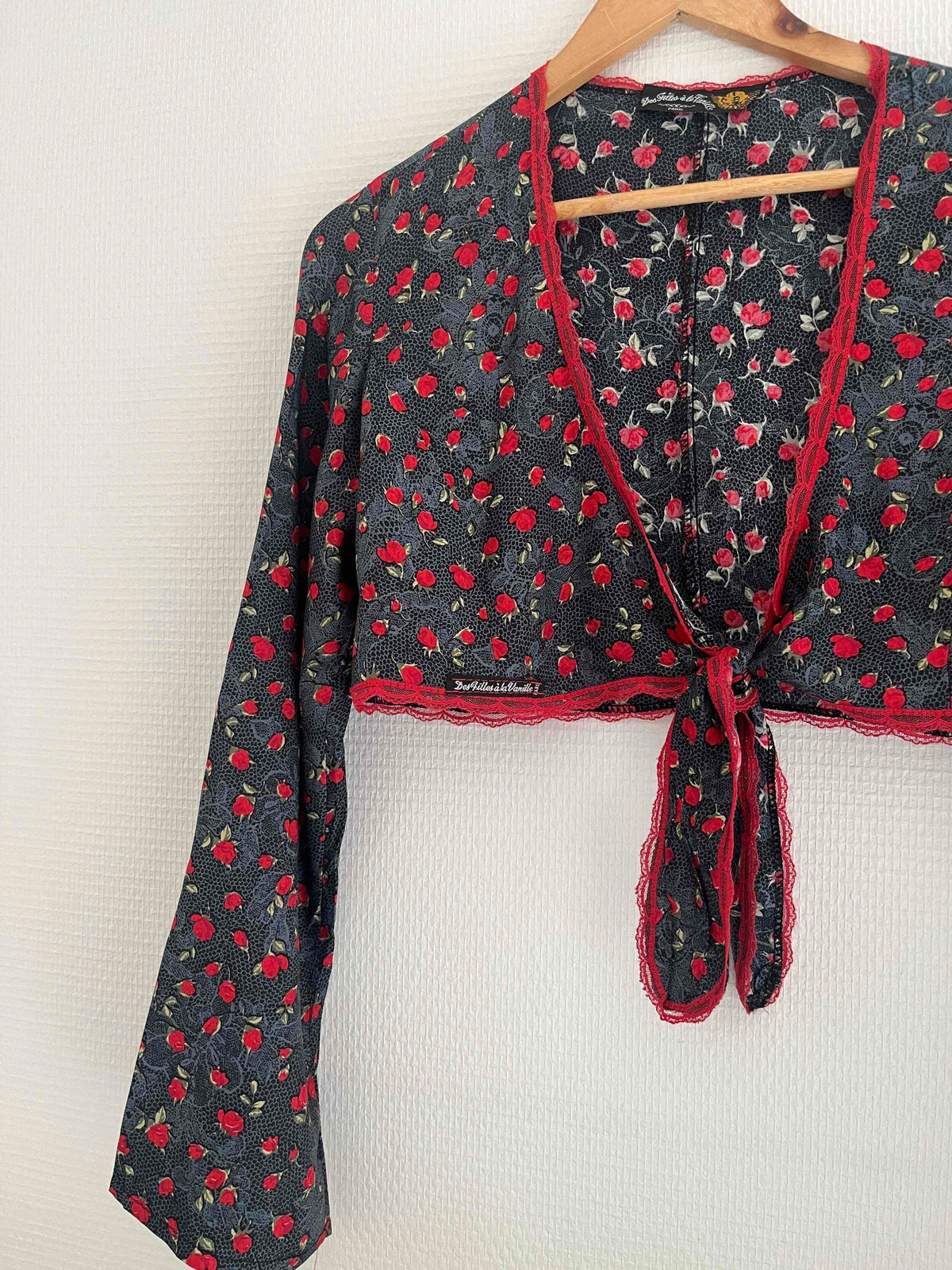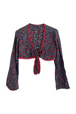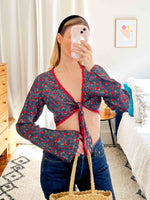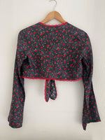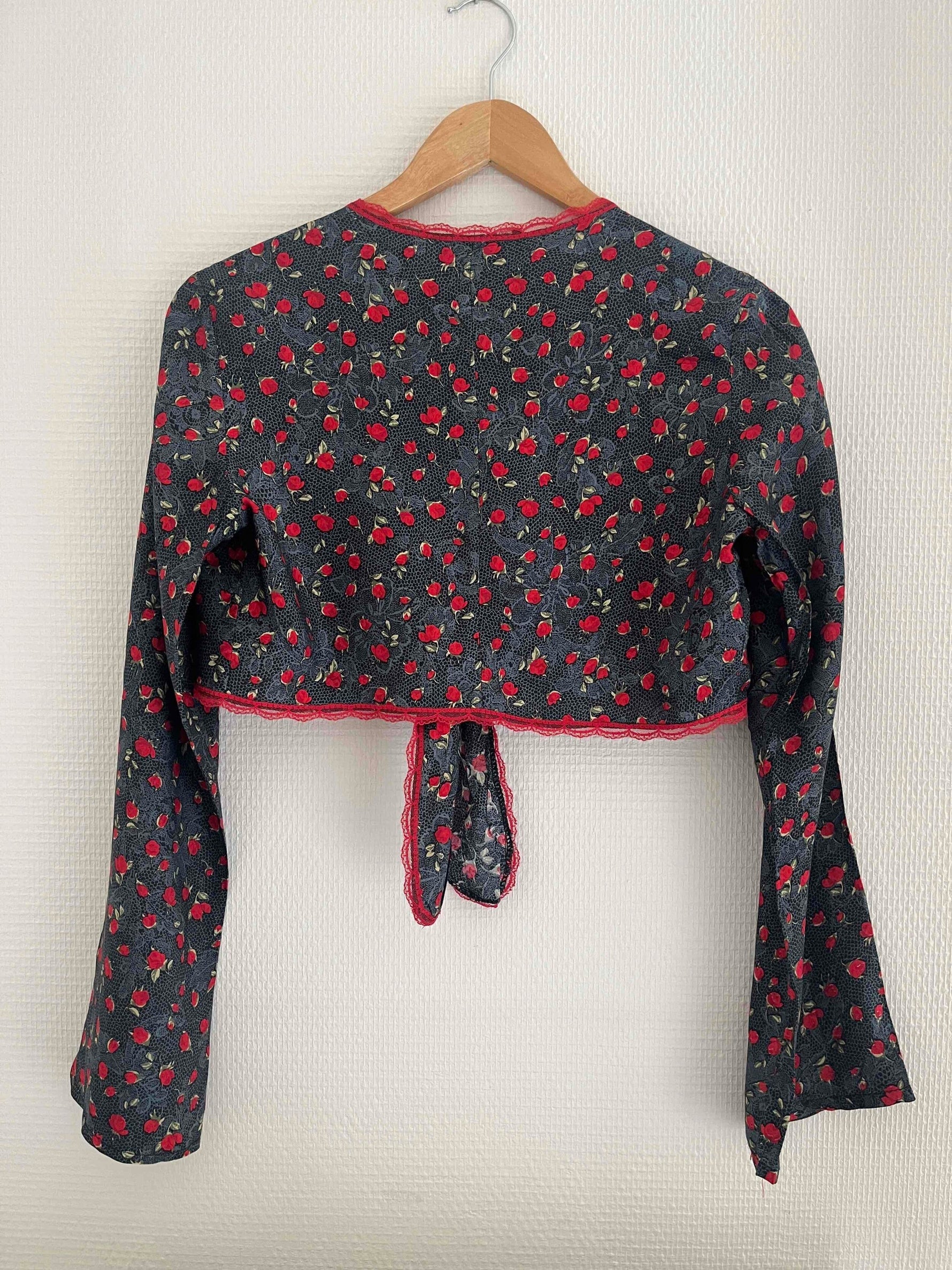 Prix unitaire parCrop top à fleurs, noué sur le devant, maxi décolleté, manches évasées, à porter de différentes façon. Fabriqué en France.