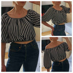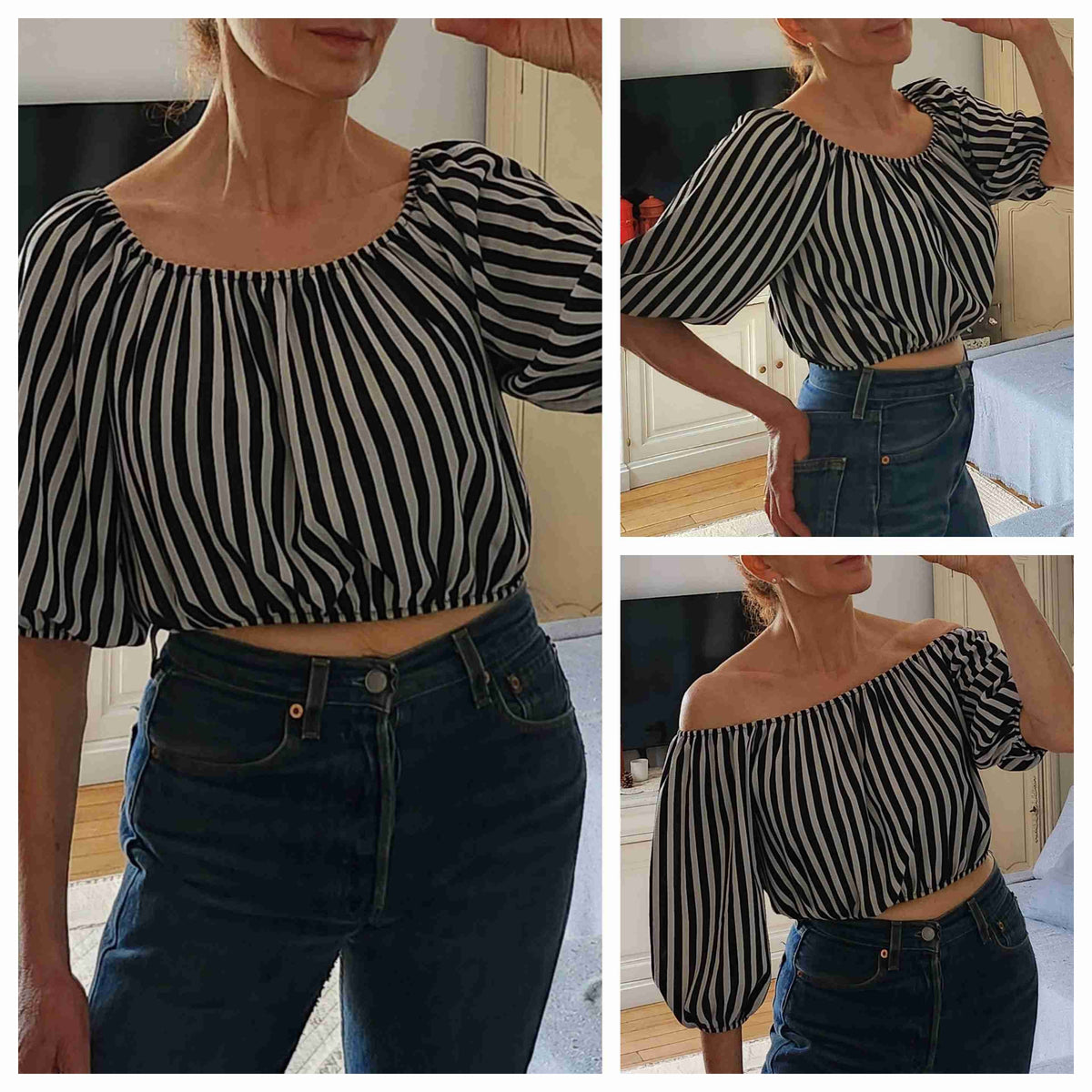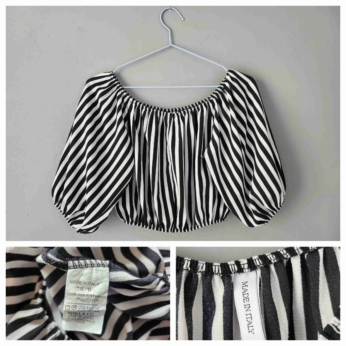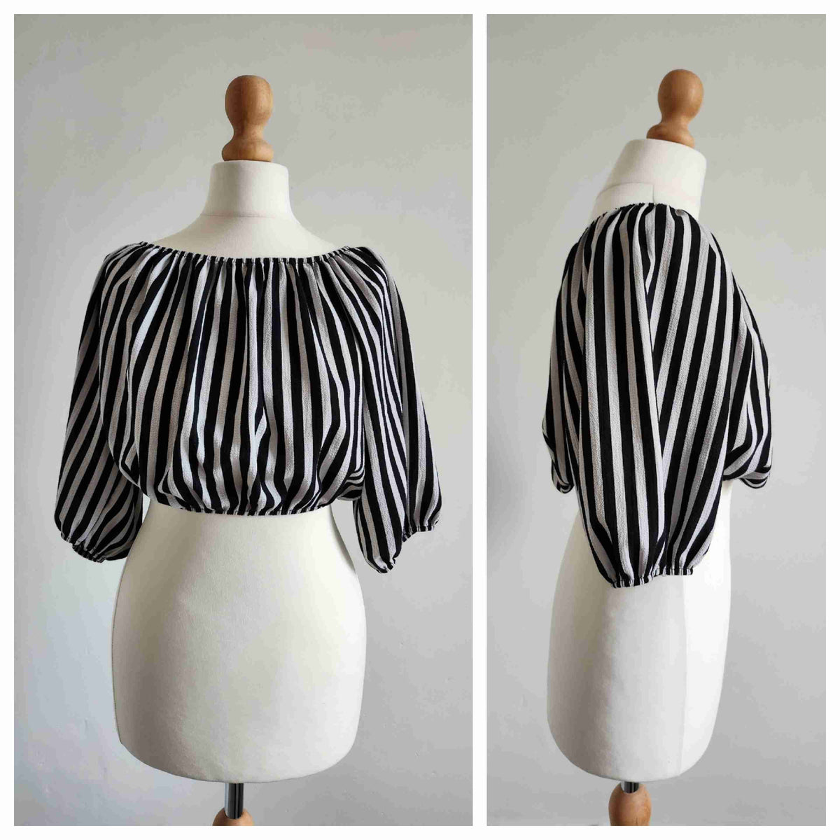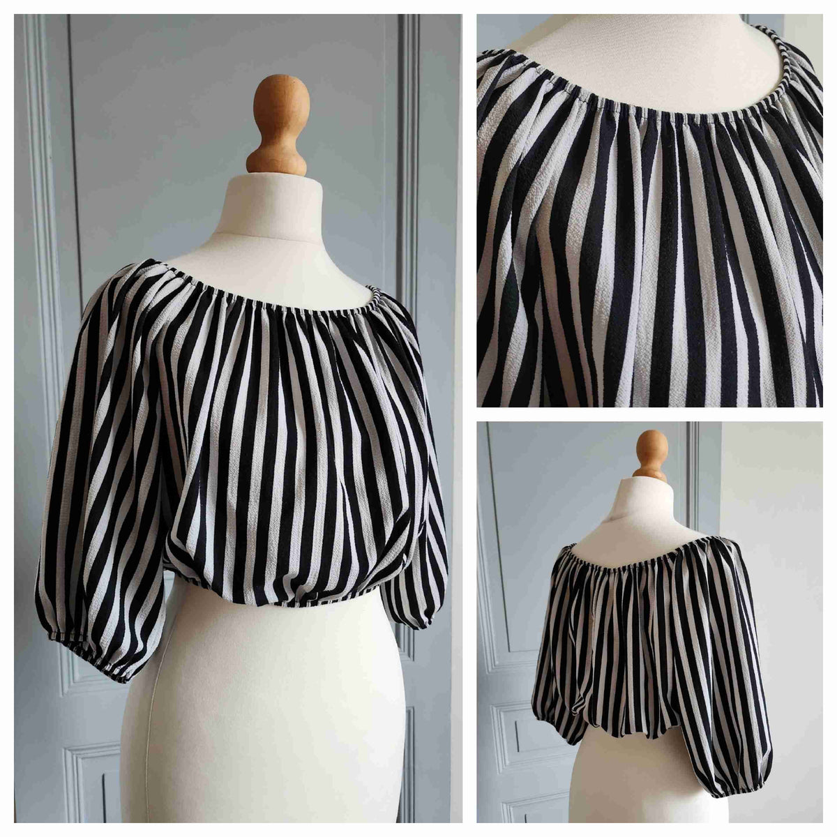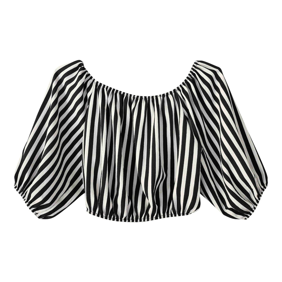 Prix unitaire parCrop top à rayures noir et blanc, manches mi-longues bouffantes, matière crêpe, bords élastiqués, grande encolure open shoulders. Porté sur les photos par une taille 36. Fabriqué en Italie.