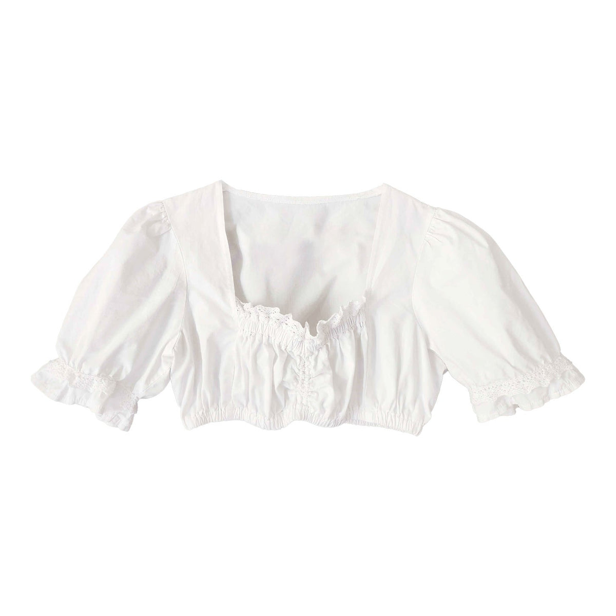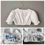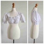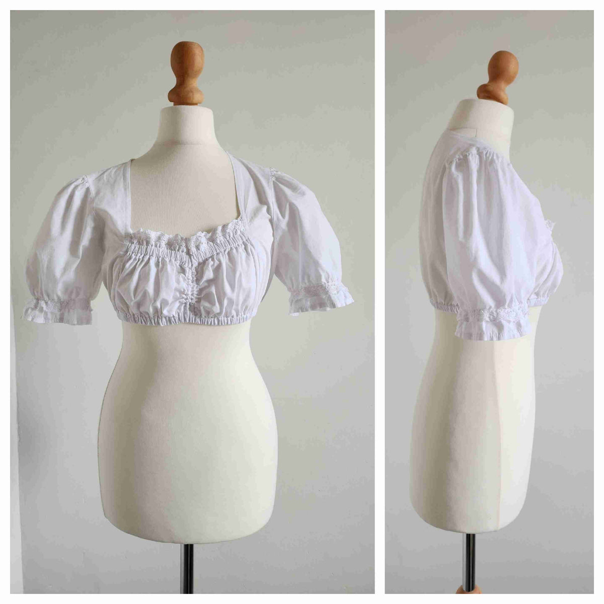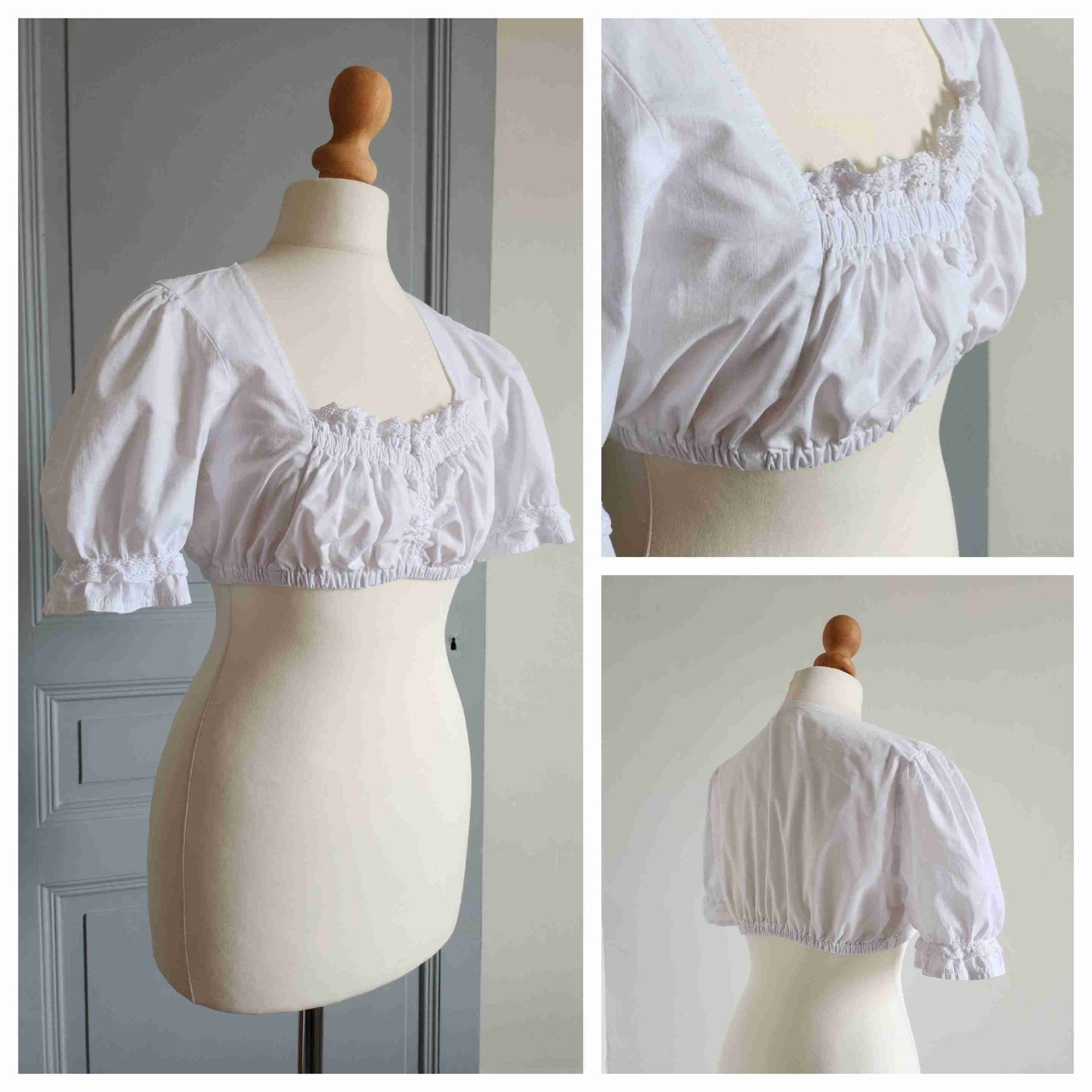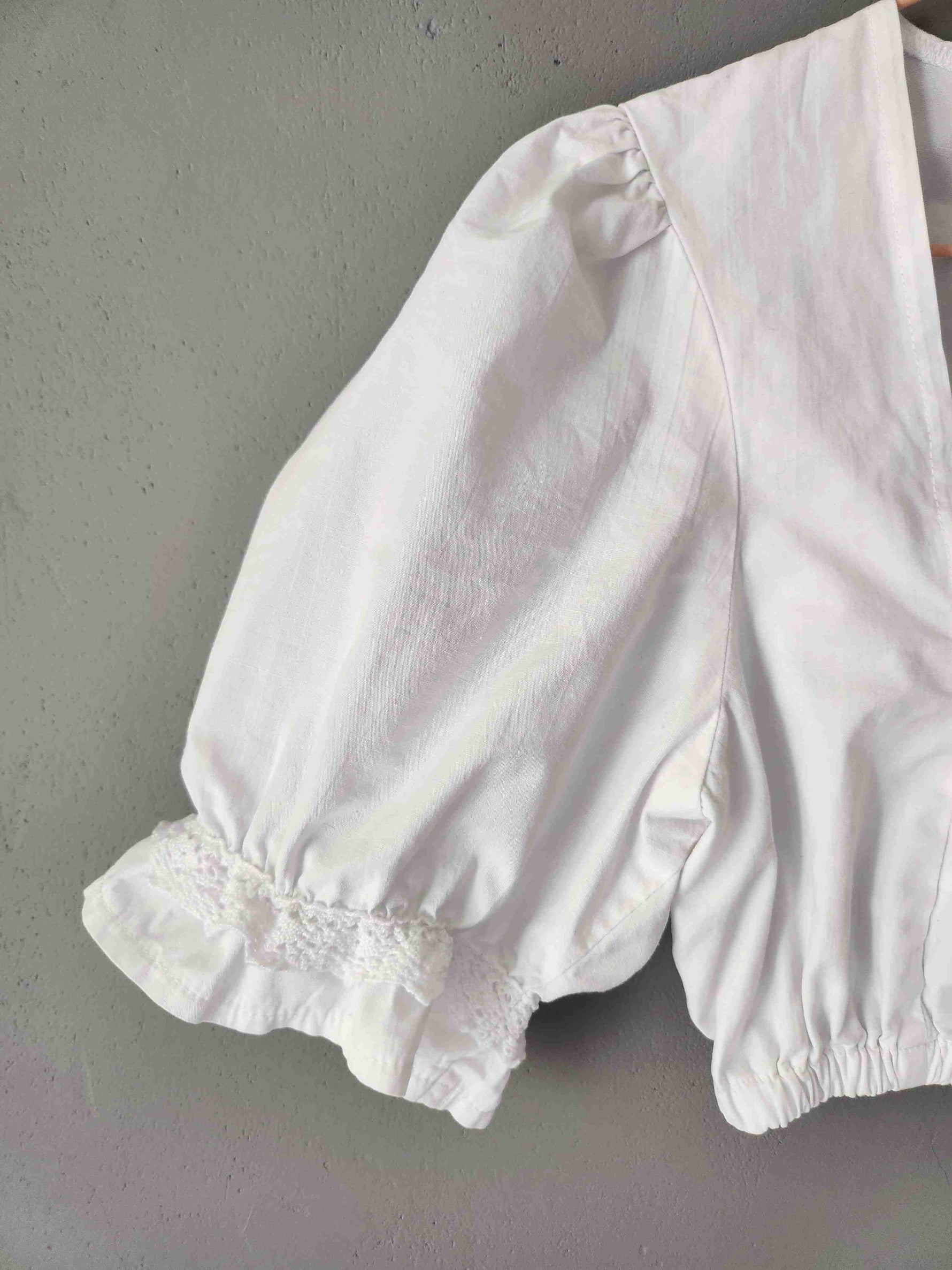 Prix unitaire parCrop top autrichien en coton blanc, manches ballon, plastron plissé élastiqué avec lacet intérieur de réglage, détail de dentelle crochet aux manches et décolleté. Base sous poitrine élastiquée. Pièce 100% coton.