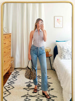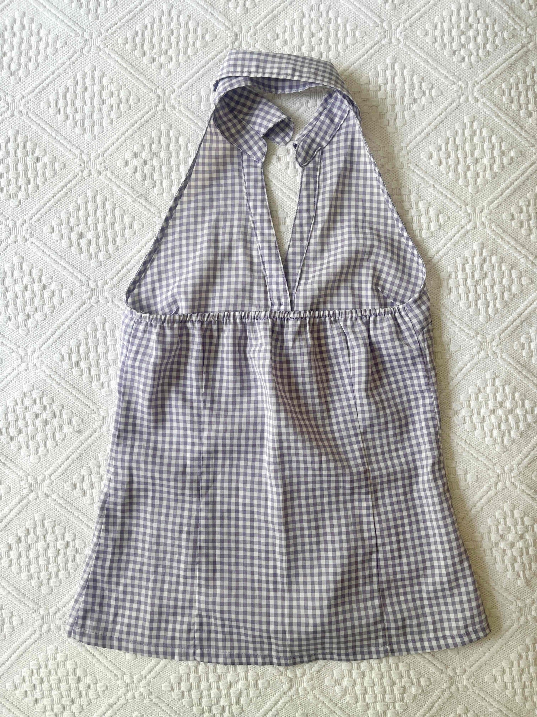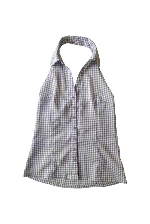 Prix unitaire parTop dos nu, vichy à carreaux, écru et Lila, encolure, décolleté en V, boutonné sur le devant, élastique dans le dos. Porté ici sur une T36 pour 1,64 m.