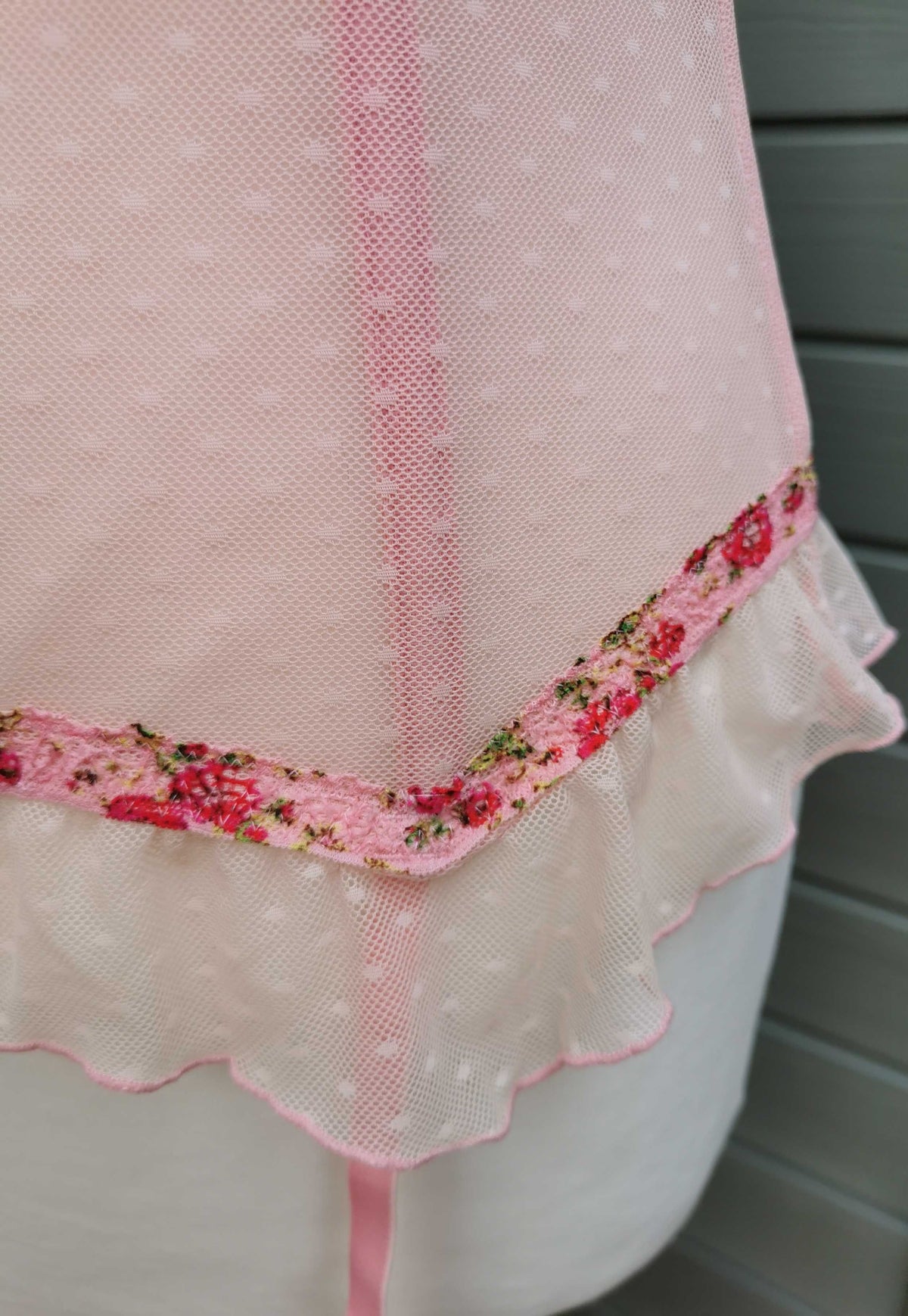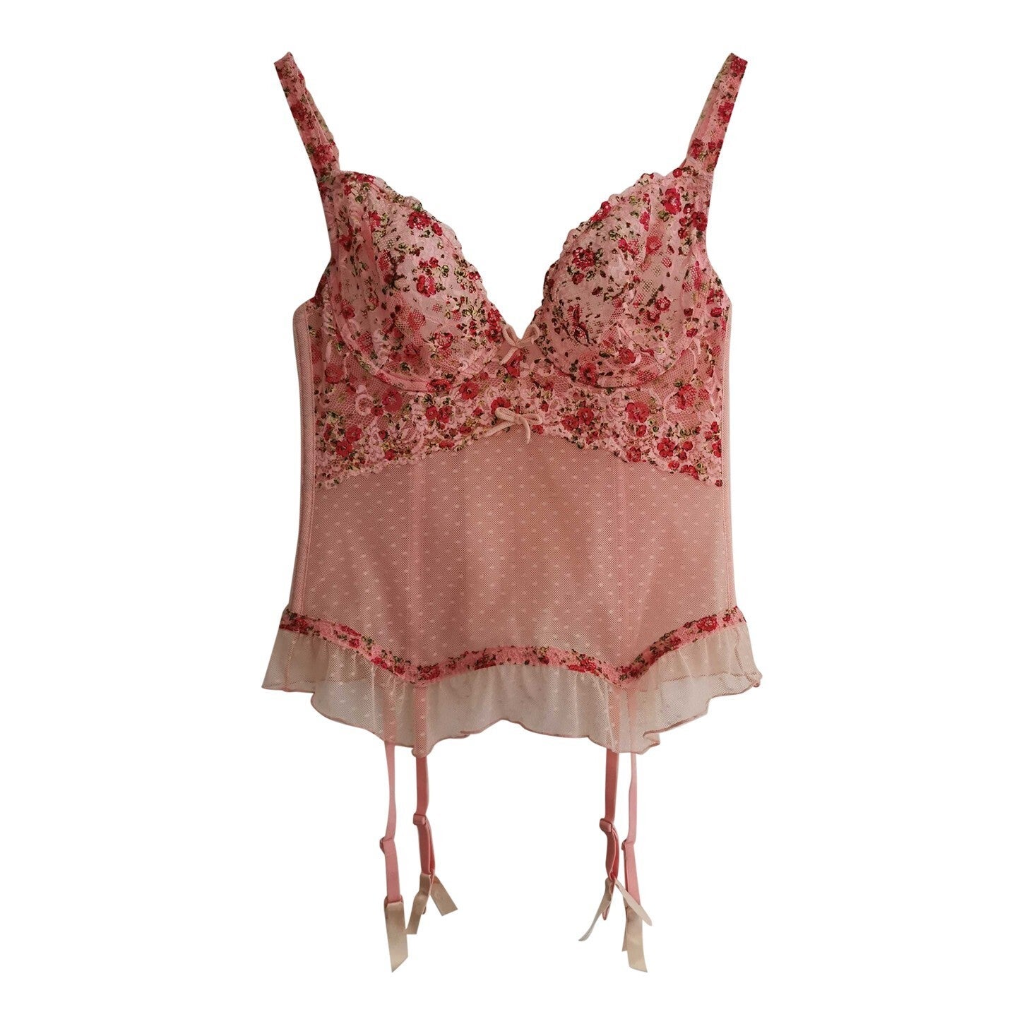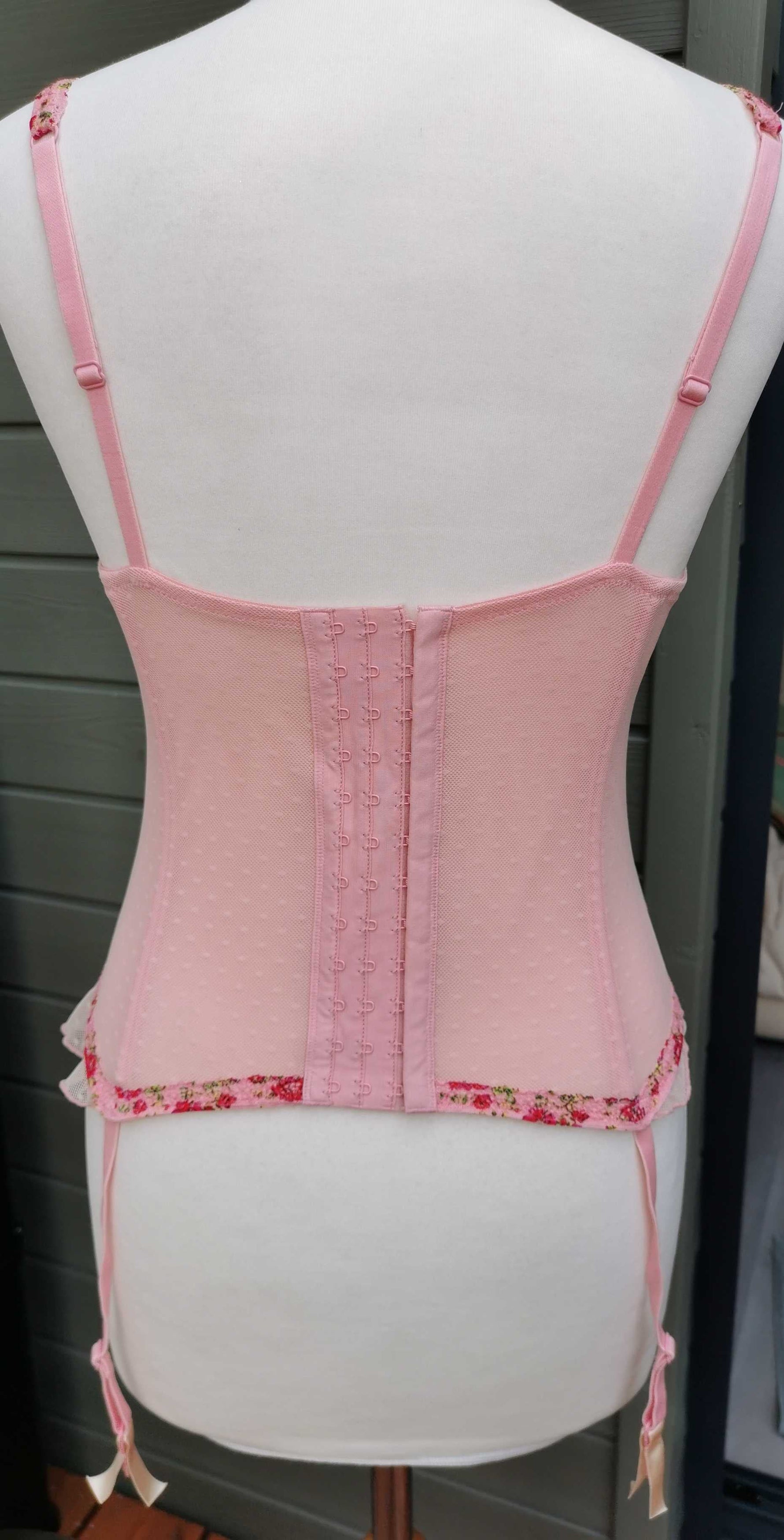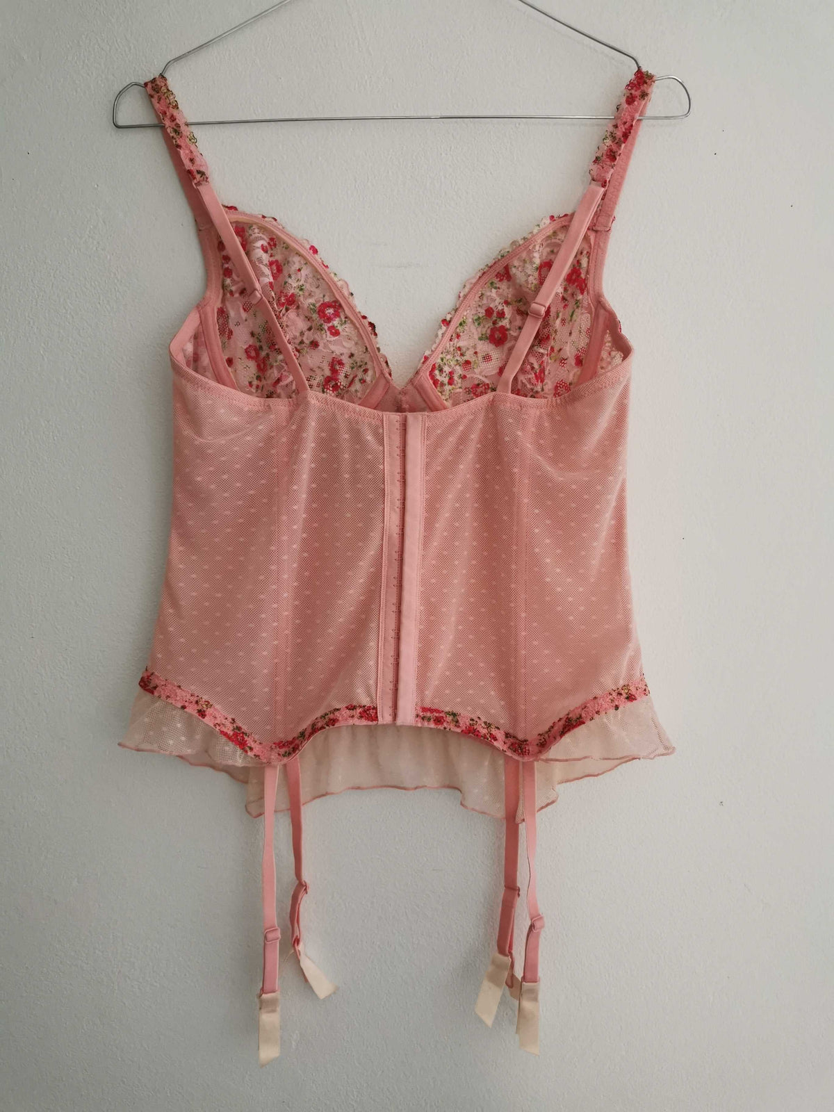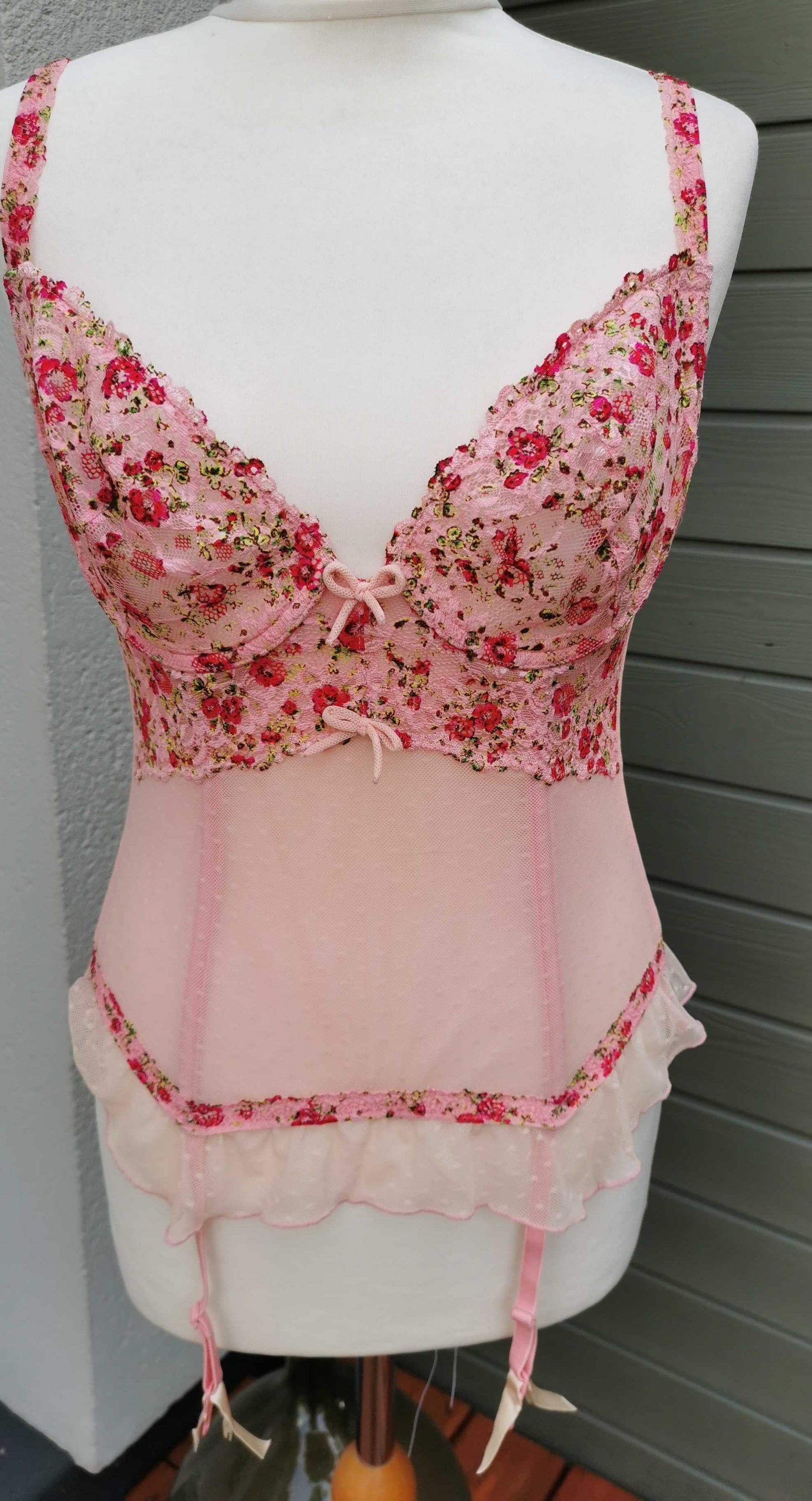Prix unitaire parGuêpière à fleurs en dentelle et plumetis. De jolis détails volants, petits nœuds. Bonnet 90B et porte-jarretelles intégré. Bretelles réglables. Agrafes dans le dos. Bel état.