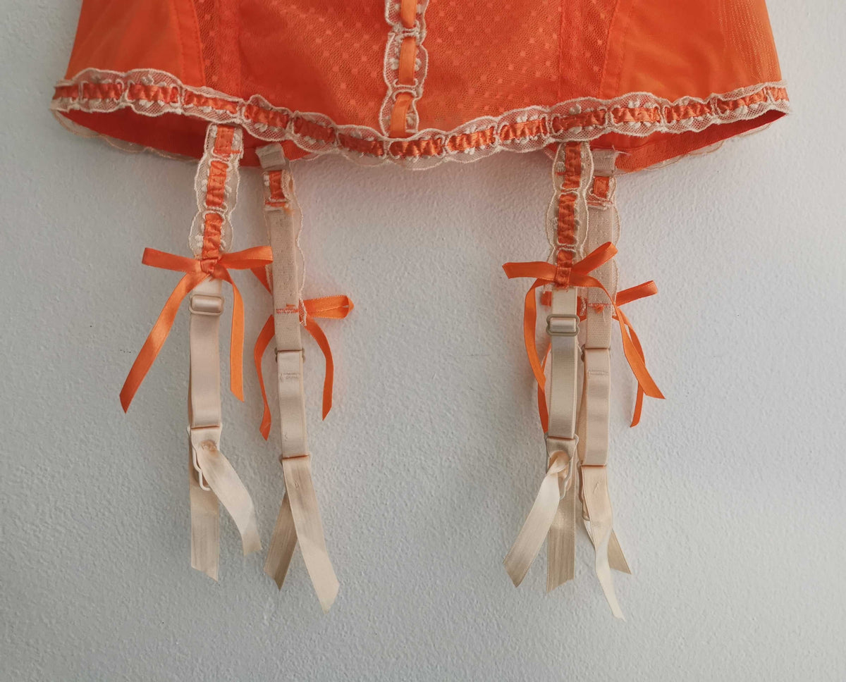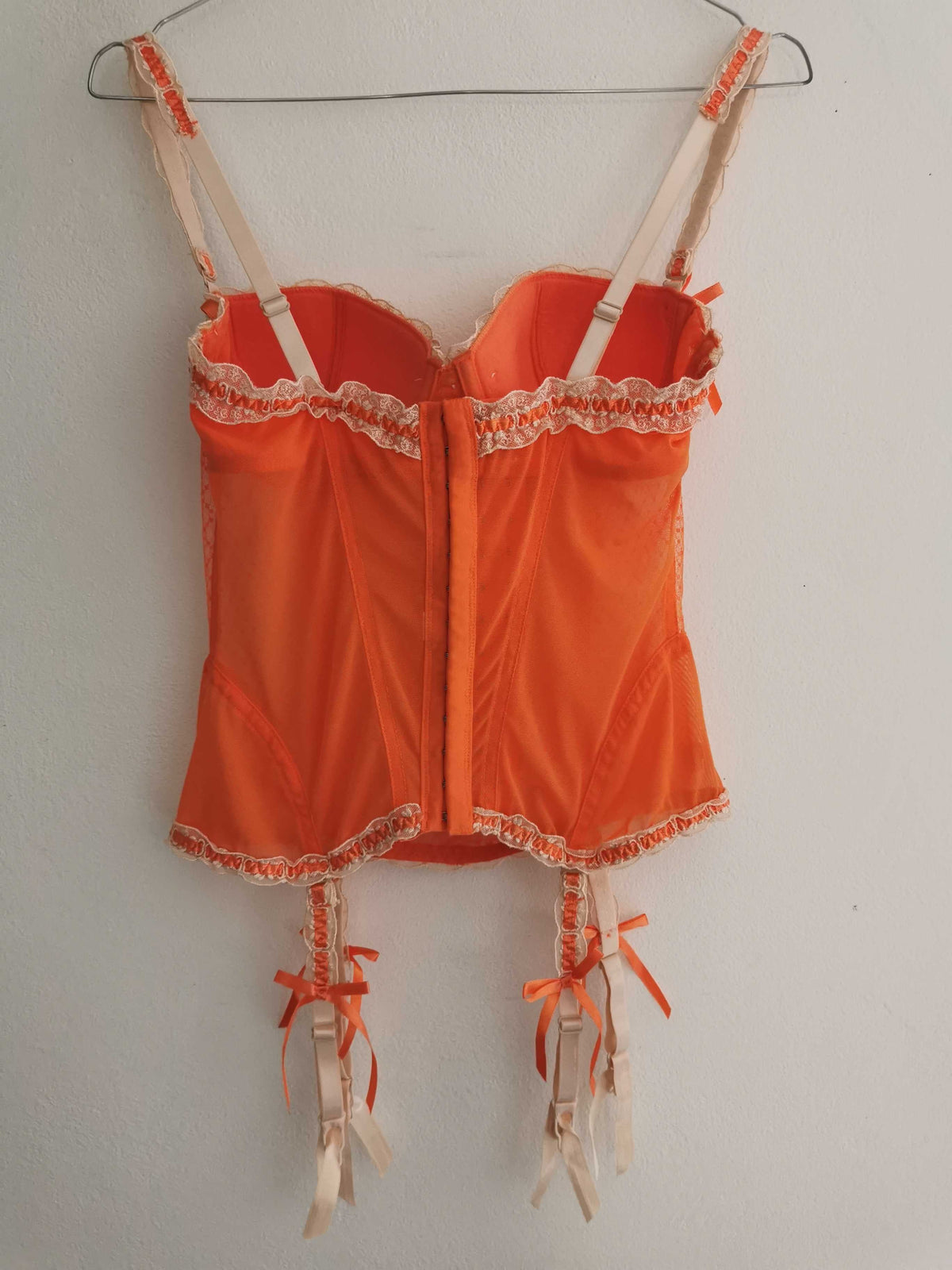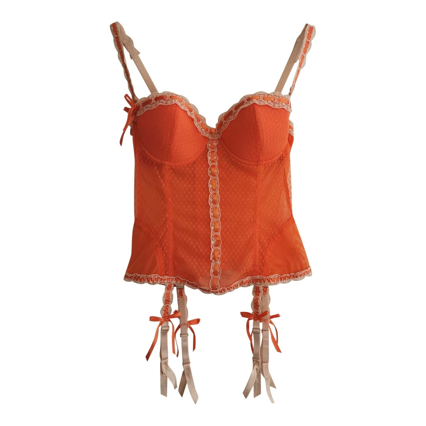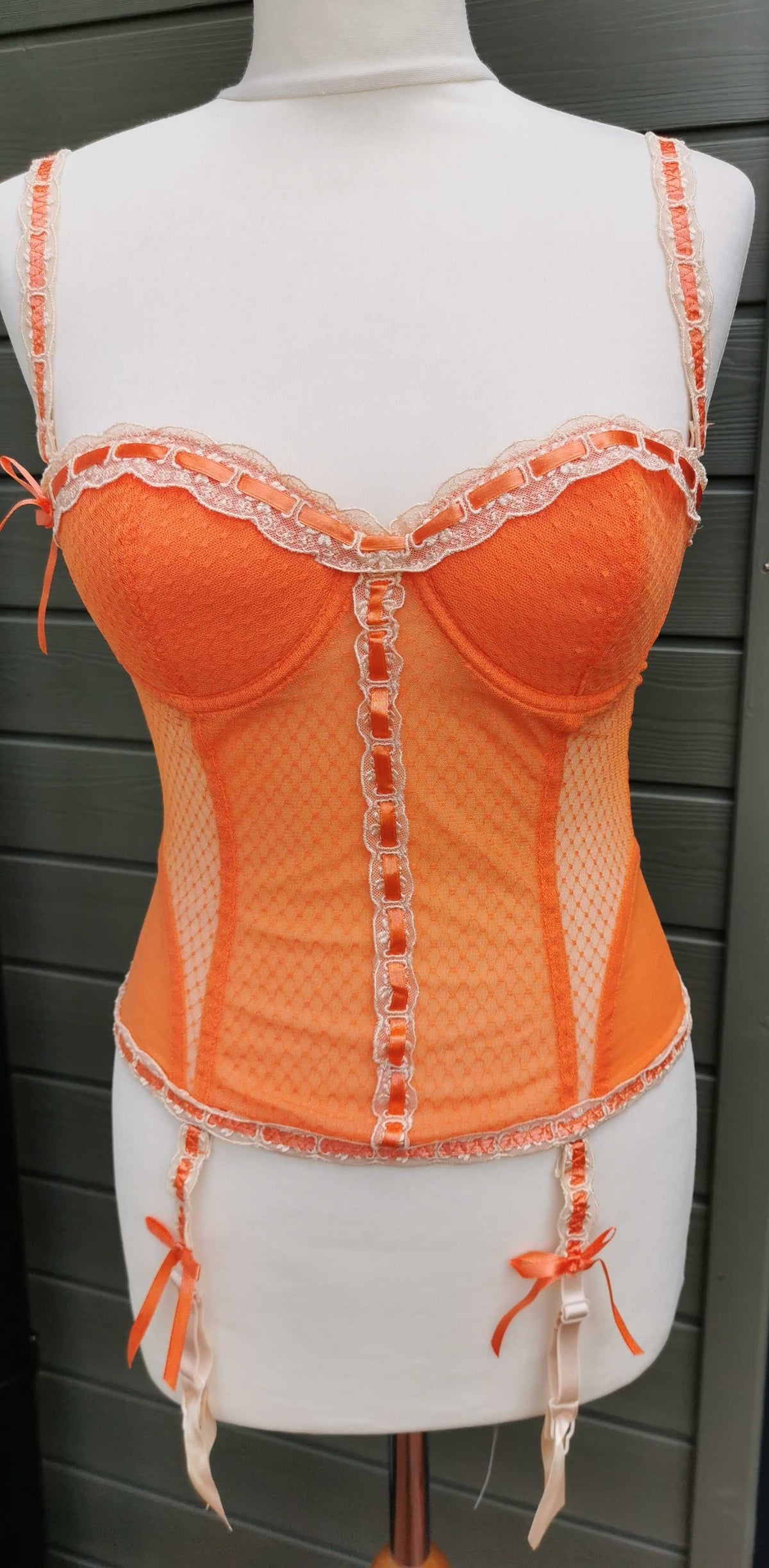 Prix unitaire parGuêpière en dentelle et plumetis. De jolis détails : rubans, dentelle. Bretelles réglables et porte-jarretelles intégrés. Bonnet 90A et agrafes dans le dos. Bel état.