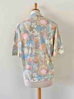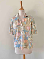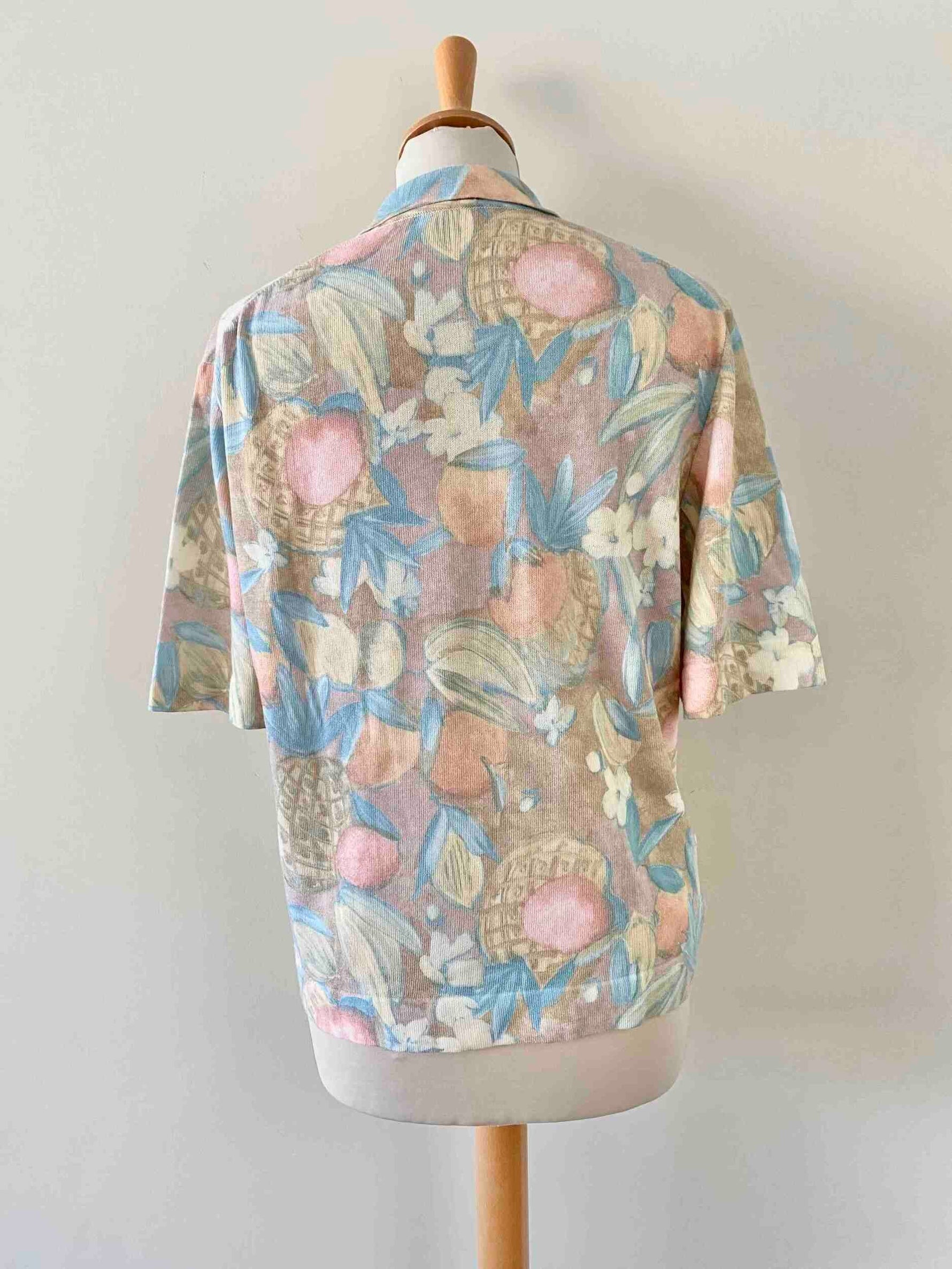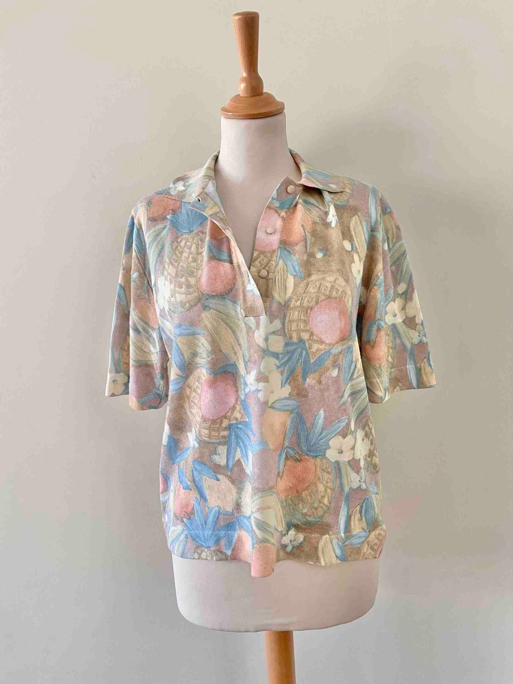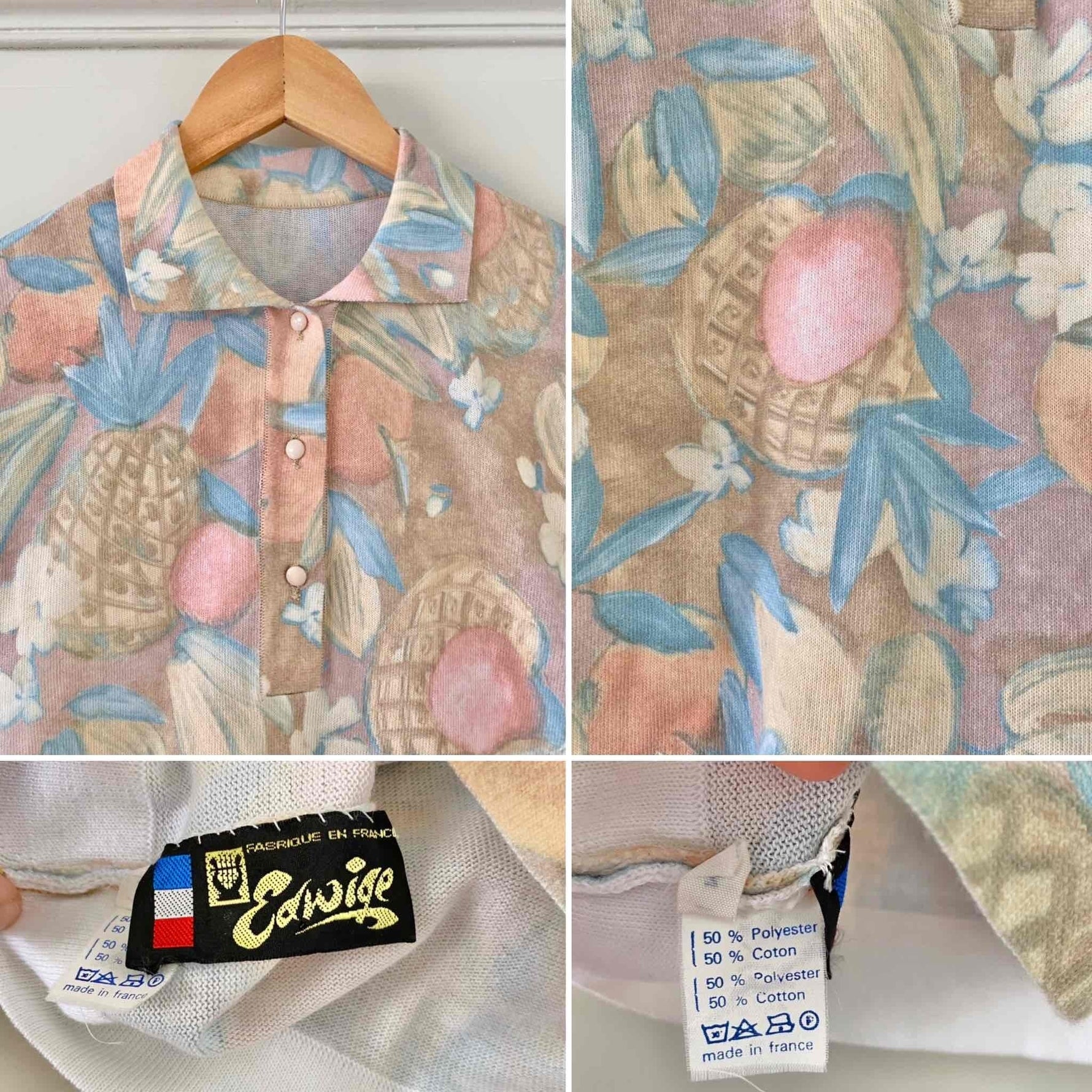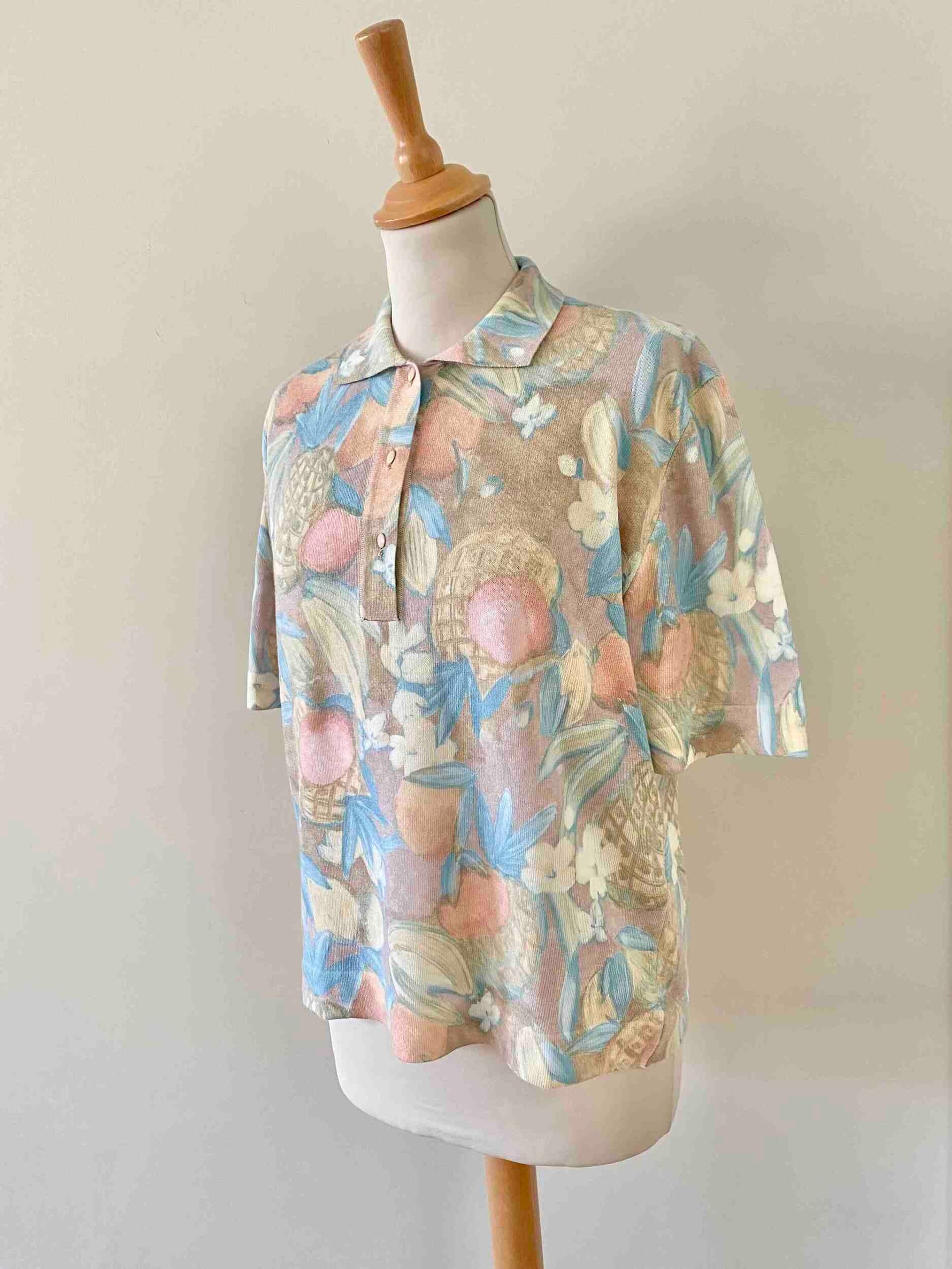 Prix unitaire parPolo à Fruits en maille fine coton mélangé, imprimé fruits, ananas, tons pastel, boutons rose pâle au col, Edwige, fabriqué en France.