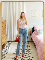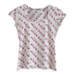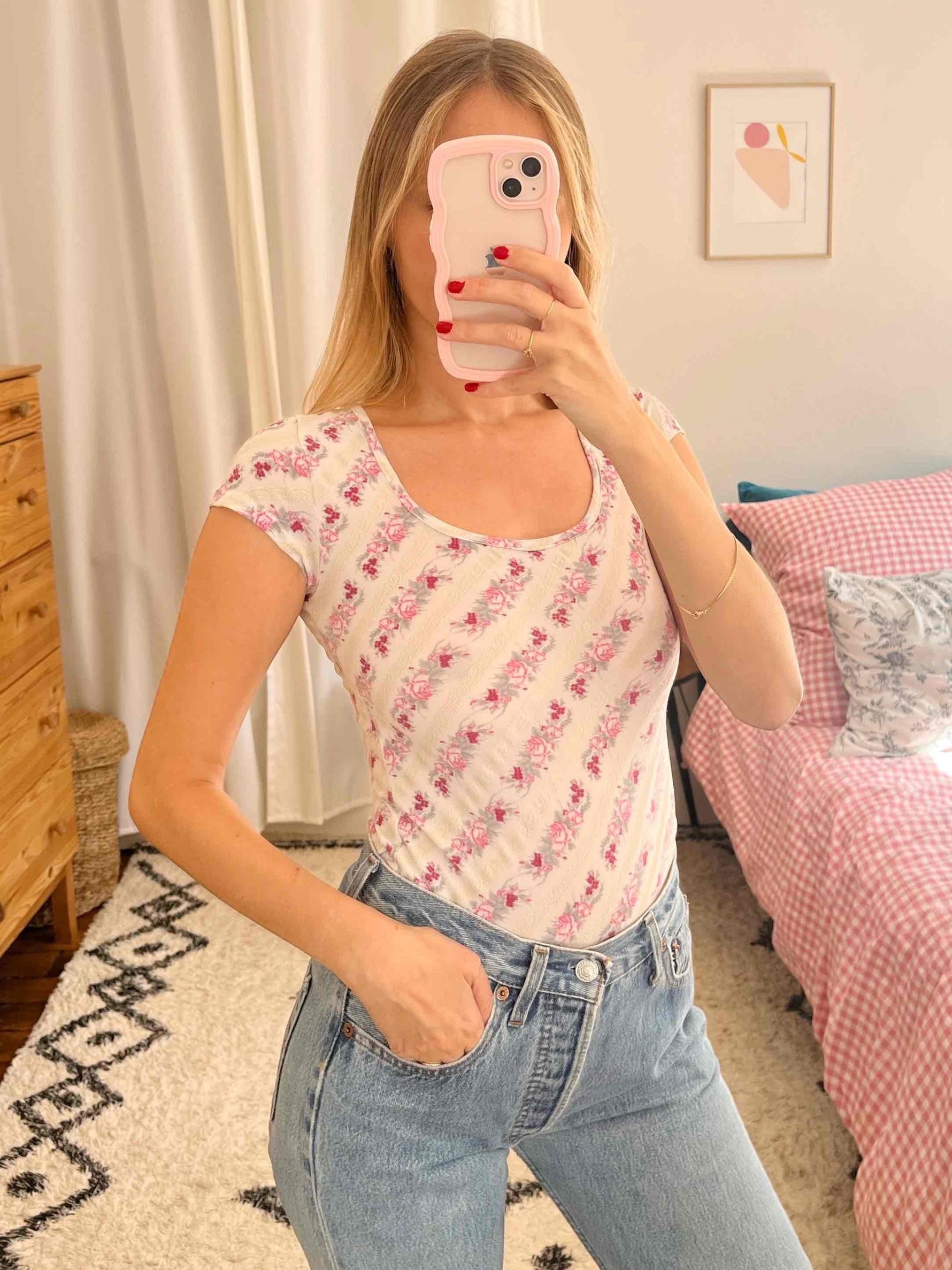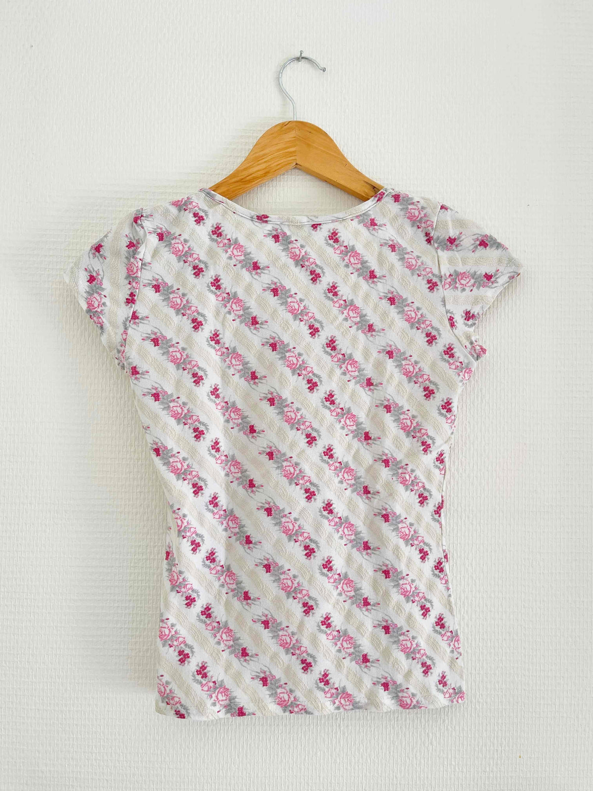 Prix unitaire parTeeshirt à fleurs, col rond, manches courtes, porté ici sur une T36 pour 1m64.