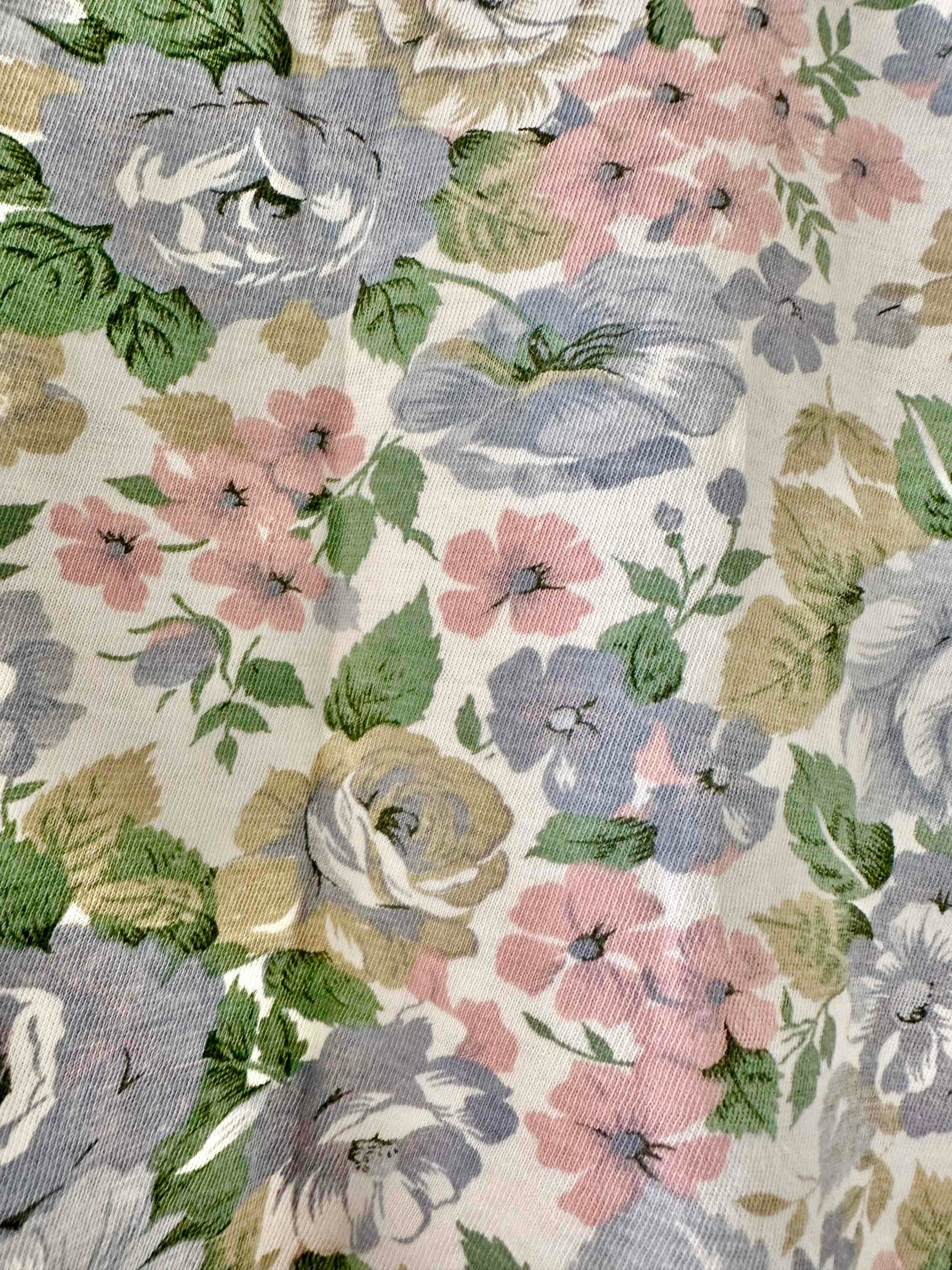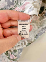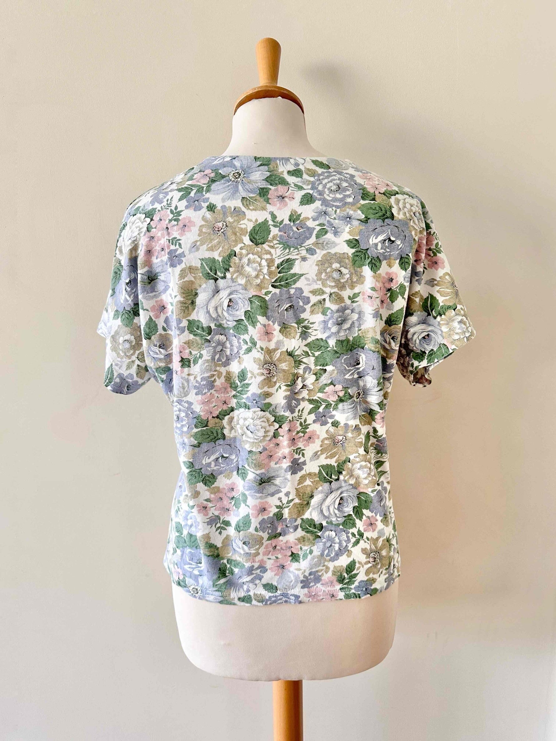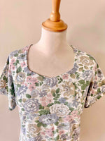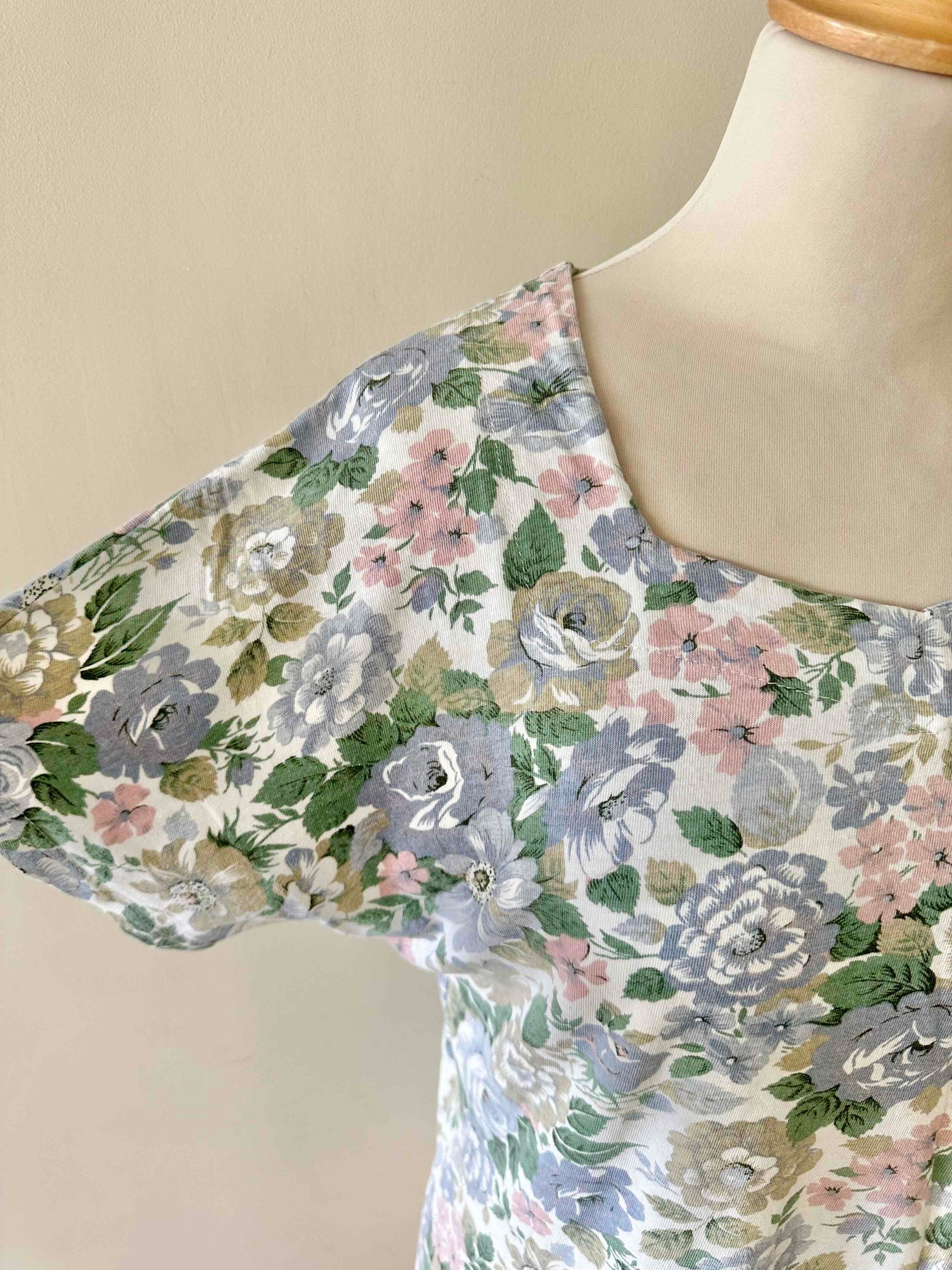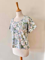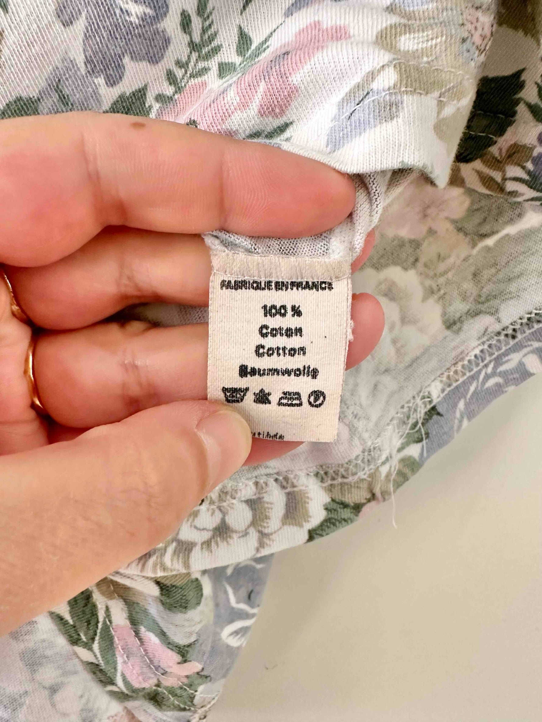 Prix unitaire parT-shirt à fleurs, en jersey 100% coton blanc imprimé, fleurs bleues, ciel, roses pastels, beiges et vertes, encolure corsage, manches courtes, fabriqué en France, taille 36 et 38, porté ici sur un mannequin 136.
