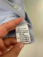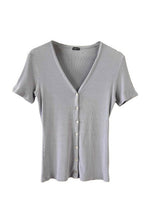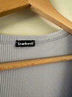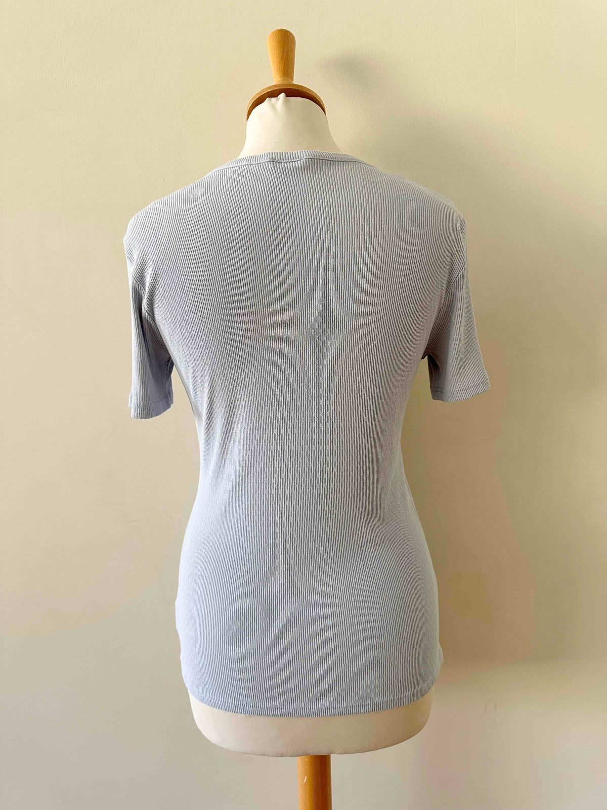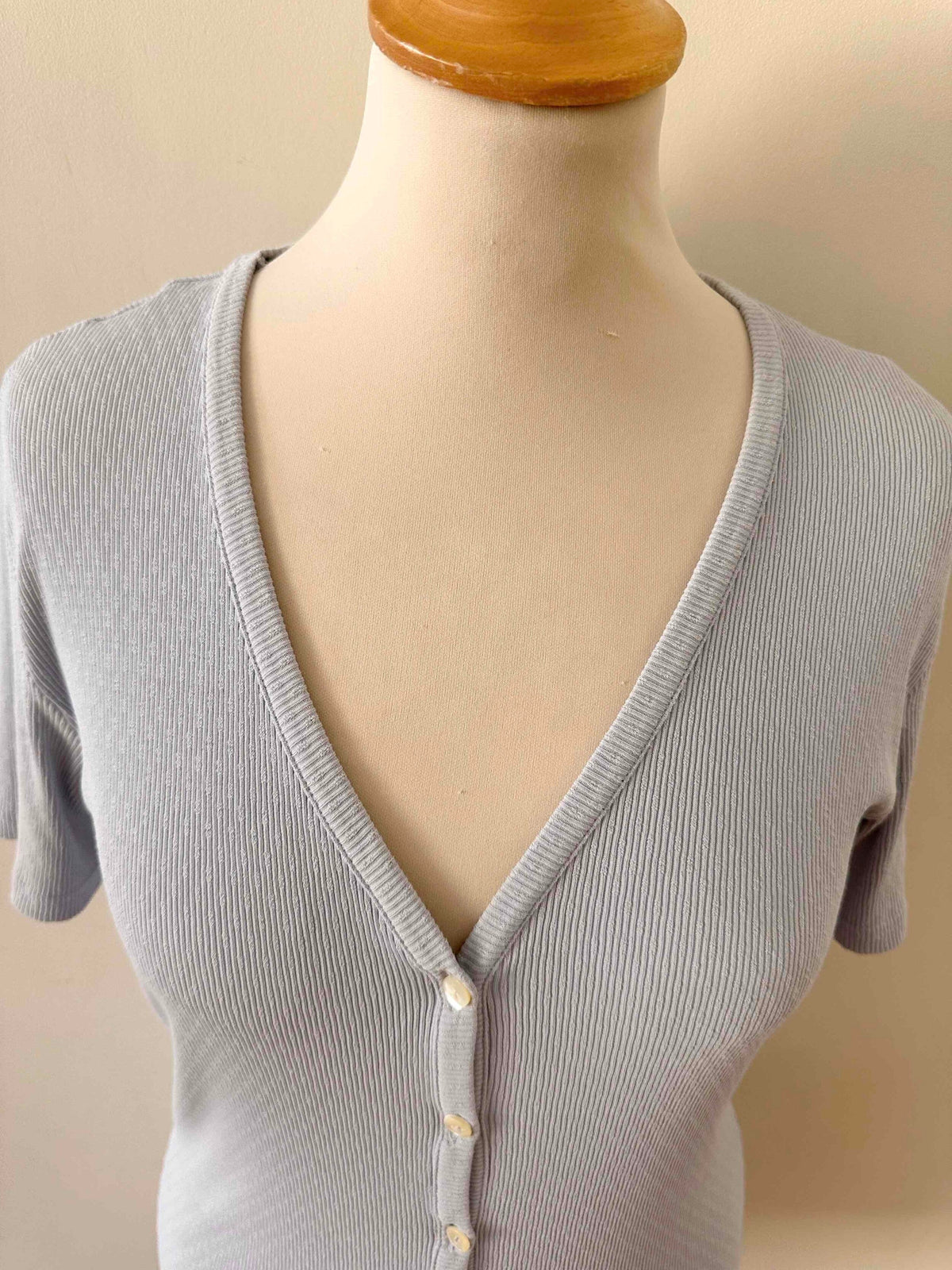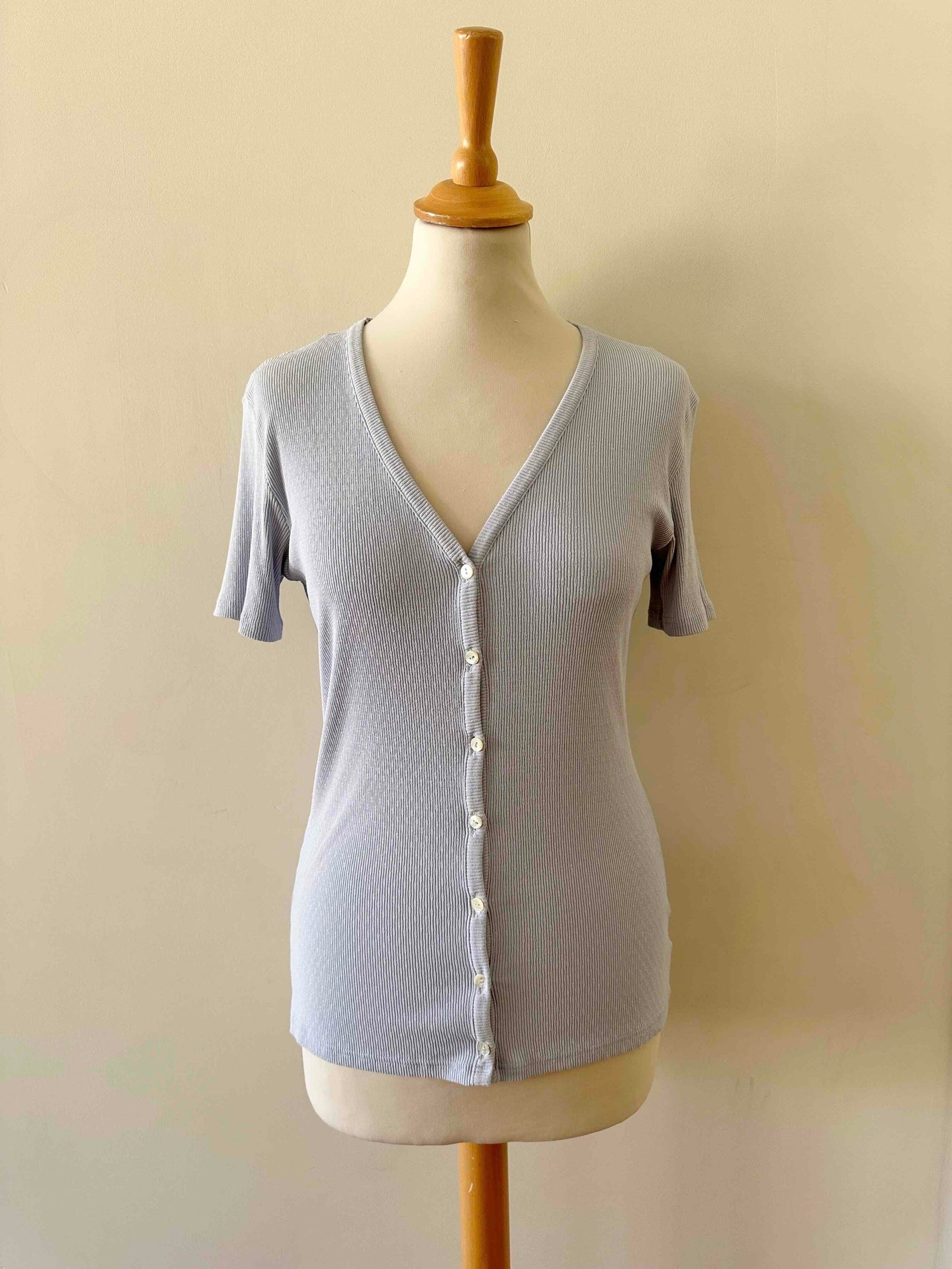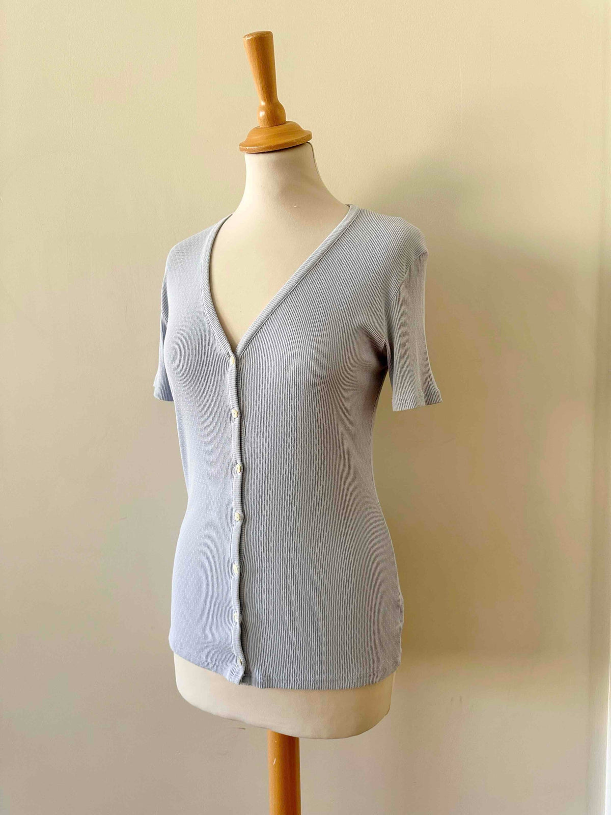 Prix unitaire parT-shirt Cacharel, en maille pointelle lilas, boutonné en nacre, fabriqué en Italie, taille 36, porté ici sur un mannequin T36.
