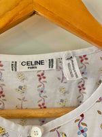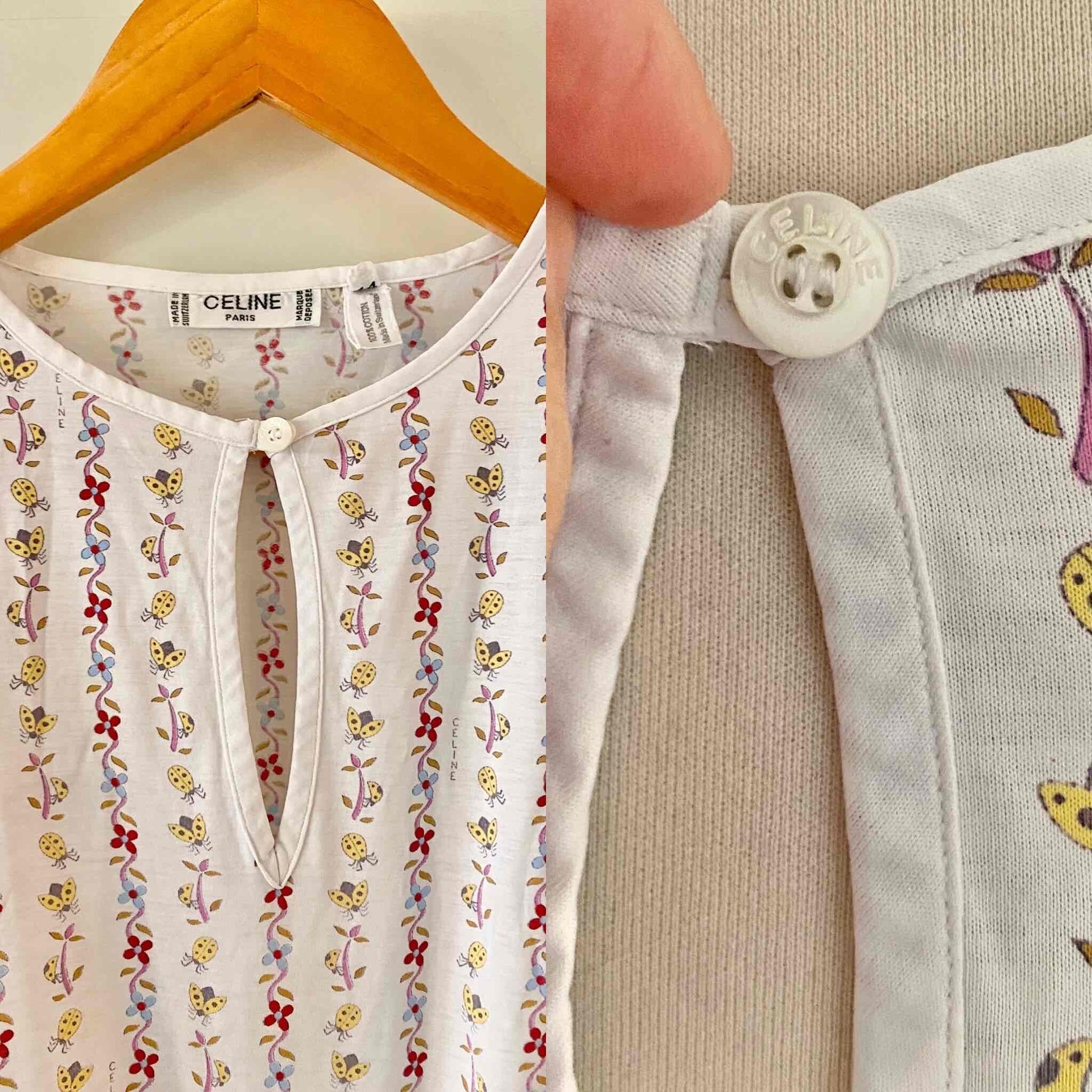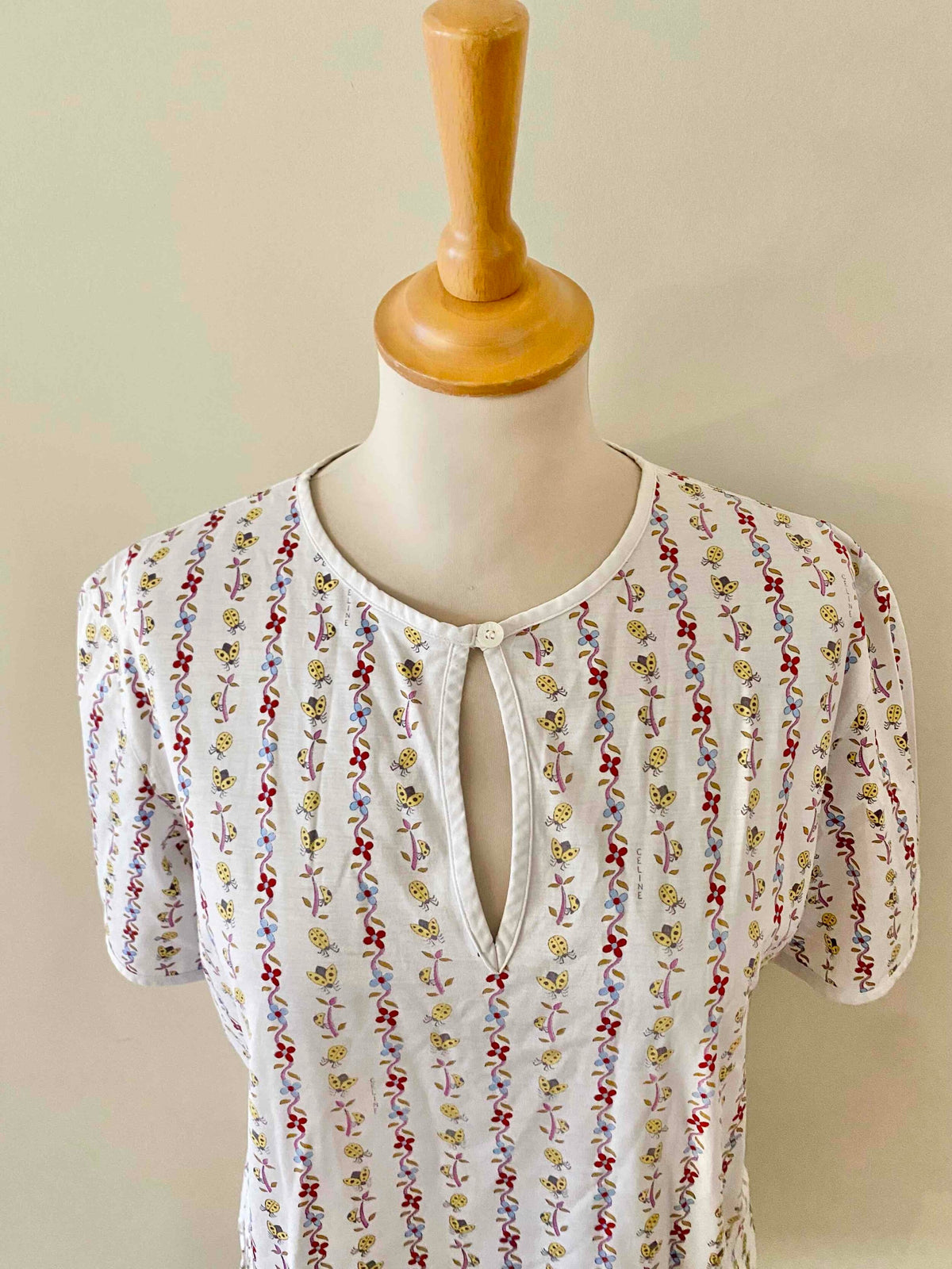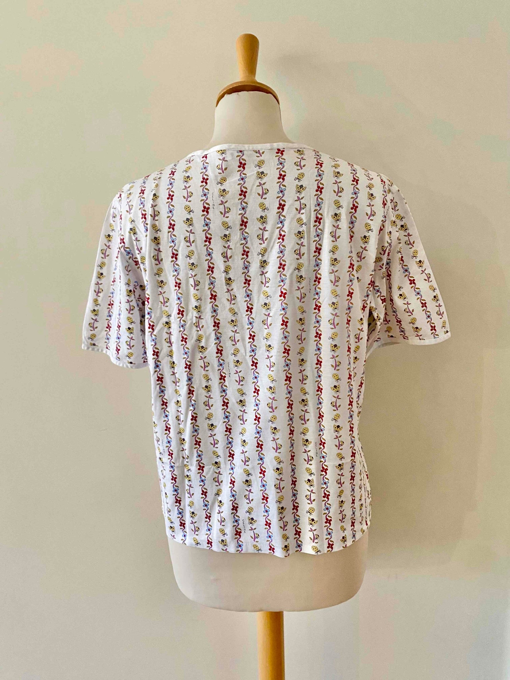 Prix unitaire parT-shirt Céline, en jersey de coton blanc motifs imprimés frises de fleurs, coccinelles, et logo Celine, goutte boutonnée au col, fabriqué en Suisse, taille 36 porté ici sur un mannequin T36.