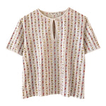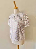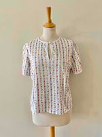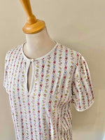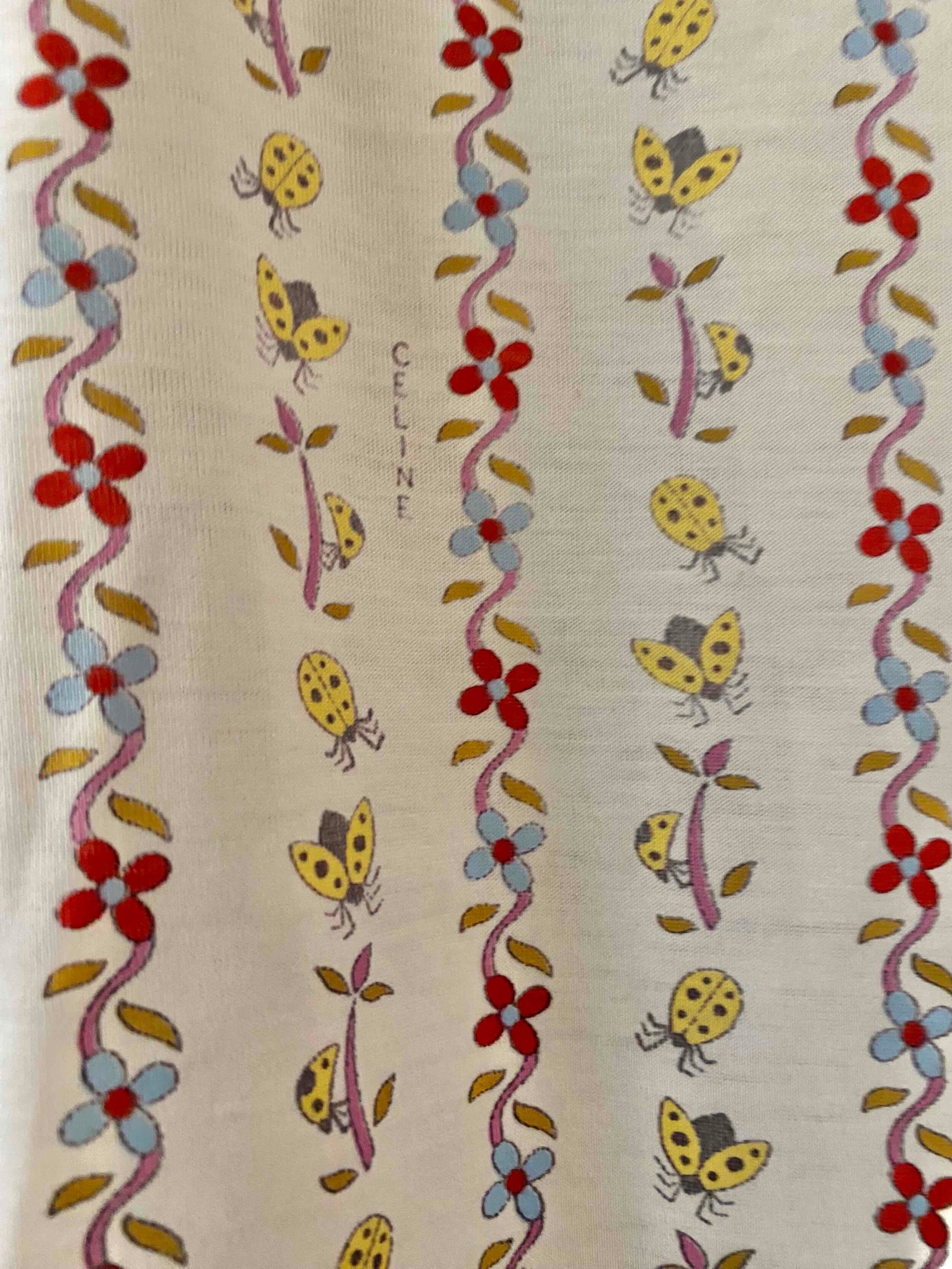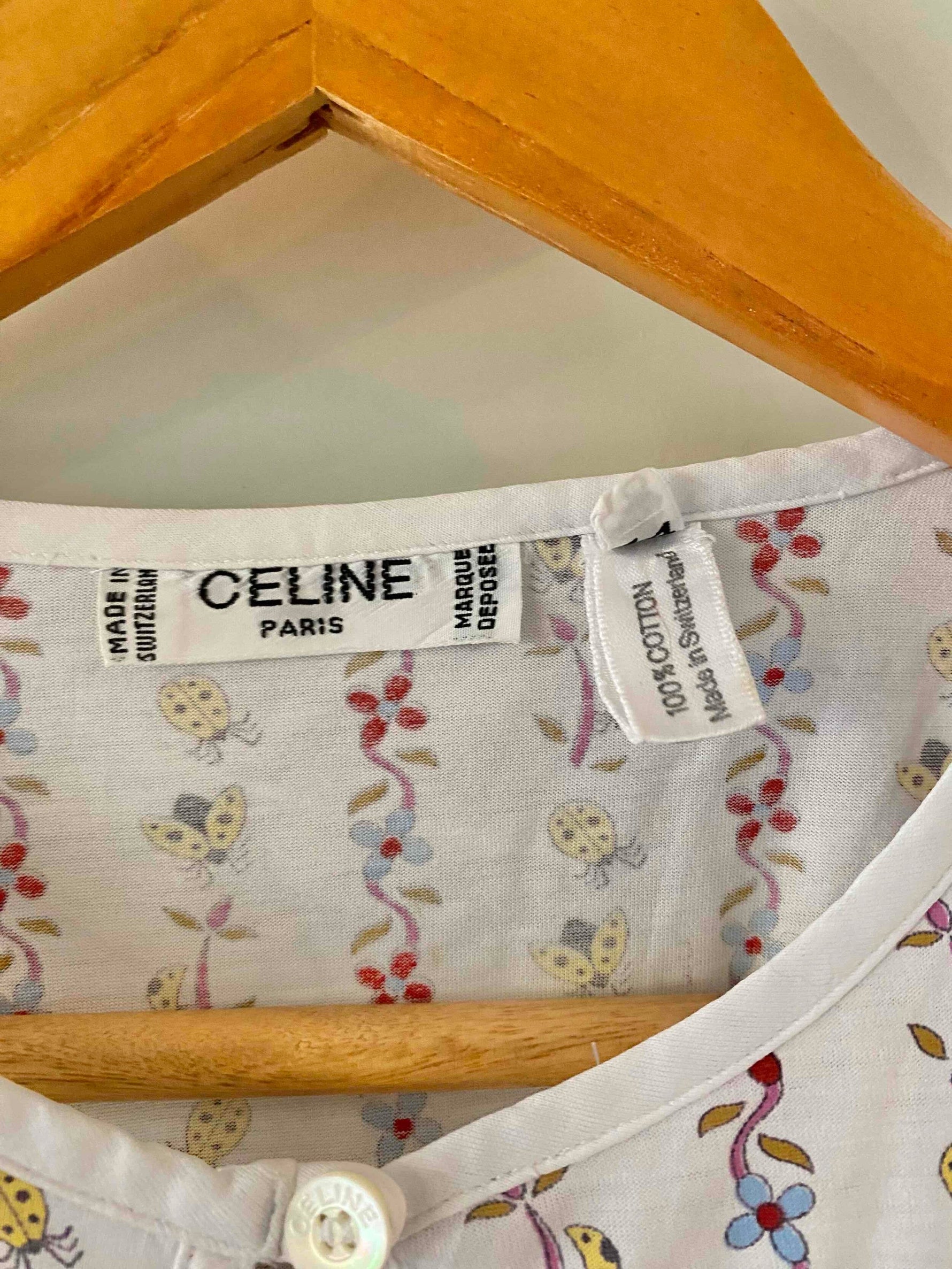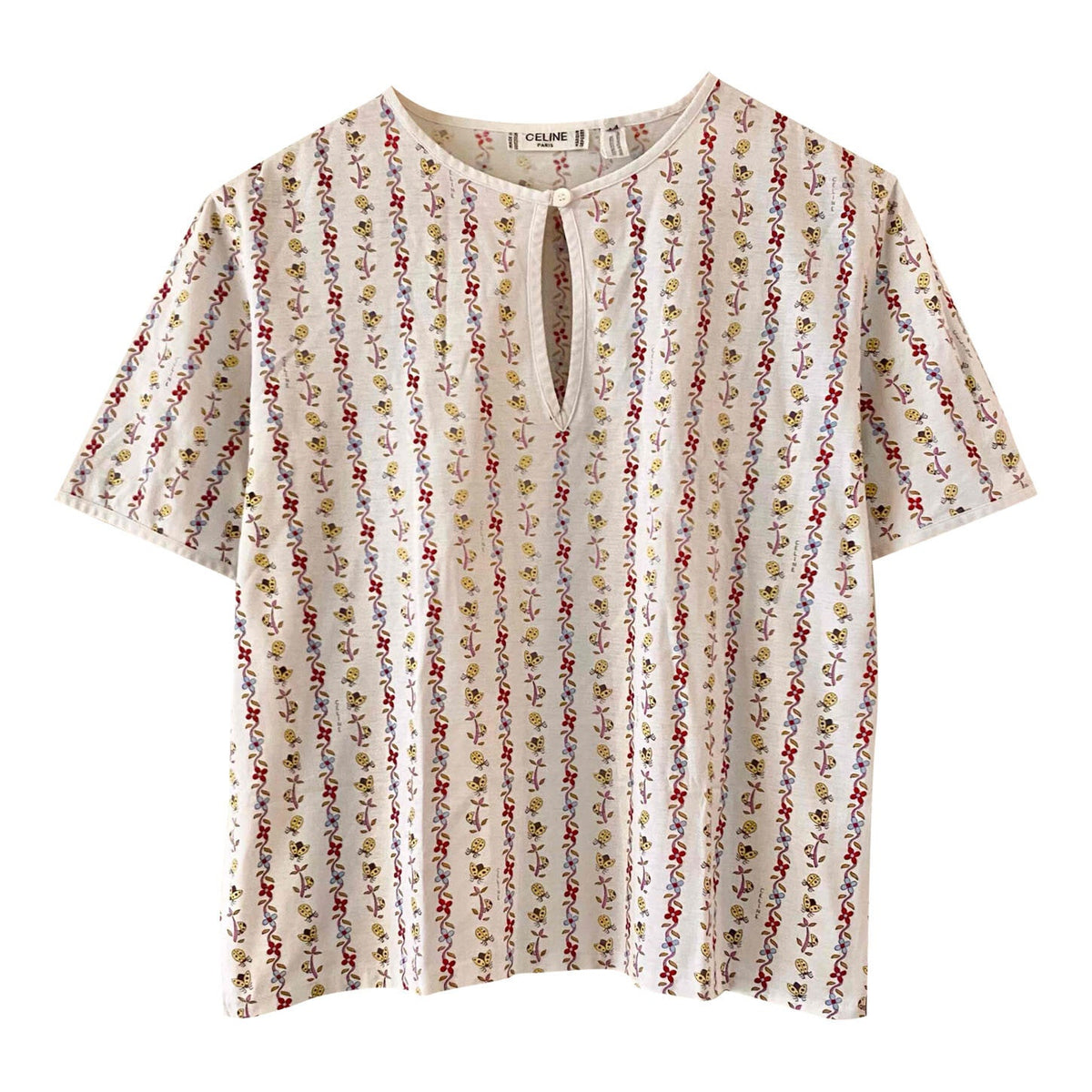 Prix unitaire parT-shirt Céline, en jersey de coton blanc motifs imprimés frises de fleurs, coccinelles, et logo Celine, goutte boutonnée au col, fabriqué en Suisse, taille 36 porté ici sur un mannequin T36.