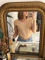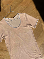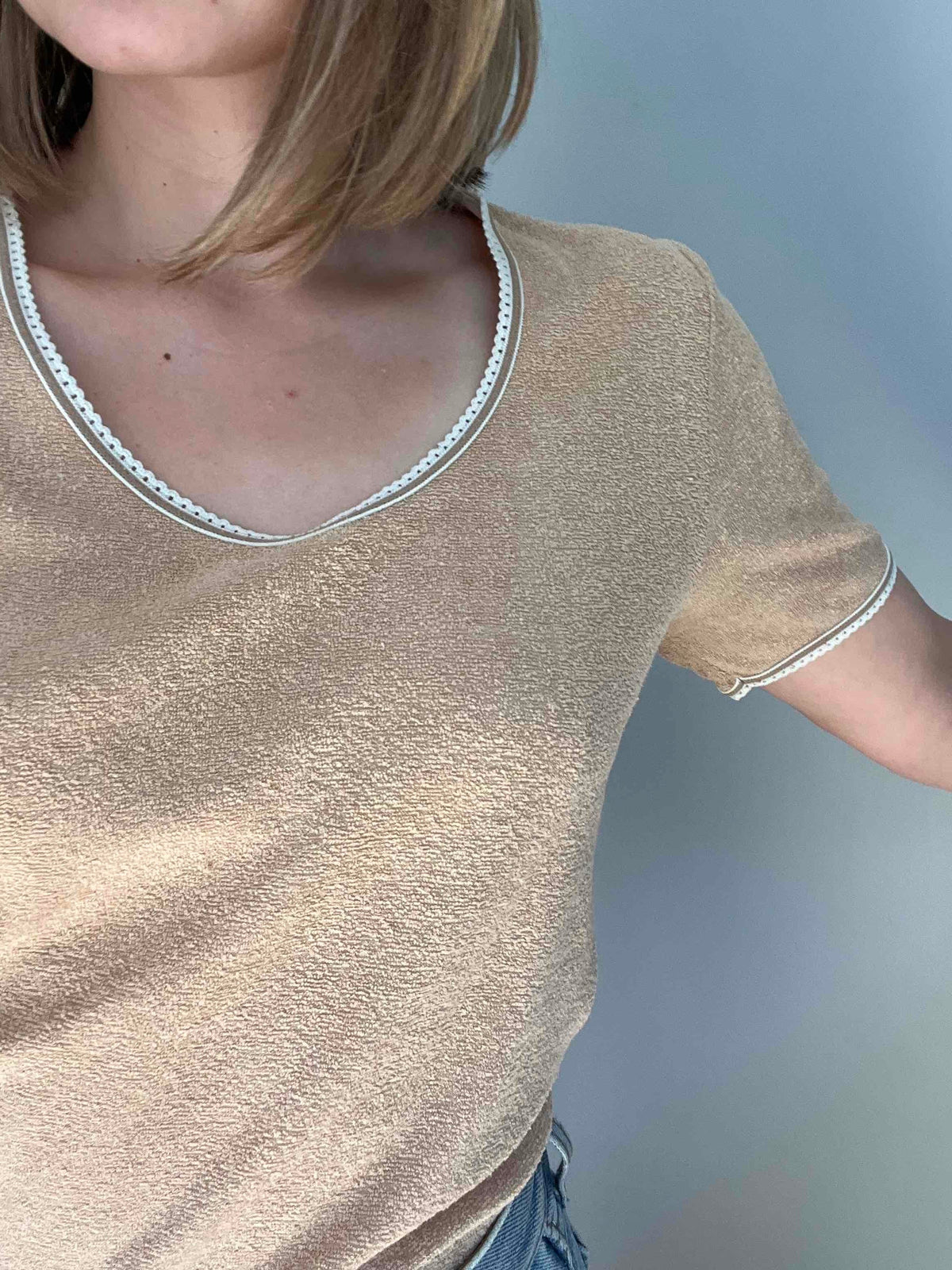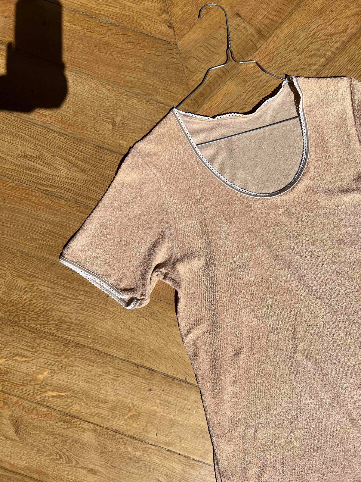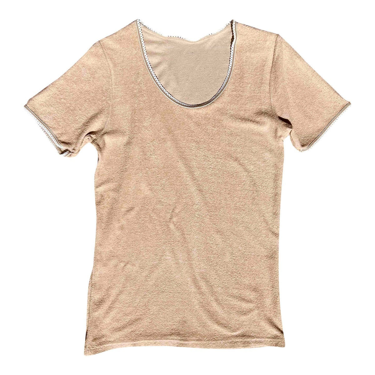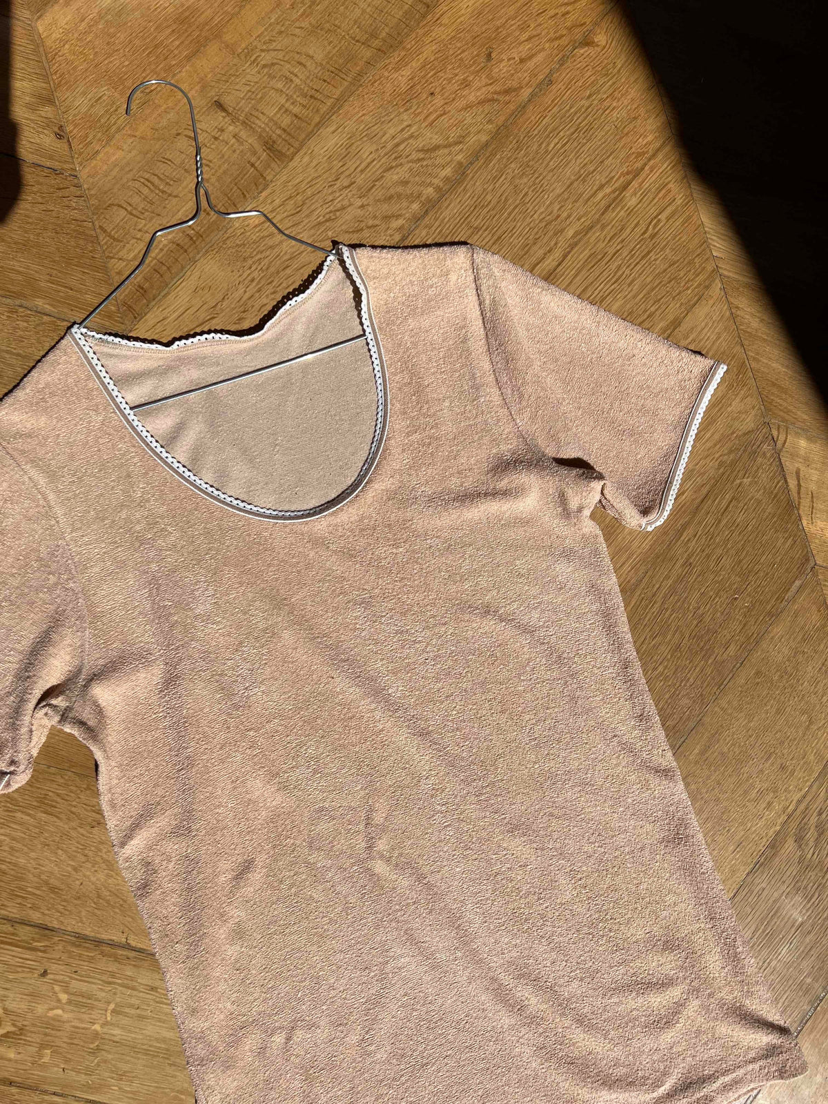 Prix unitaire parTee-shirt beige à manches courtes en épingle coton. Petits détails au col et manches. Excellent état. Aucun défaut. Taille 36/38.