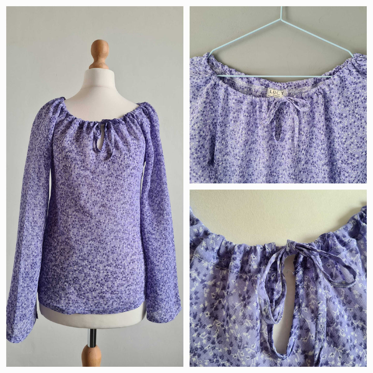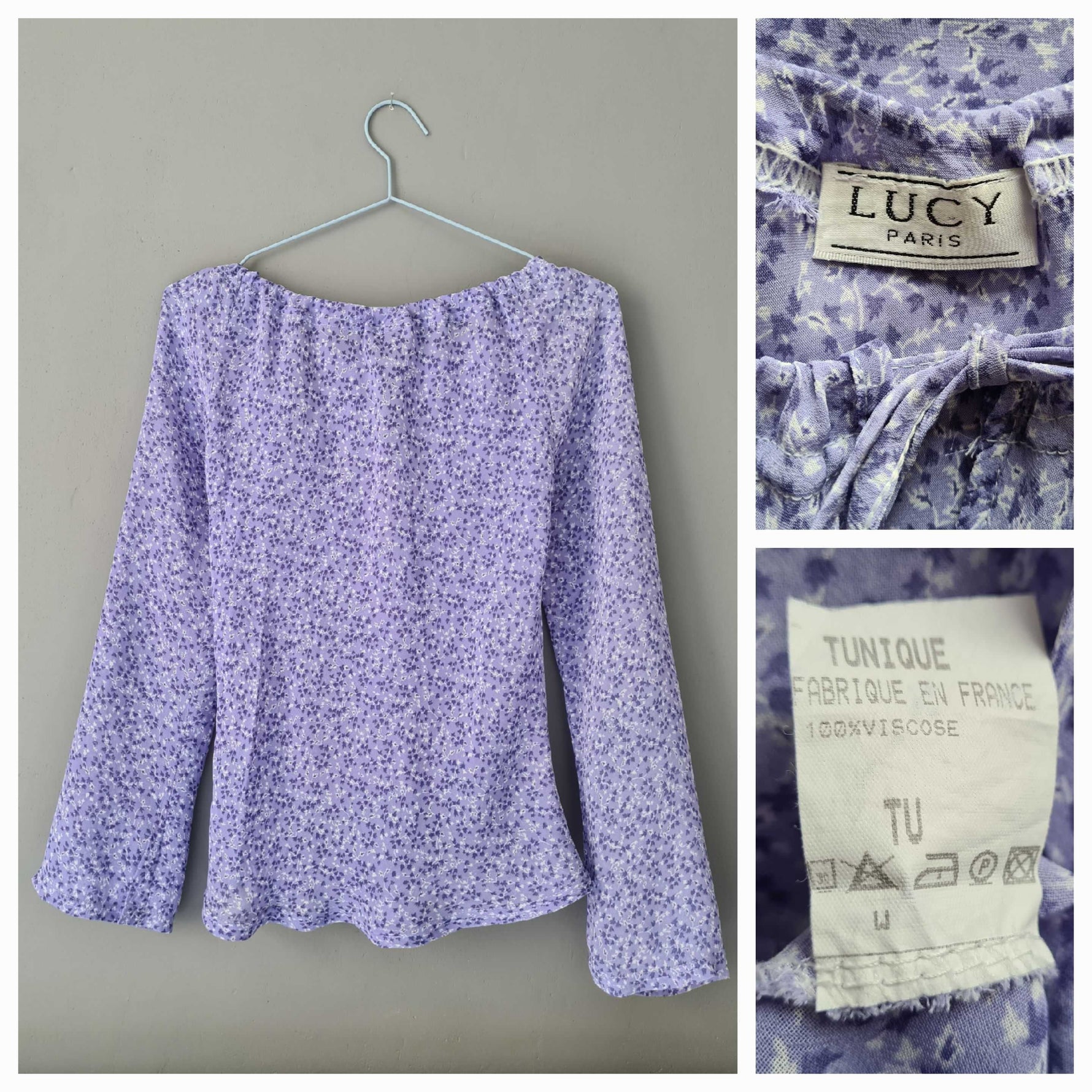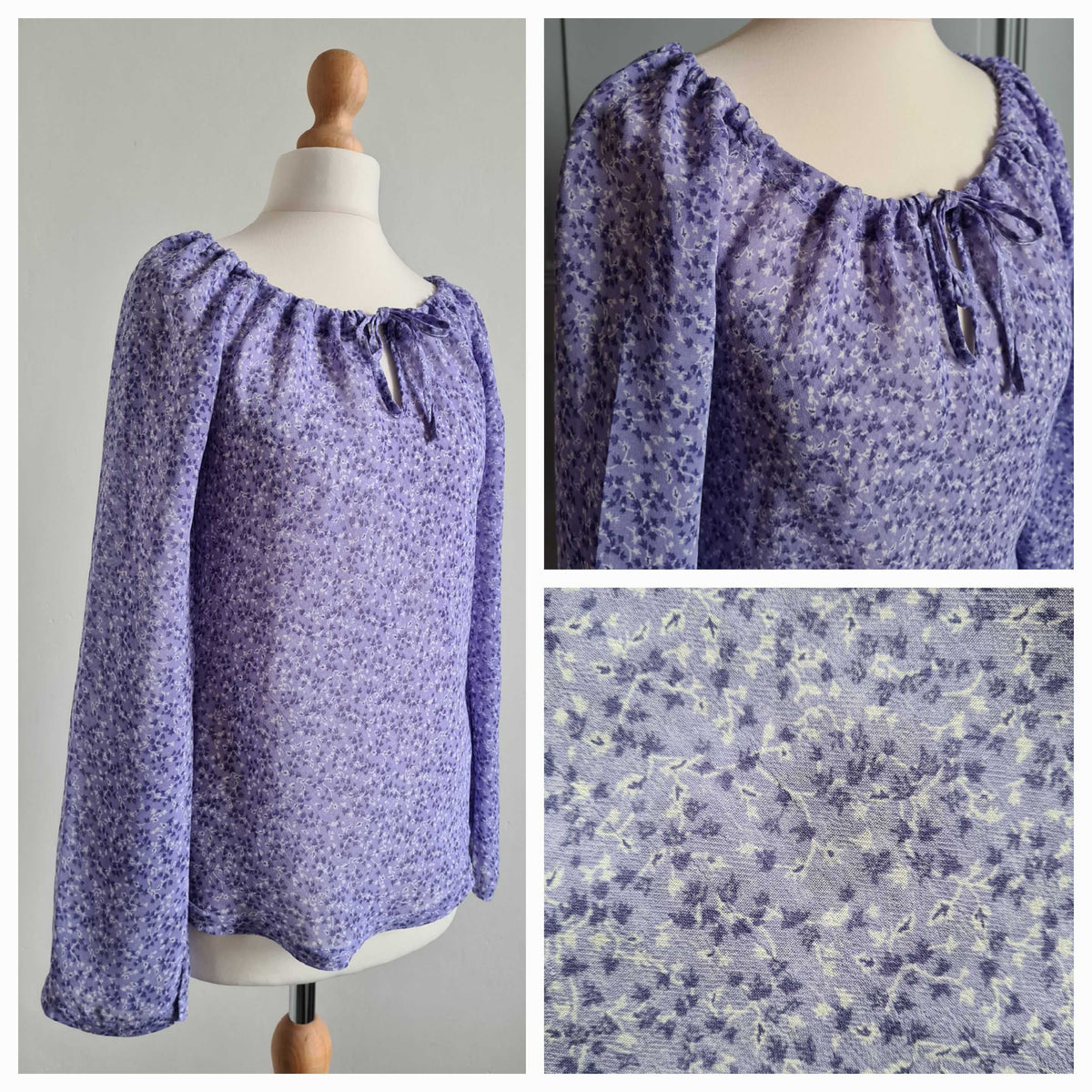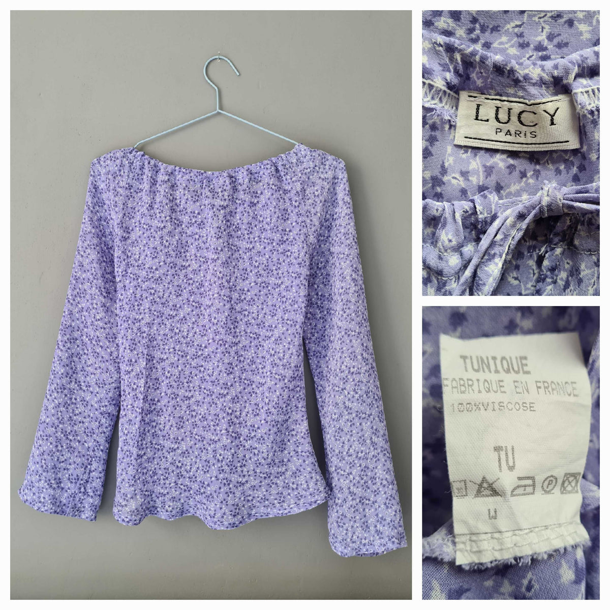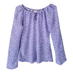 Prix unitaire parTop en viscose lilas à mini imprimé floral blanc et violet, manches longues raglans, encolure froncée avec lien pour régler. Légèrement transparent. Pièce fabriquée en France.