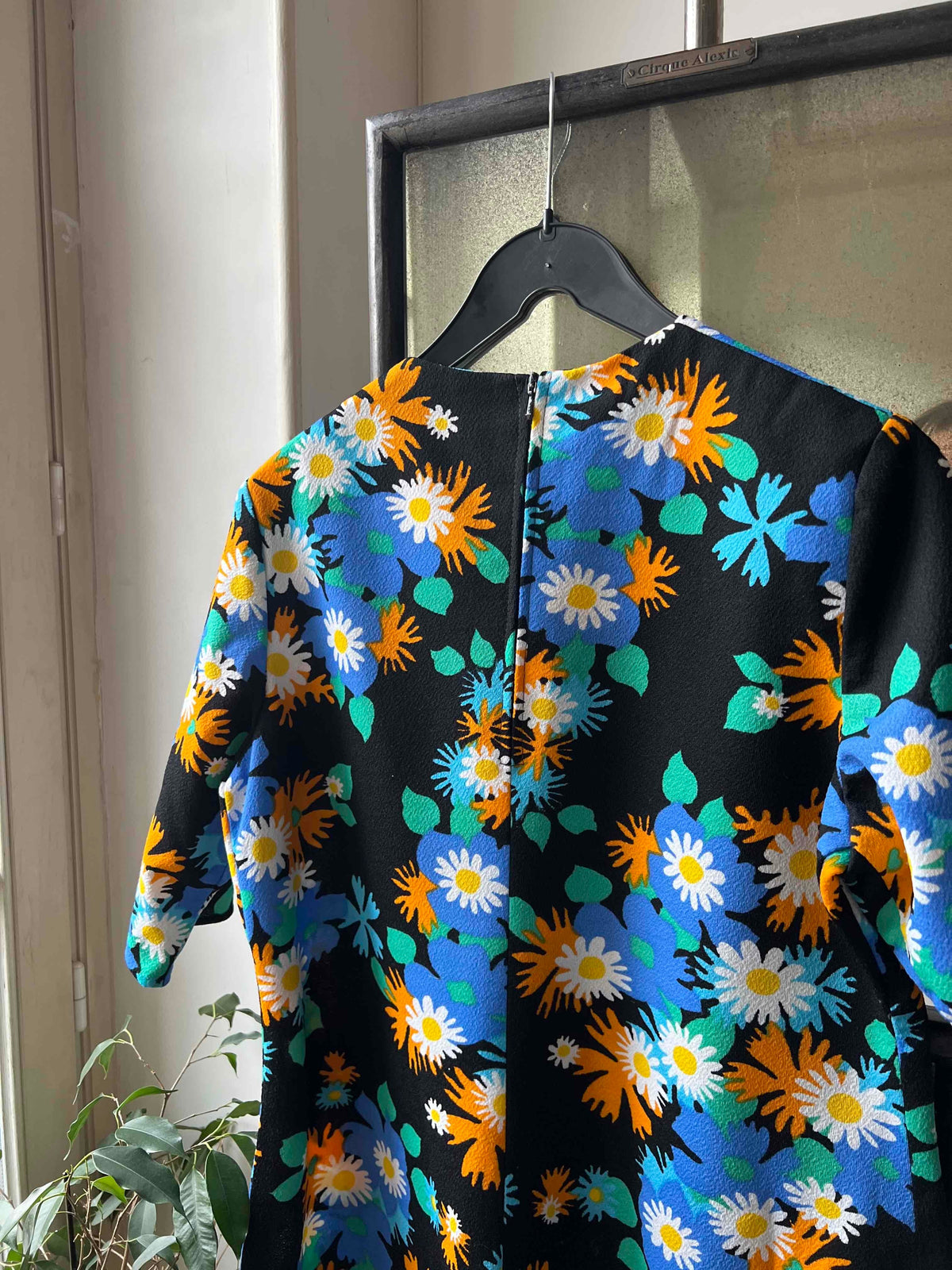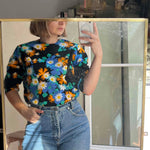 Prix unitaire parTop années 70 noir à fleurs orange et bleu. Zippé dans le dos, manches courtes au dessus du coude. Taille 38. Excellent état, aucun défaut. Matière synthétique