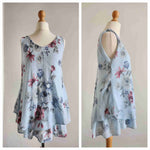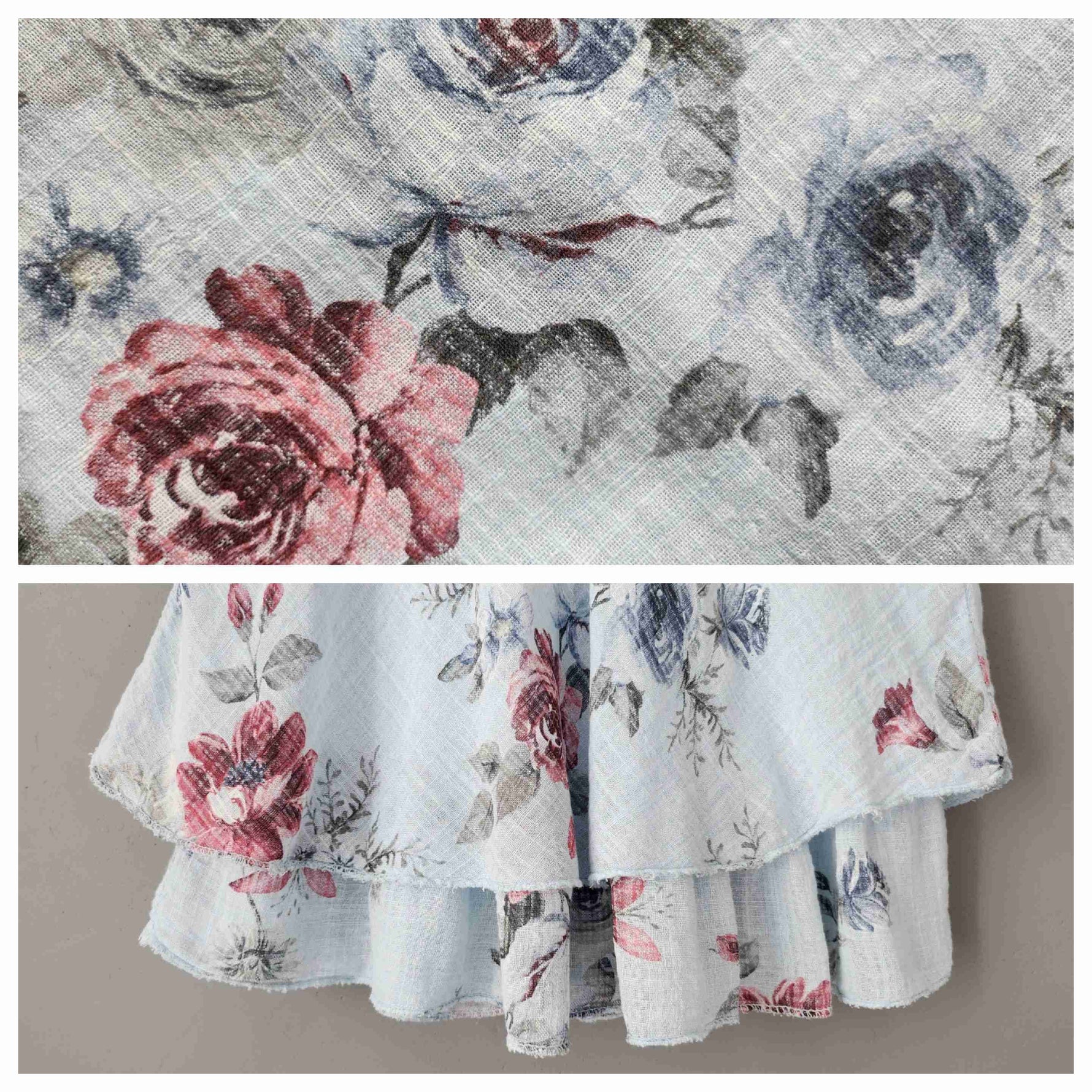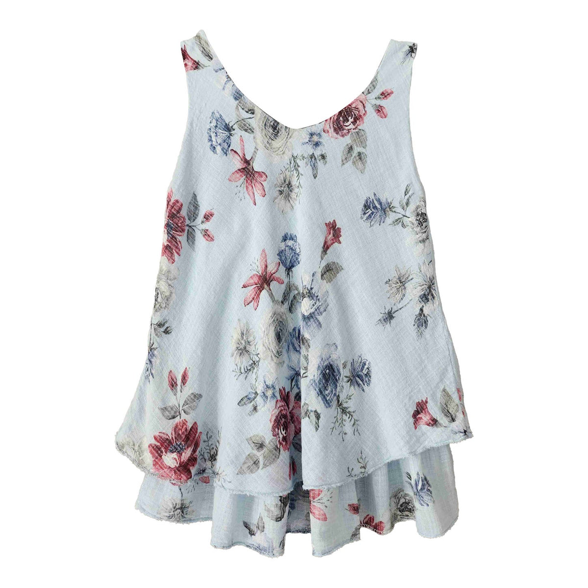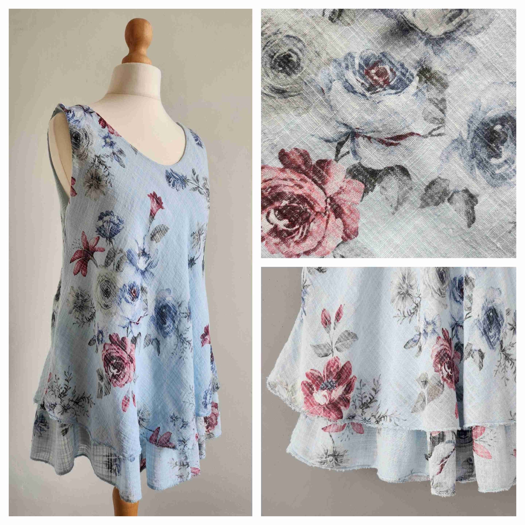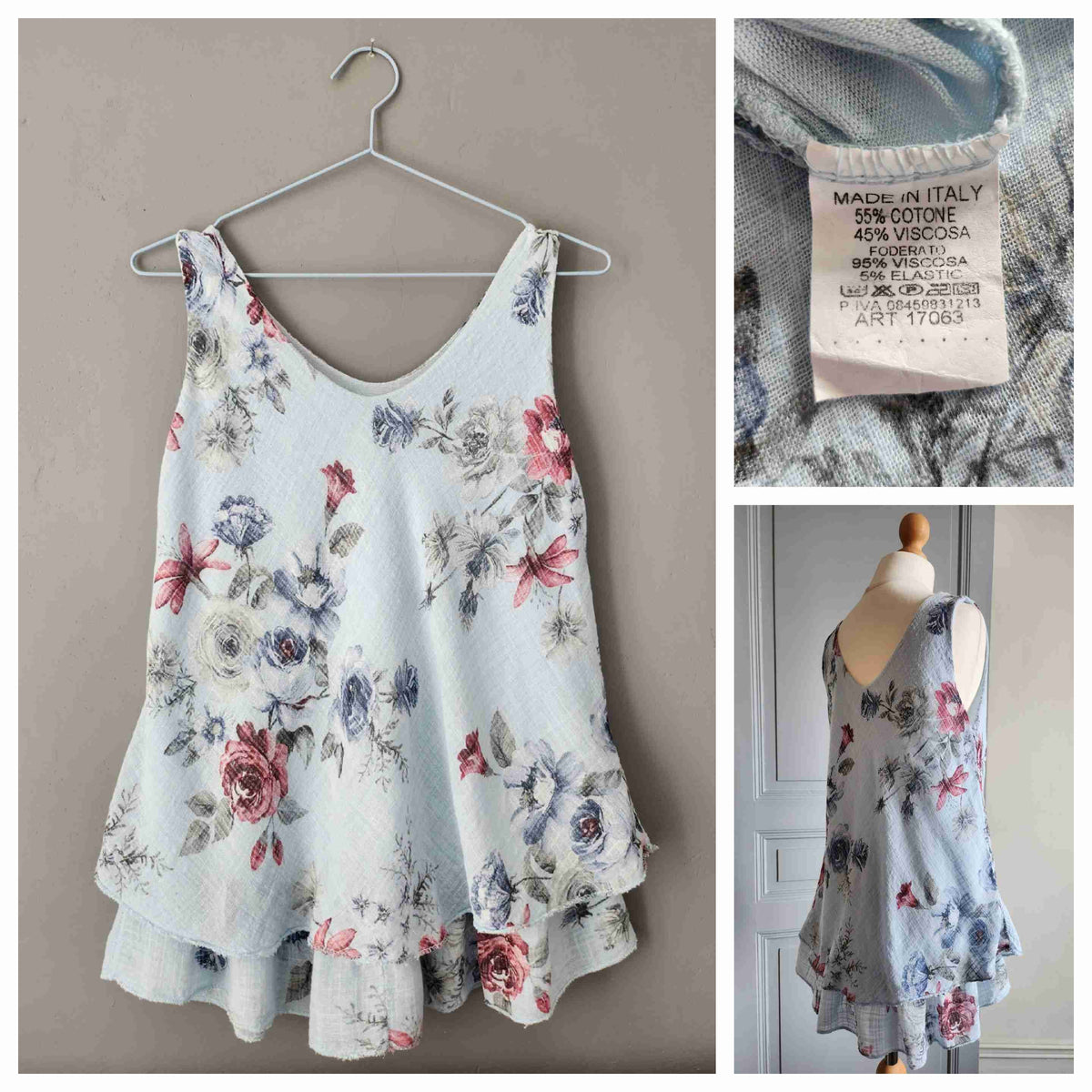 Prix unitaire parTop sans manches à volants, en voile coton mélangé, bleu tendre imprimé fleurs romantiques roses et bleues. Doublure volantée dépassant en bas. Fabriqué en Italie.
