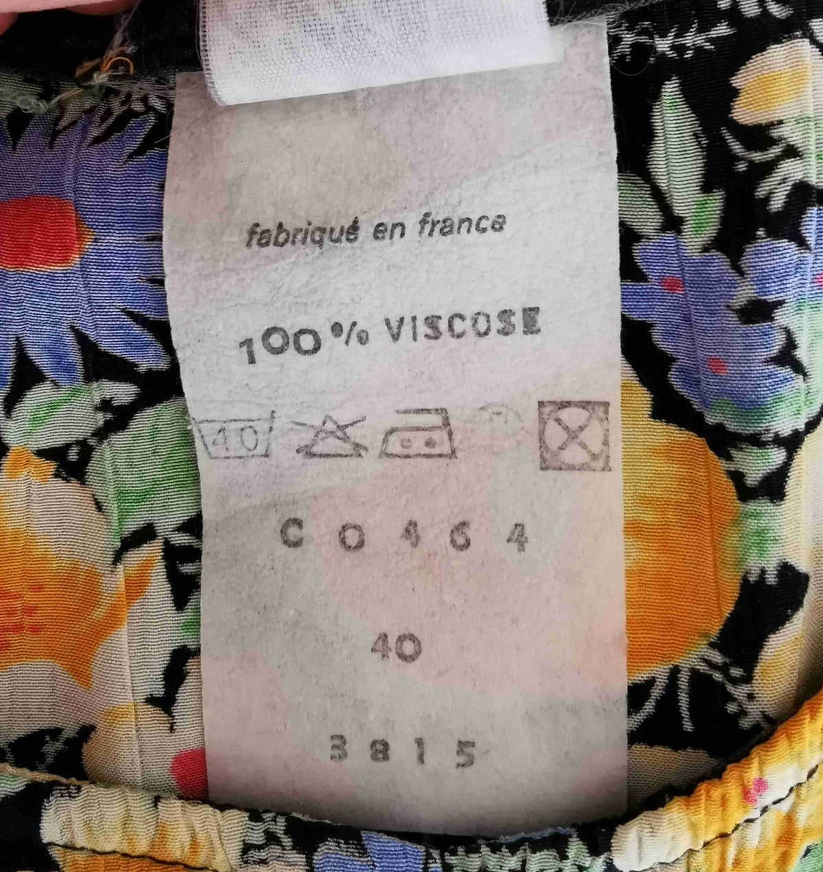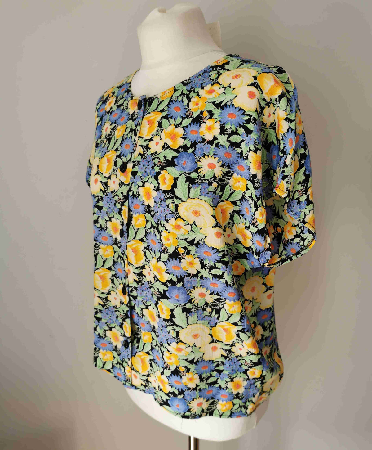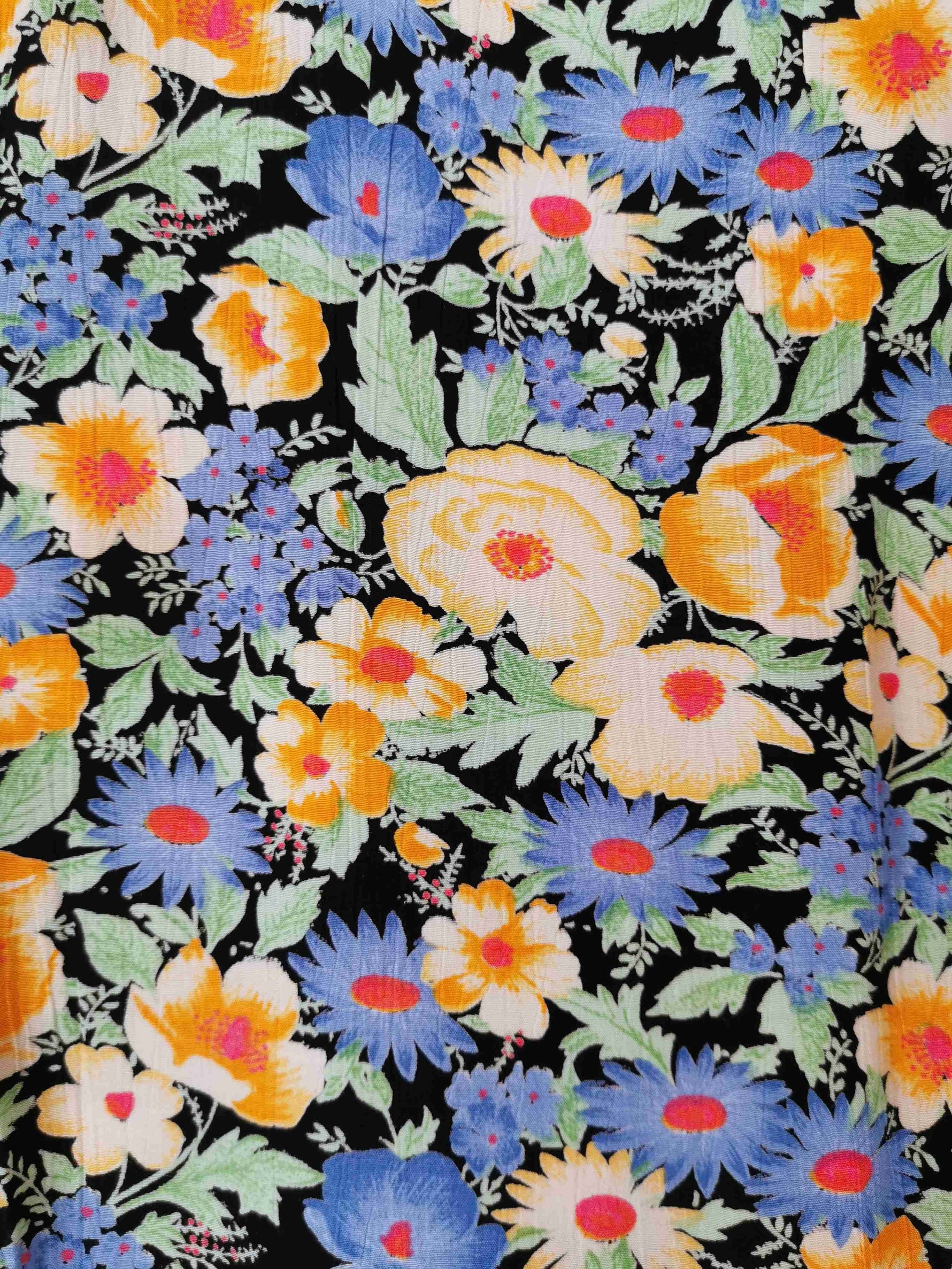En viscose au fond noir avec des fleurs bleues, jaune pastel et vert.