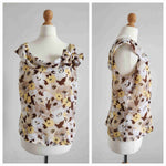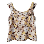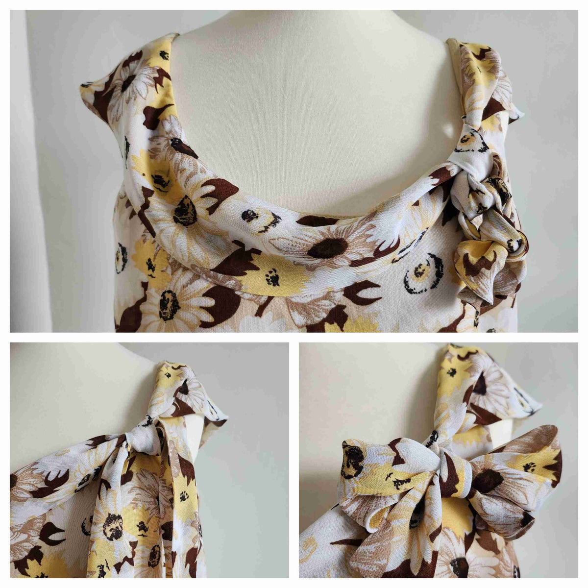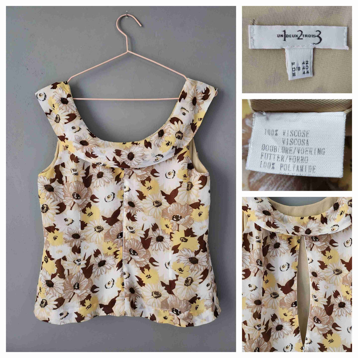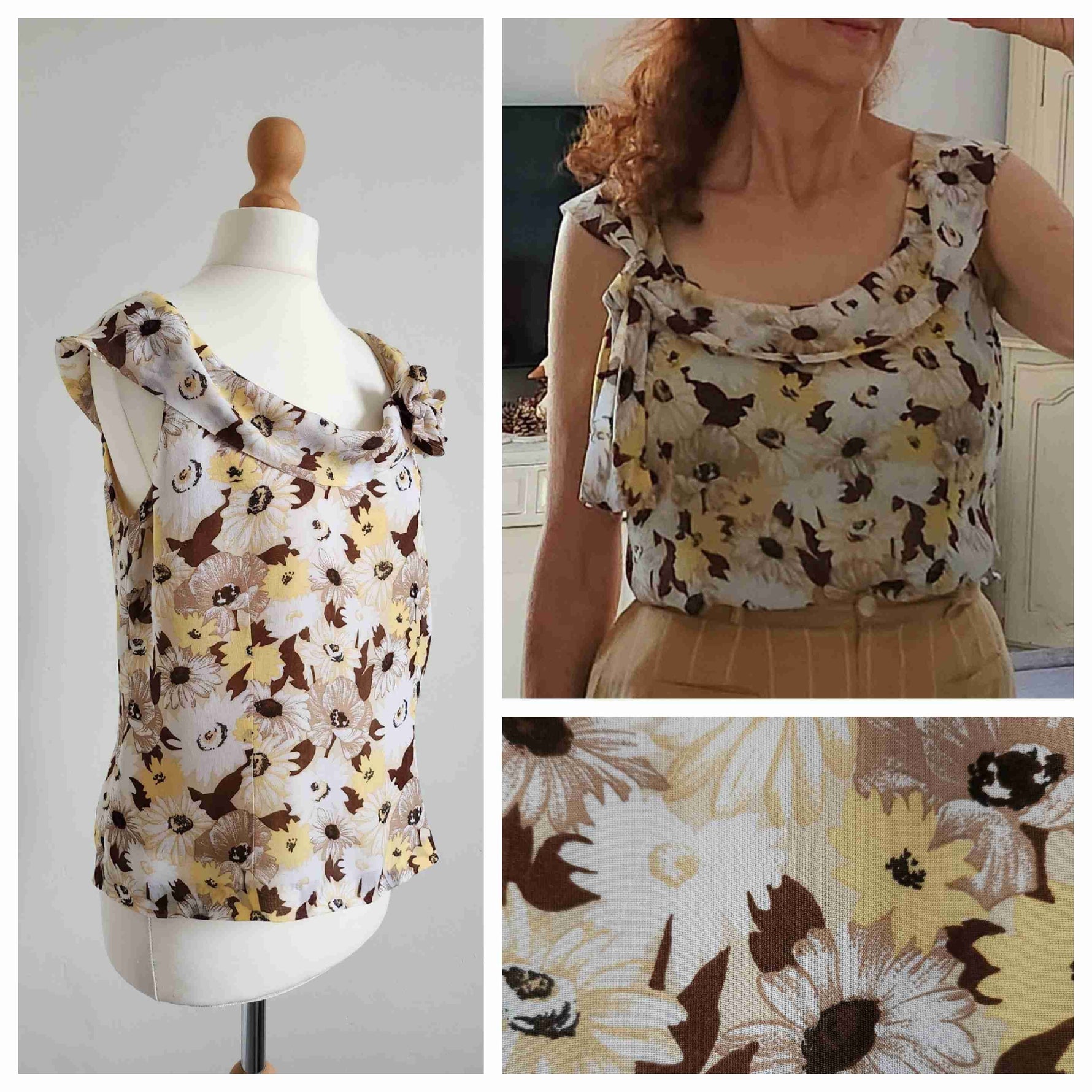 Top à fleurs en voile viscose doublé, imprimé marguerites et anémones, blanc, jaune et camaïeu de bruns, sans manches, col drapé à liens pour nouer côté, fermeture éclair dos. Porté sur les photos par une personne T36. Marque 123.