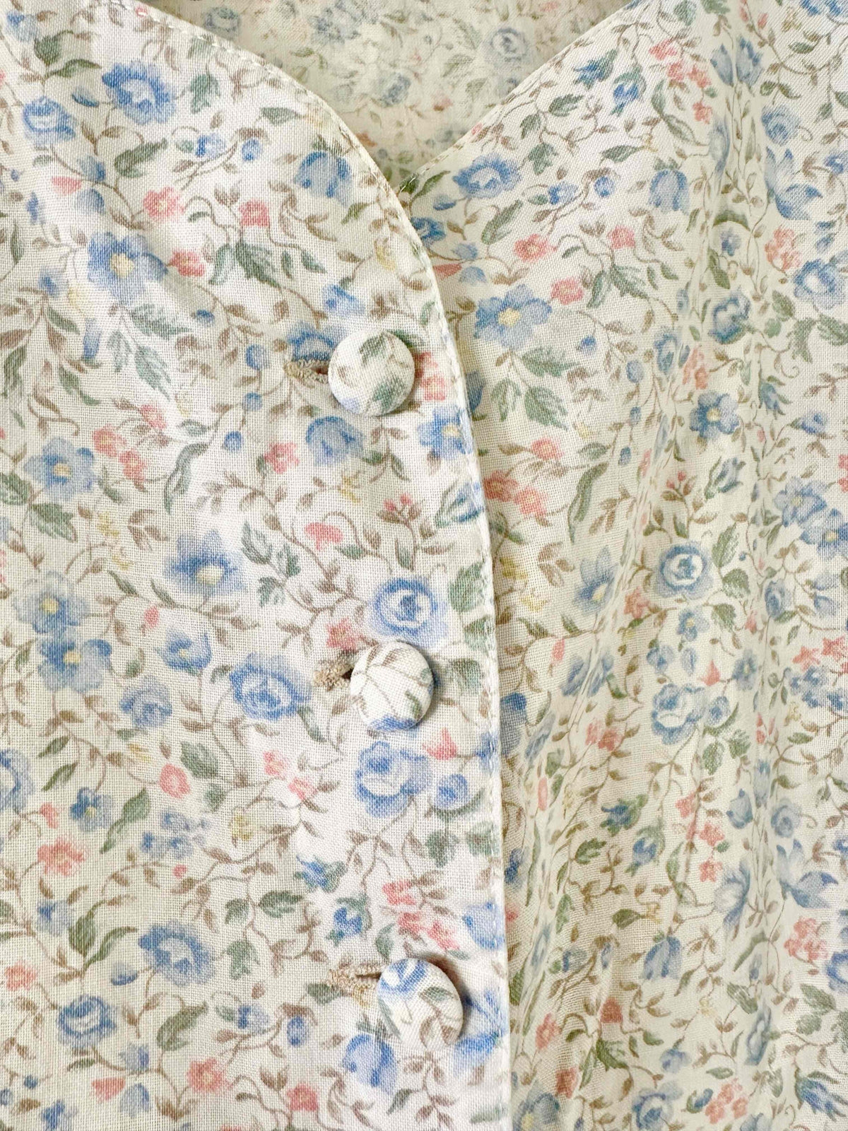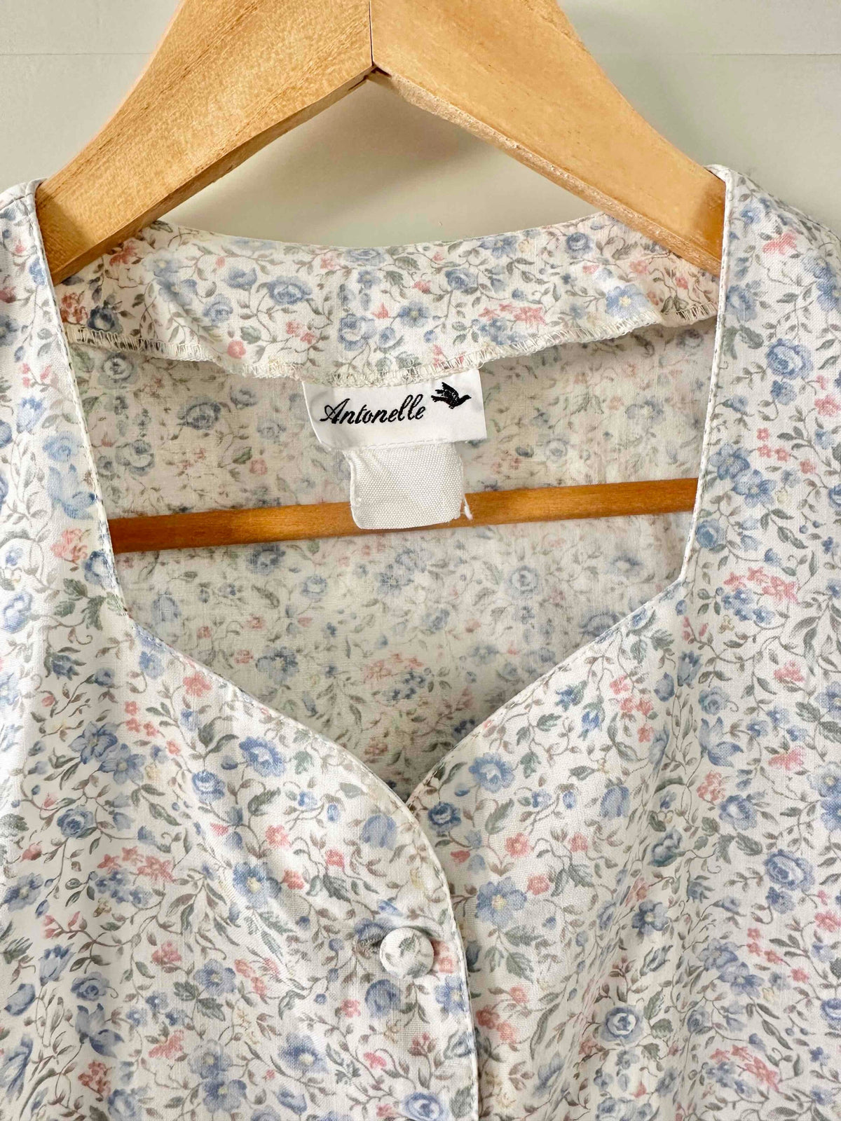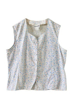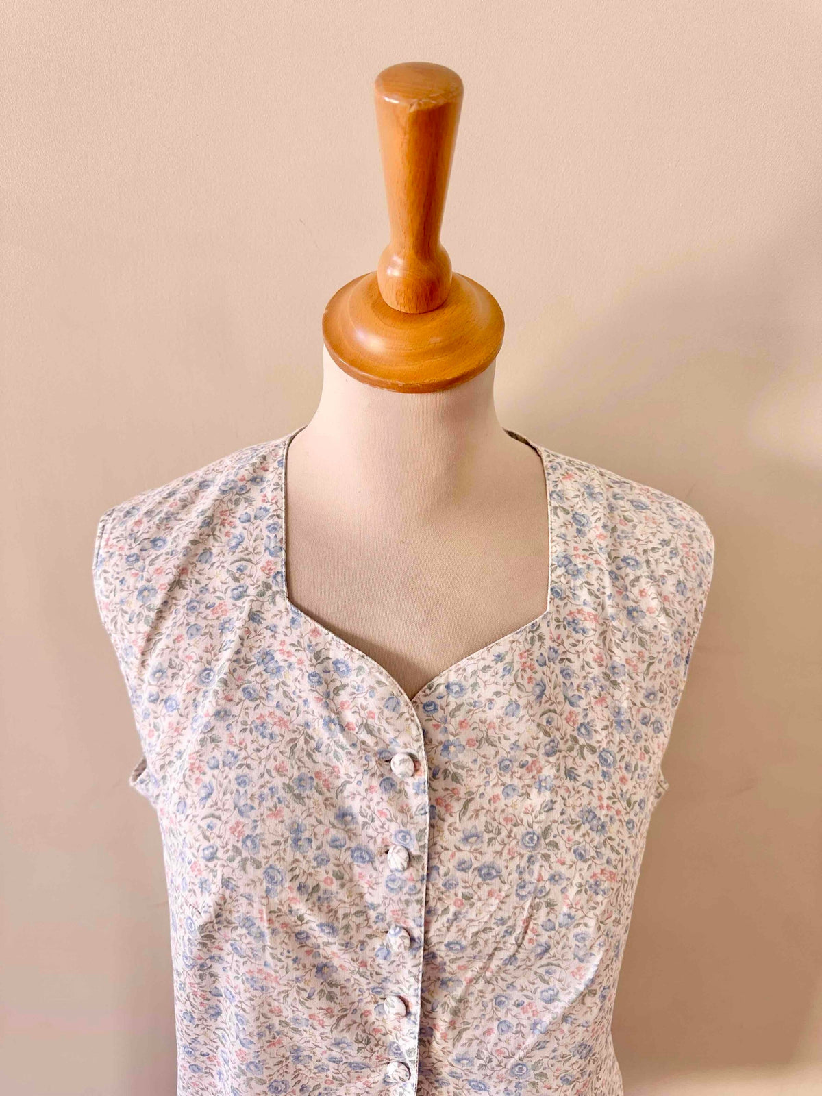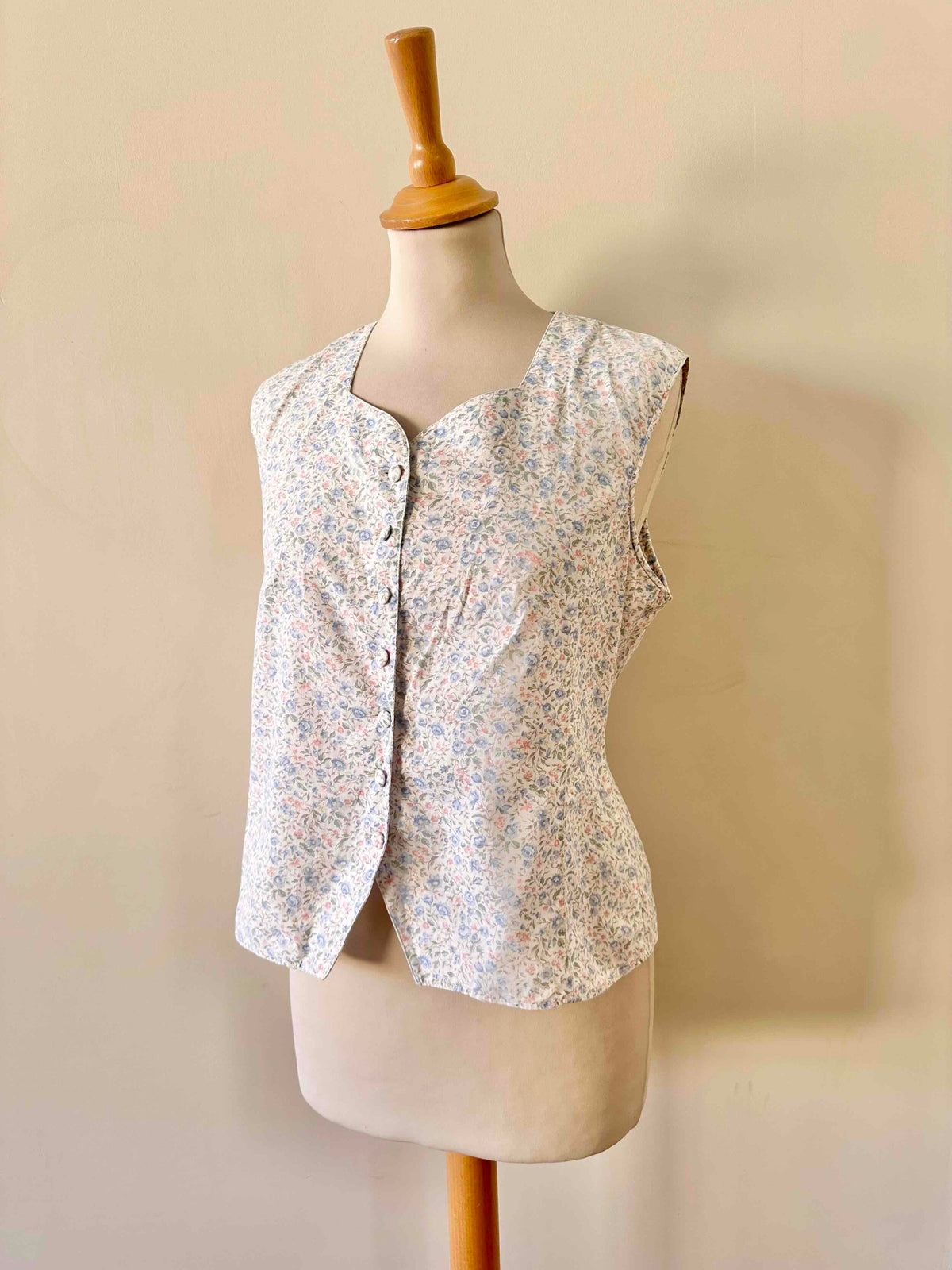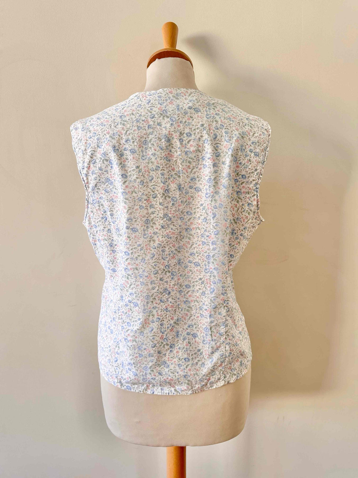 Prix unitaire parChemisier liberty, en coton blanc imprimé fleurs liberty roses, bleues ciels, forme corsage sans manches, boutons recouverts, fabriquée en France, taille 38 portée ici sur un mannequin T36.