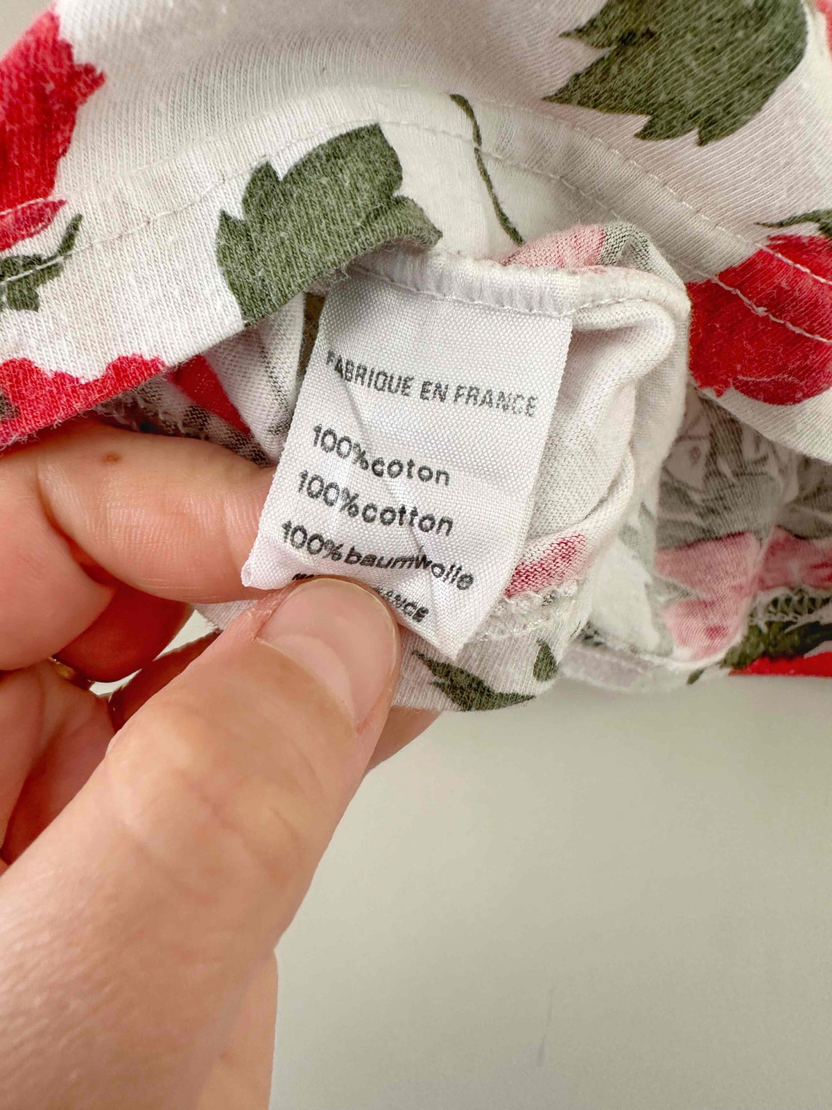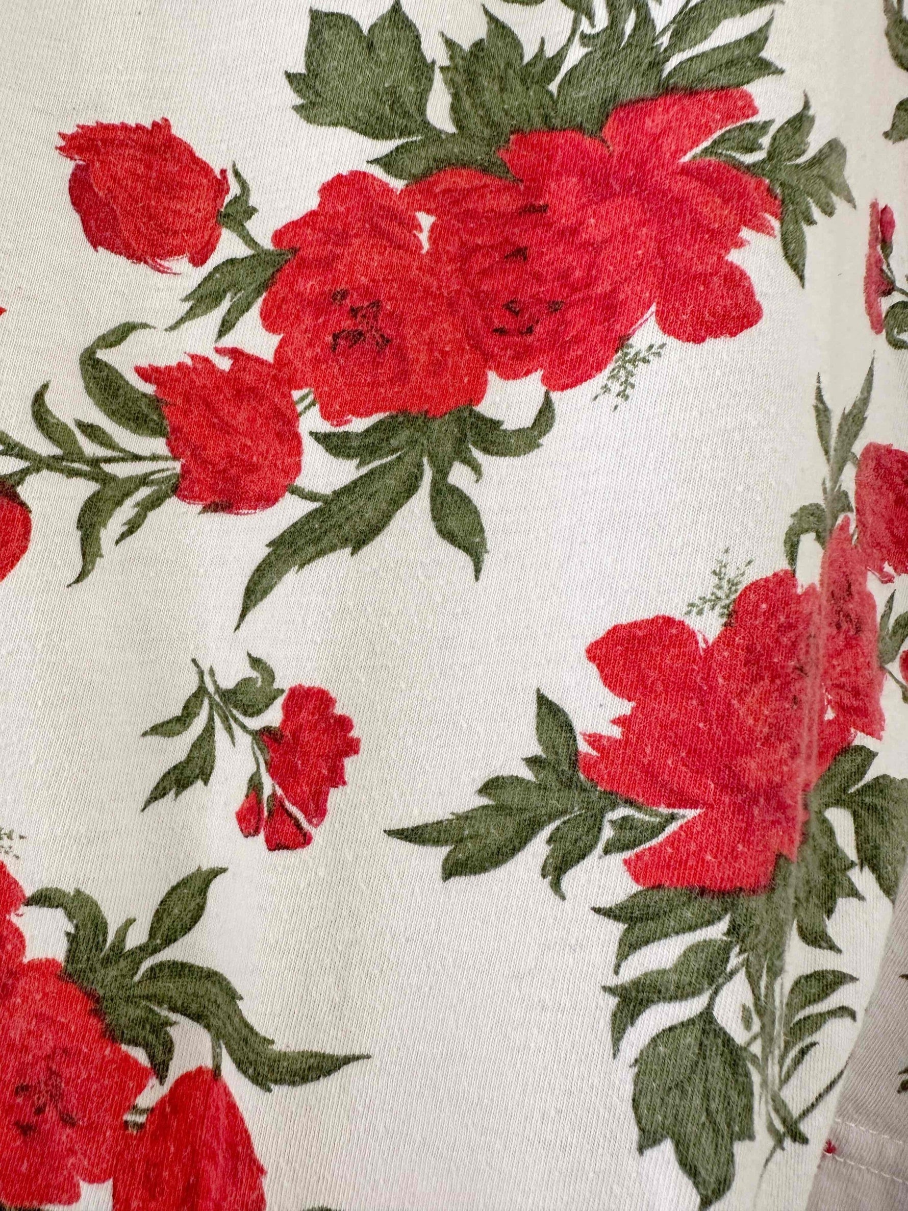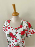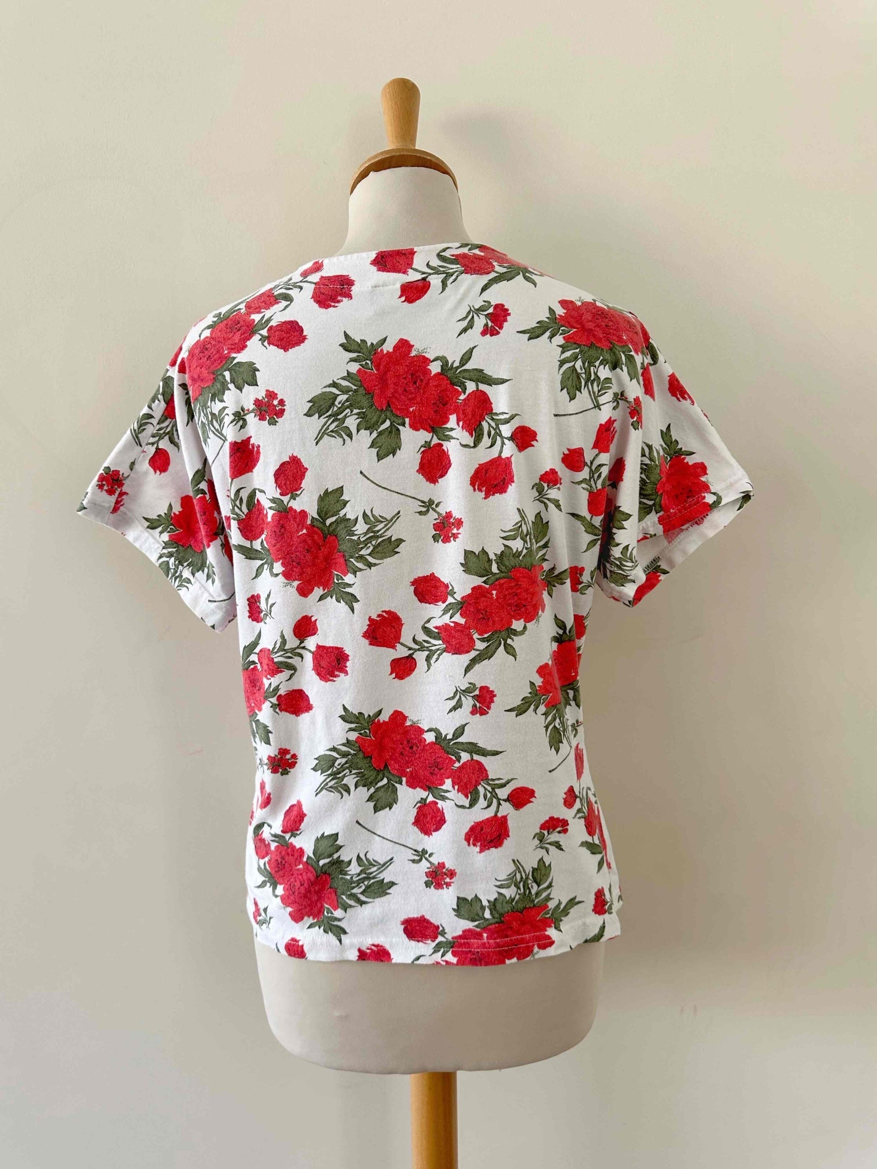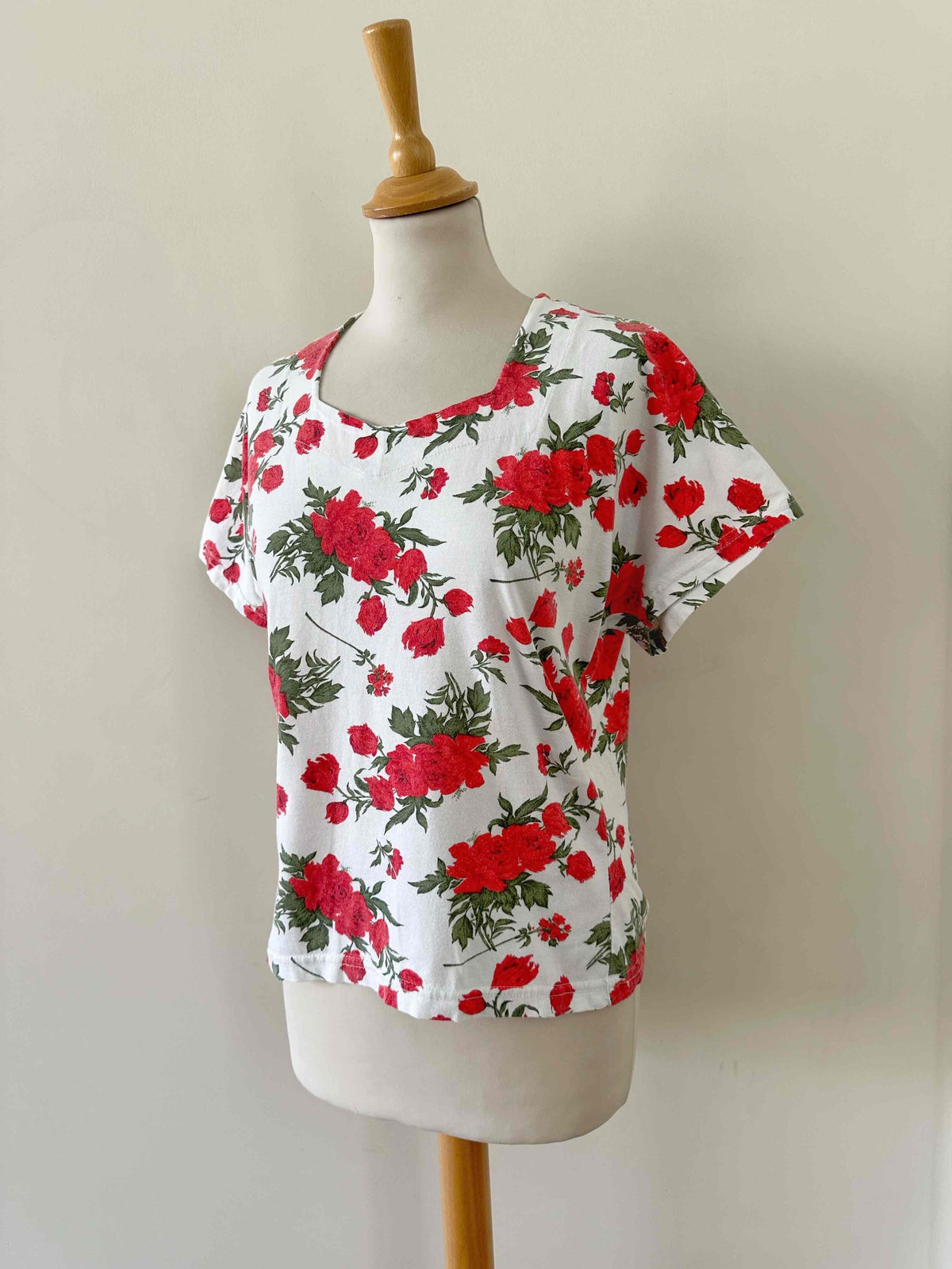 Prix unitaire parT-shirt à fleurs, en jersey 100% coton blanc imprimé, roses rouges et vertes, encolure corsage, manches courtes, fabriqué en France, taille 36 et 38, porté ici sur un mannequin T36.
