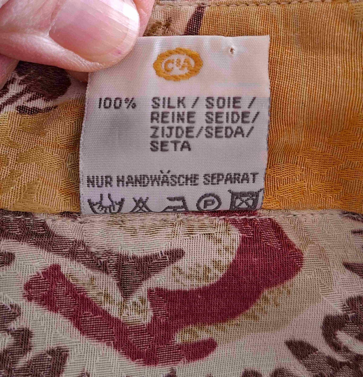 La soie est jaune,rose,prune vert et écrue très lumineuse