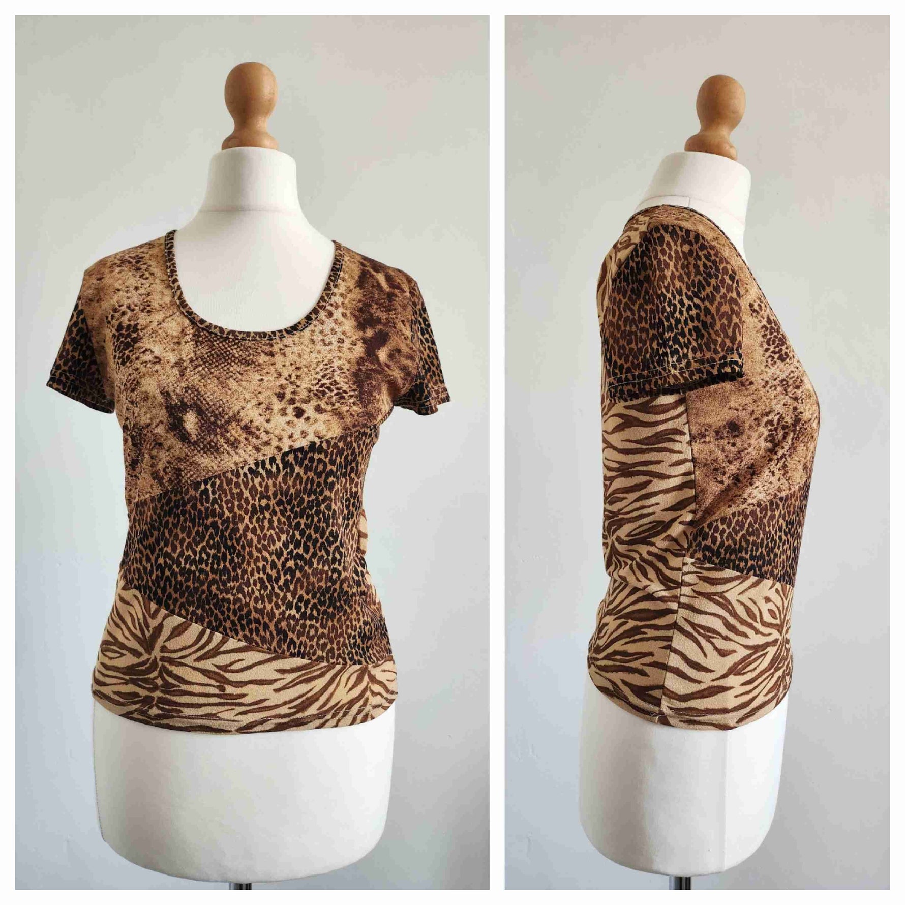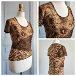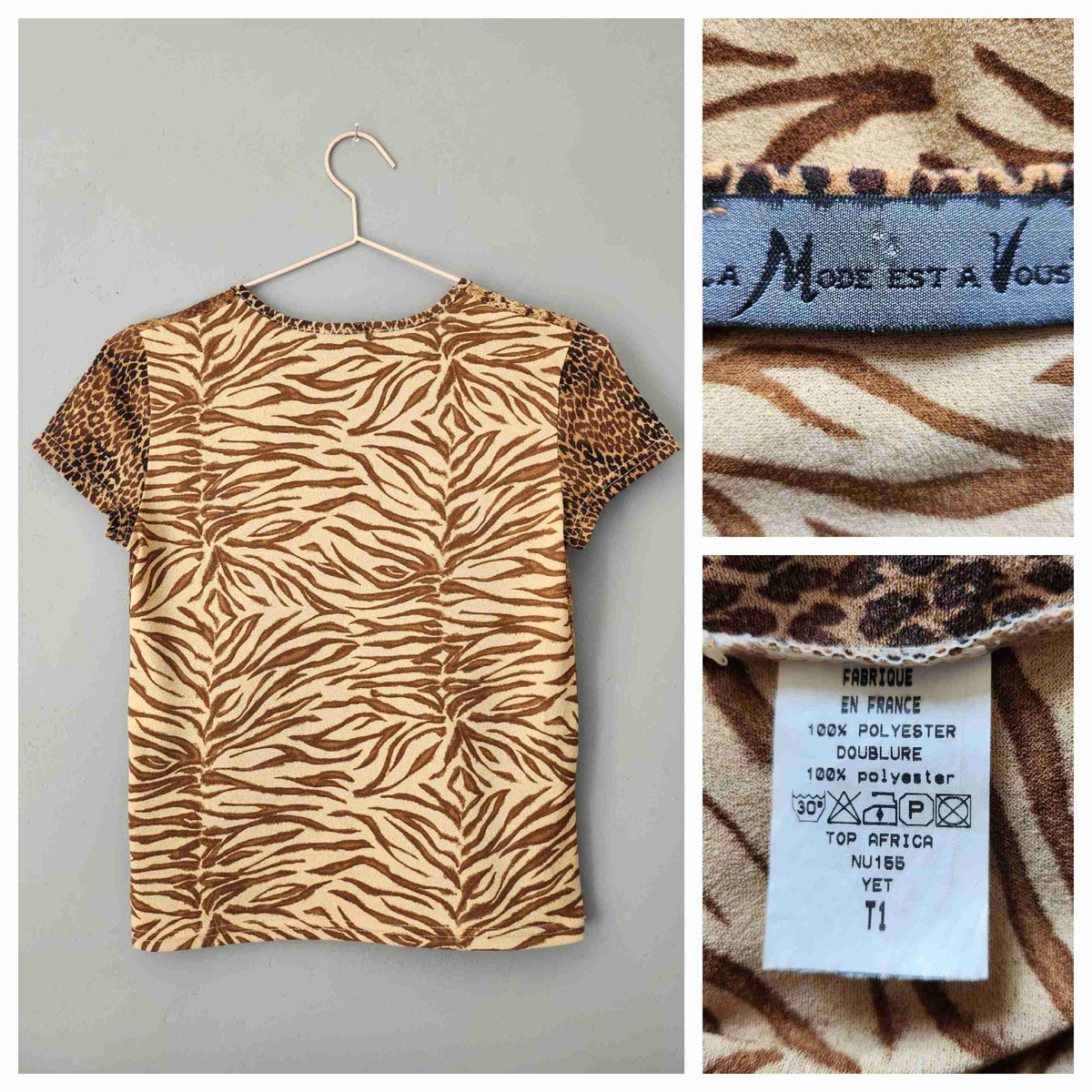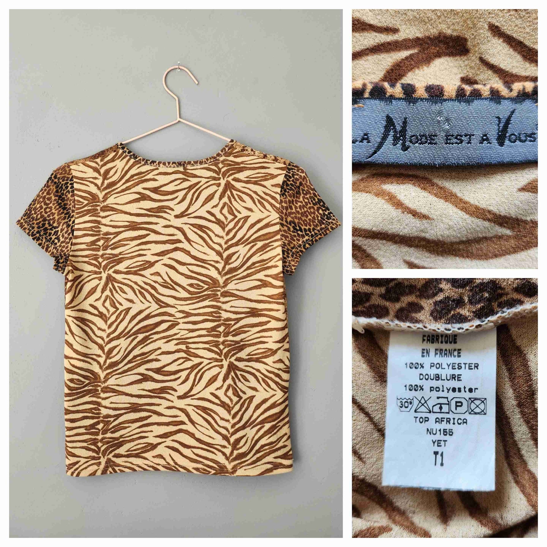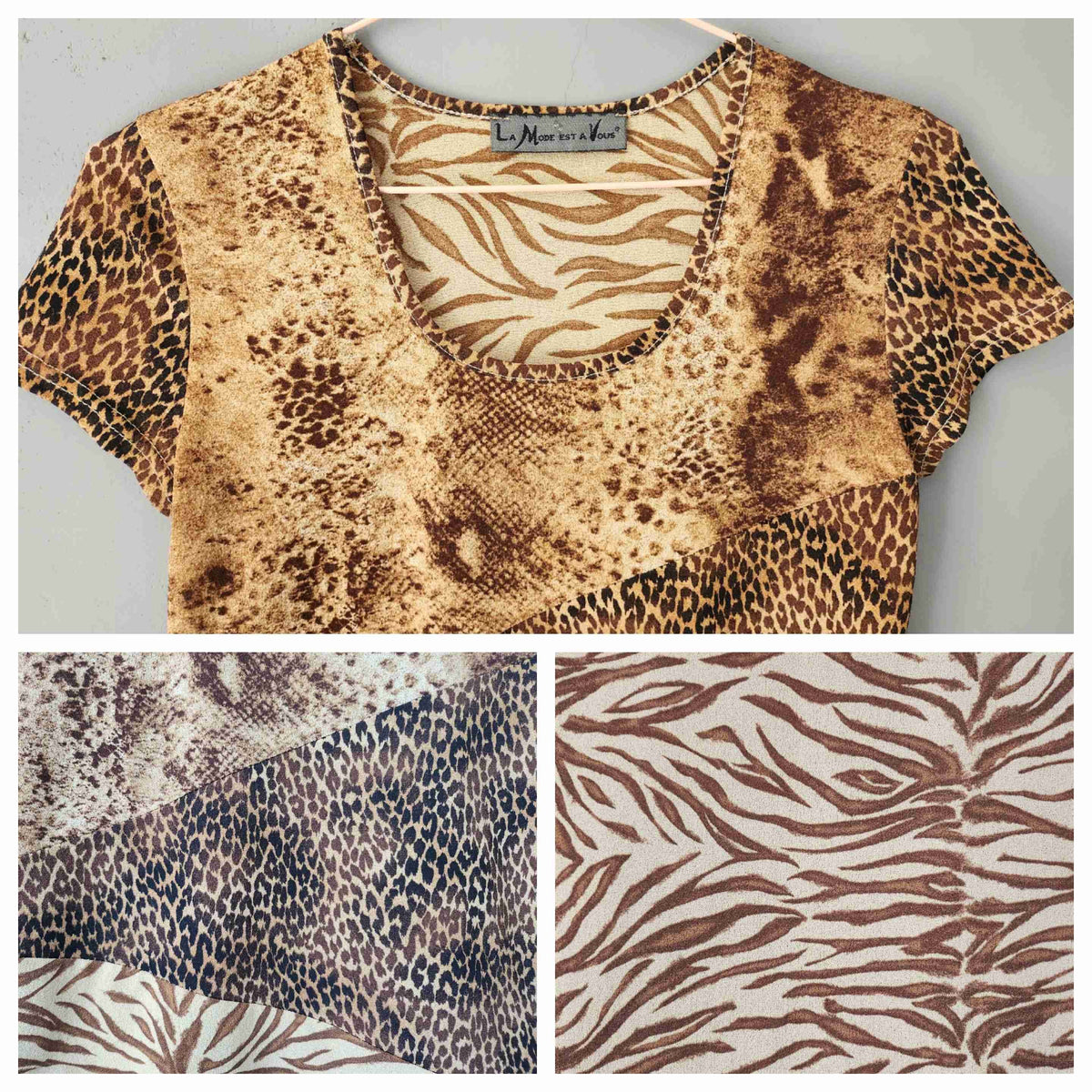 Prix unitaire parTop a manches courtes à imprimé patchwork animalier, petites manches courtes, matière stretch légèrement transparente. Fabriqué en France.