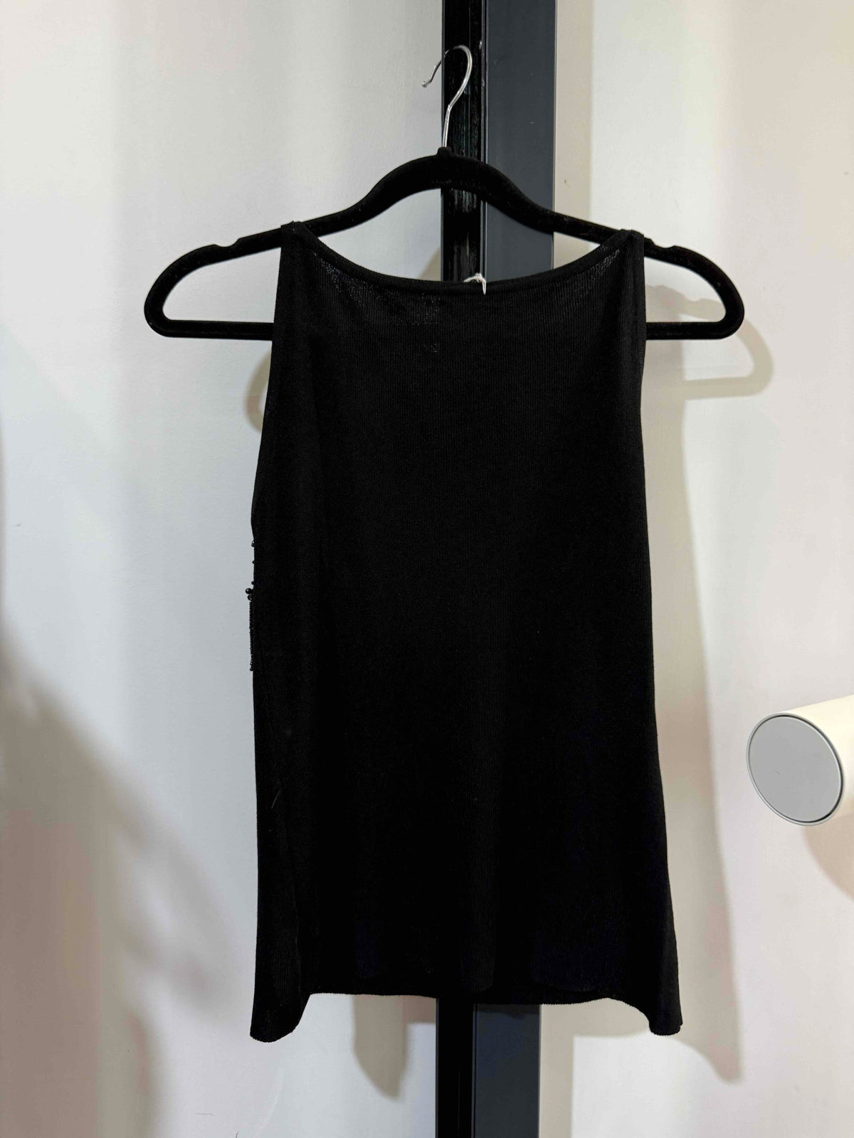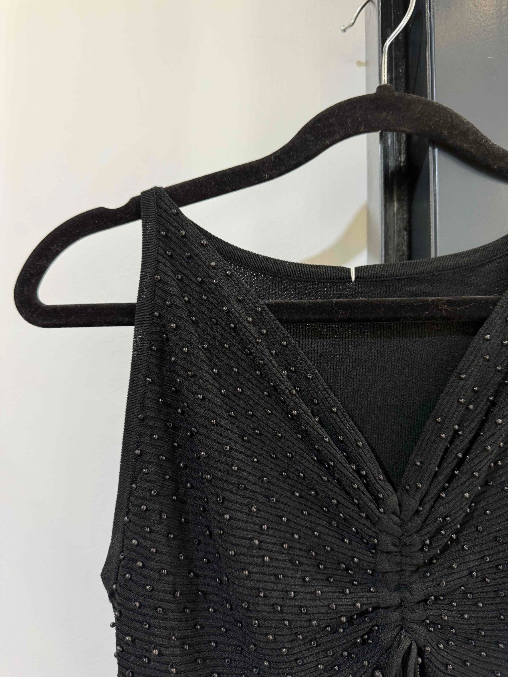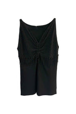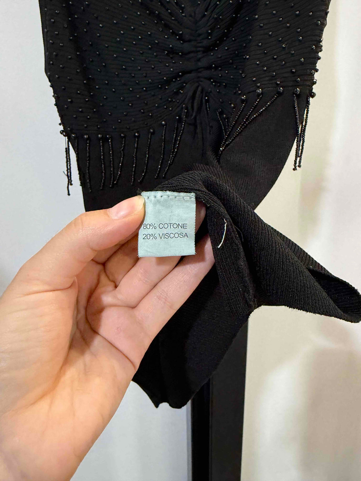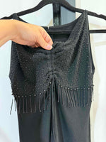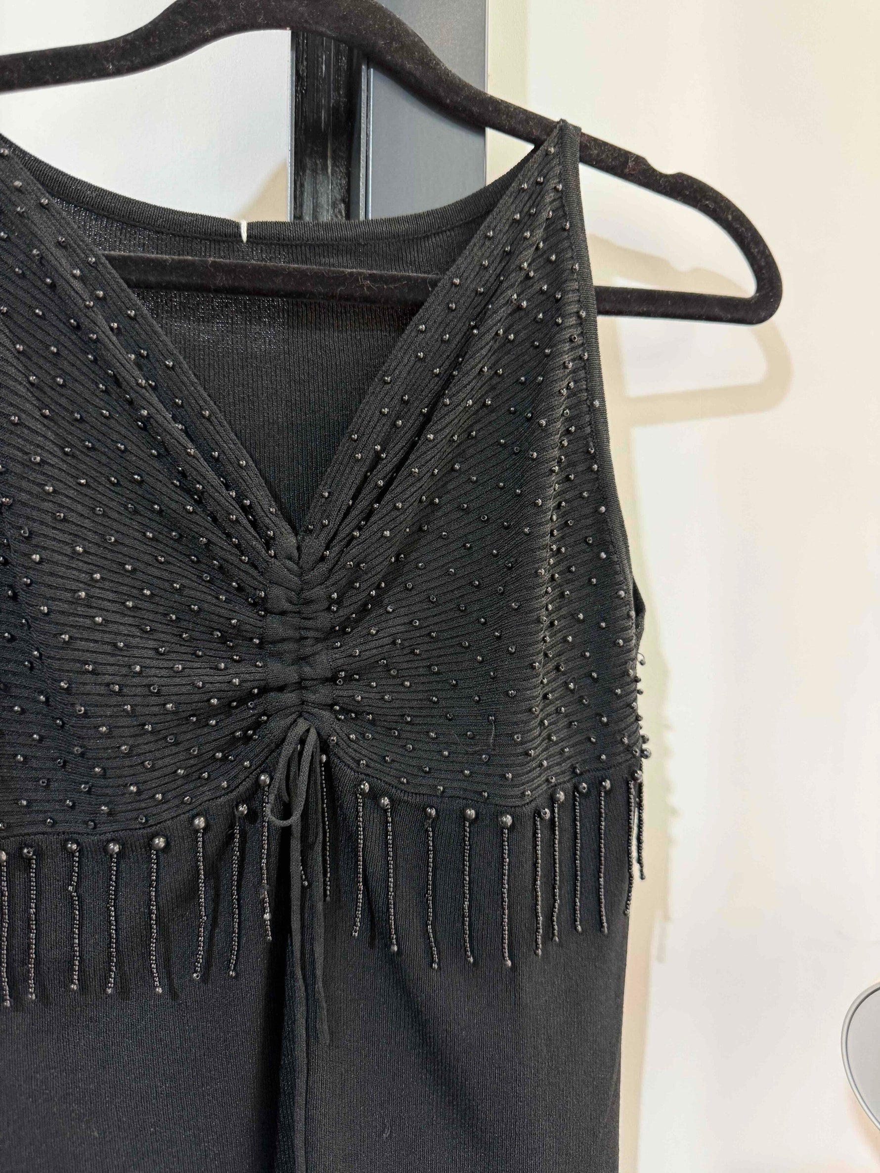 Caraco maille strech noir avec des perles brodées et franges. Lien à la poitrine pour froncer le top. Années 90s. Excellent état. Coton et viscose taille S.