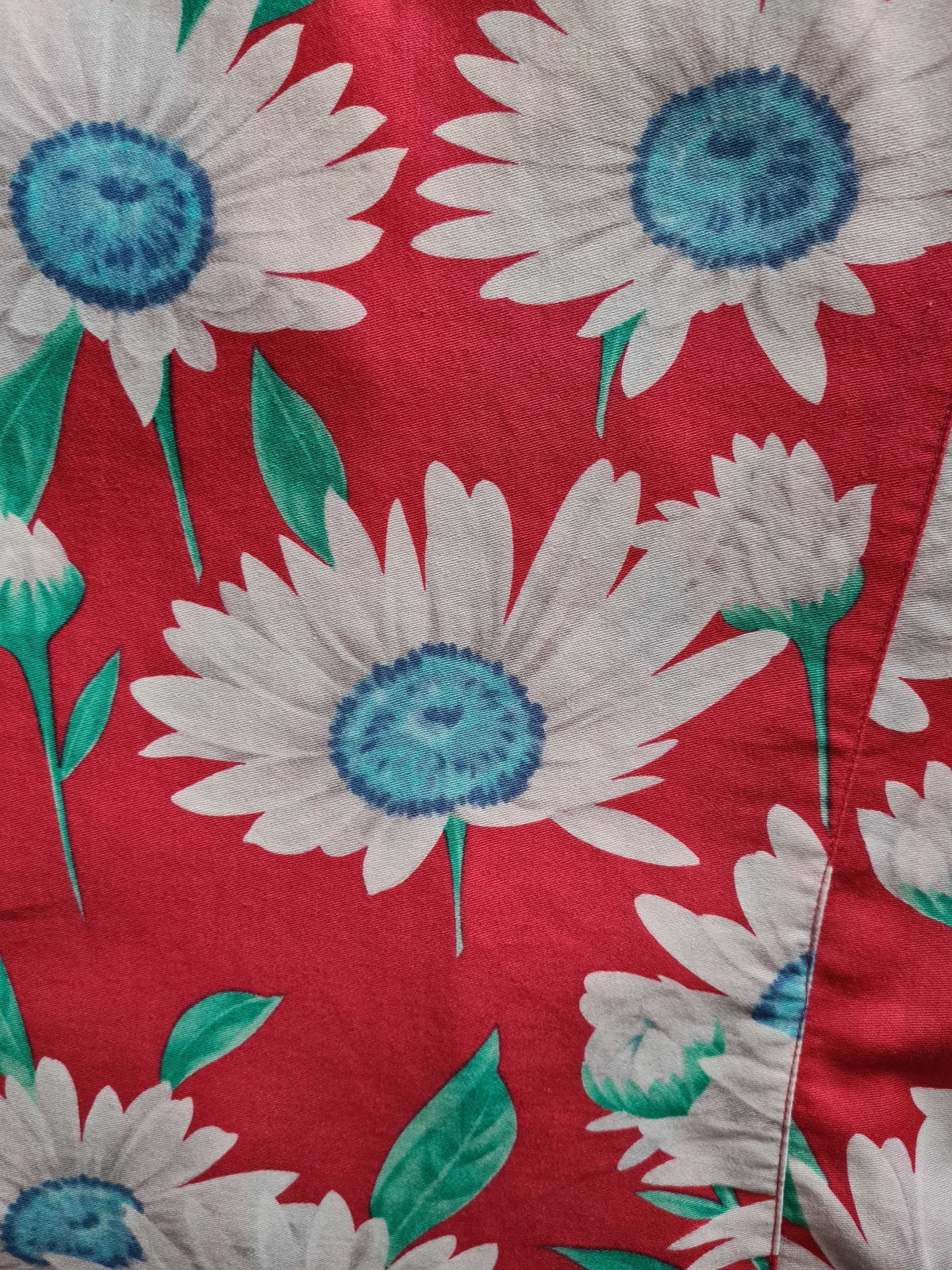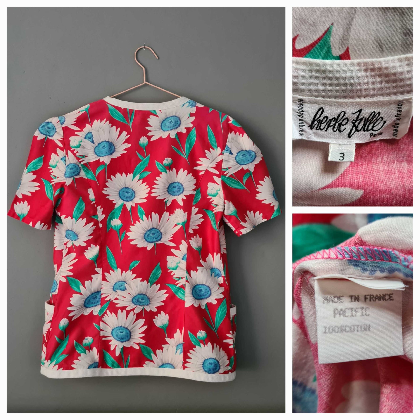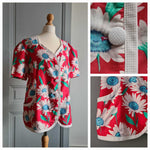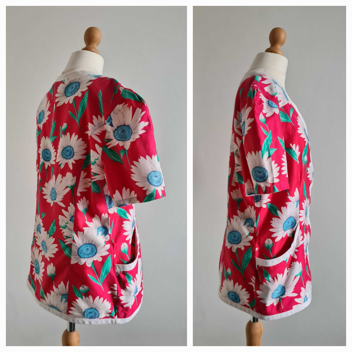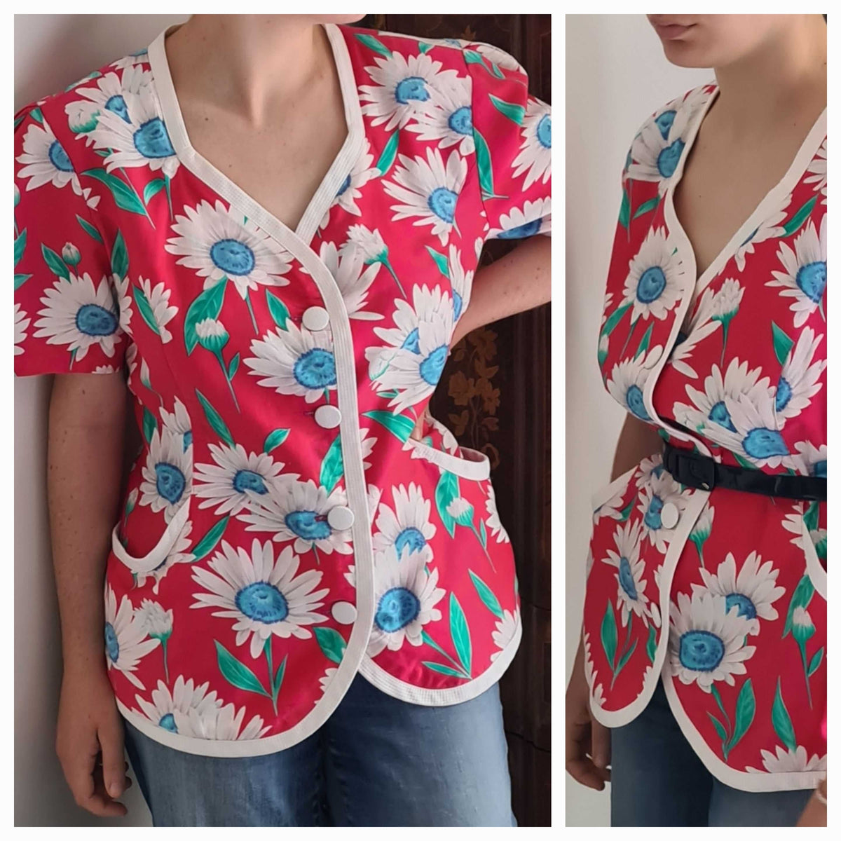 Top boutonné à fleurs, en coton rose fuchsia imprimé grosses marguerites blanches et bleues, légèrement épaulé, manches courtes gigot bouffantes, deux poches, boutons et finition en tissu blanc gaufré. Porté sur les photos par une personne taille 38 (mannequin 36). Pièce fabriquée en France.