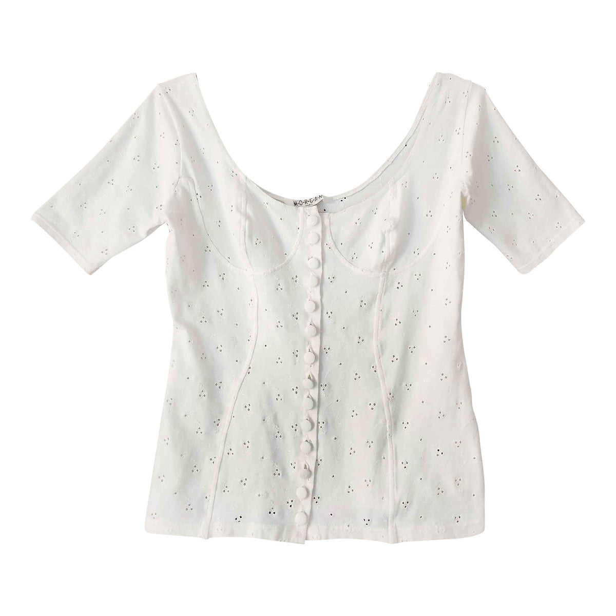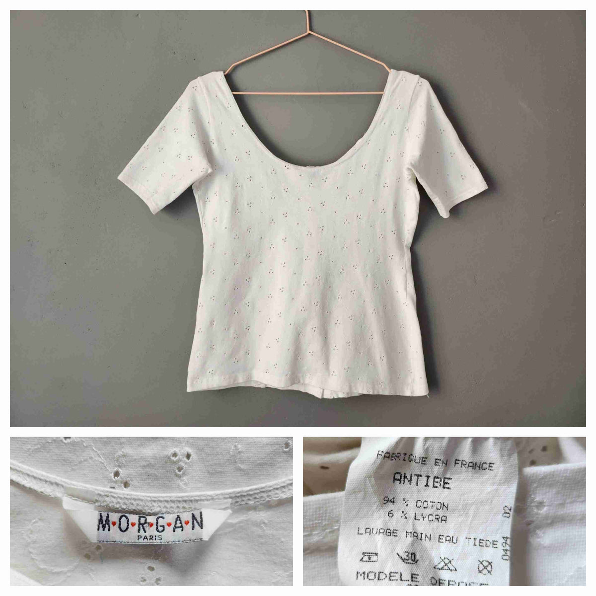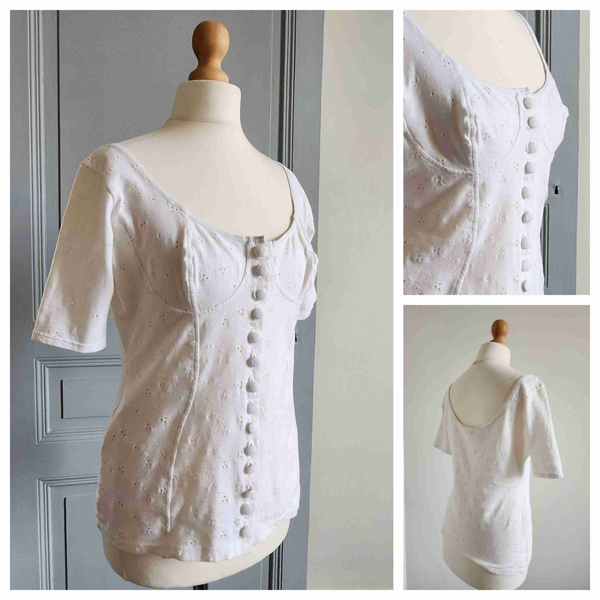 Prix unitaire parTop boutonné en coton blanc dentelle anglaise, manches courtes, large décolleté avec empiècement poitrine marqué. Matière stretch près du corps. Fabriqué en France. Vintage de la marque Morgan.