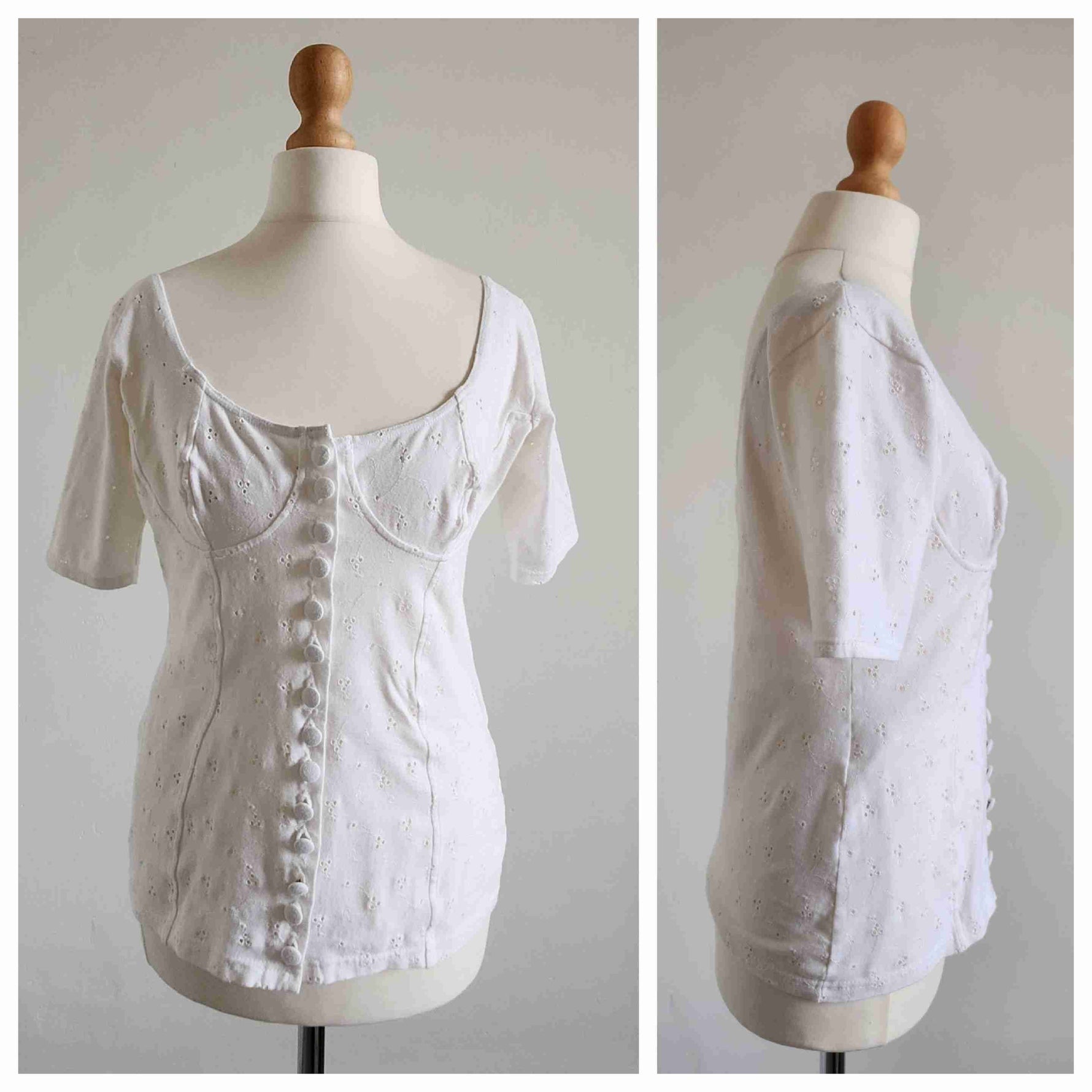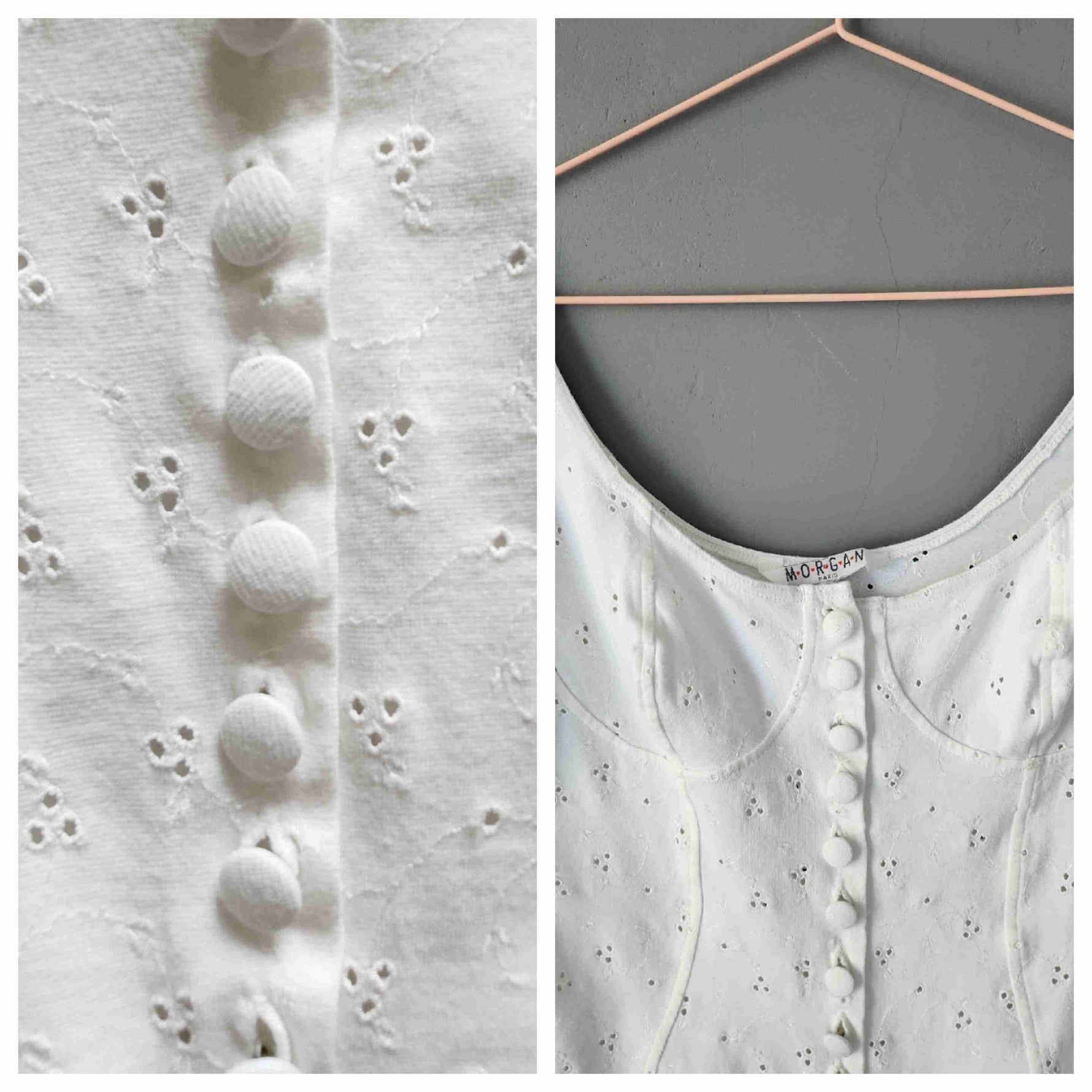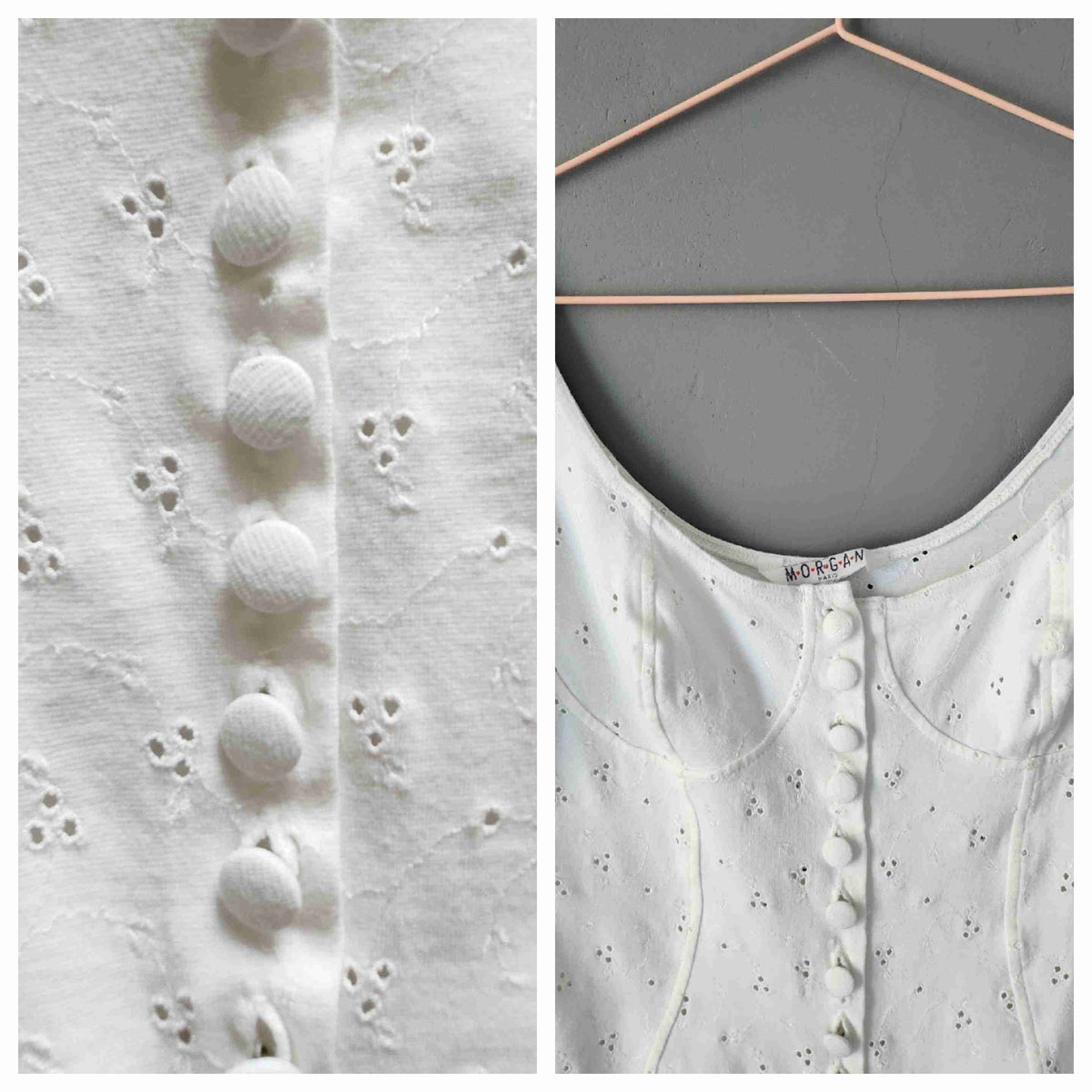 Prix unitaire parTop boutonné en coton blanc dentelle anglaise, manches courtes, large décolleté avec empiècement poitrine marqué. Matière stretch près du corps. Fabriqué en France. Vintage de la marque Morgan.