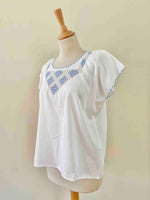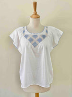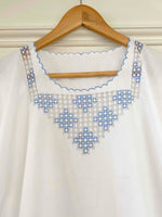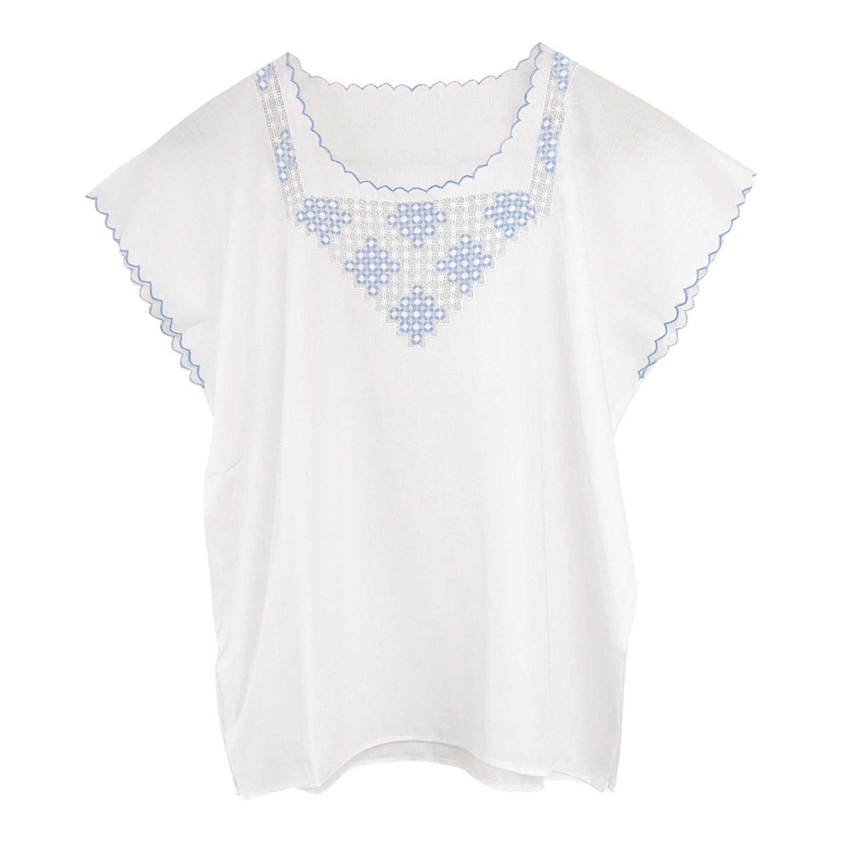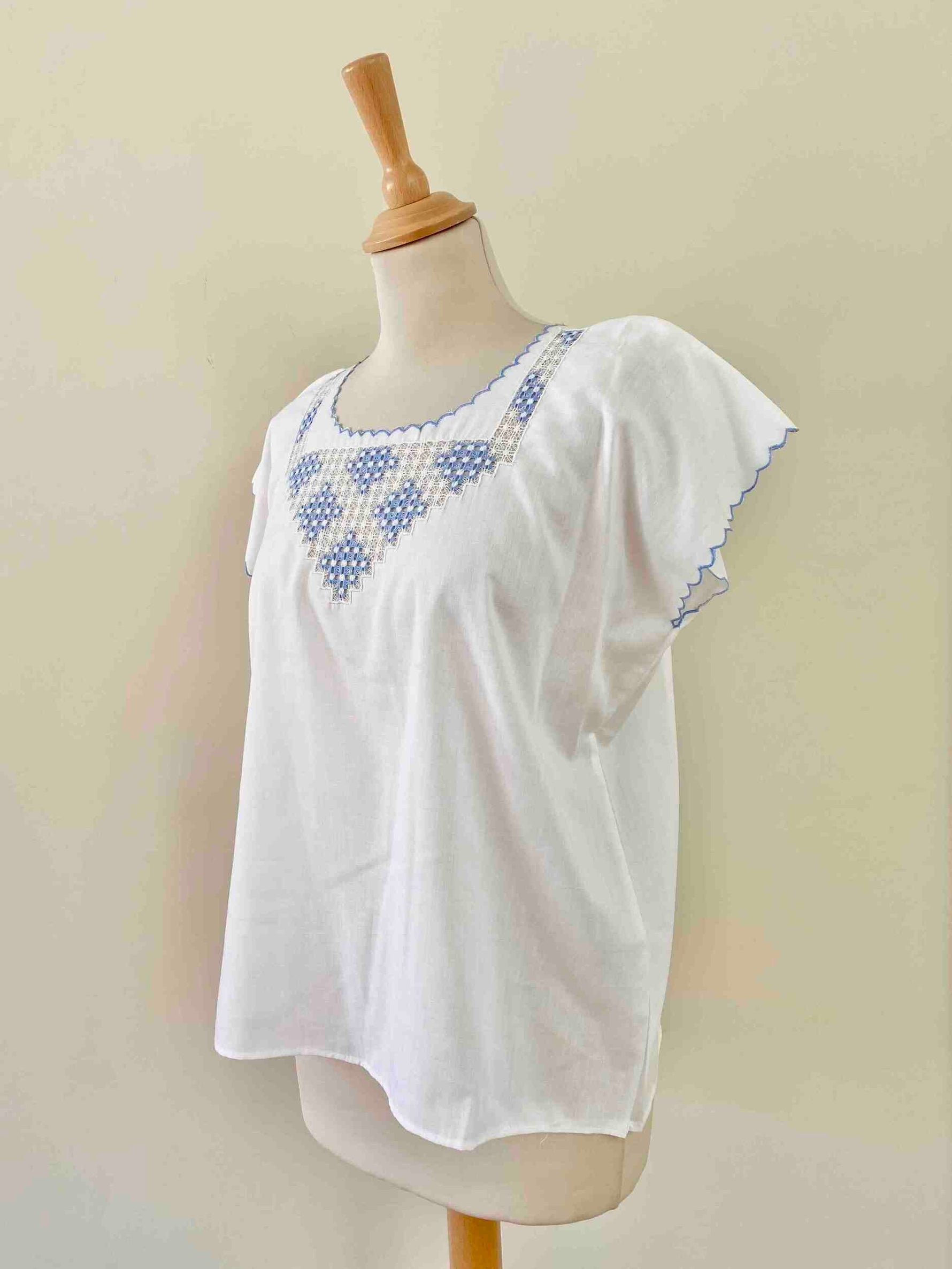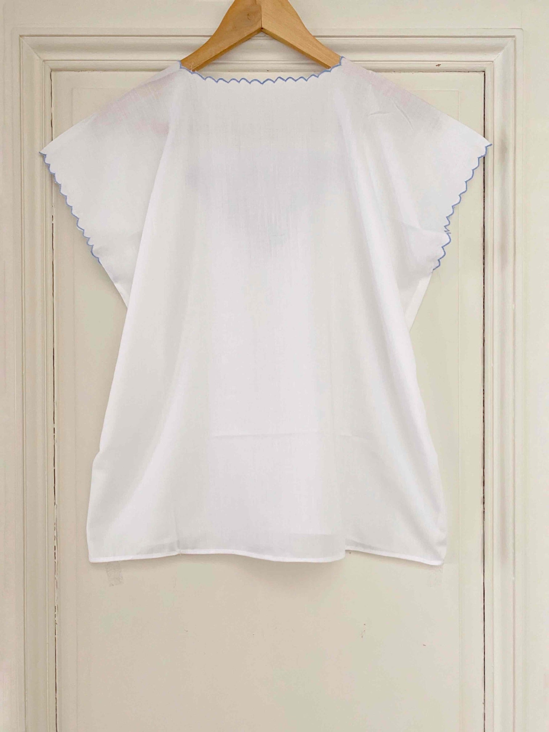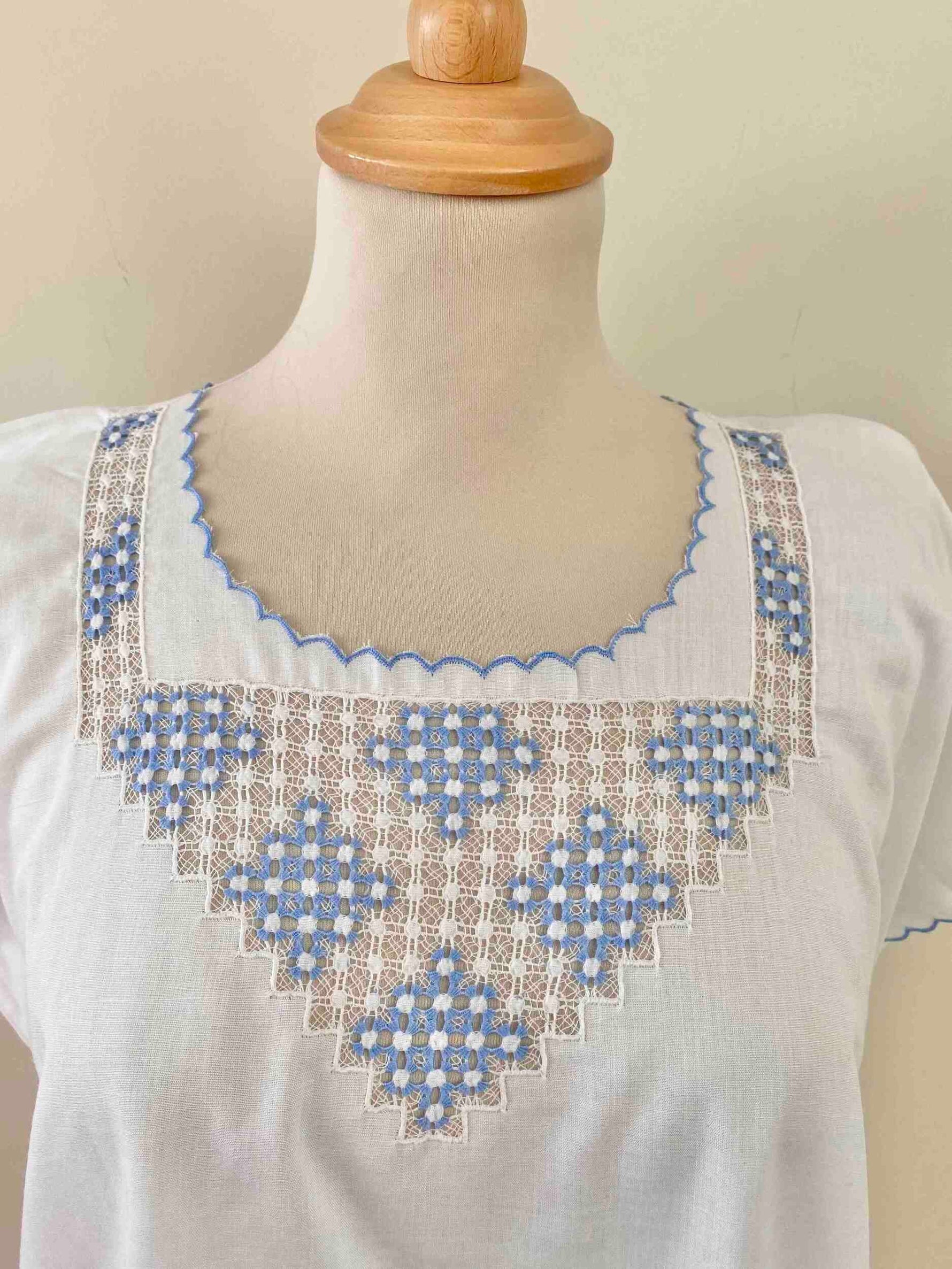 Blouse Brodée en coton et broderies dentelle ajourées bleu ciel, finitions bords festonnés brodés, brodé main à Madagascar