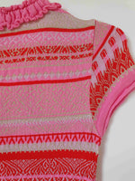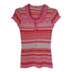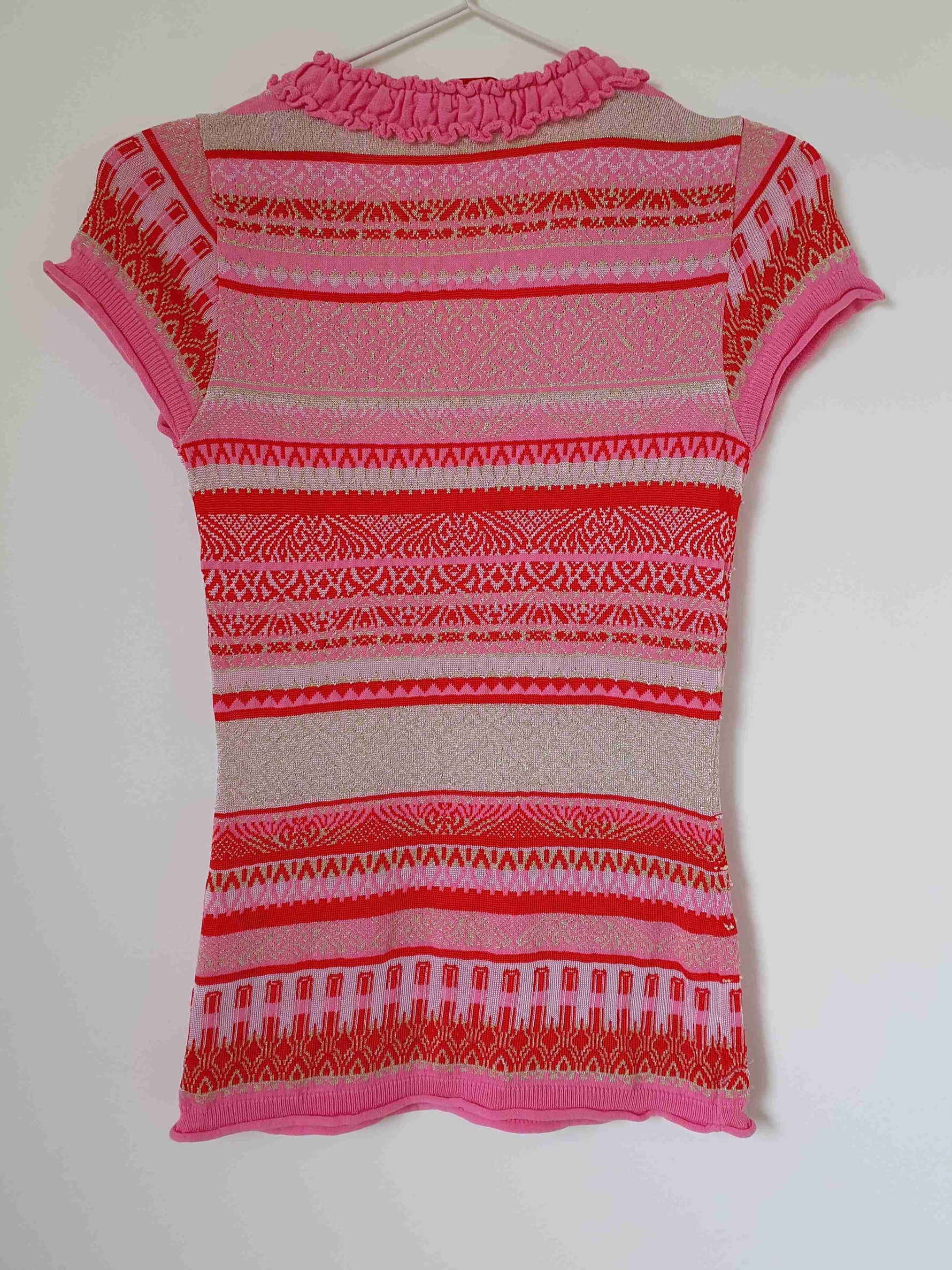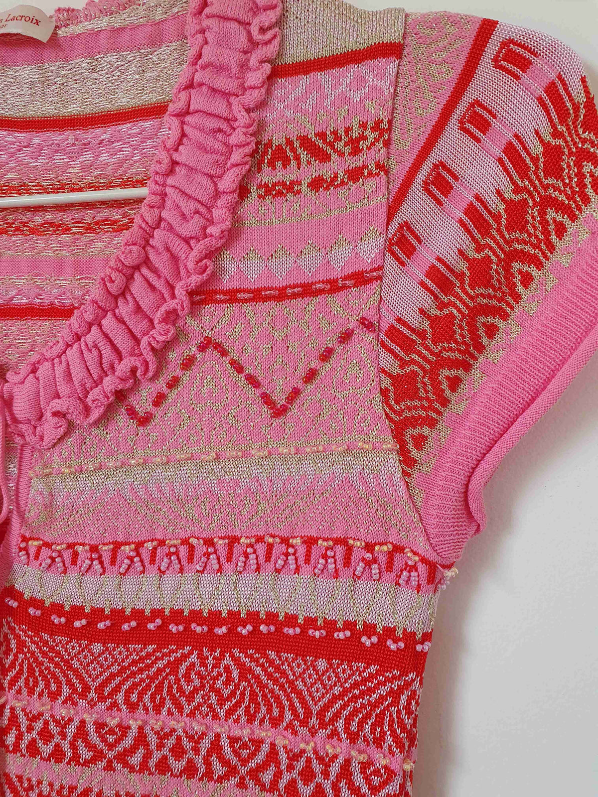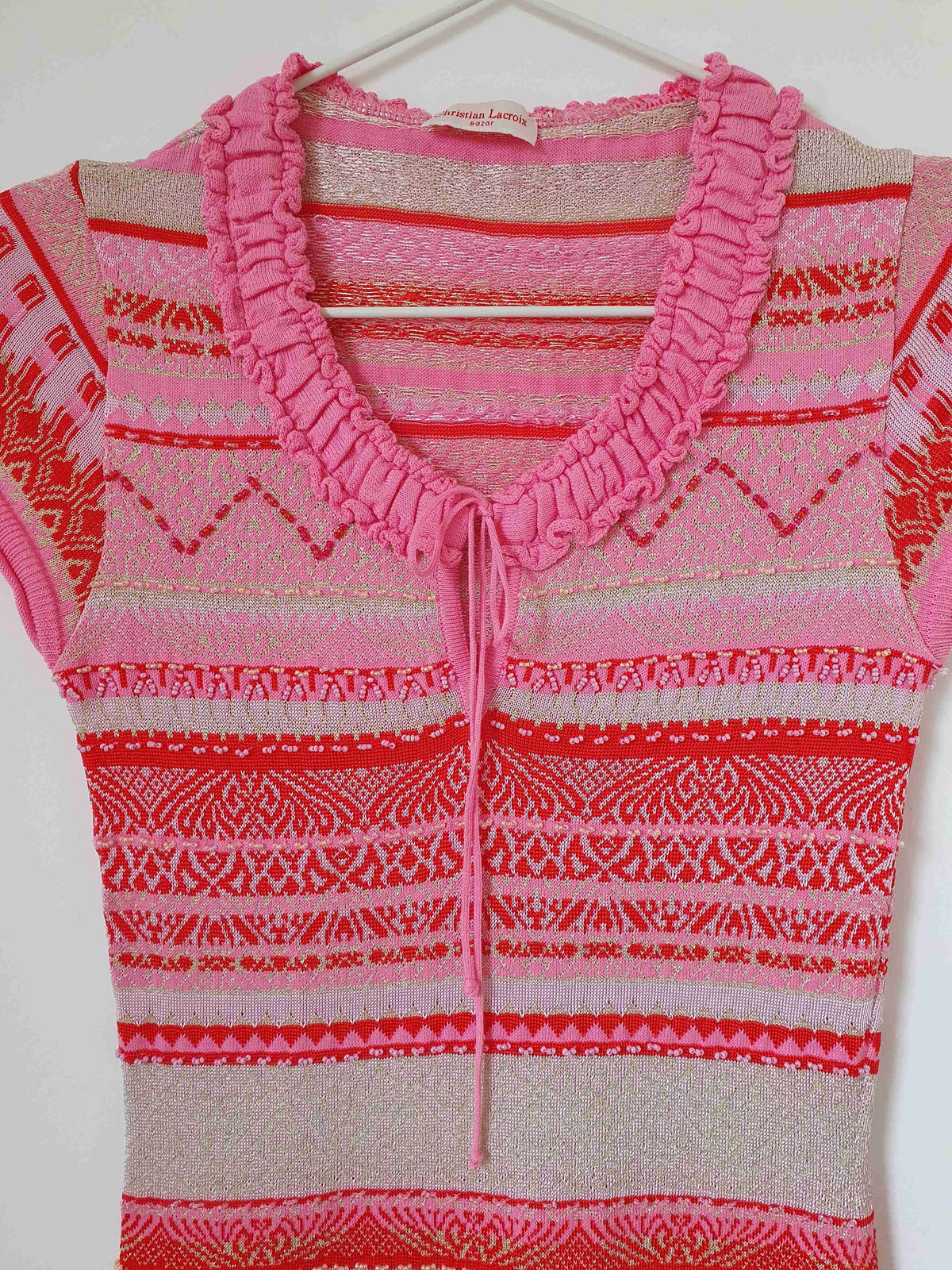 Prix unitaire parTop Christian Lacroix rose er rouge, manches courtes. Perles brodées. Lien de serrage au décolleté.