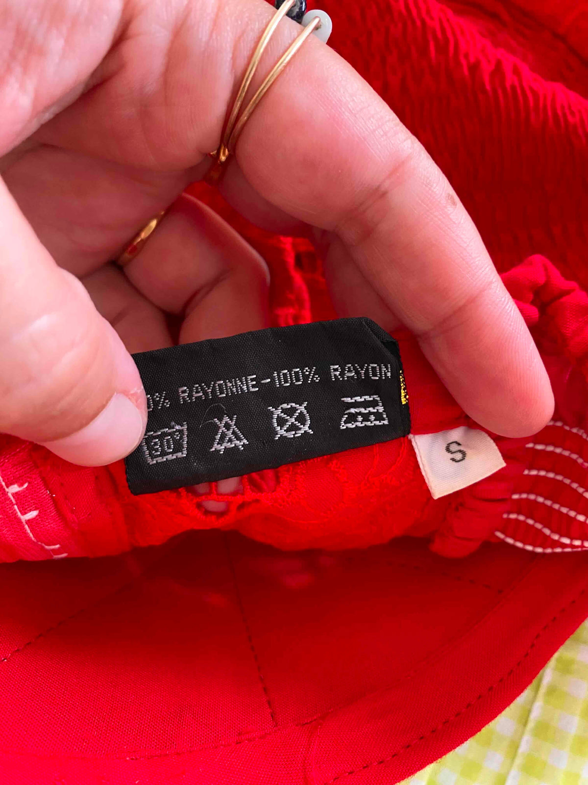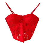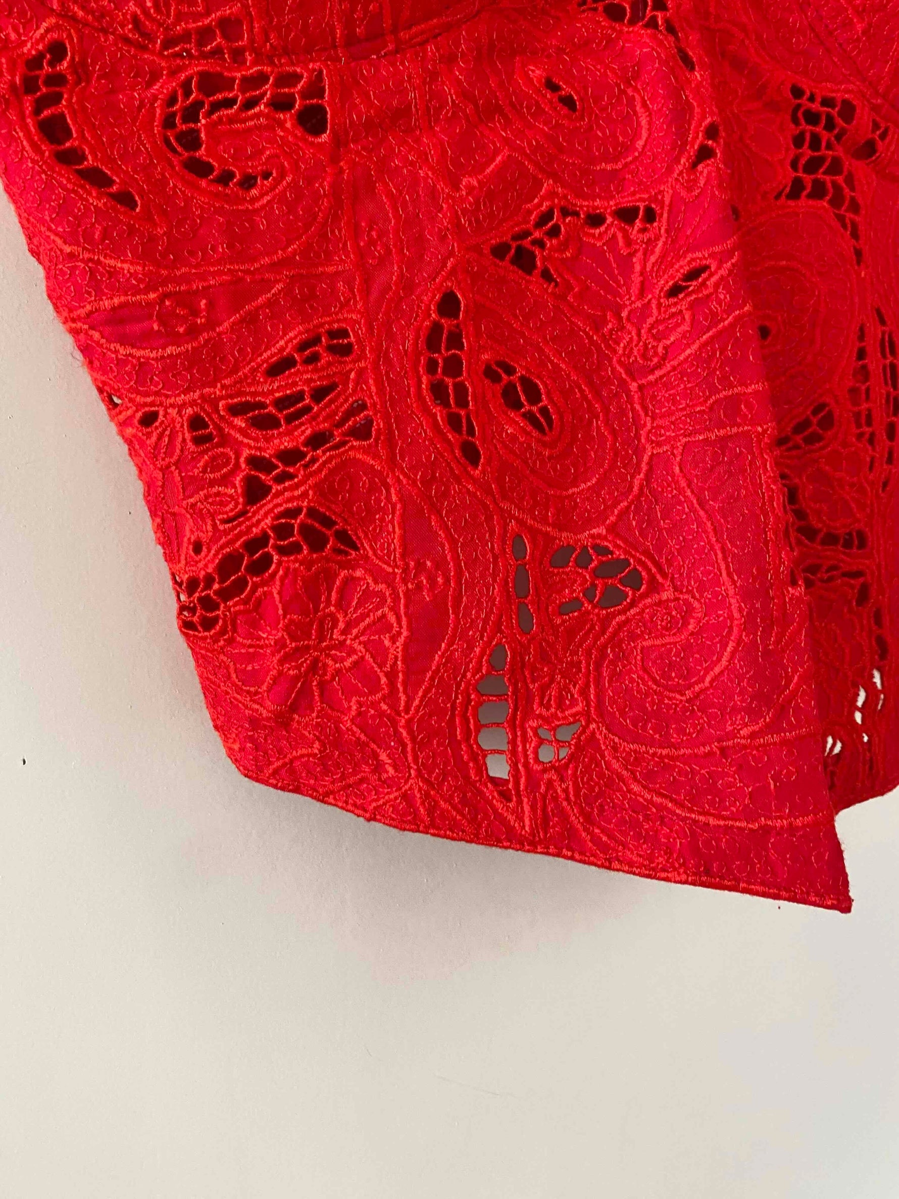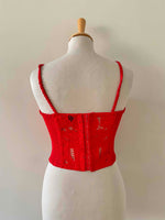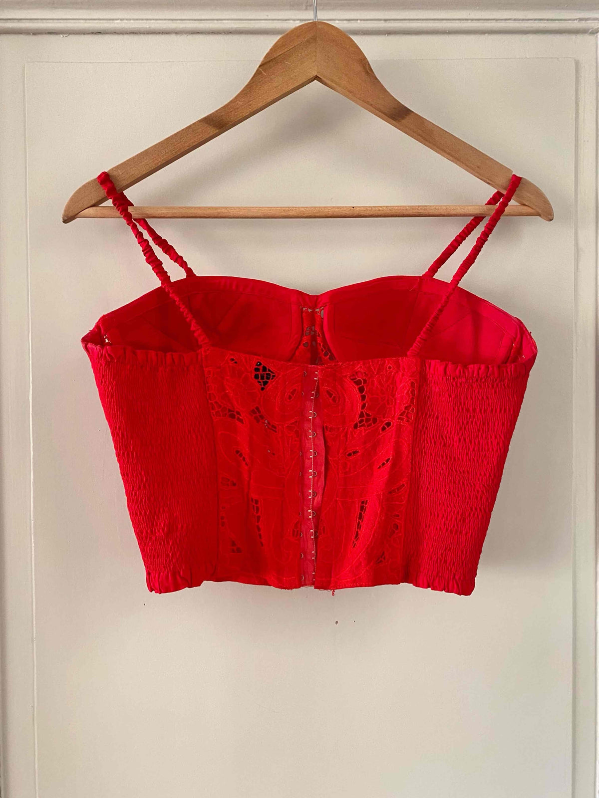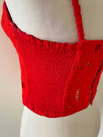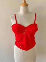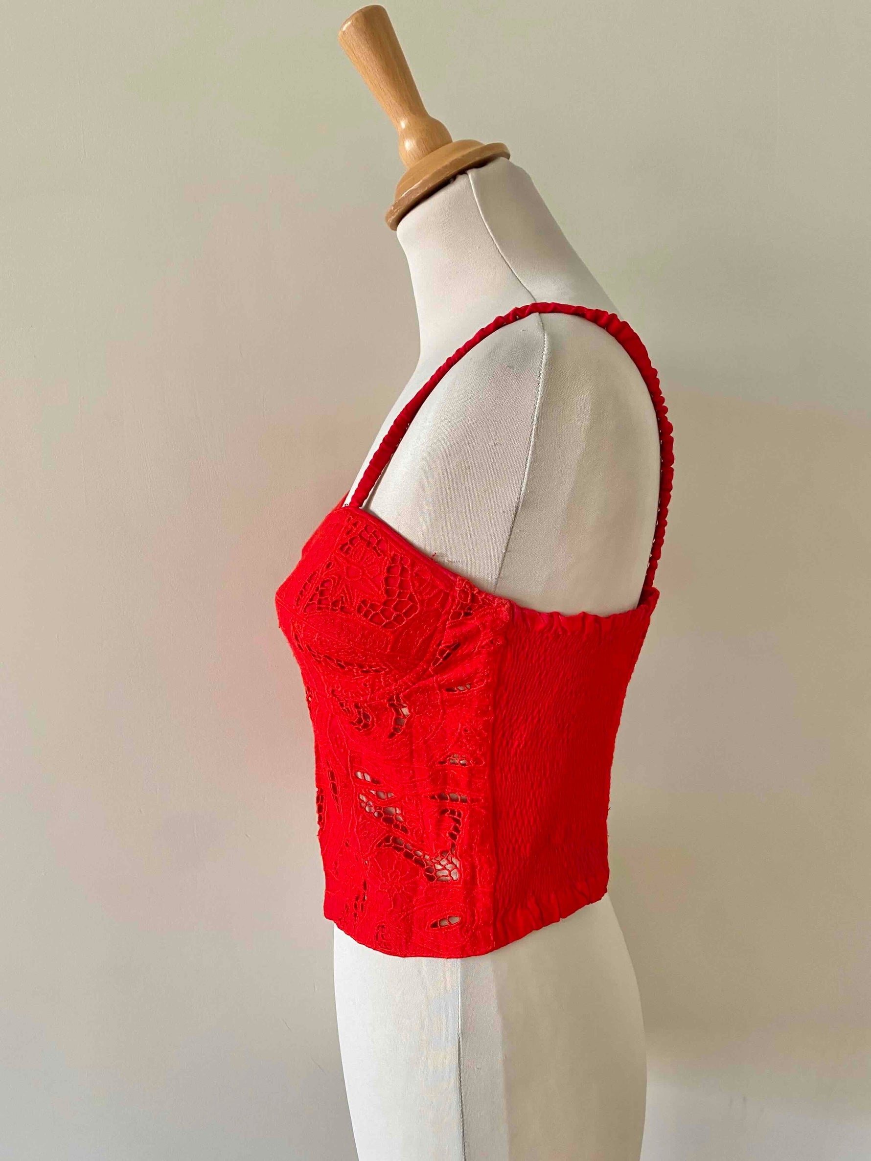 Bustier en broderies anglaises, rouge vermillon entièrement brodé et ajouré de guipure fleurie, poitrine corbeille à léger coussinet en formes, bretelles spaghettis élastiques, devant boutonné et dos smocké, taille 34 et 36 porté ici sur un mannequin T36.