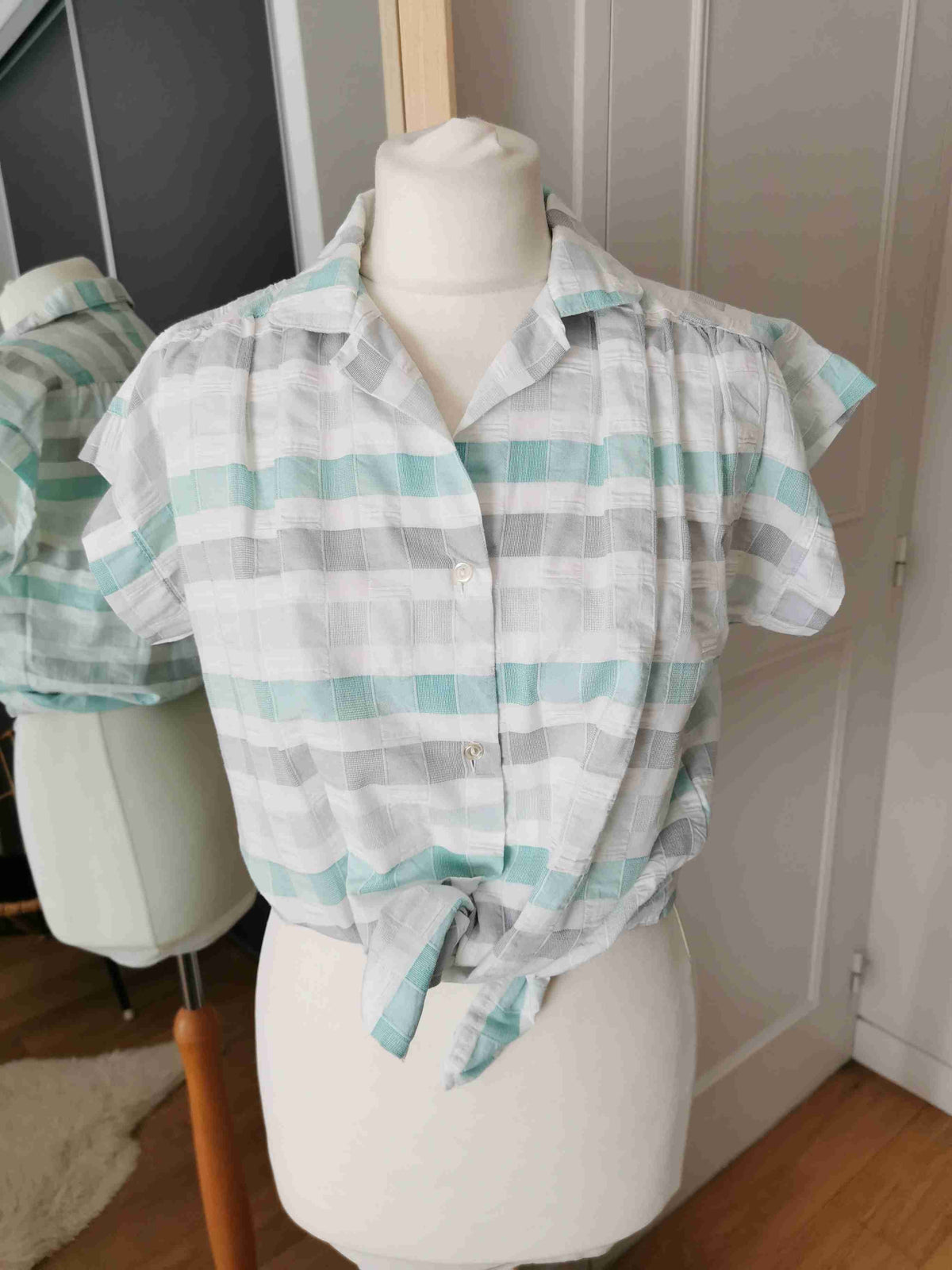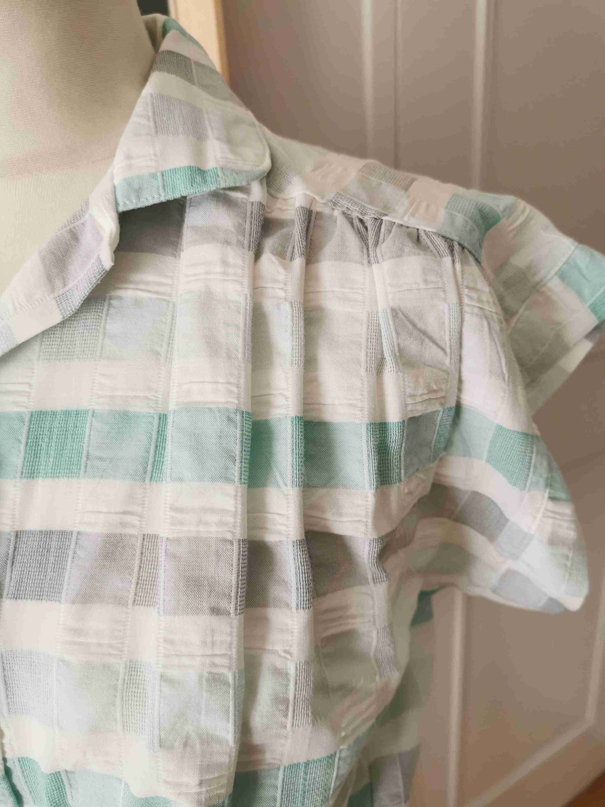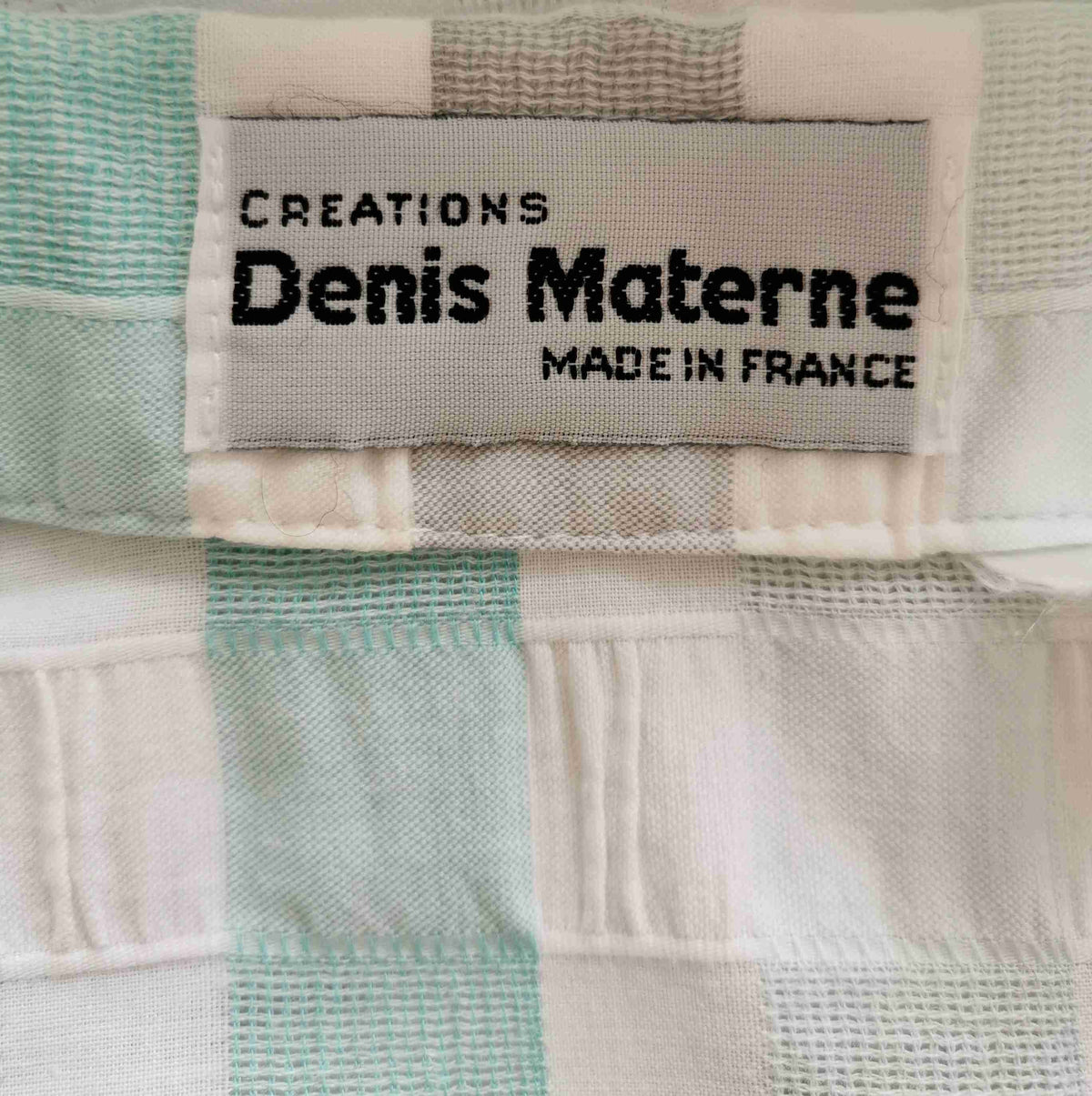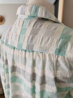 En coton gaufré blanc, gris et vert d'eau.
