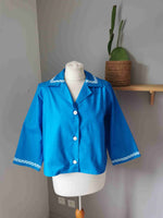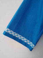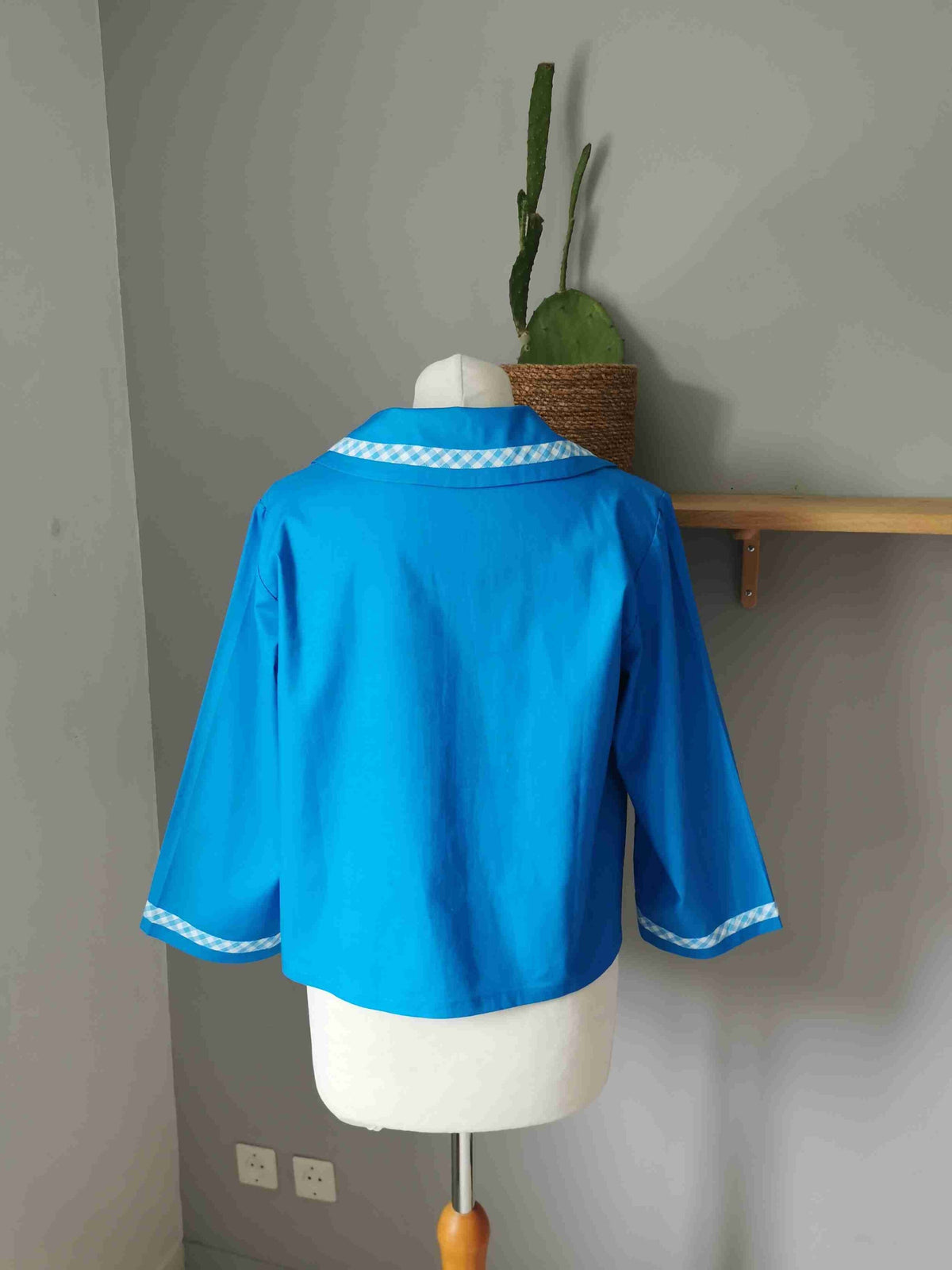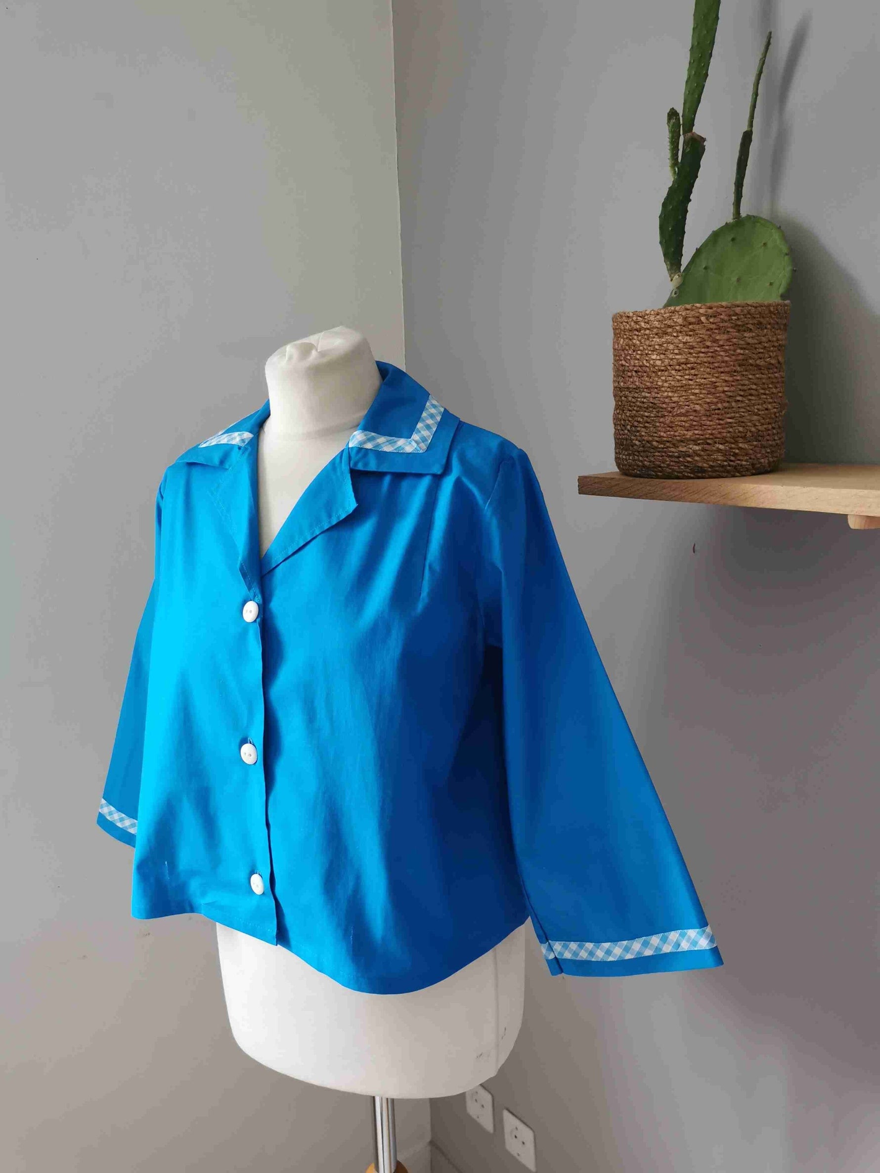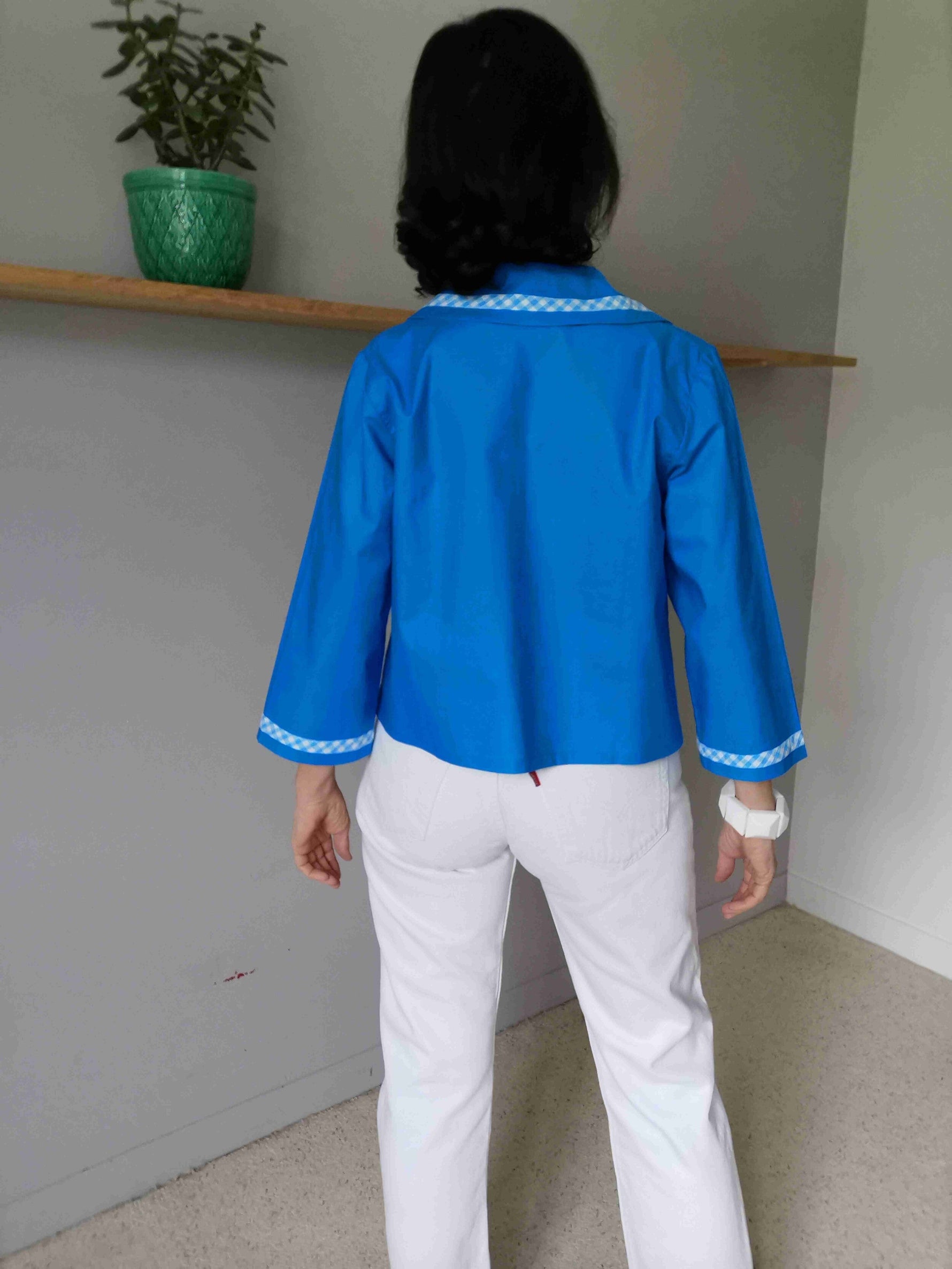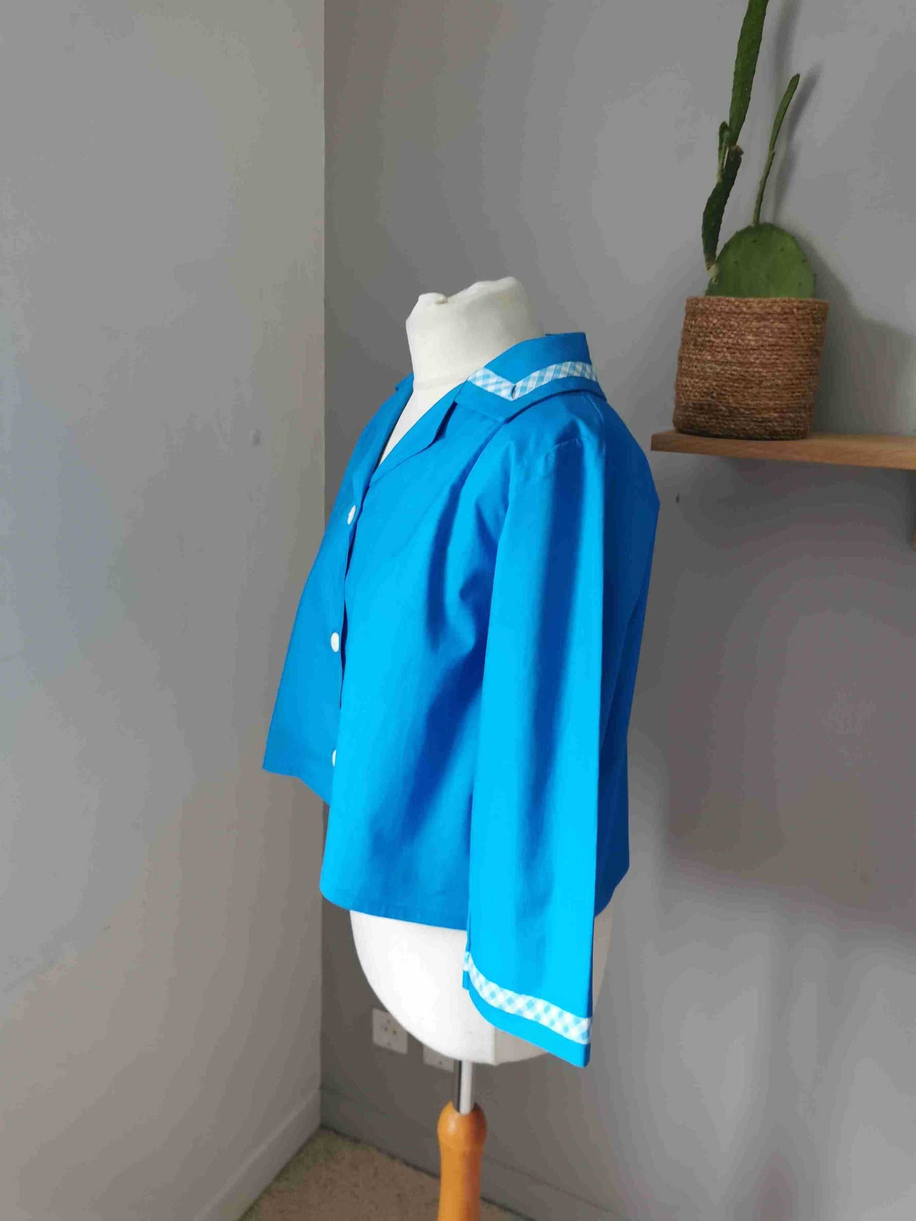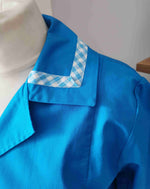 En coton bleu vif et vichy bleu et blanc sur le col et mes poignets