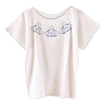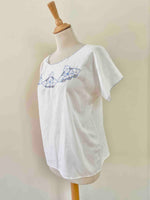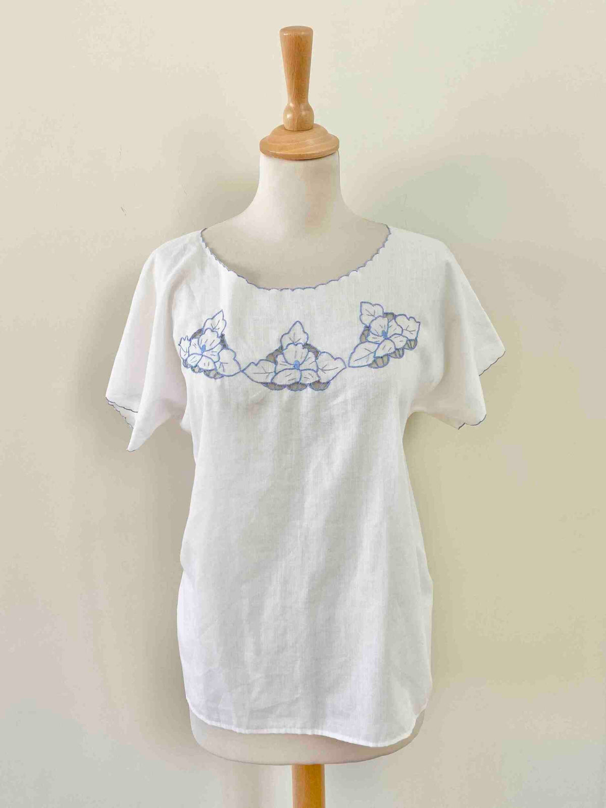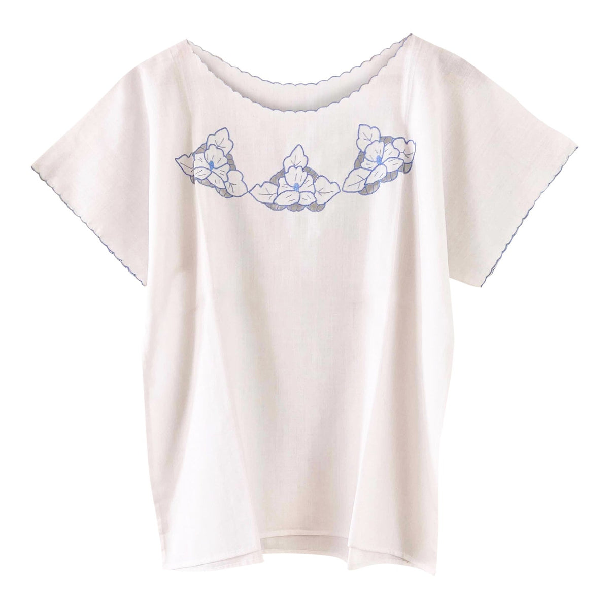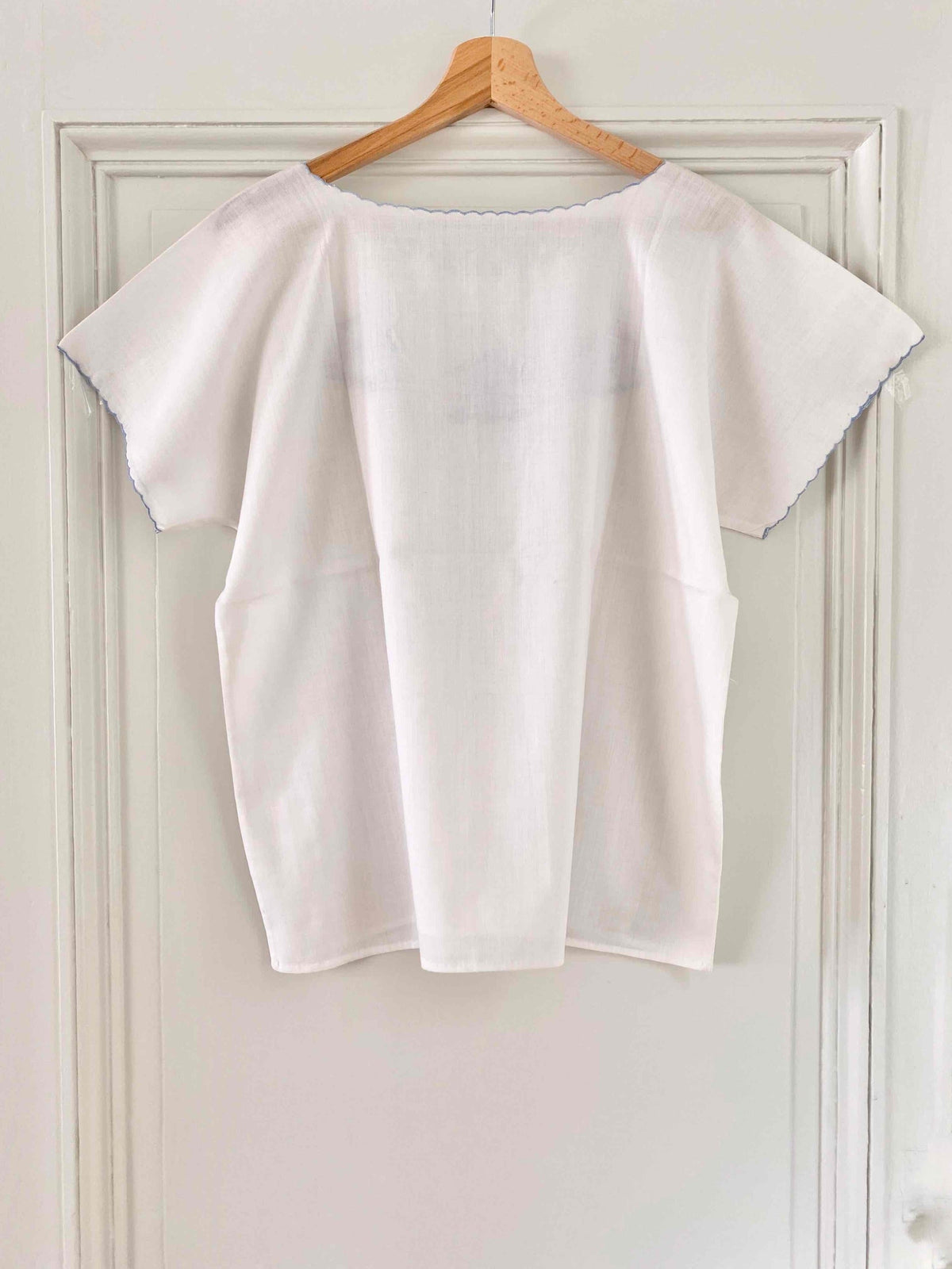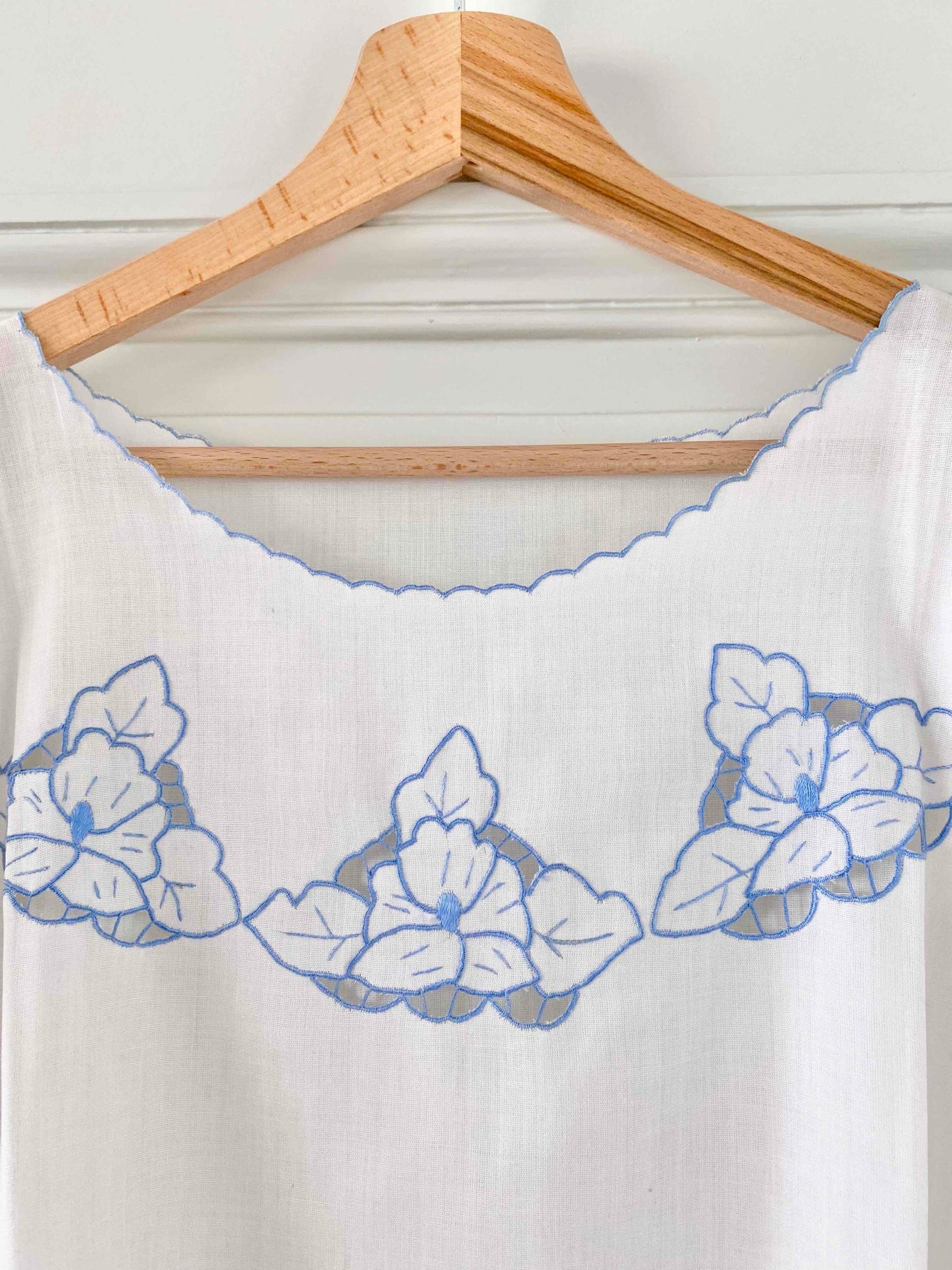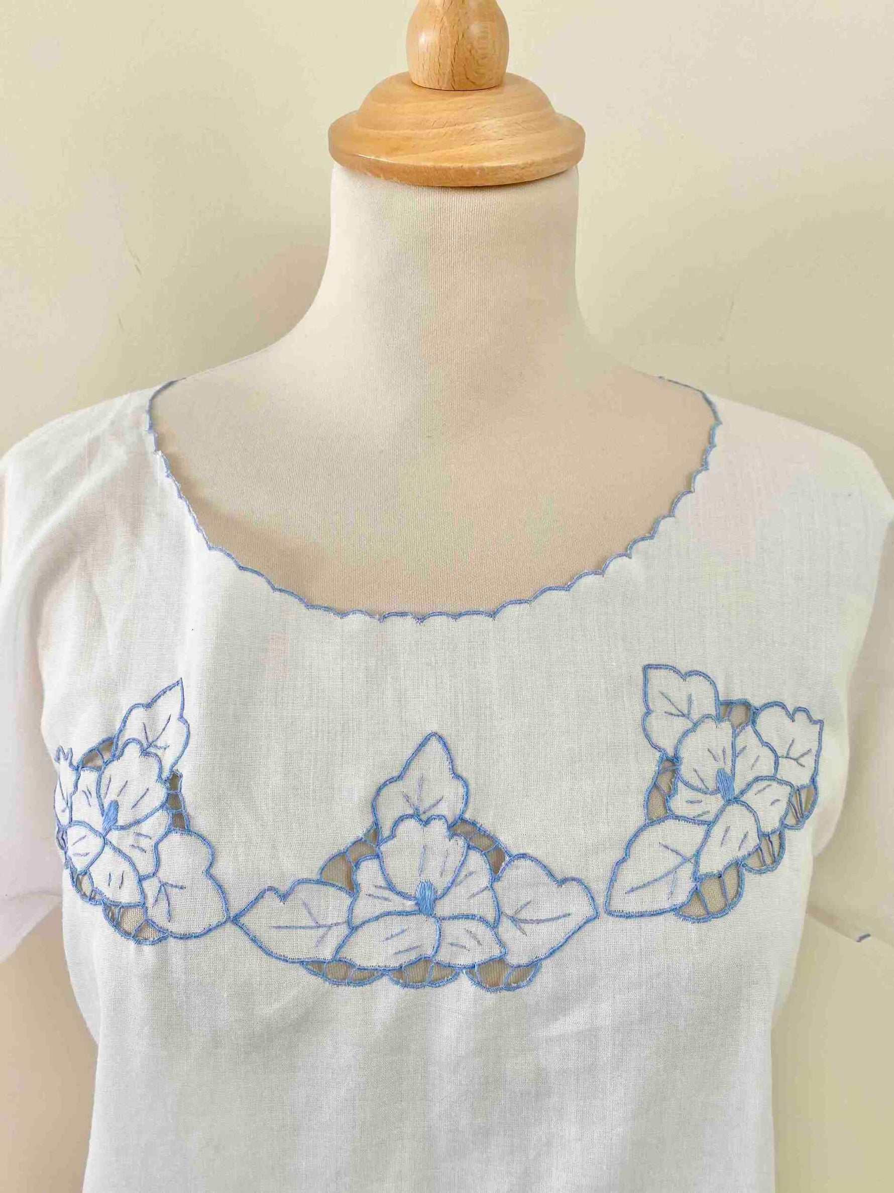 Prix unitaire parBlouse Brodée en coton et broderies dentelle ajourées florales bleues ciels, bordures festonnées brodées bleues, manches chauve-souris, brodée mains à Madagascar.