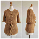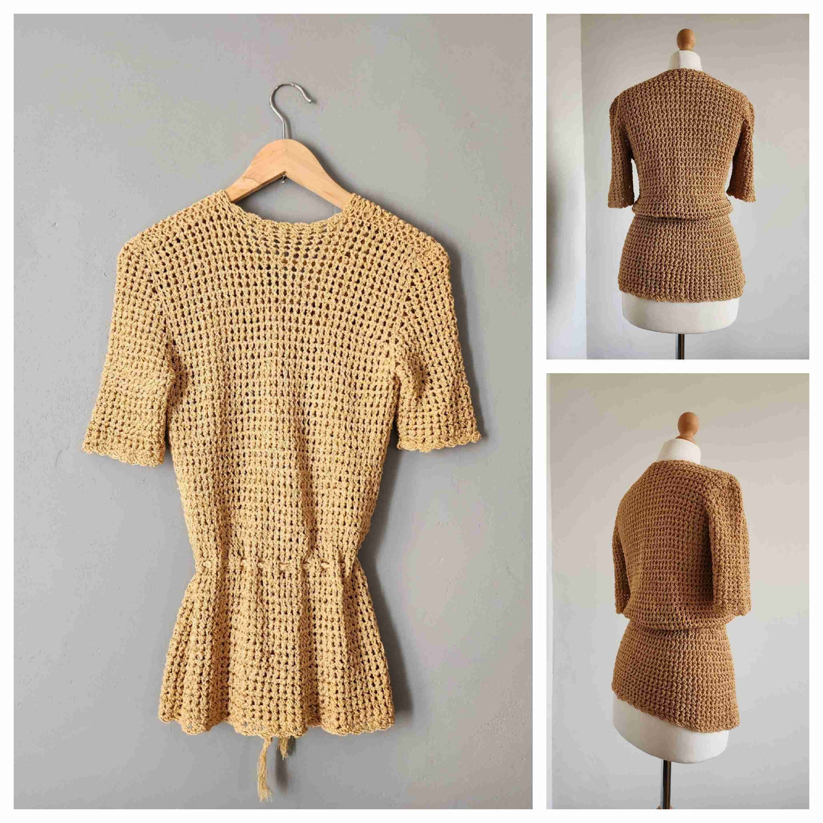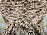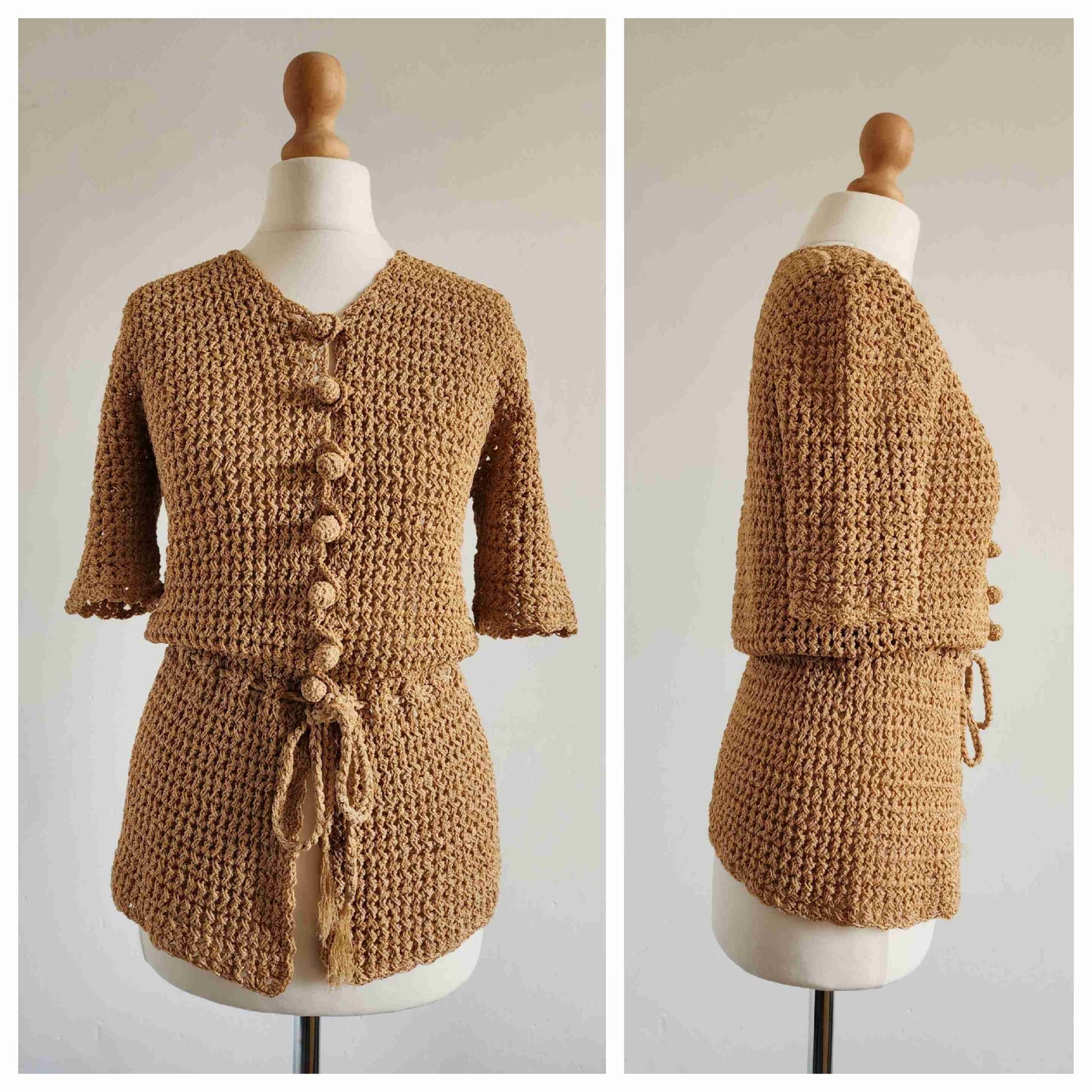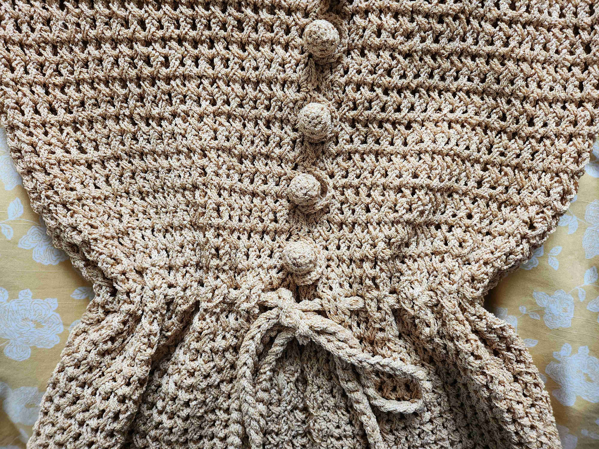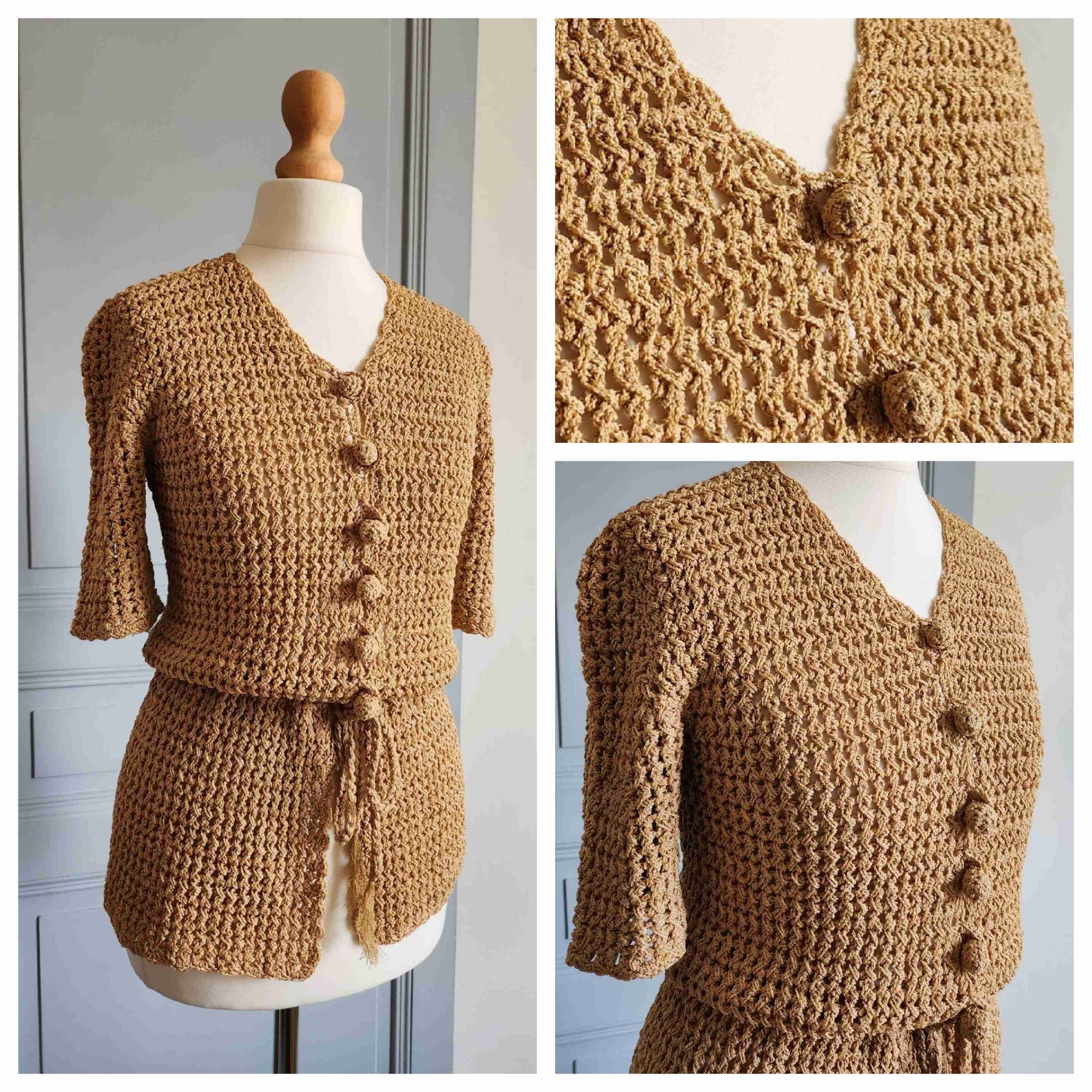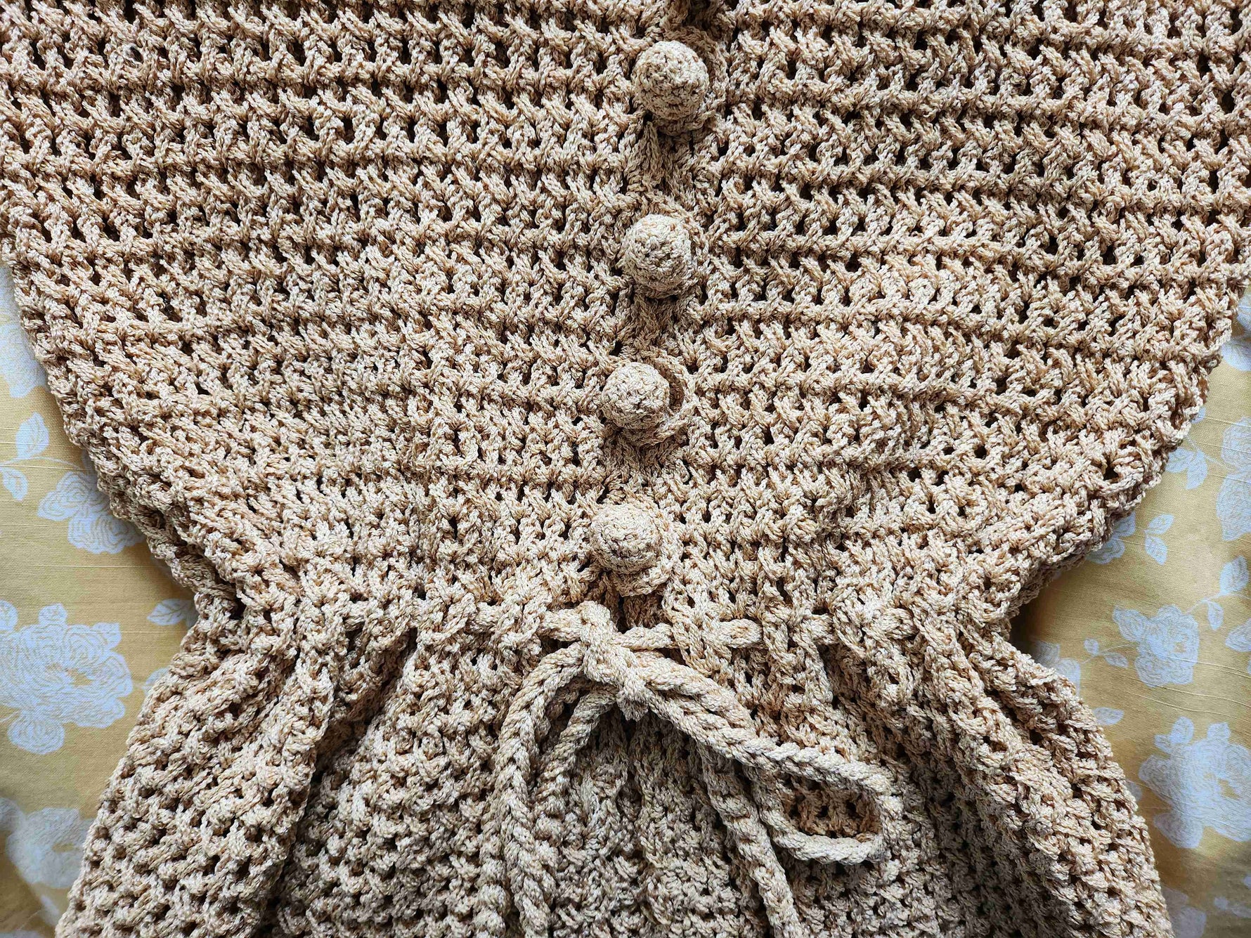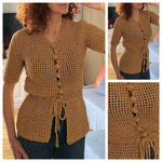 Prix unitaire parTop boutonné en crochet de coton couleur camel, manches courtes, boutonnière pompons/brides, lien tresse à nouer pour resserrer la taille. Pièce crochetée à la main. Porté sur les photos par une taille 36.