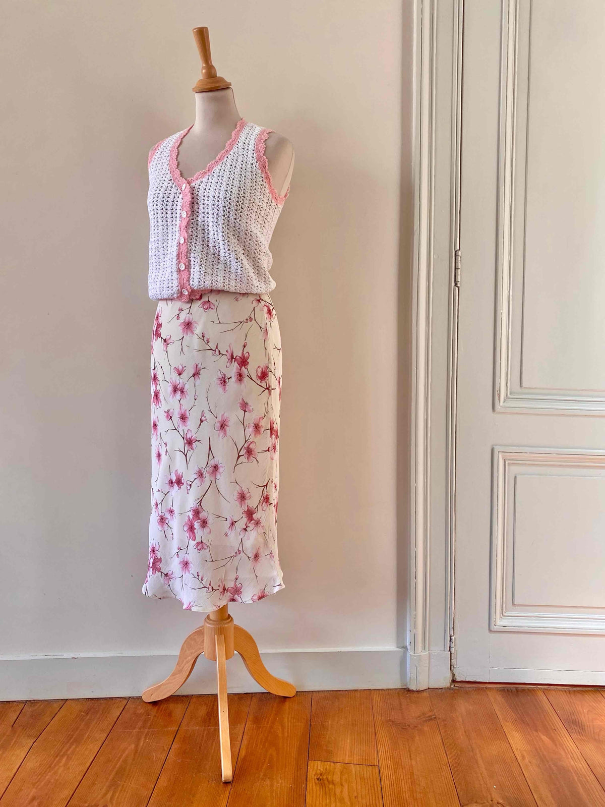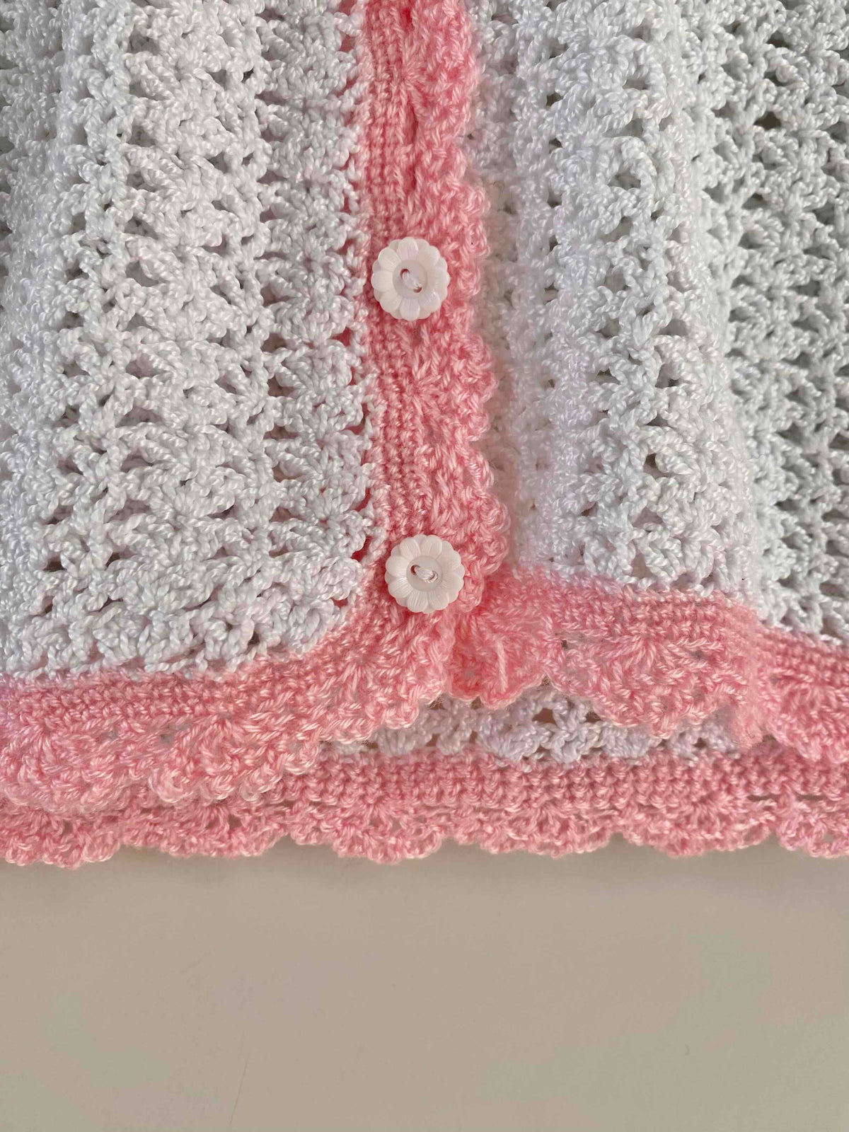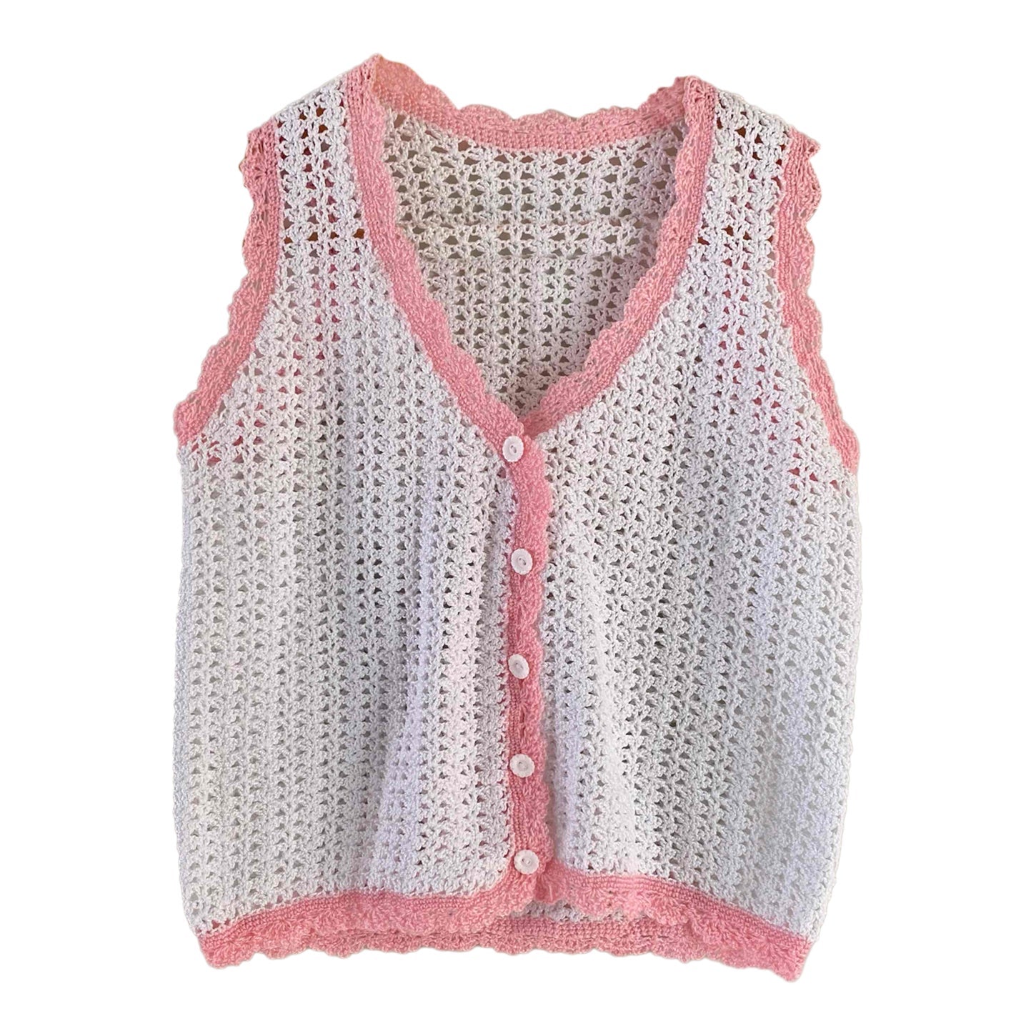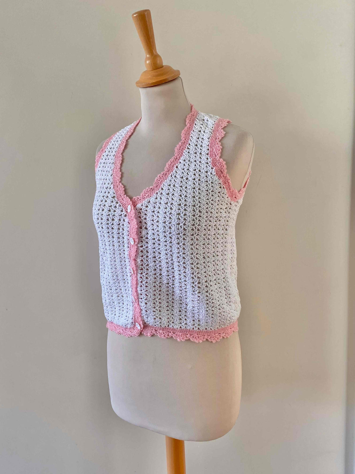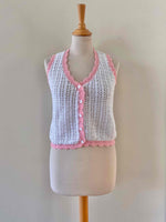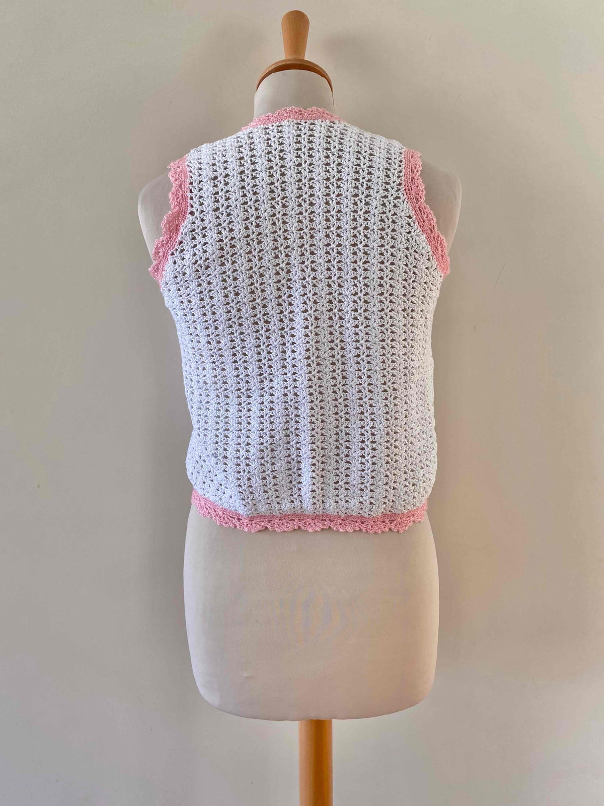 Top en crochet, crochet de coton blanc aux bordures roses baby, col V et boutons blncs en forme de marguerites, tricotté mains dans les années 60’s, taille 34 et 36 porté ici sur un mannequin T36.