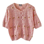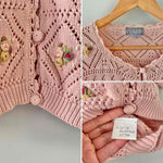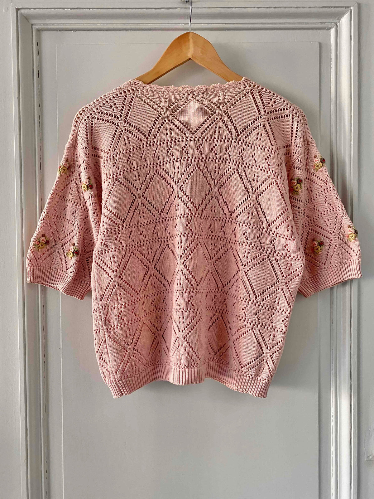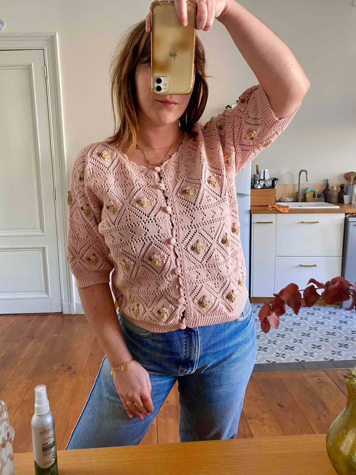Prix unitaire parTop en Crochet de coton rose pâle brodé de fleurs pastels, maille Pointelle ajourée dentelle, boutons au crochet, marque 1,2,3, fabriquée en France, années 80’s. Taille 38 porté ici sur un mannequin T36 et une personne T40.
