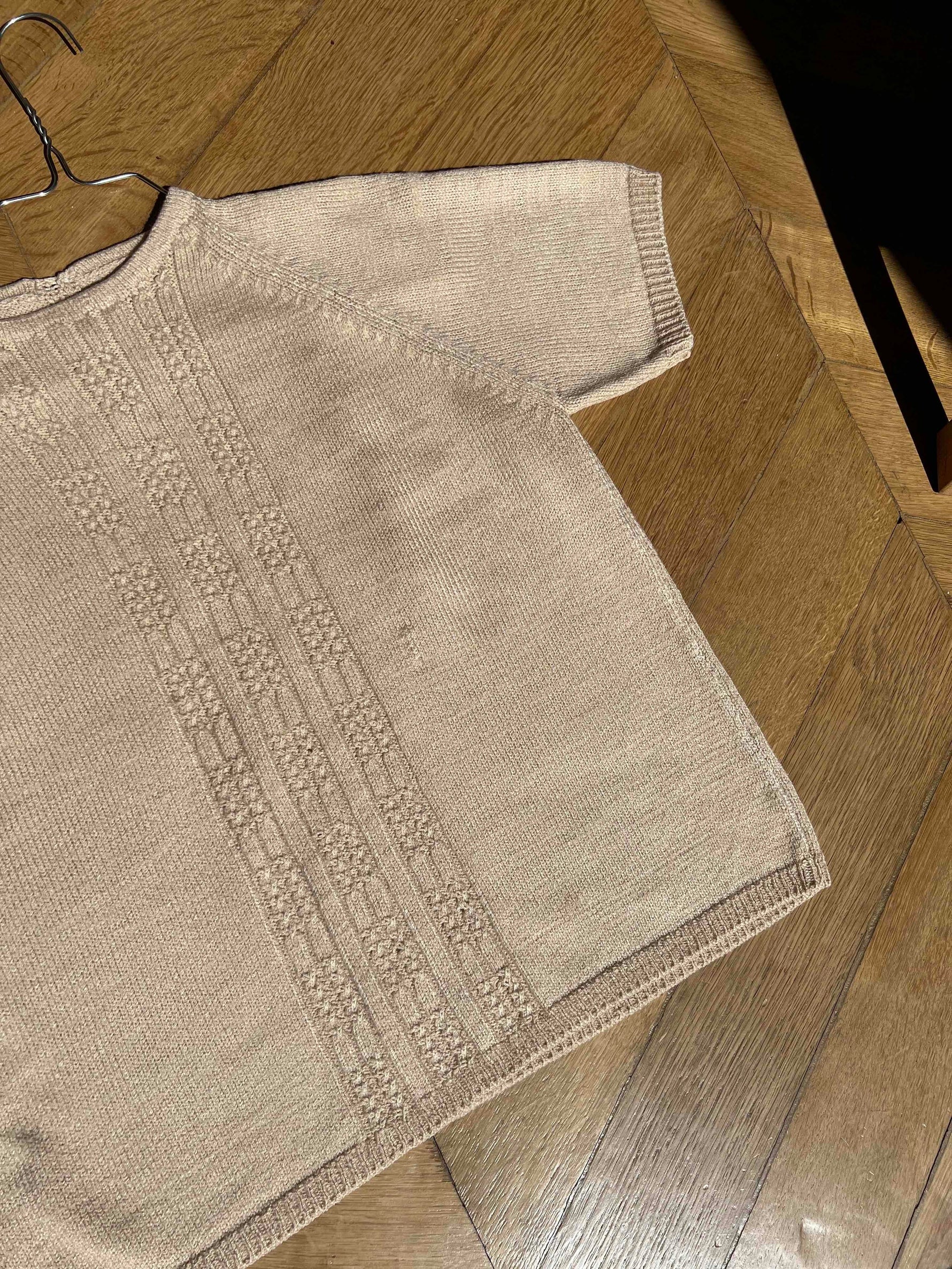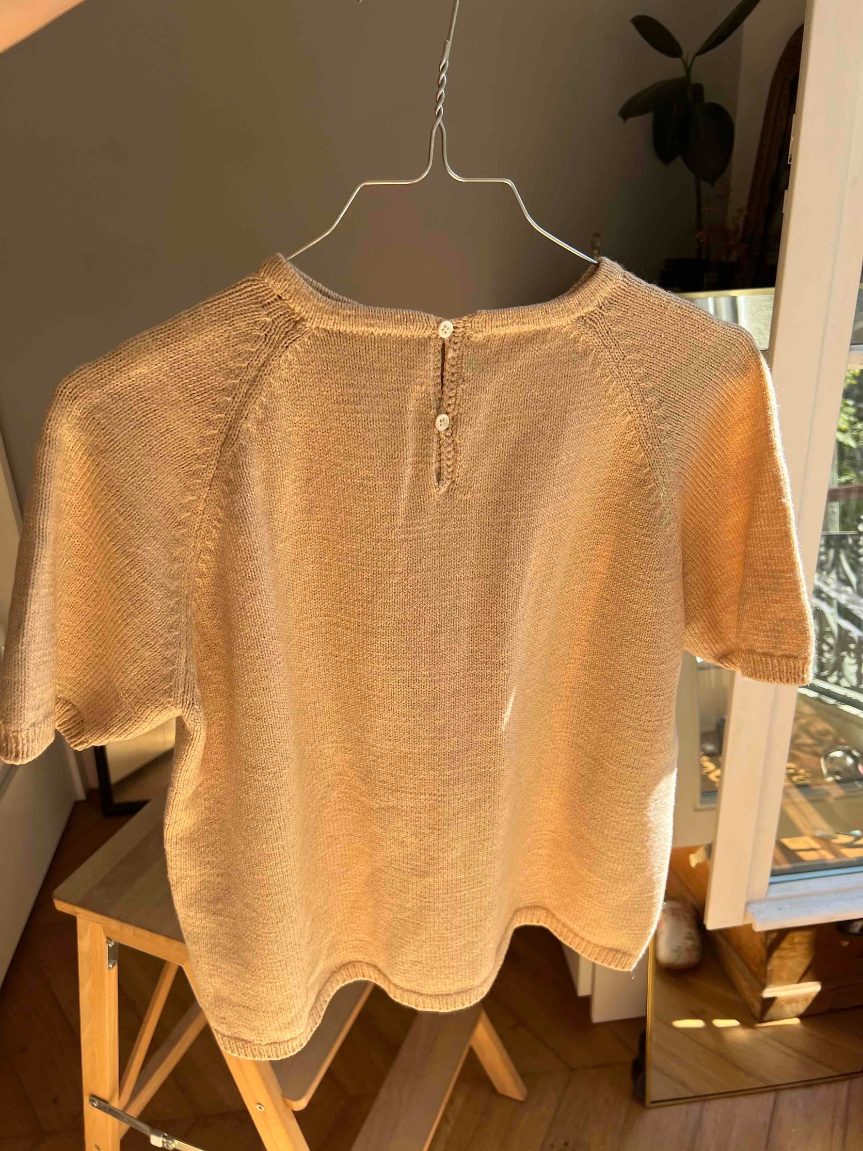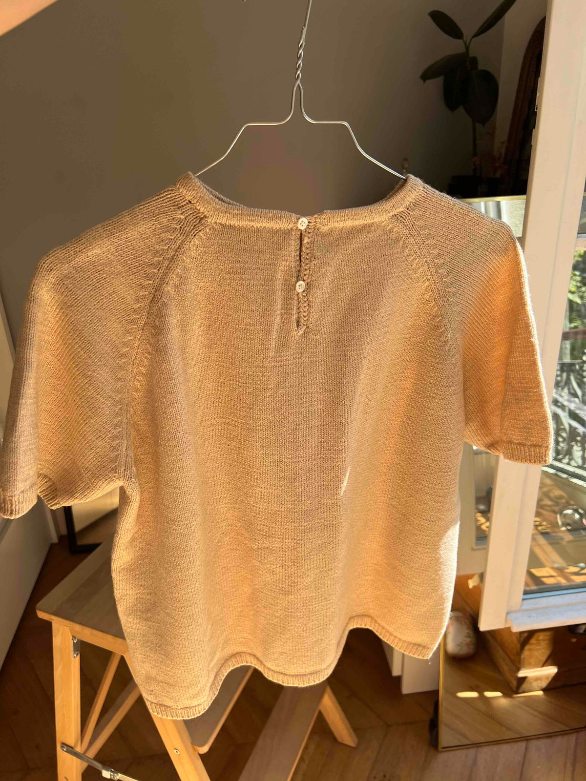 Prix unitaire parTop en maille à manches courtes beige clair, détails de deux boutons nacrés dans le cou. Couleur café au lait. Taille 36/38. Années 70s.
